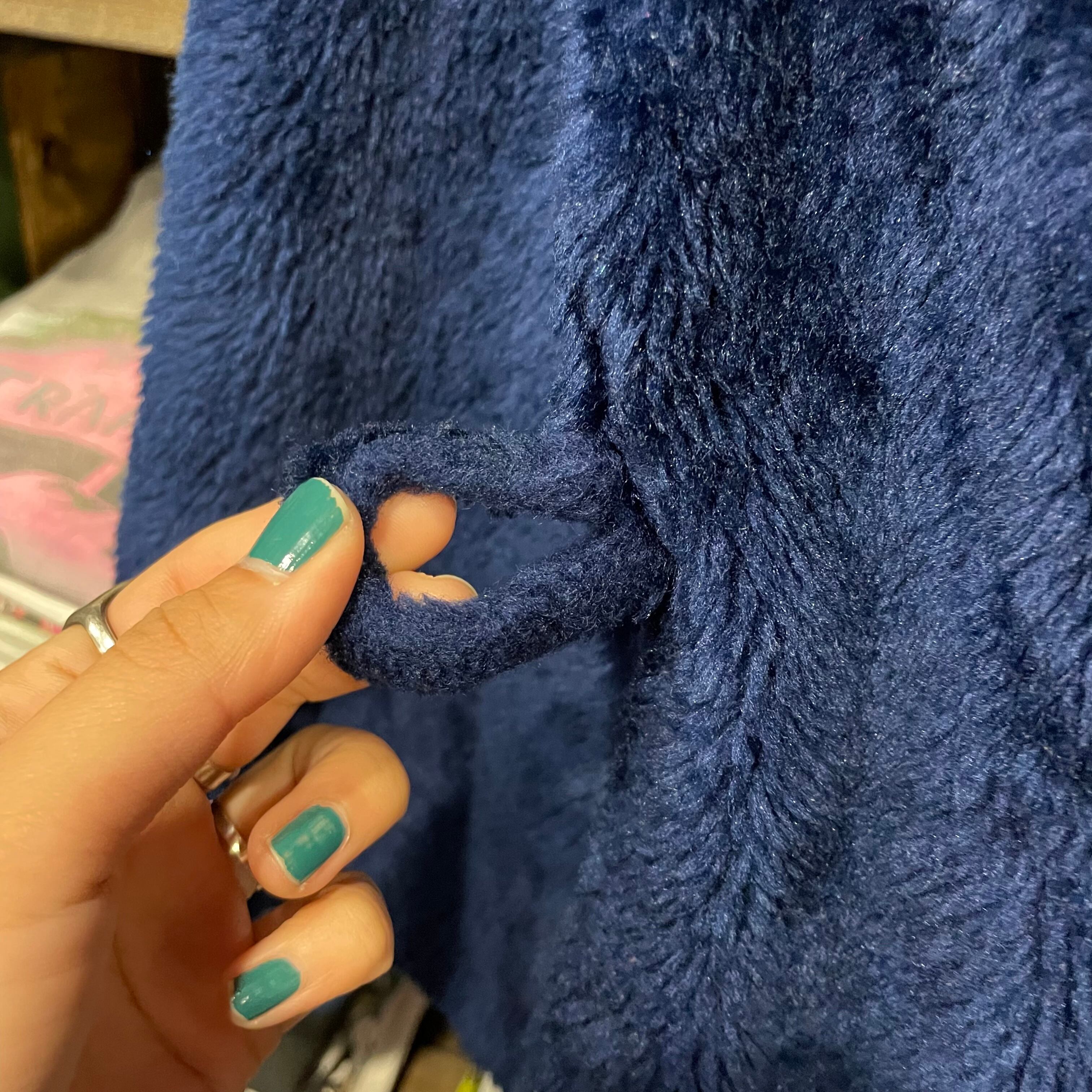 フェイクファーというか、フリースというか毛足のあるフワッとした軽めの素材で暖かいです。長い丈感もかわいいですし派手すぎないので着て頂きやすいかと思います。