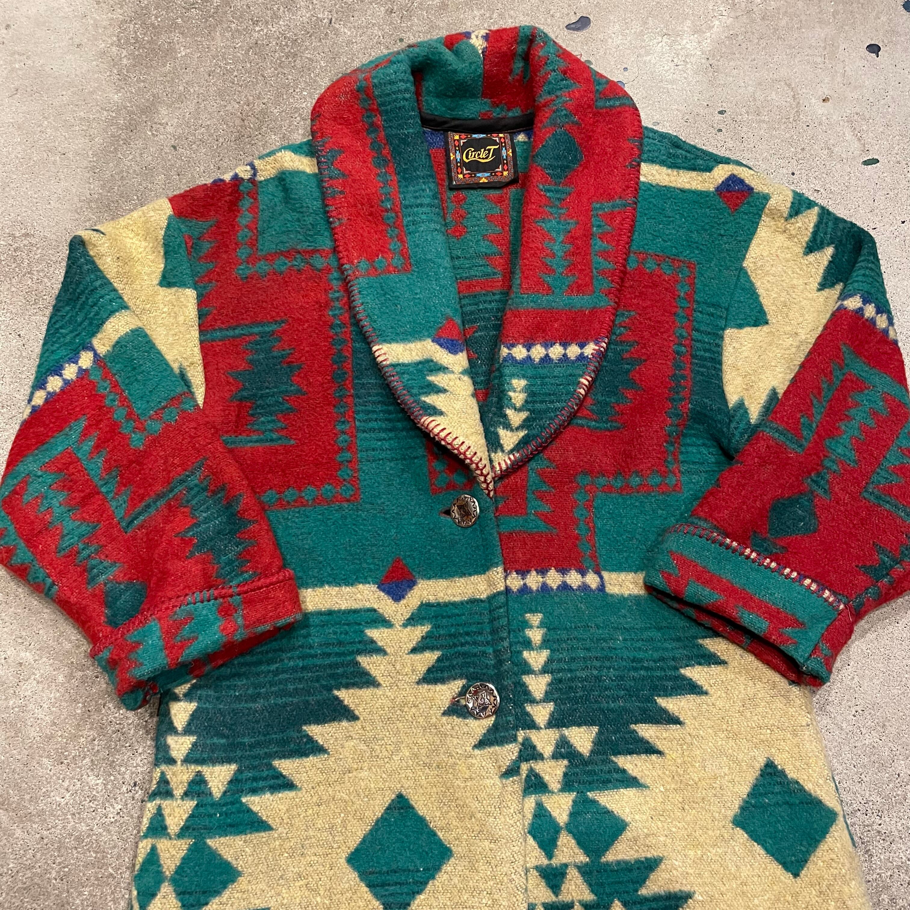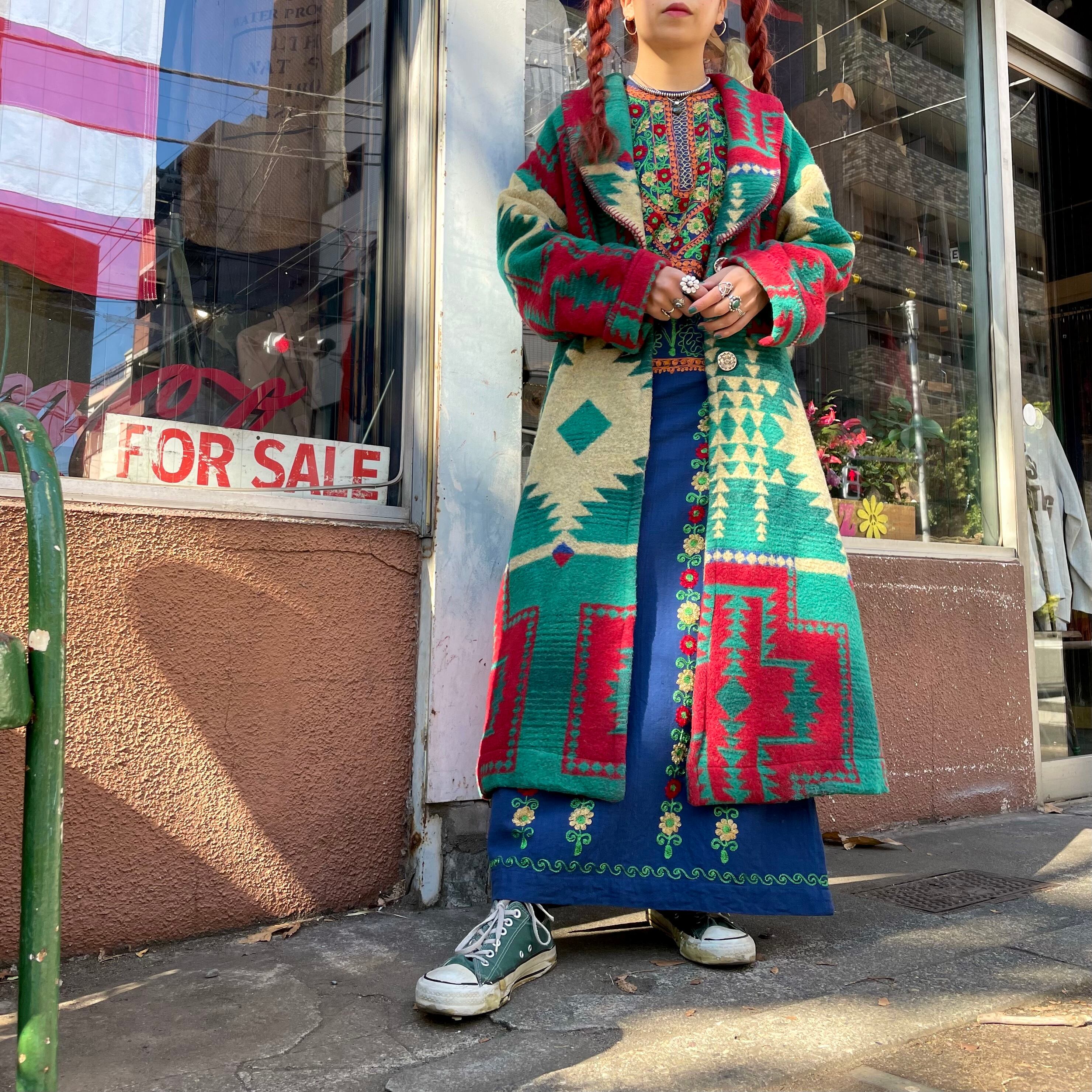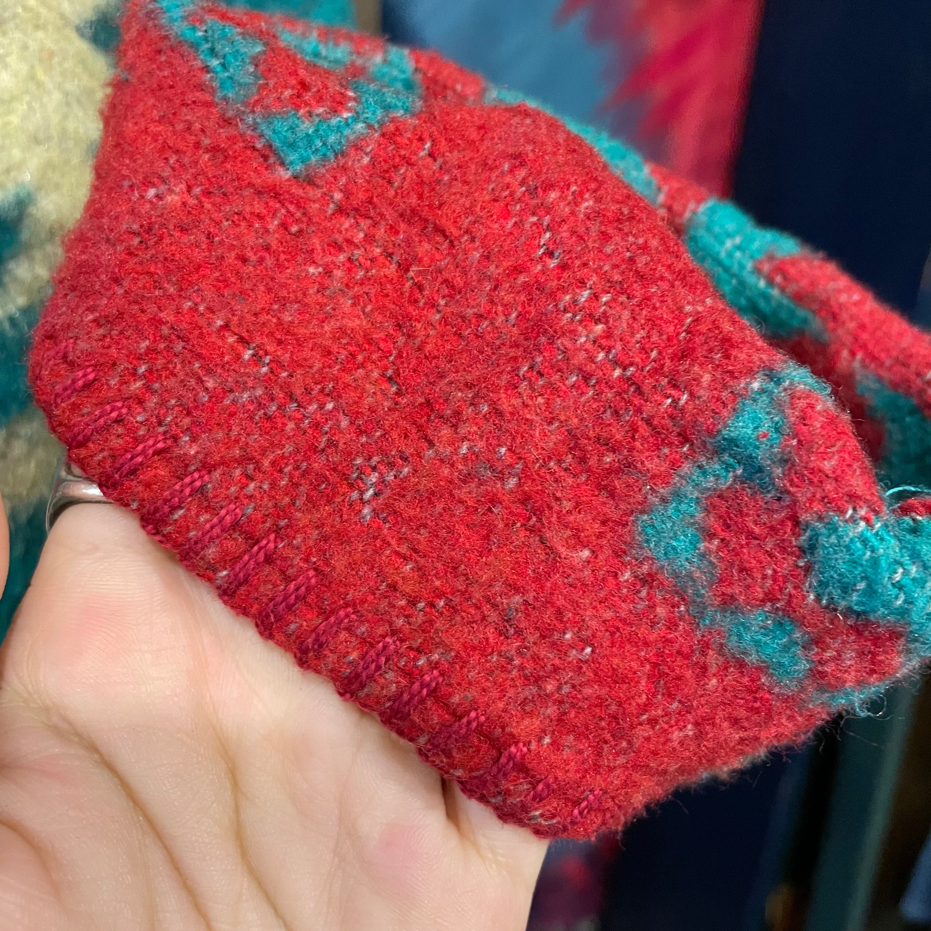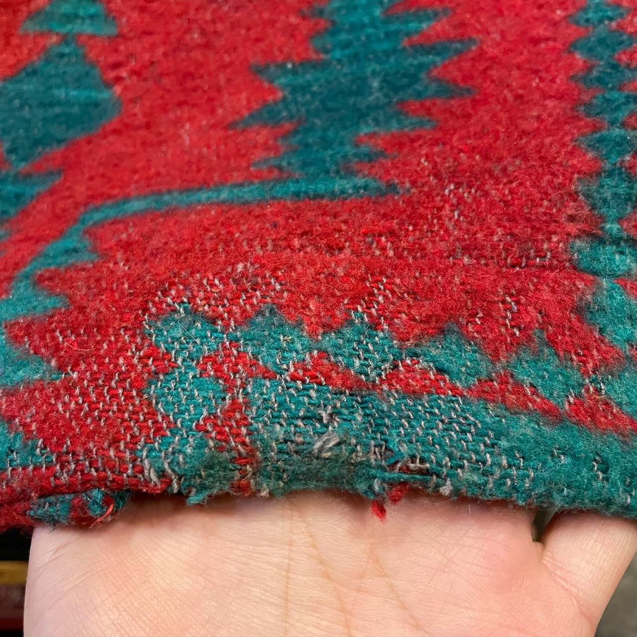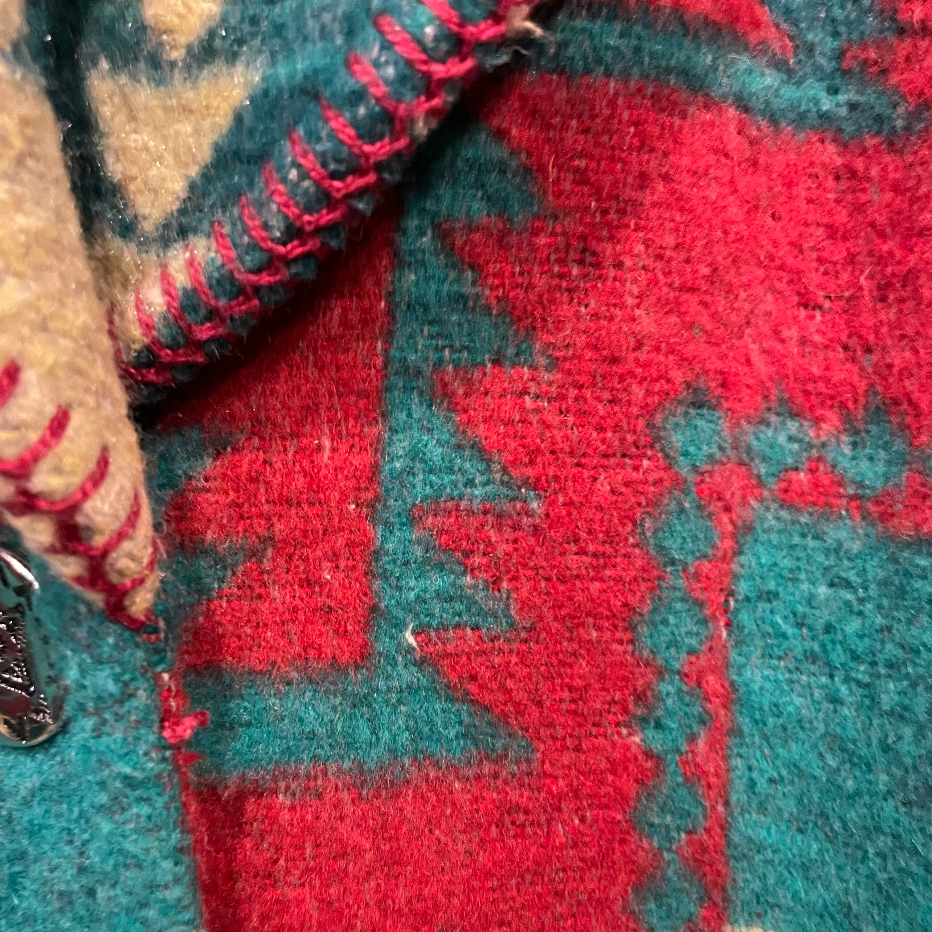 赤×緑の色合いも良い感じですし、コンチョのような大きいボタンもポイントになっていて素敵です。とても雰囲気のある一着ですので中はシンプルにまとめても良いですし、派手めなワンピースとも相性の良さそうな、意外と気軽に着られておすすめの一着です。