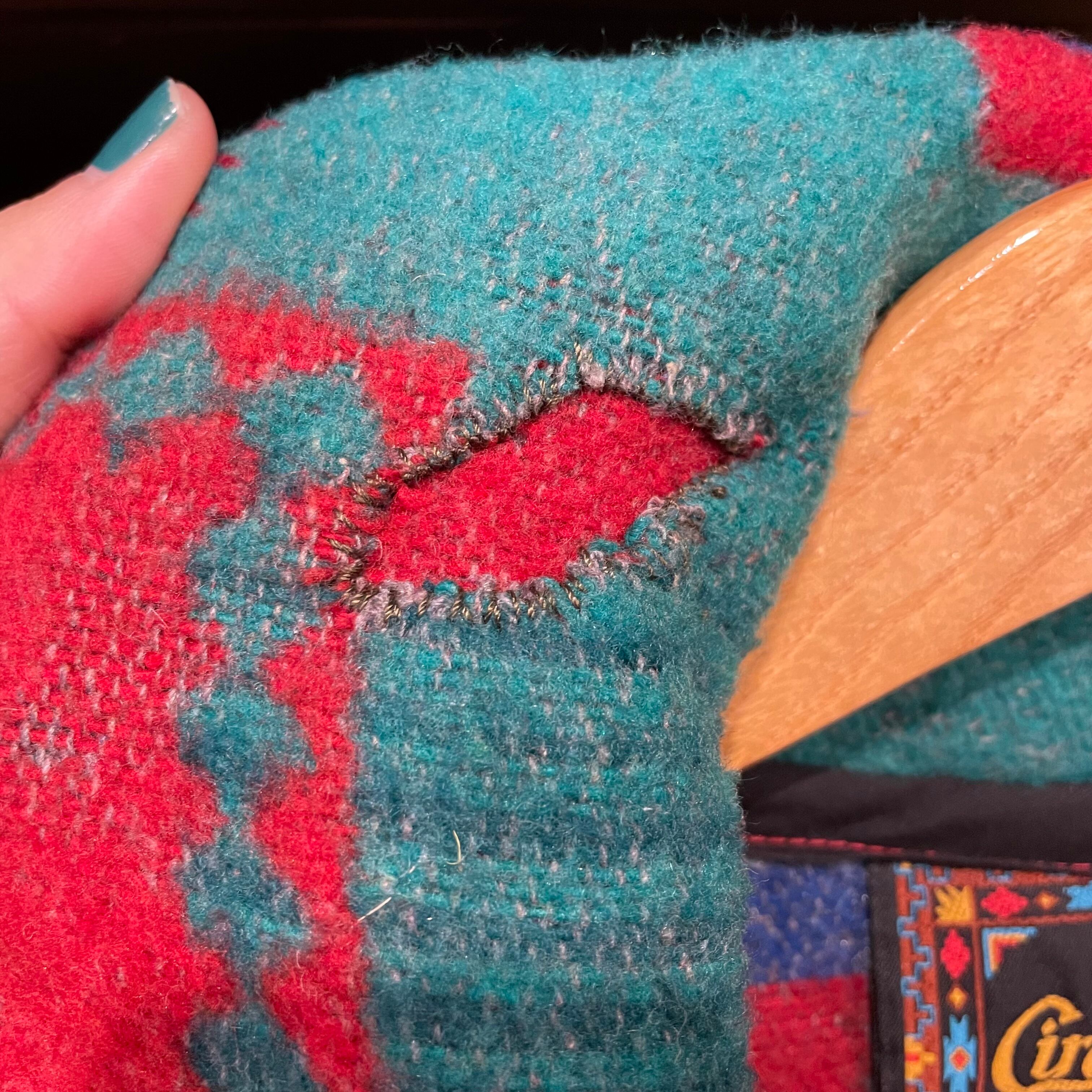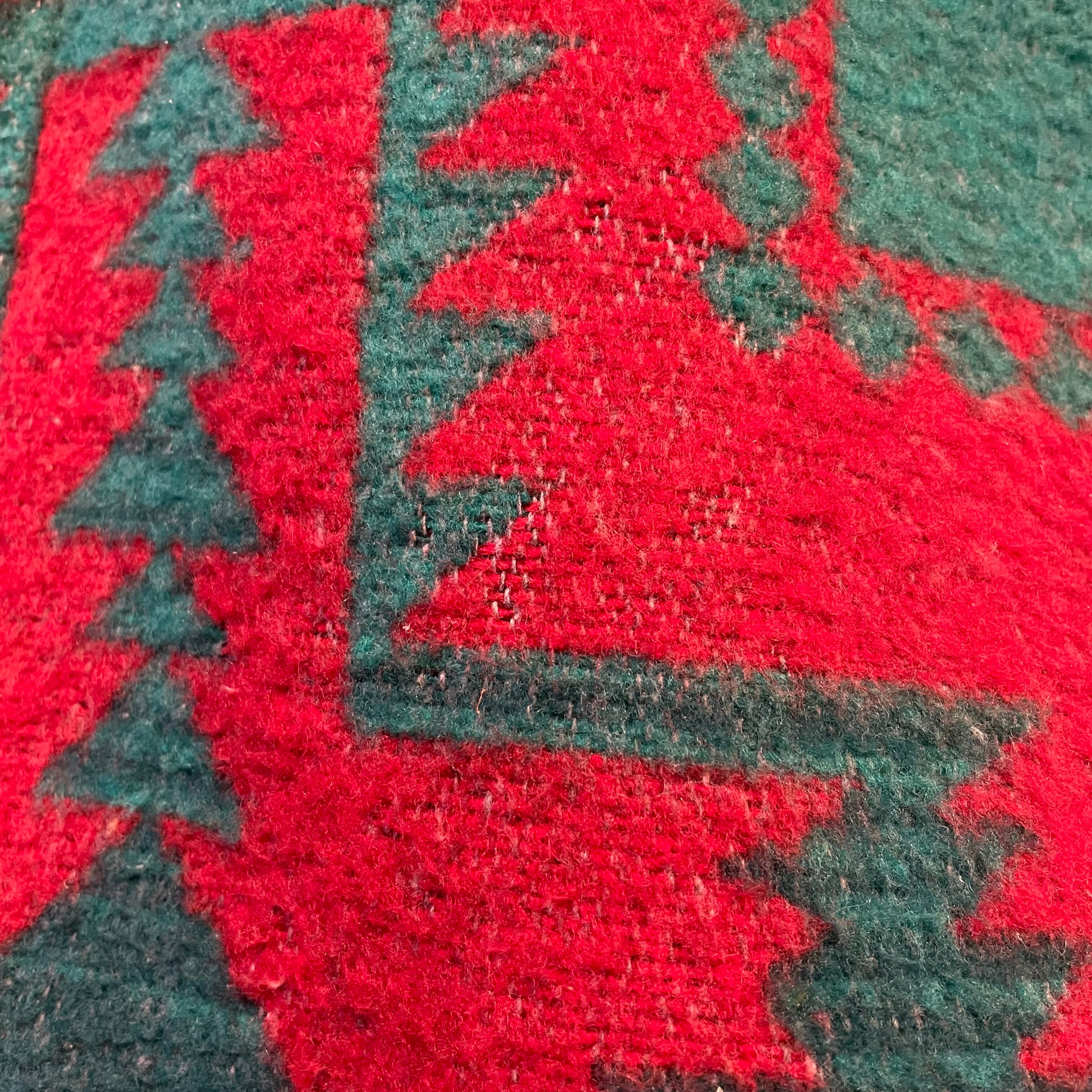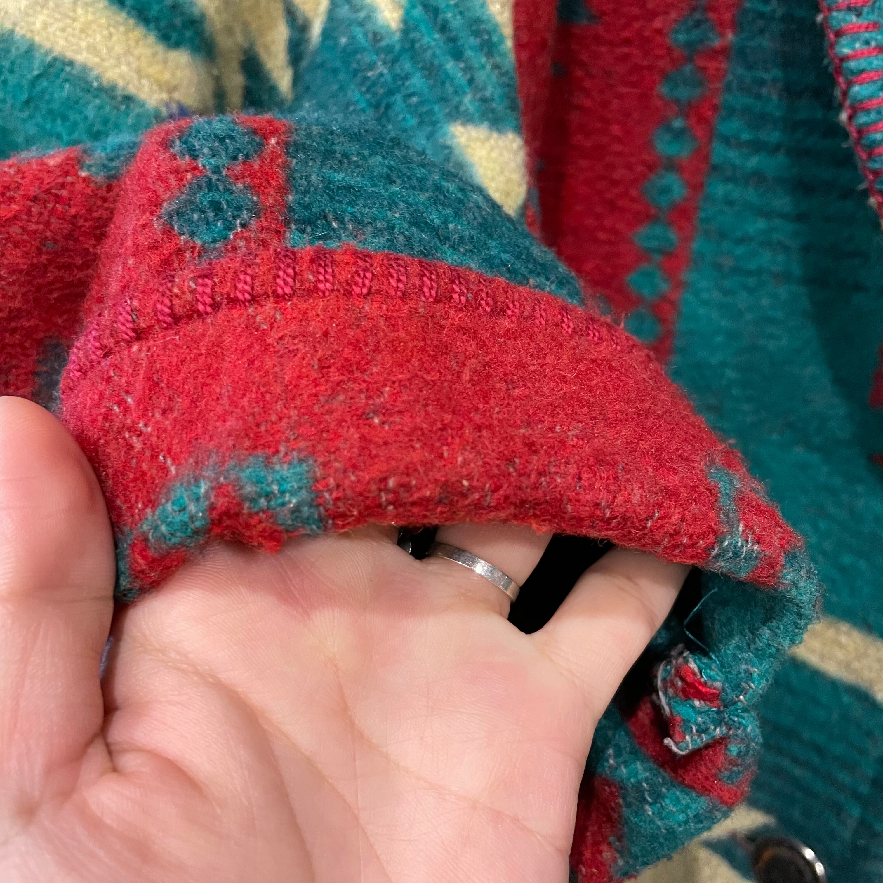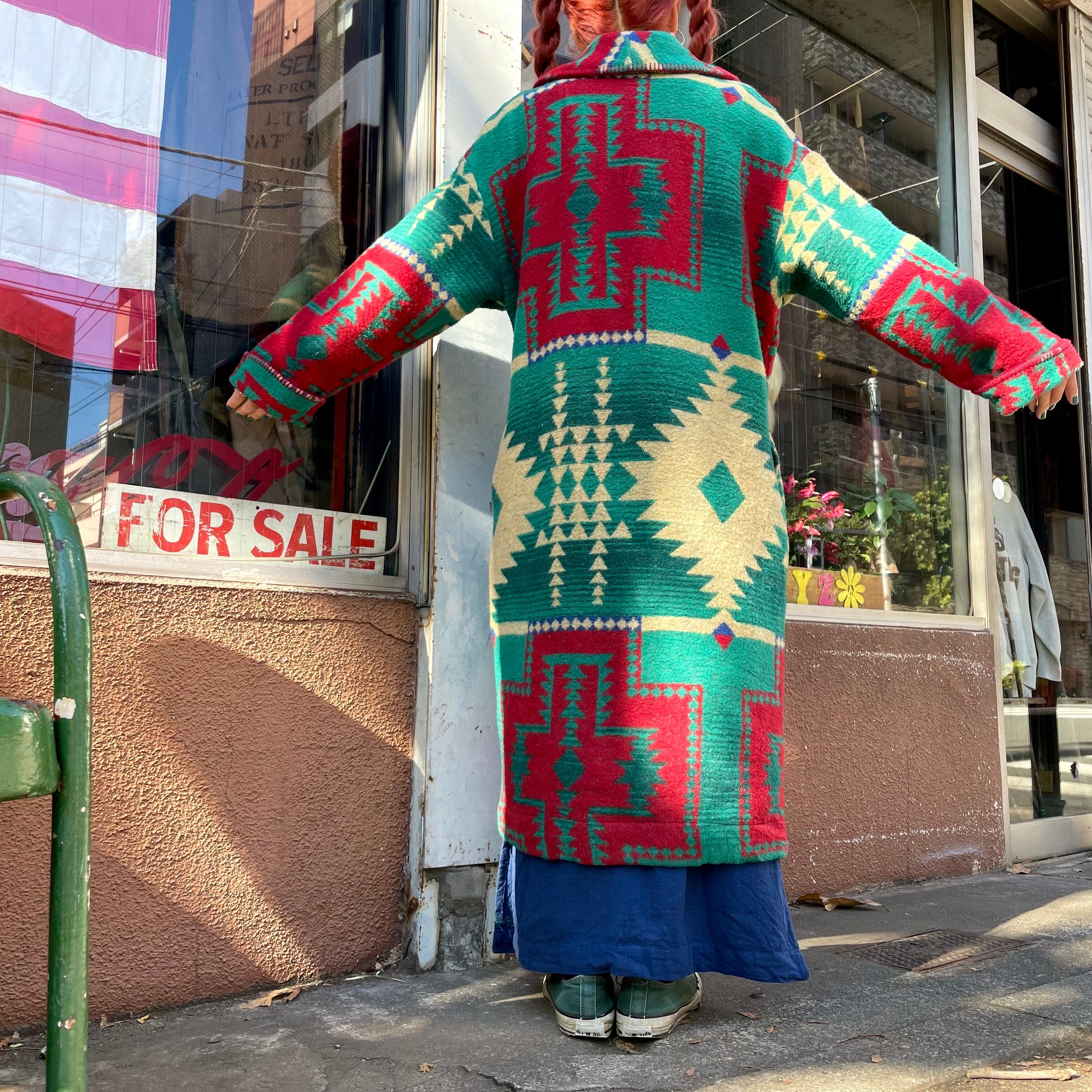 赤×緑の色合いも良い感じですし、コンチョのような大きいボタンもポイントになっていて素敵です。とても雰囲気のある一着ですので中はシンプルにまとめても良いですし、派手めなワンピースとも相性の良さそうな、意外と気軽に着られておすすめの一着です。