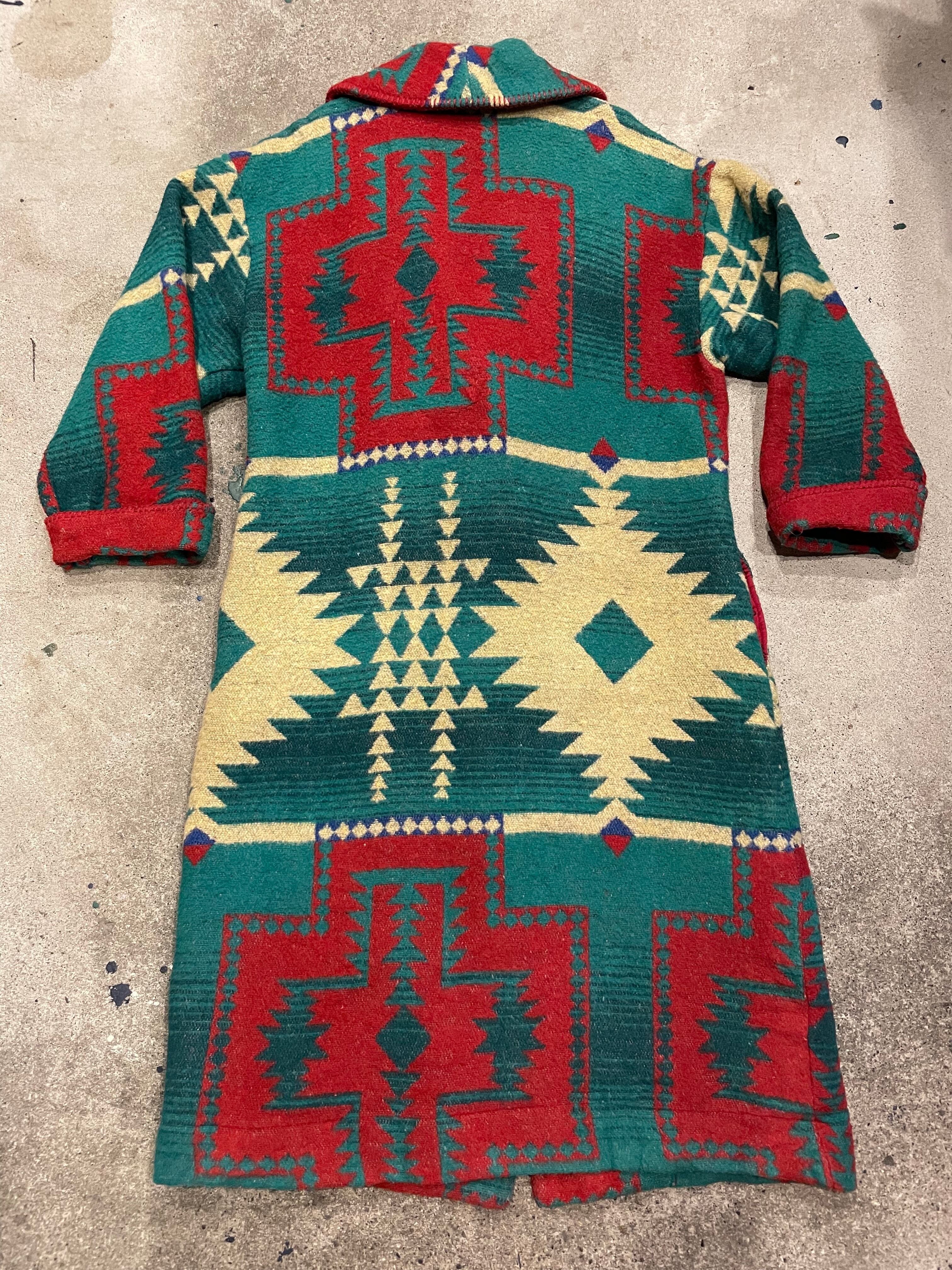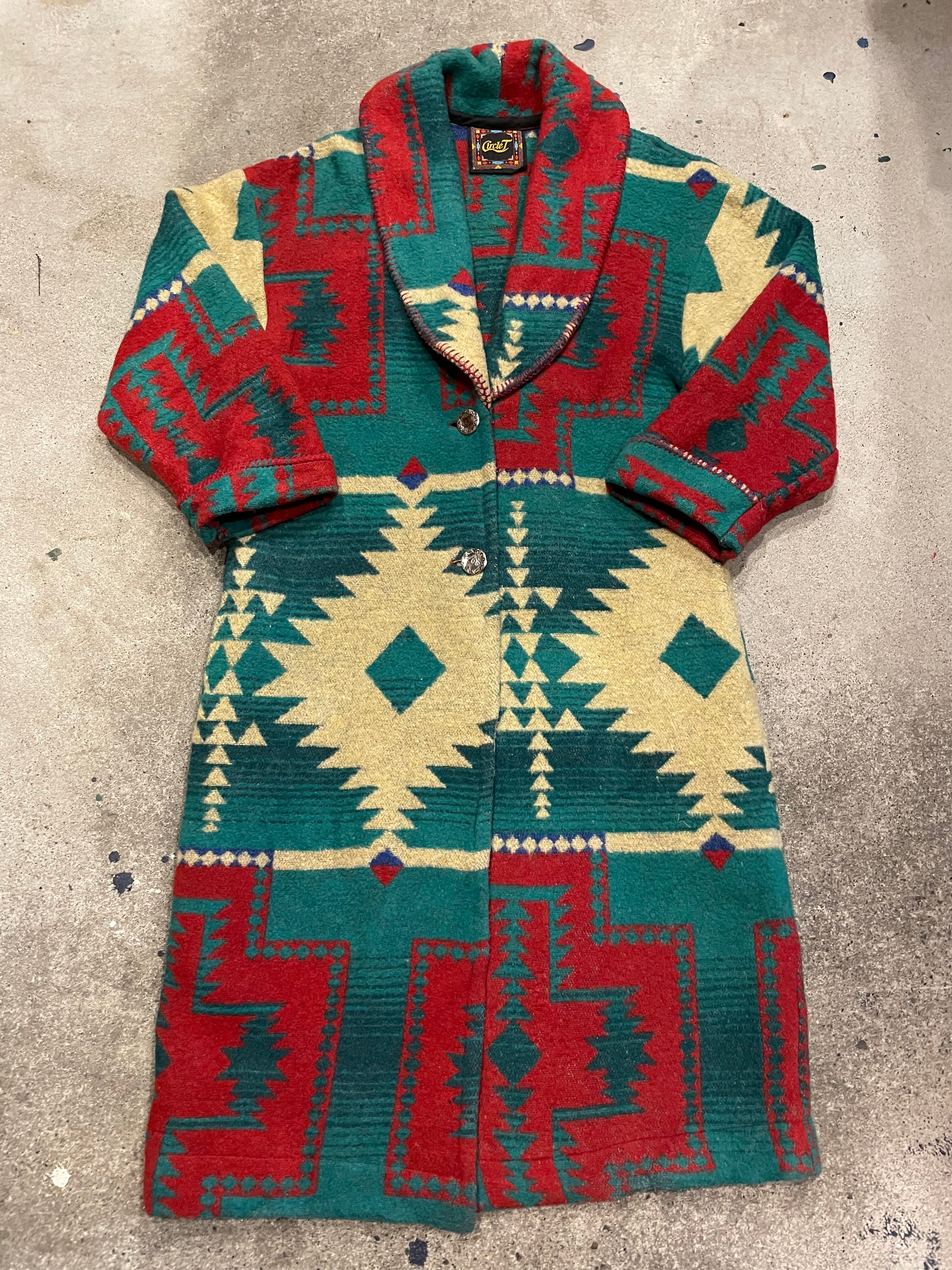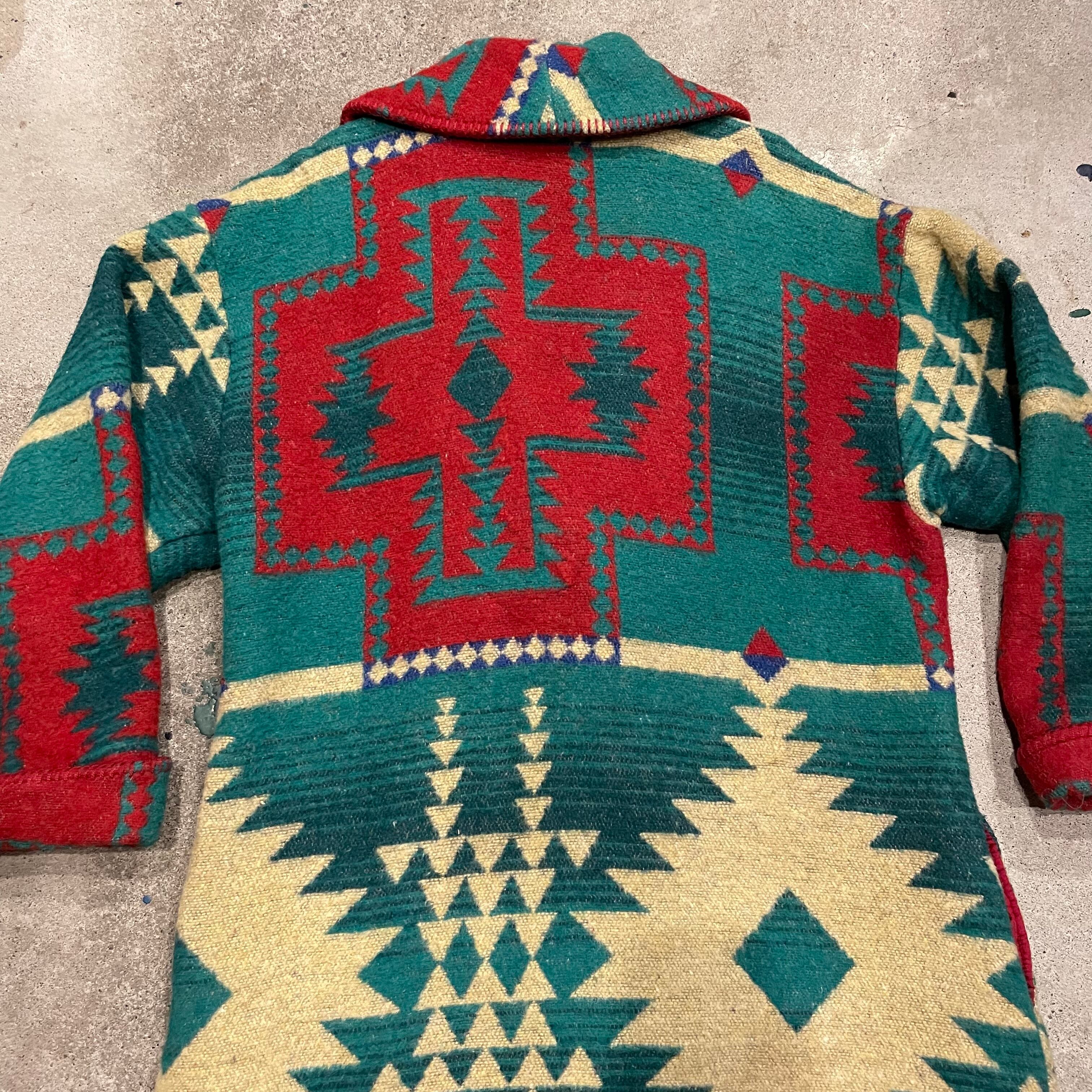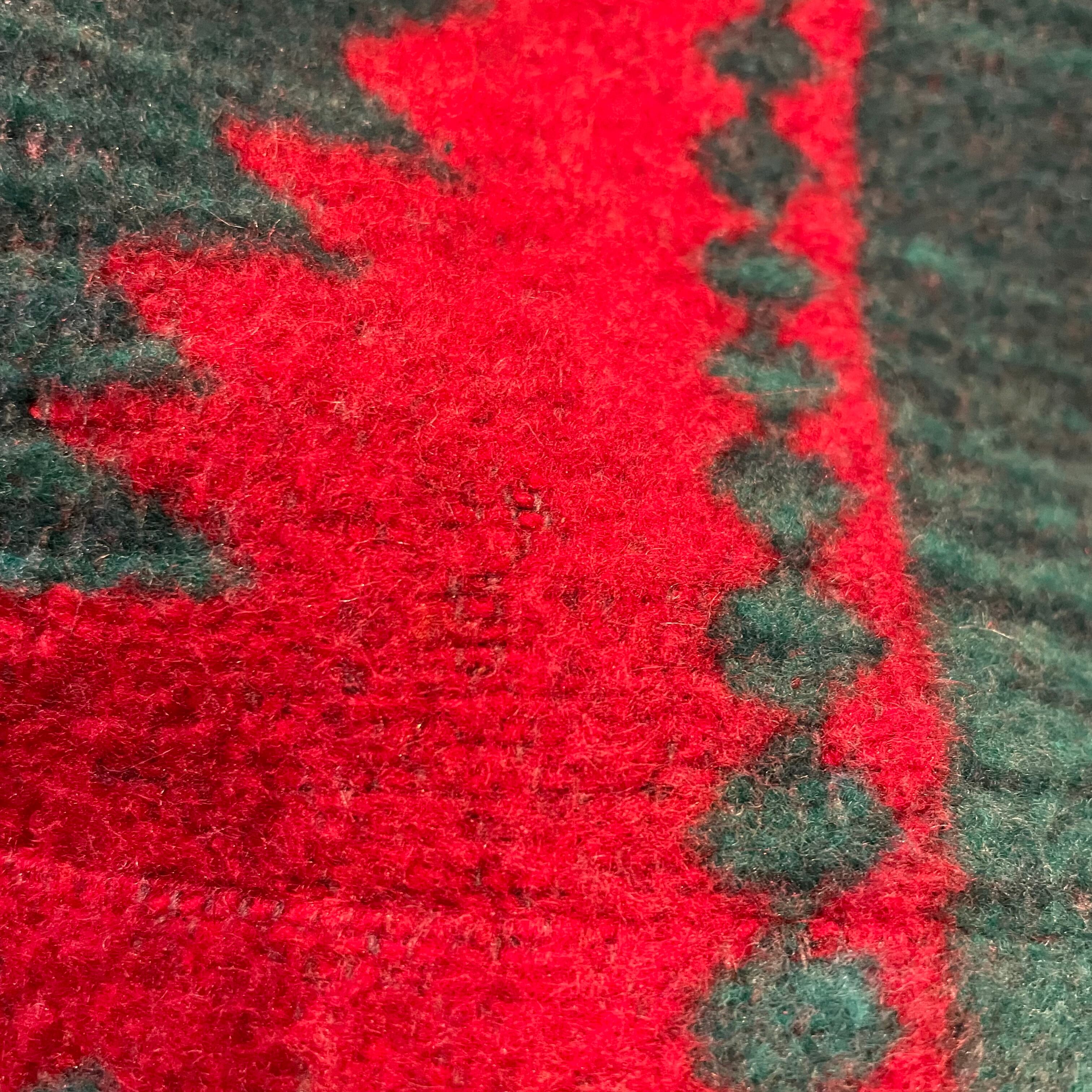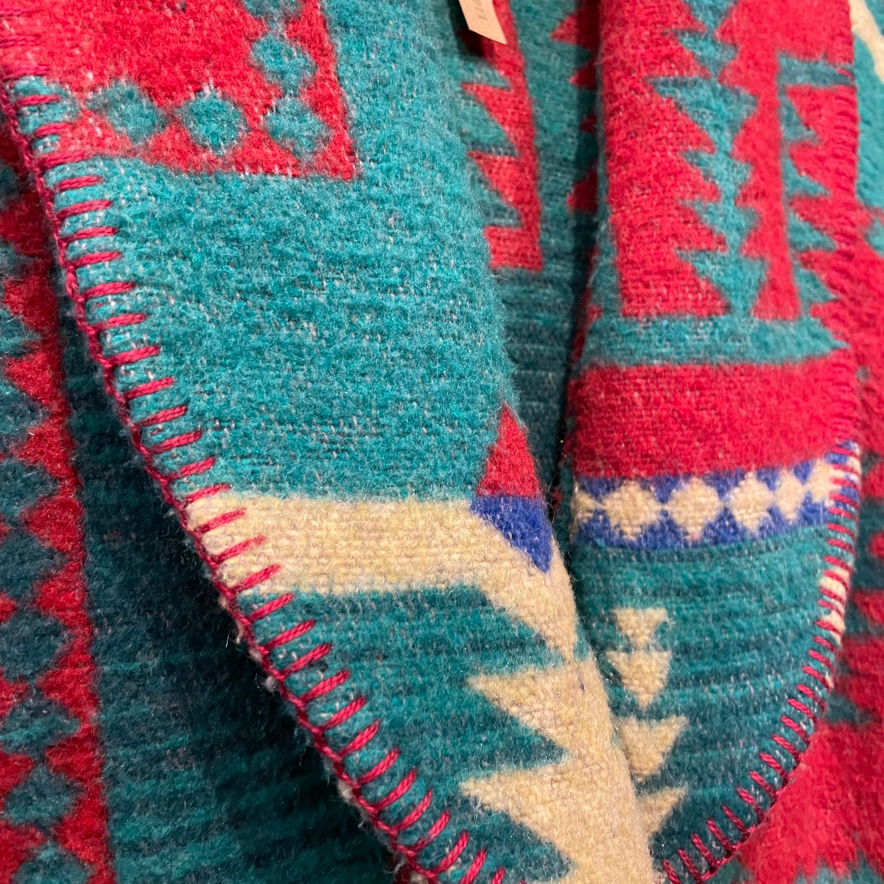 赤×緑の色合いも良い感じですし、コンチョのような大きいボタンもポイントになっていて素敵です。とても雰囲気のある一着ですので中はシンプルにまとめても良いですし、派手めなワンピースとも相性の良さそうな、意外と気軽に着られておすすめの一着です。