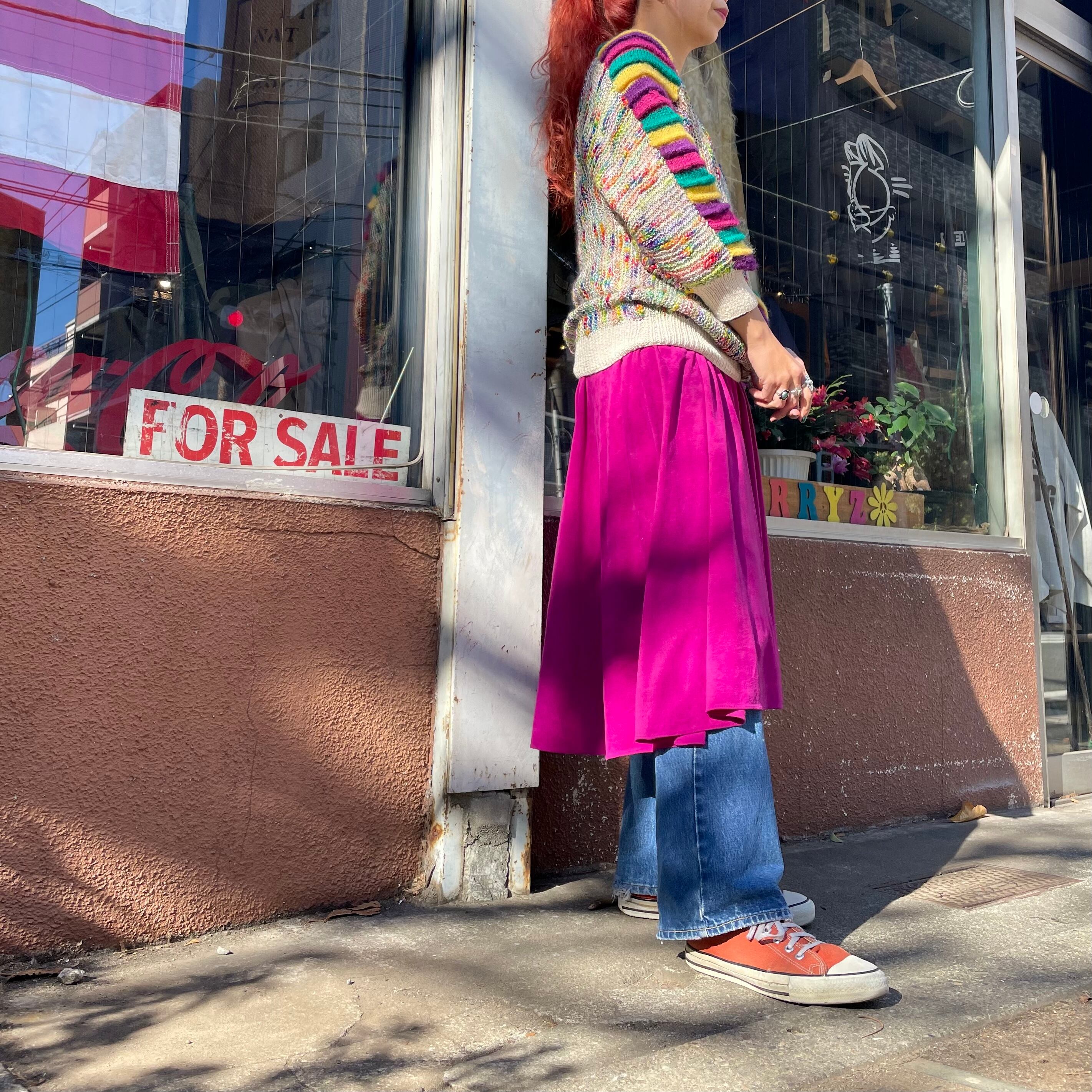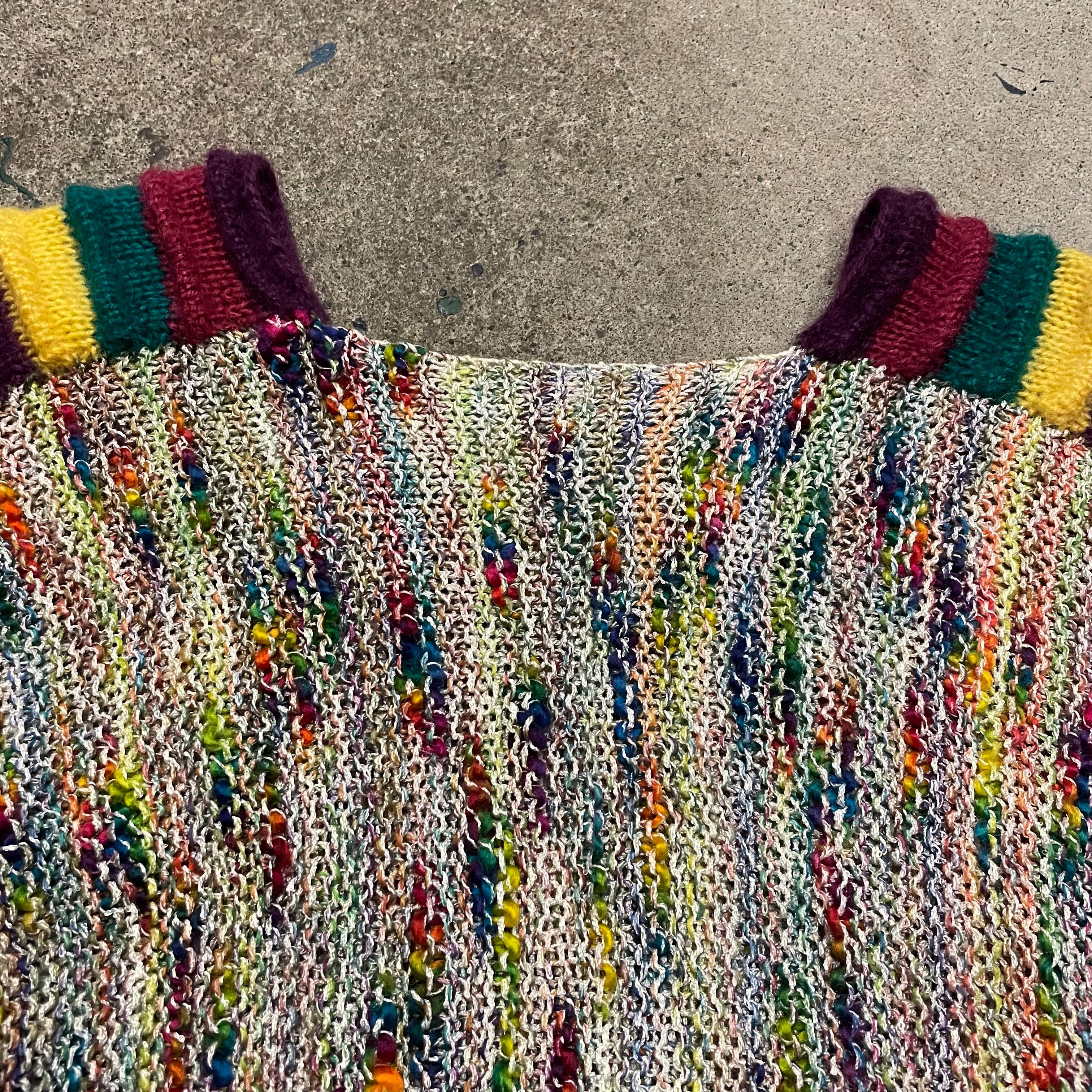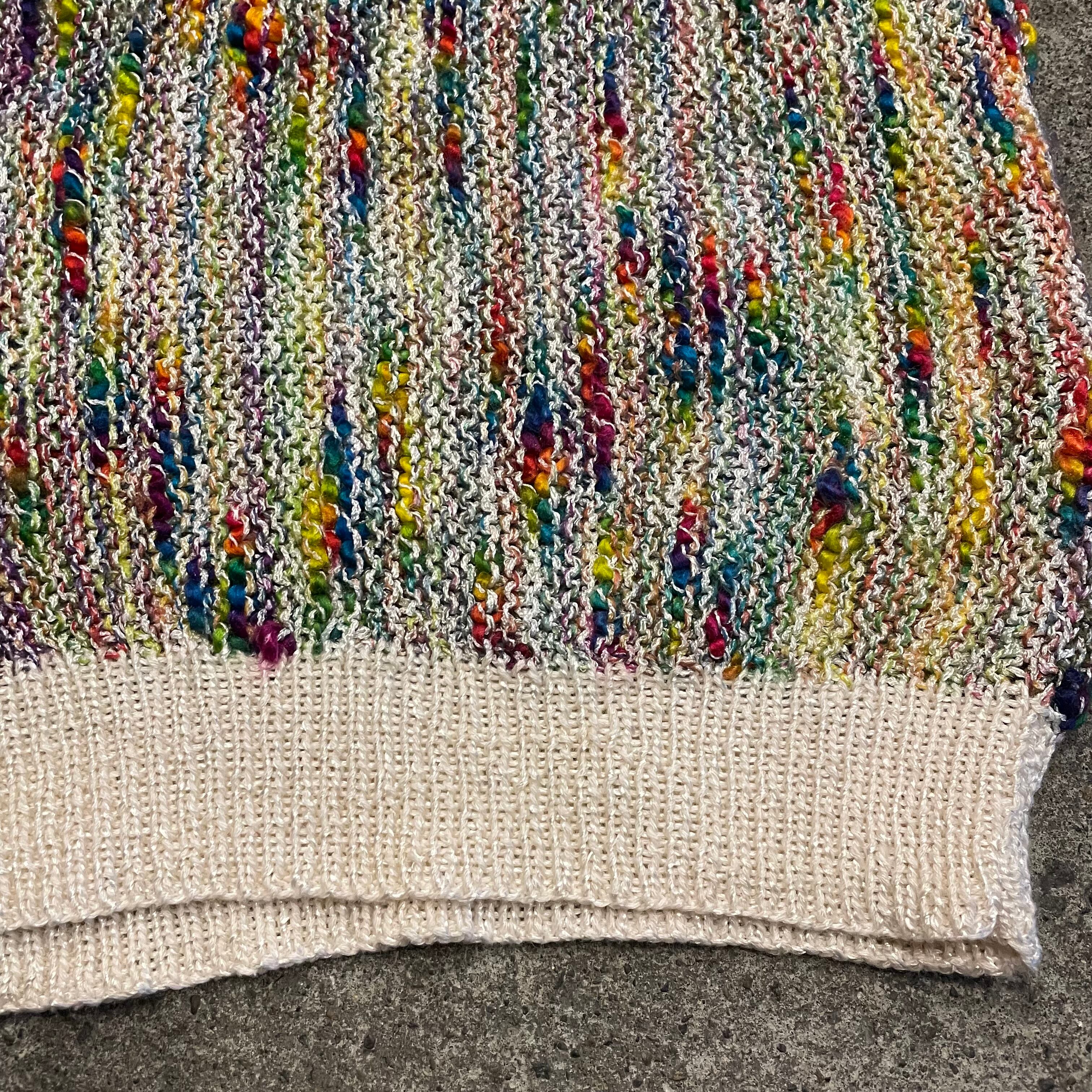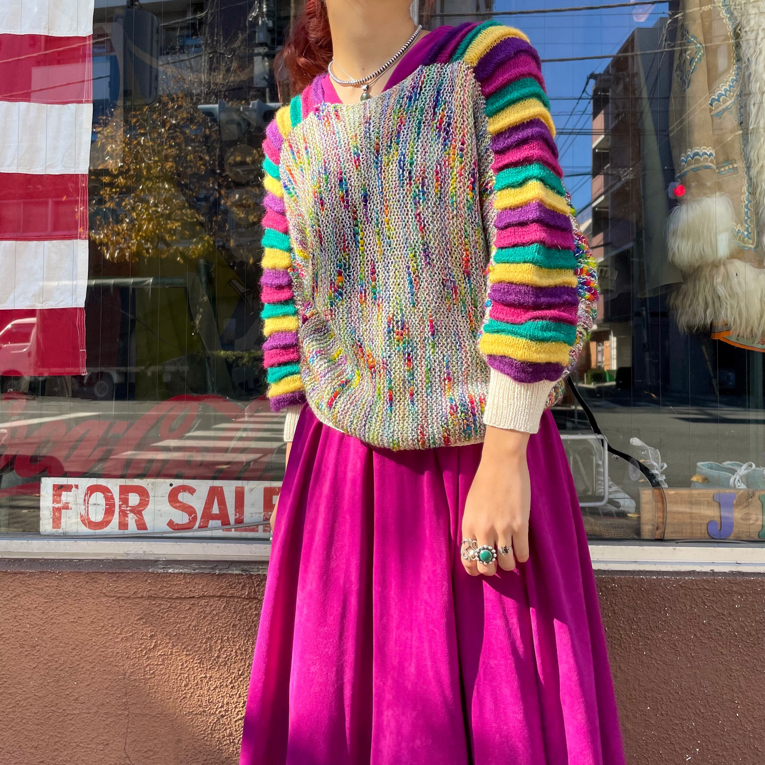 身頃部分もレインボーな糸を使っていたり、とてもポップで個性的な一枚です。シンプルにデニムと合わせたりオーバーオールの下に着てもかわいいですし、ドットやストライプなどの柄物と合わせても可愛いと思います。