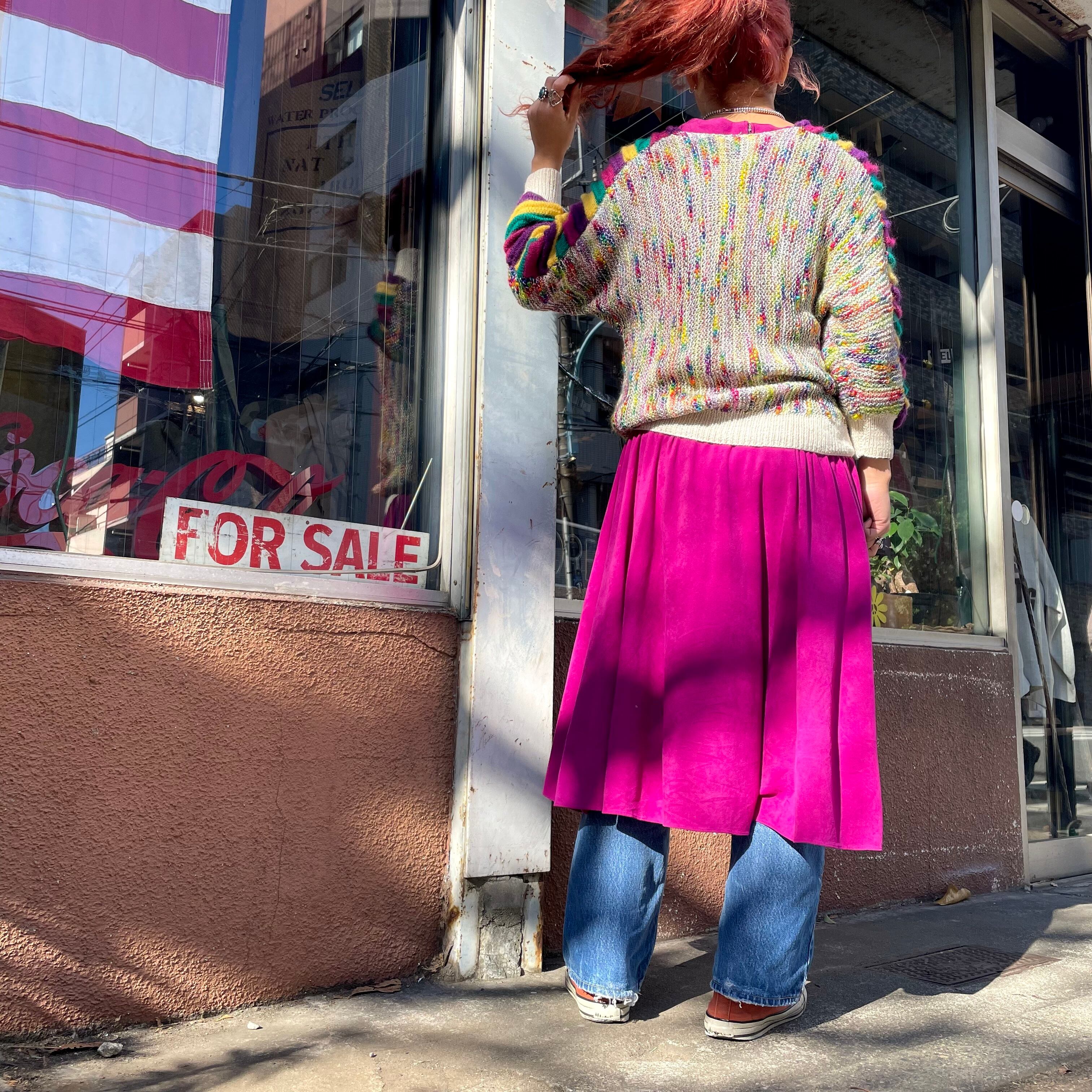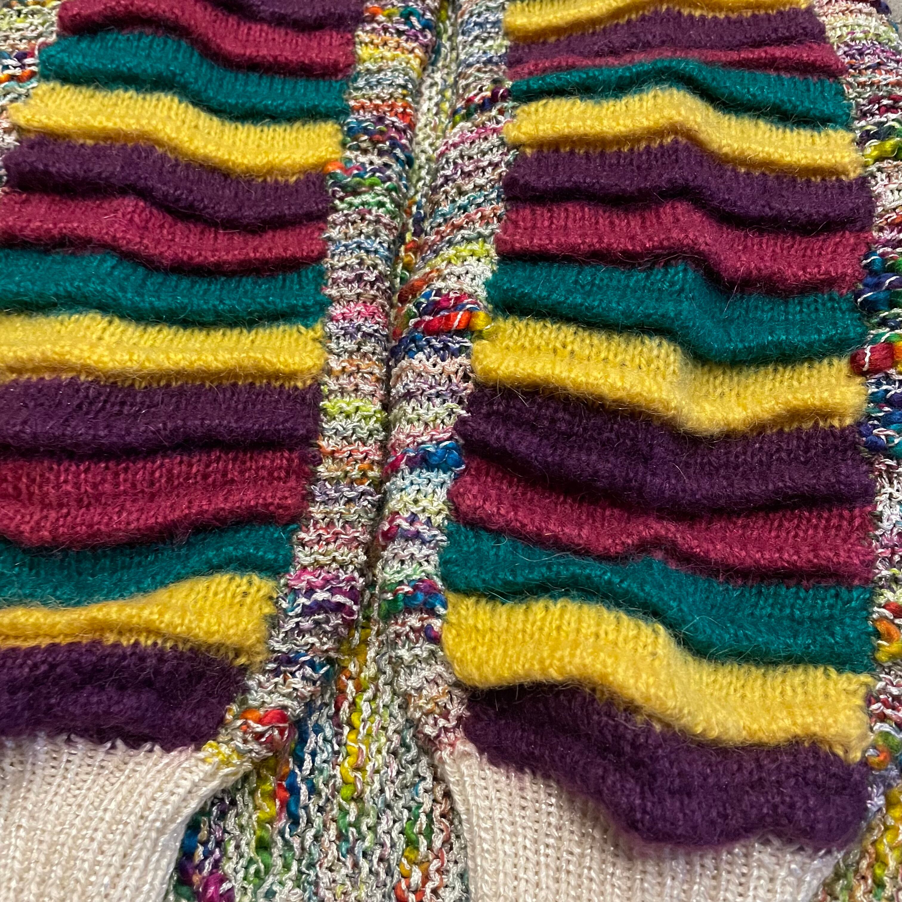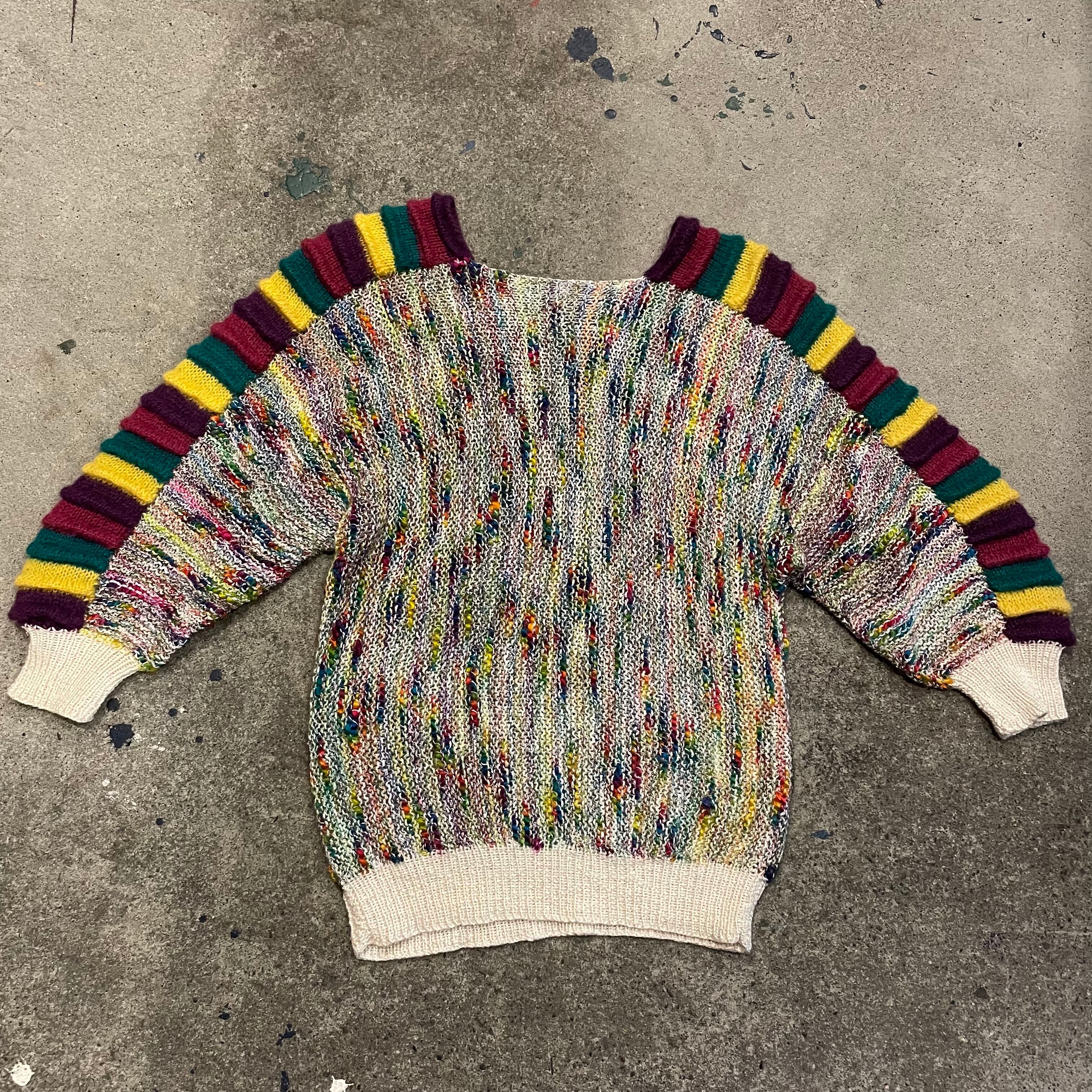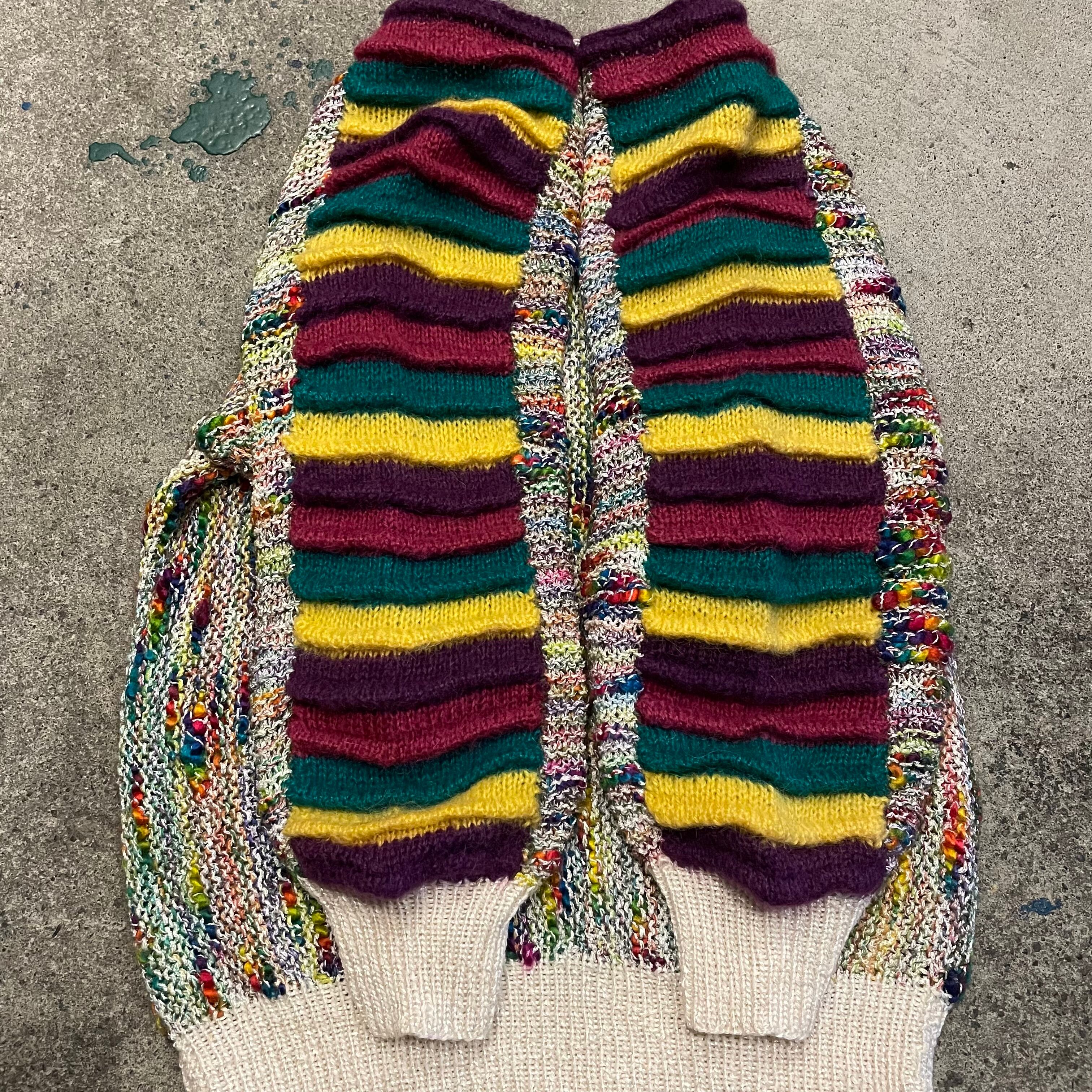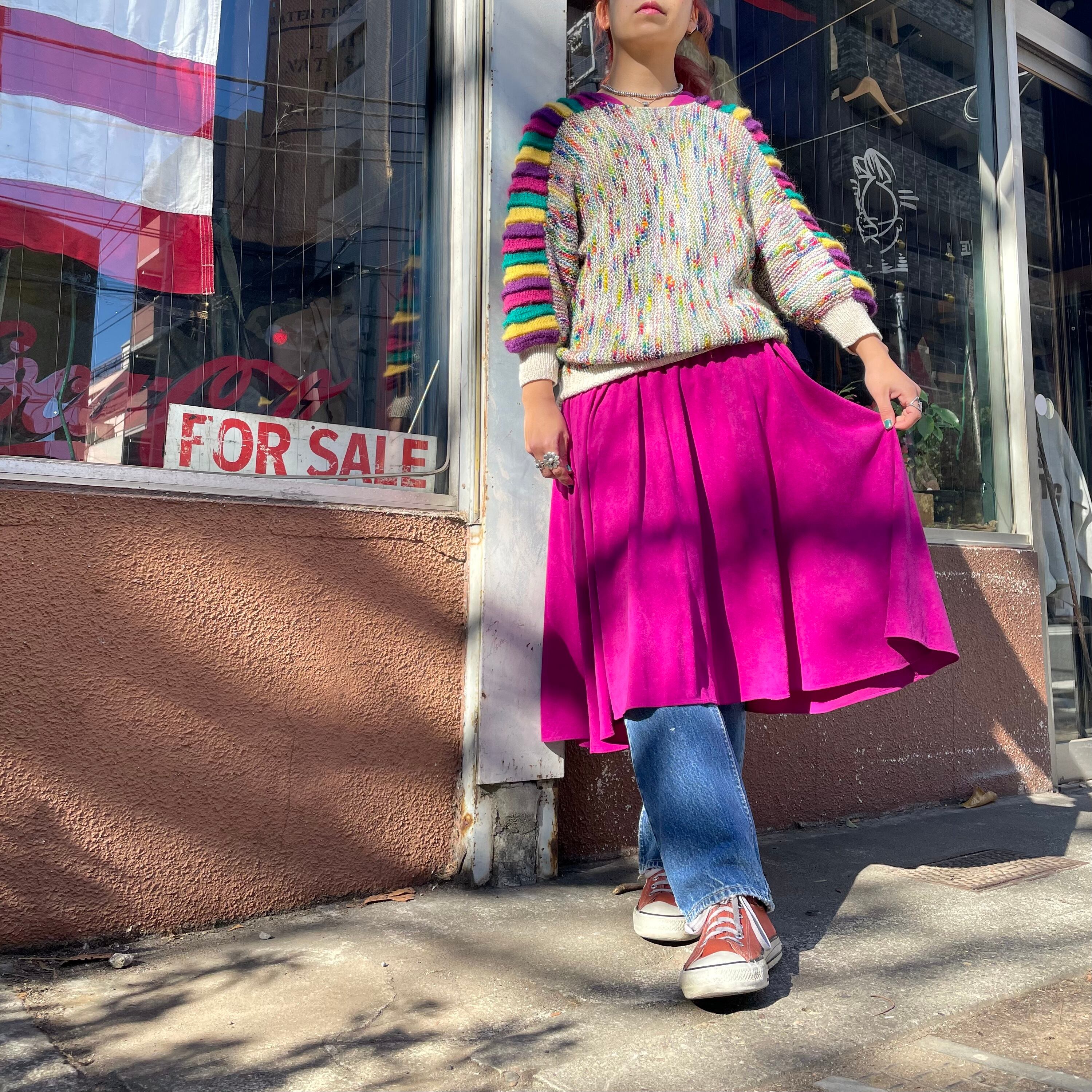 身頃部分もレインボーな糸を使っていたり、とてもポップで個性的な一枚です。シンプルにデニムと合わせたりオーバーオールの下に着てもかわいいですし、ドットやストライプなどの柄物と合わせても可愛いと思います。