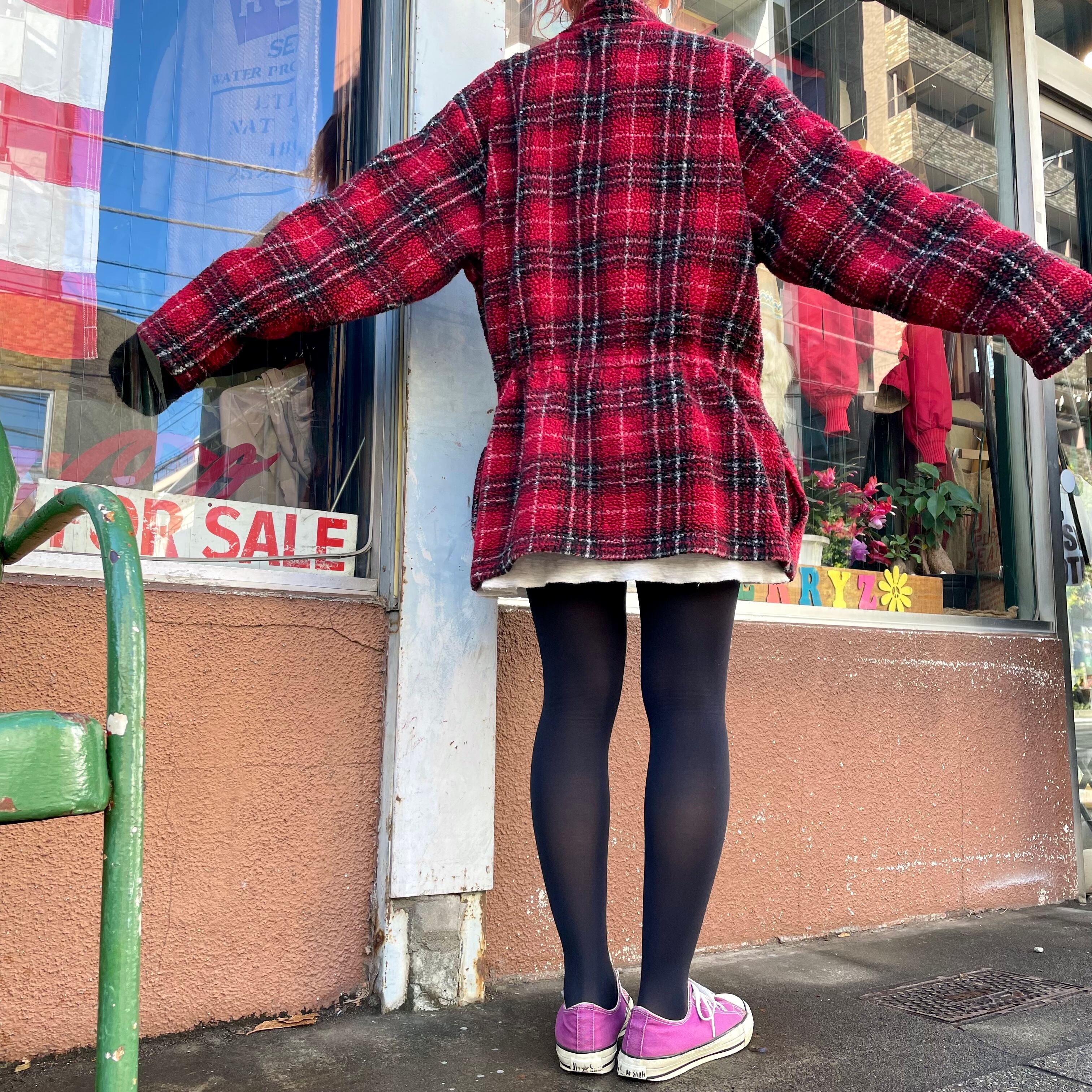 やや薄手ですがもこもこした素材感が暖かいですし、ゆったりしたサイズ感ですので中に厚手のニットやパーカーなども着ていただけます。ウエストに紐が入っていて絞れるのでシルエットを変えて楽しめますし、前を閉めてワンピースっぽく着ても開けてアウターとしてもお使いいただけます。胸にバッチをつけたりベレー帽やブーツと合わせてパンクな感じに着るのも良いですね!