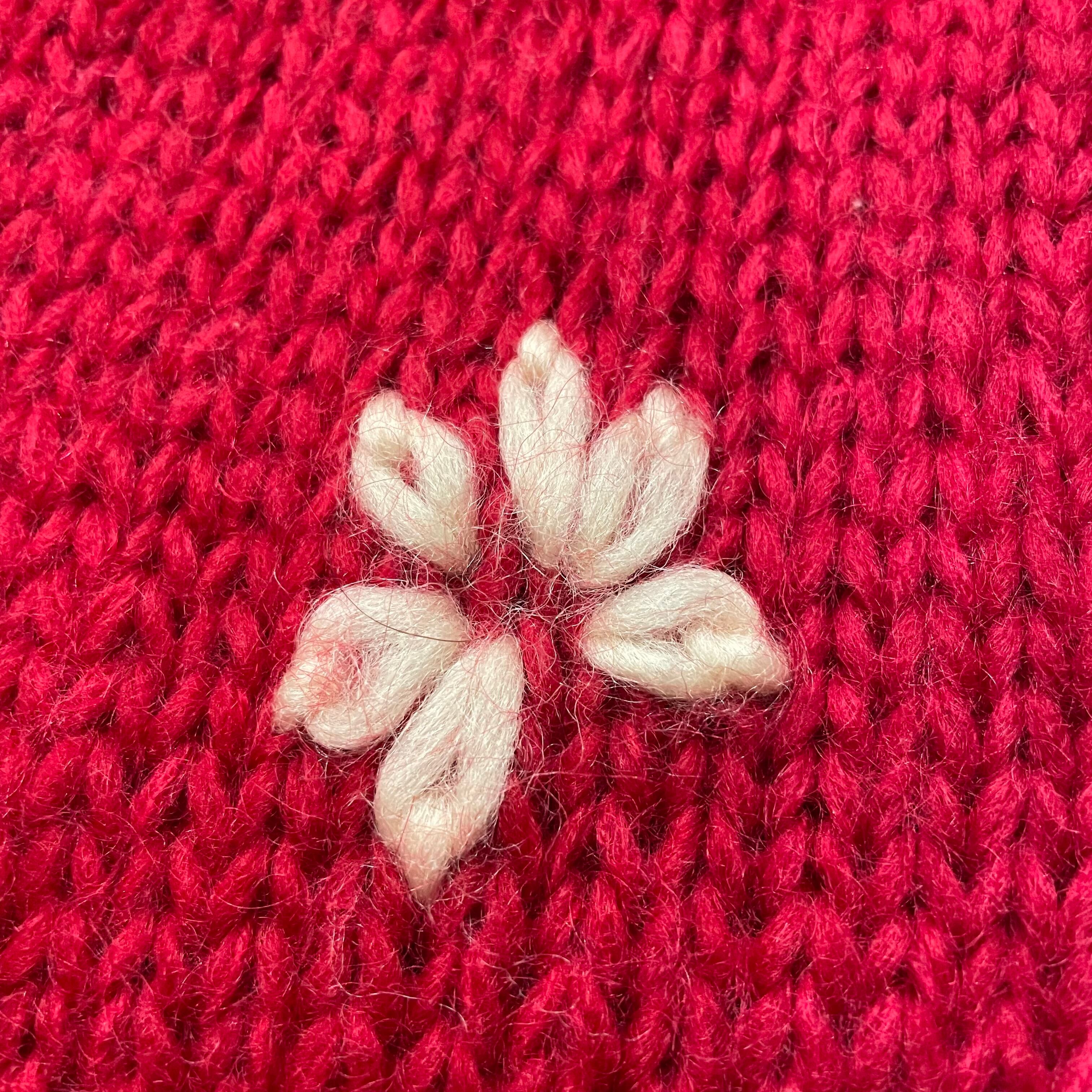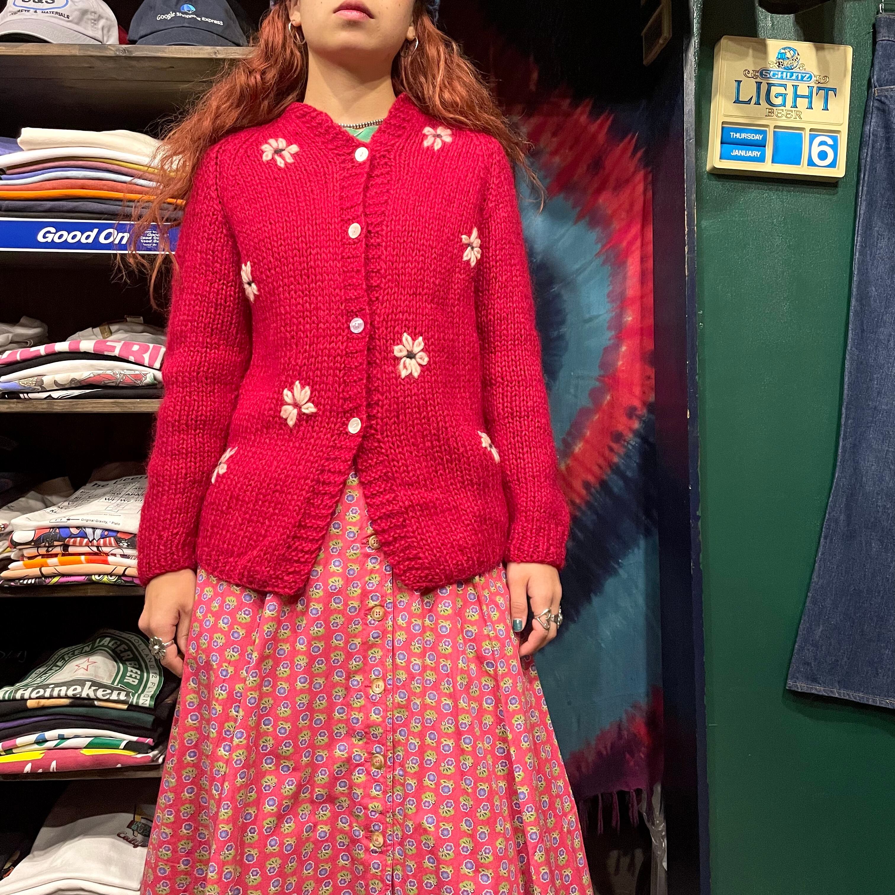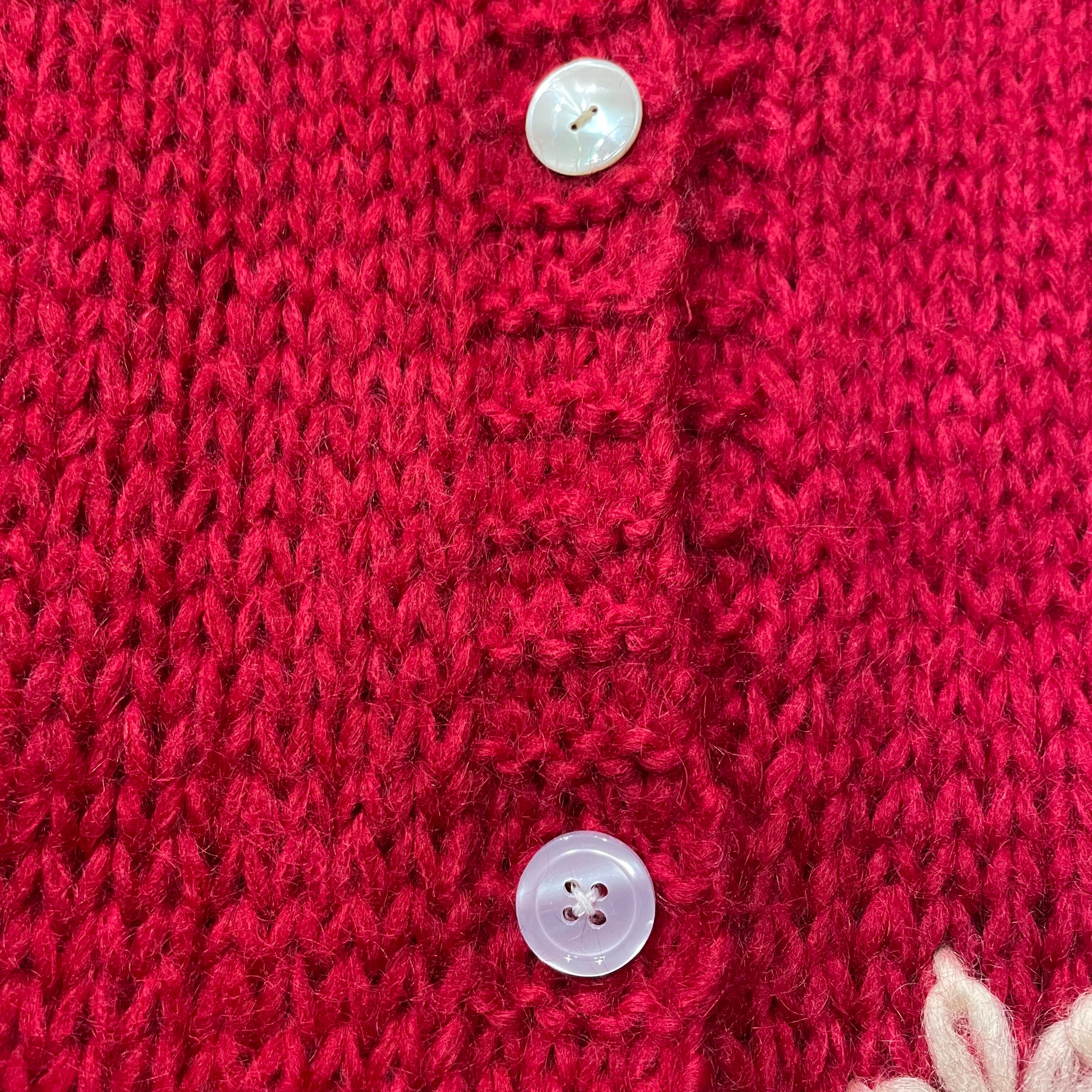 緩い手編みの雰囲気がかわいいカーディガンです。やや深みのある赤に白いお花が映えてシンプルながら印象的な一着です。