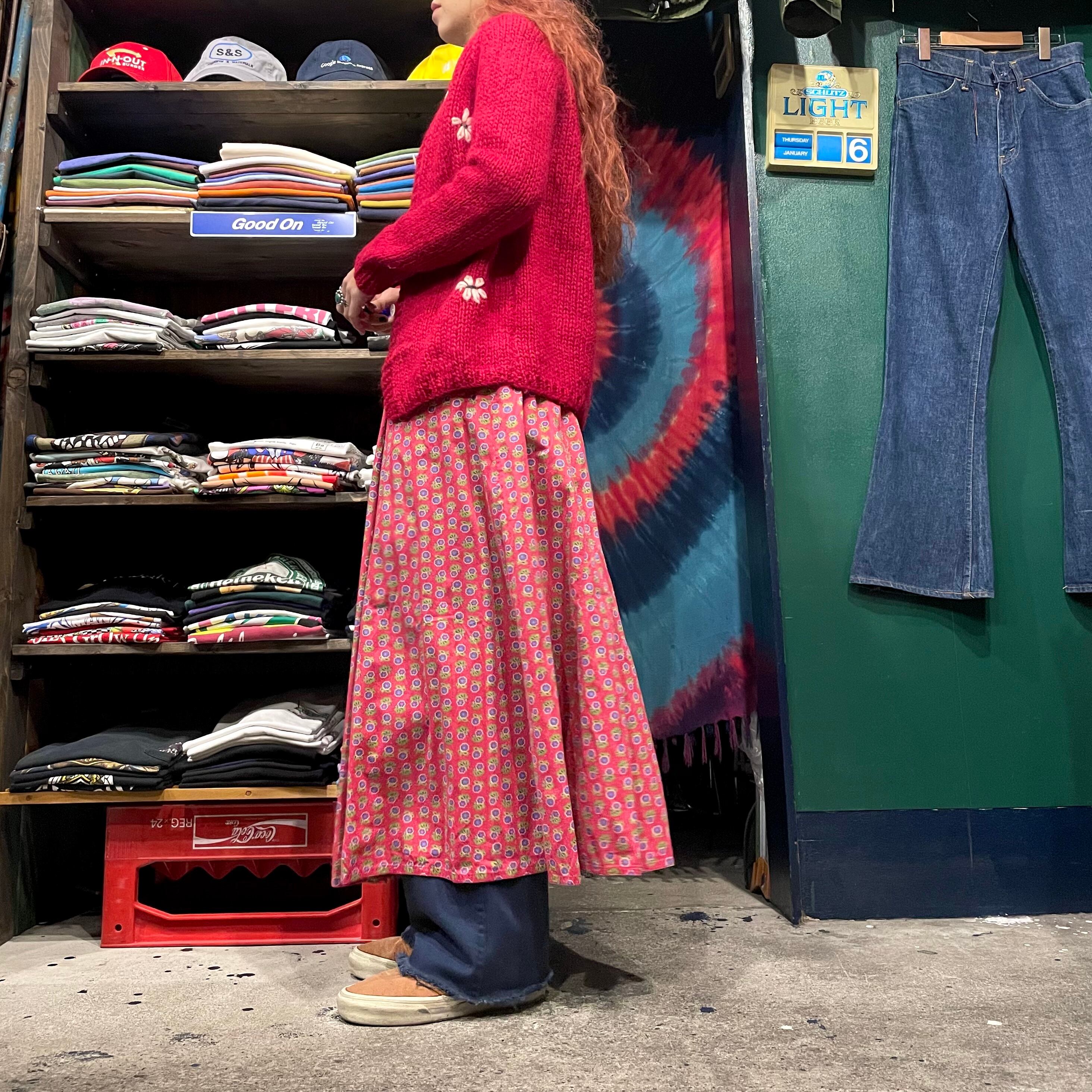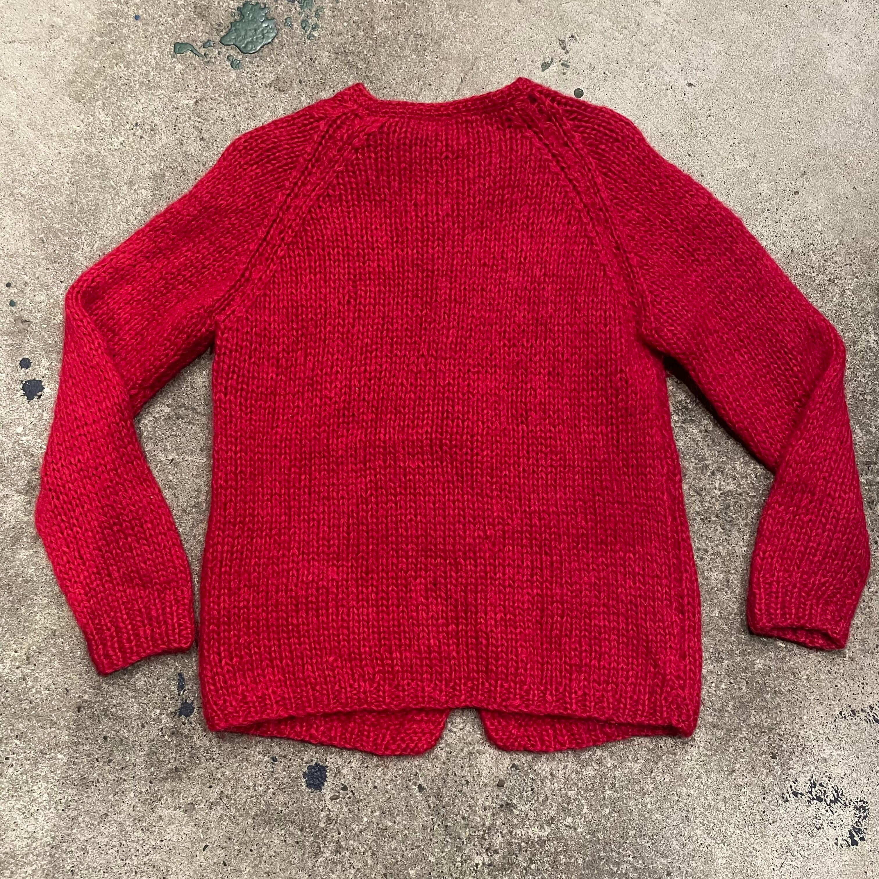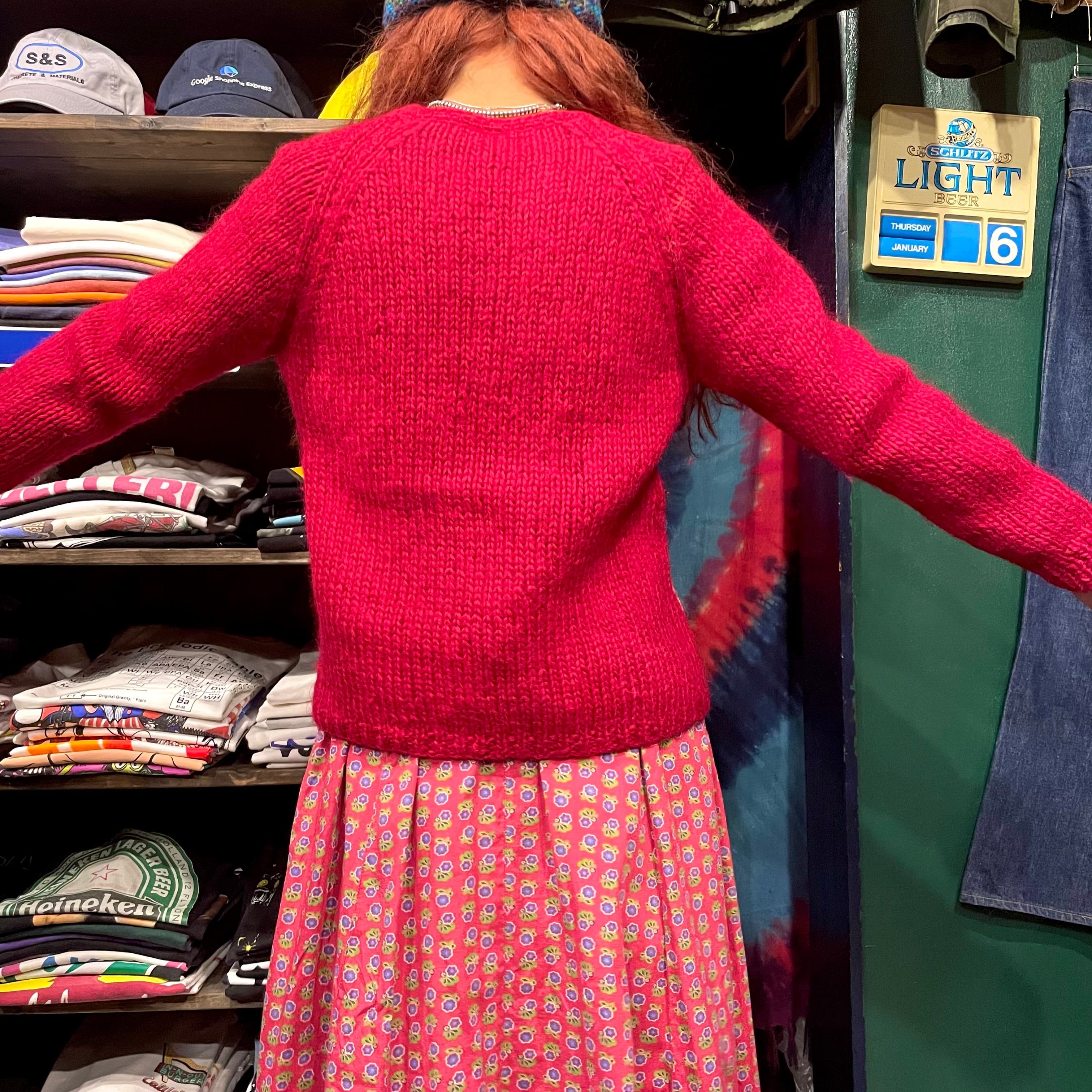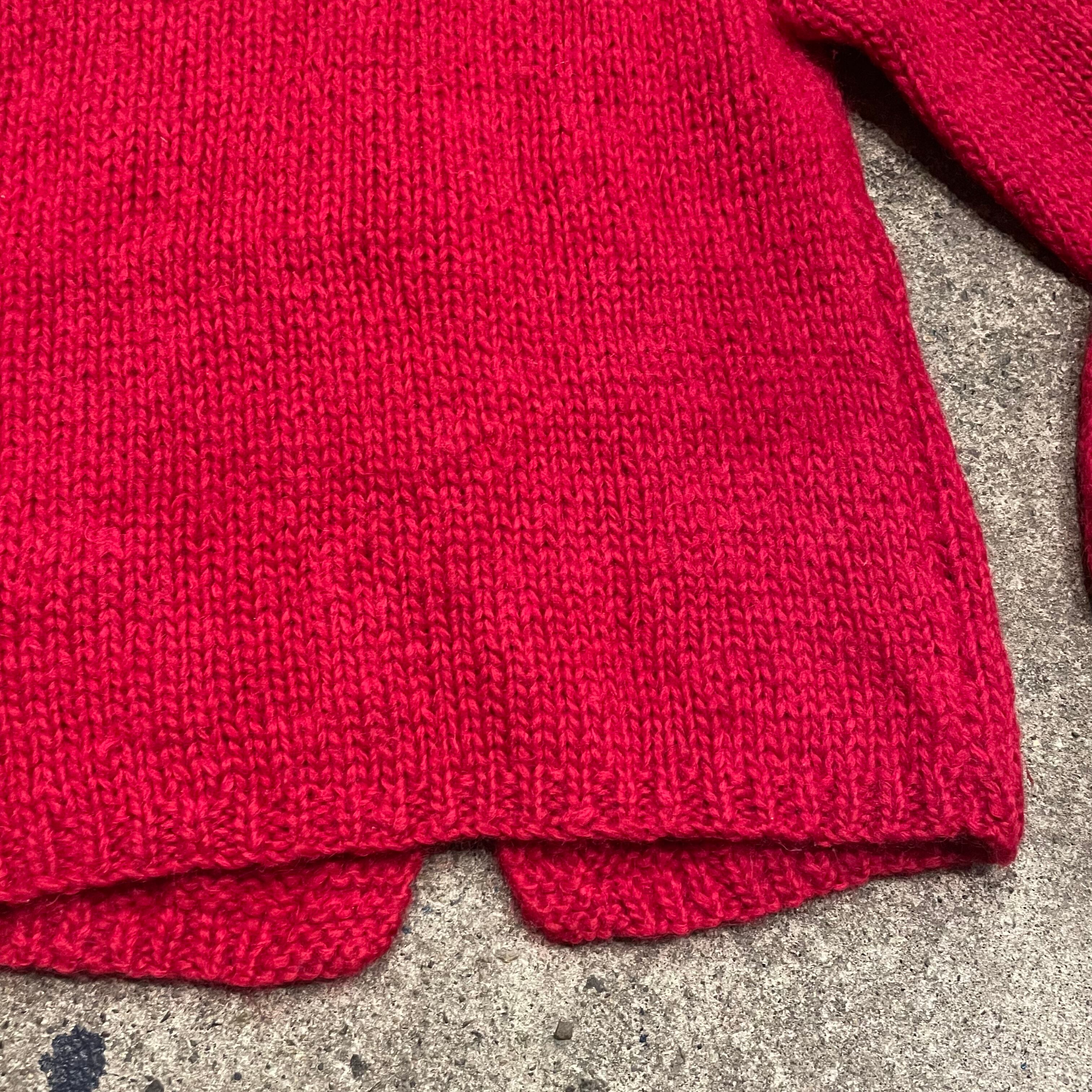 緩い手編みの雰囲気がかわいいカーディガンです。やや深みのある赤に白いお花が映えてシンプルながら印象的な一着です。