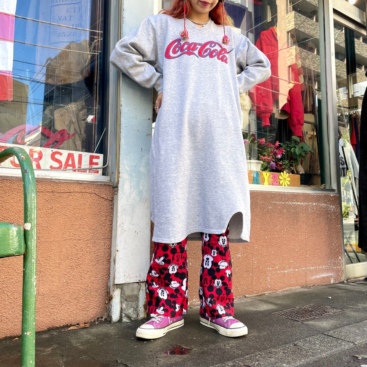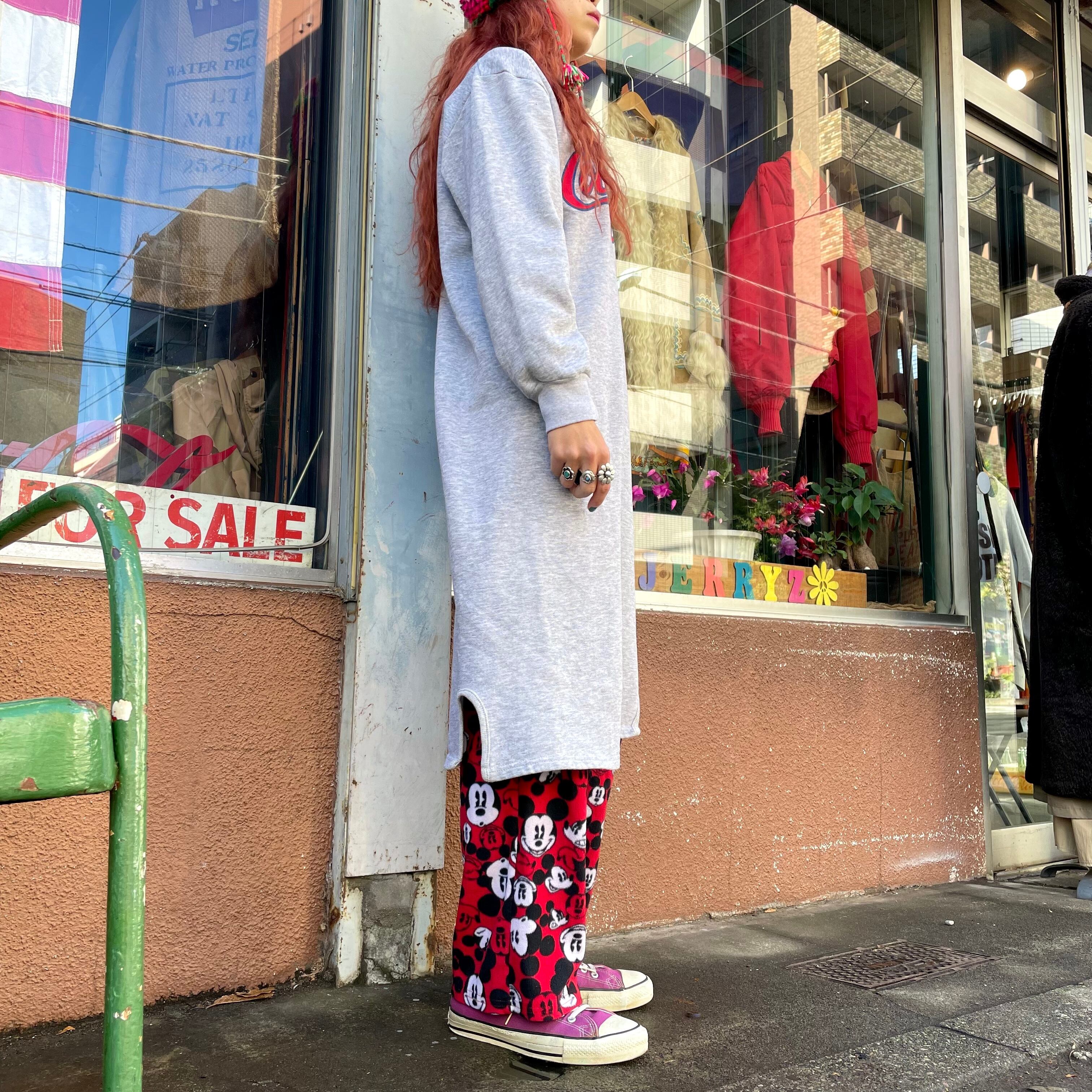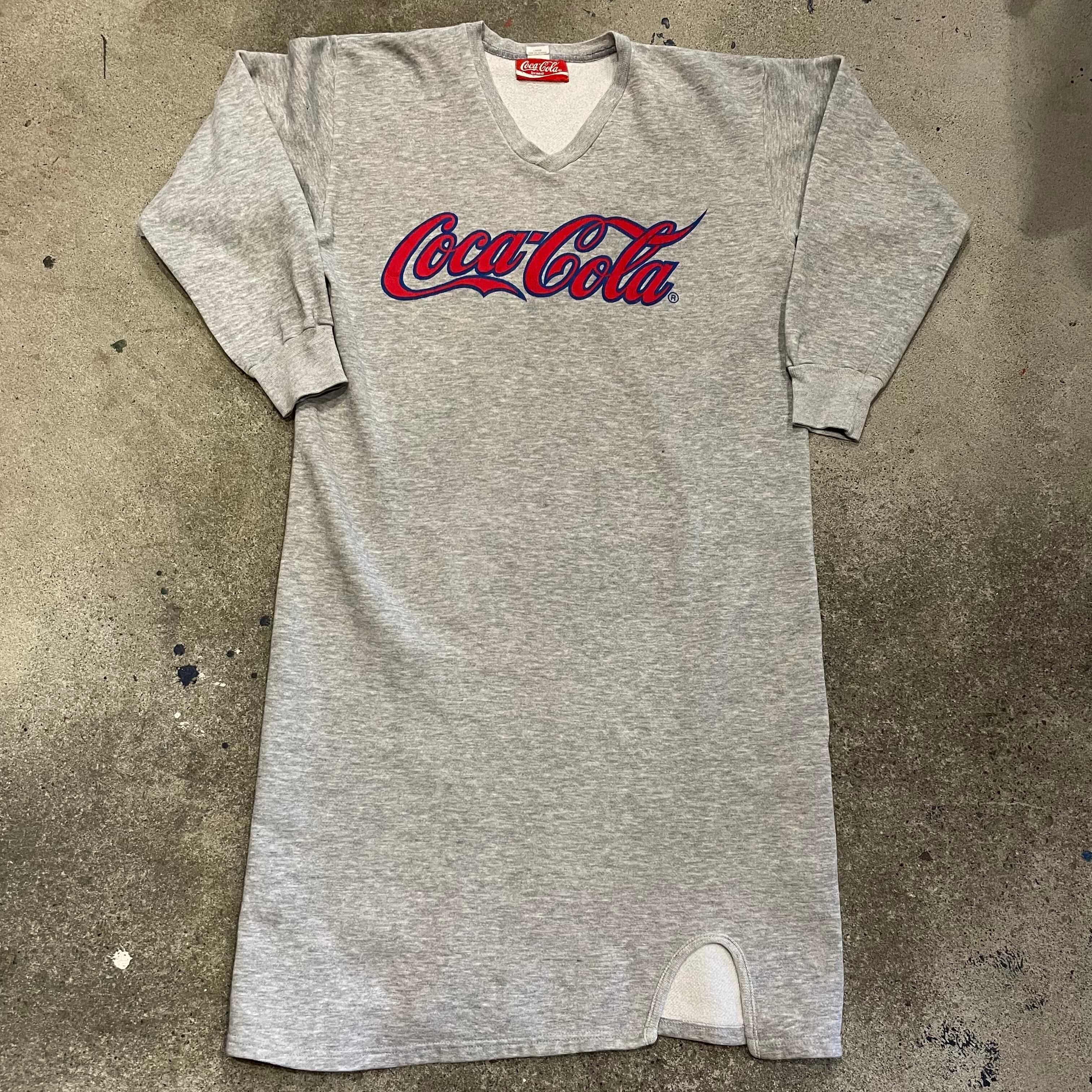 コカコーラのロゴかかわいいスウェットワンピースです。グレー地に赤のプリントがポップで、膝下まである丈感がとても楽ちんです。パンツと合わせても、靴下で遊んでも楽しいと思います。