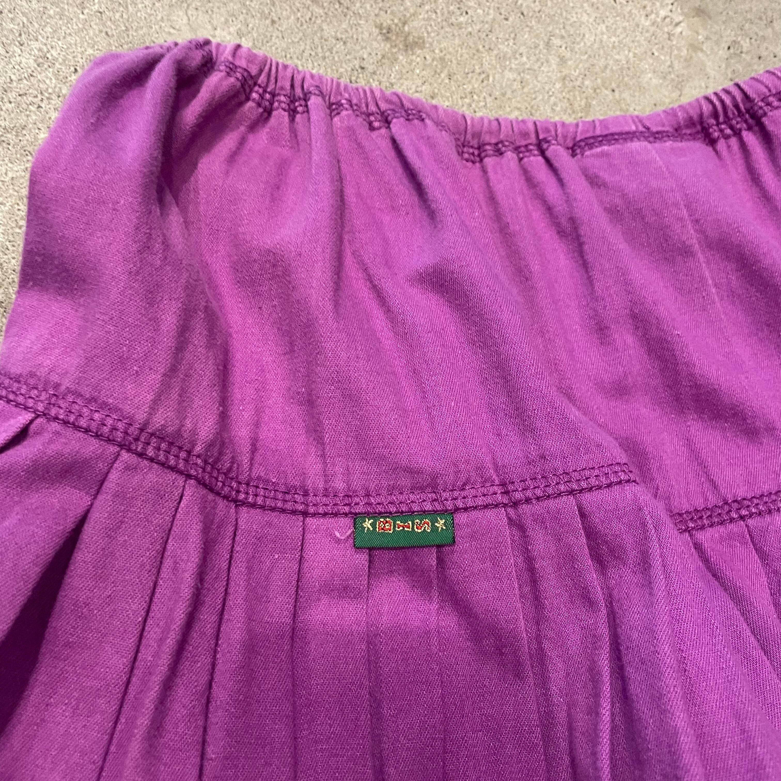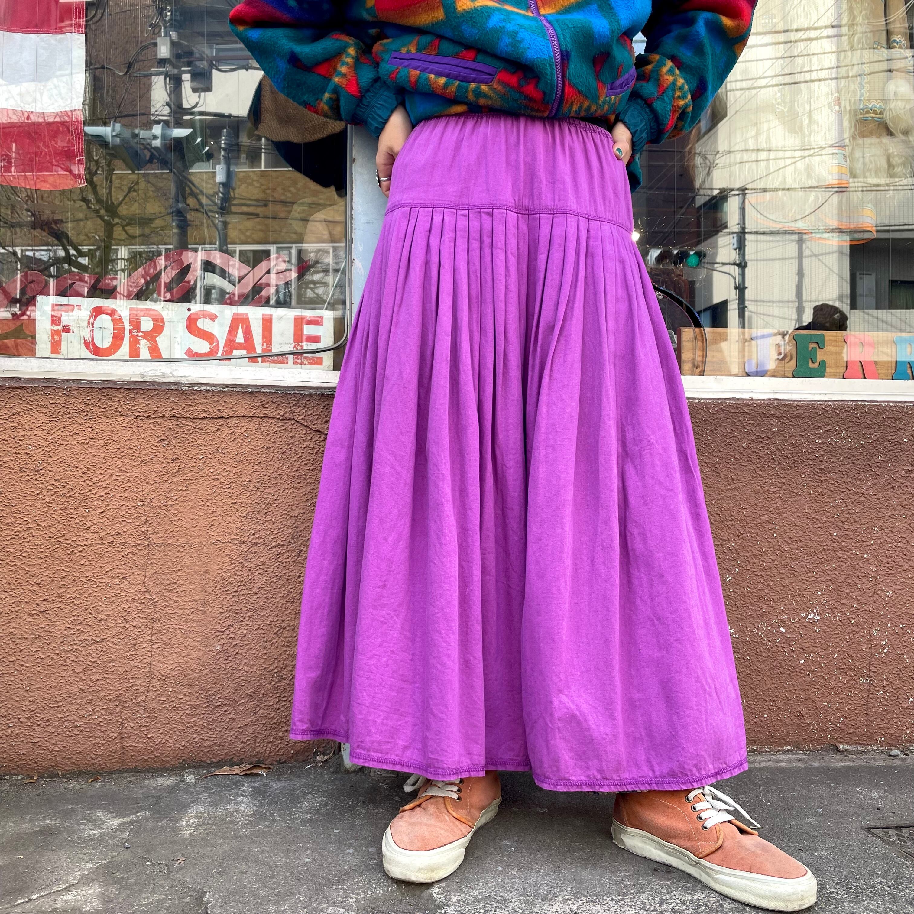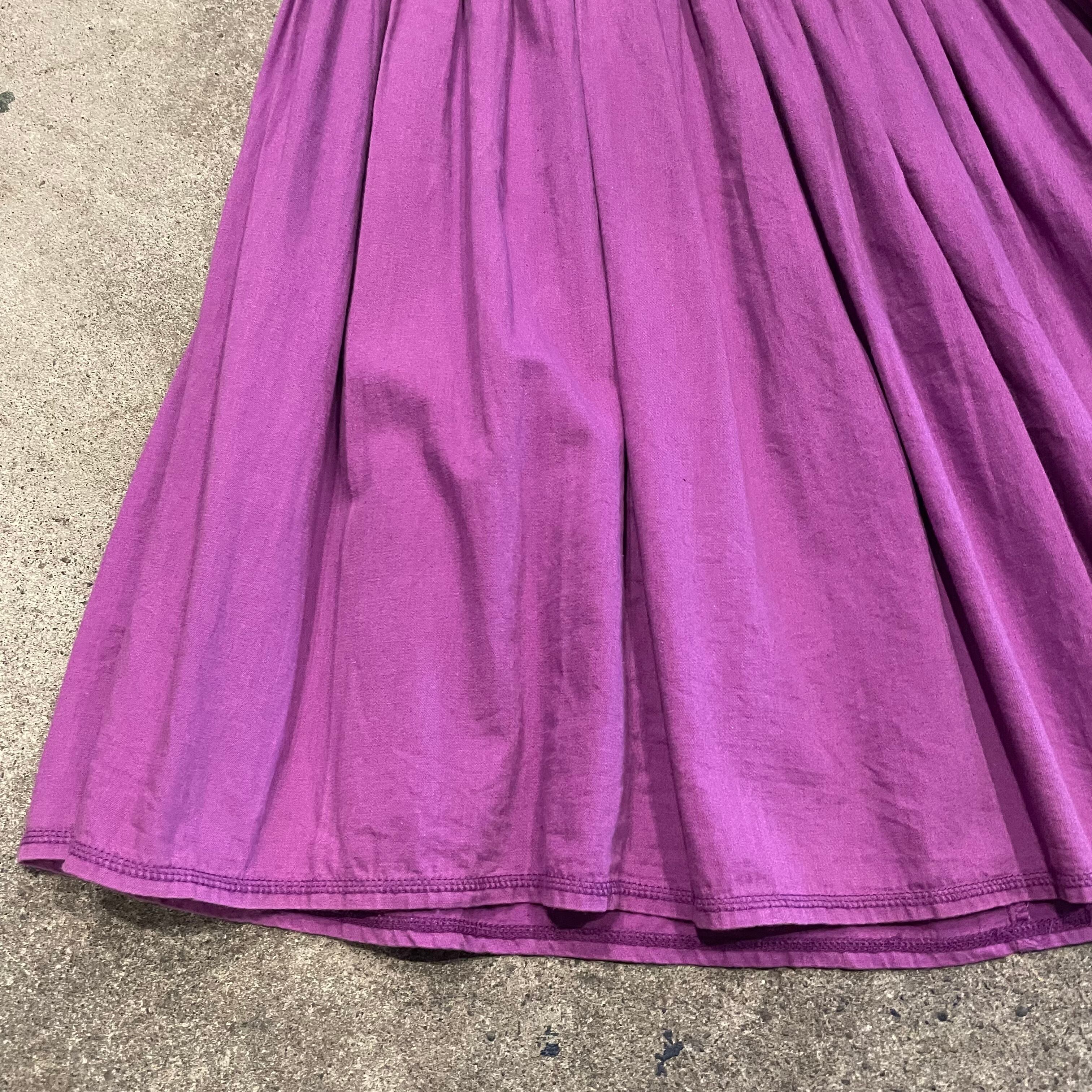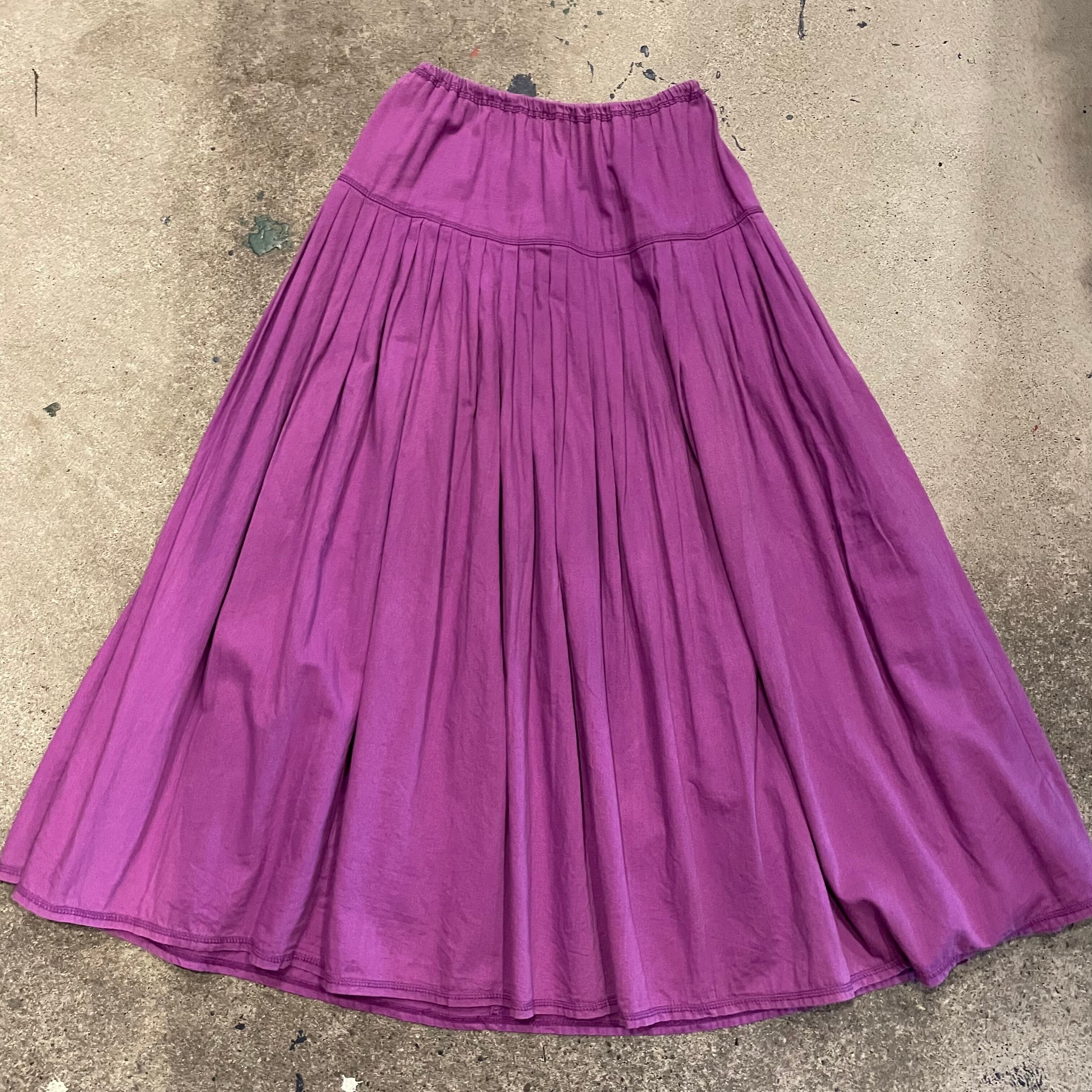 紫のシンプルなコットン素材のロングスカートです。ヨークからの細かめのプリーツがとてもかわいく、ボリューム感も良い感じの使いやすい一枚です。