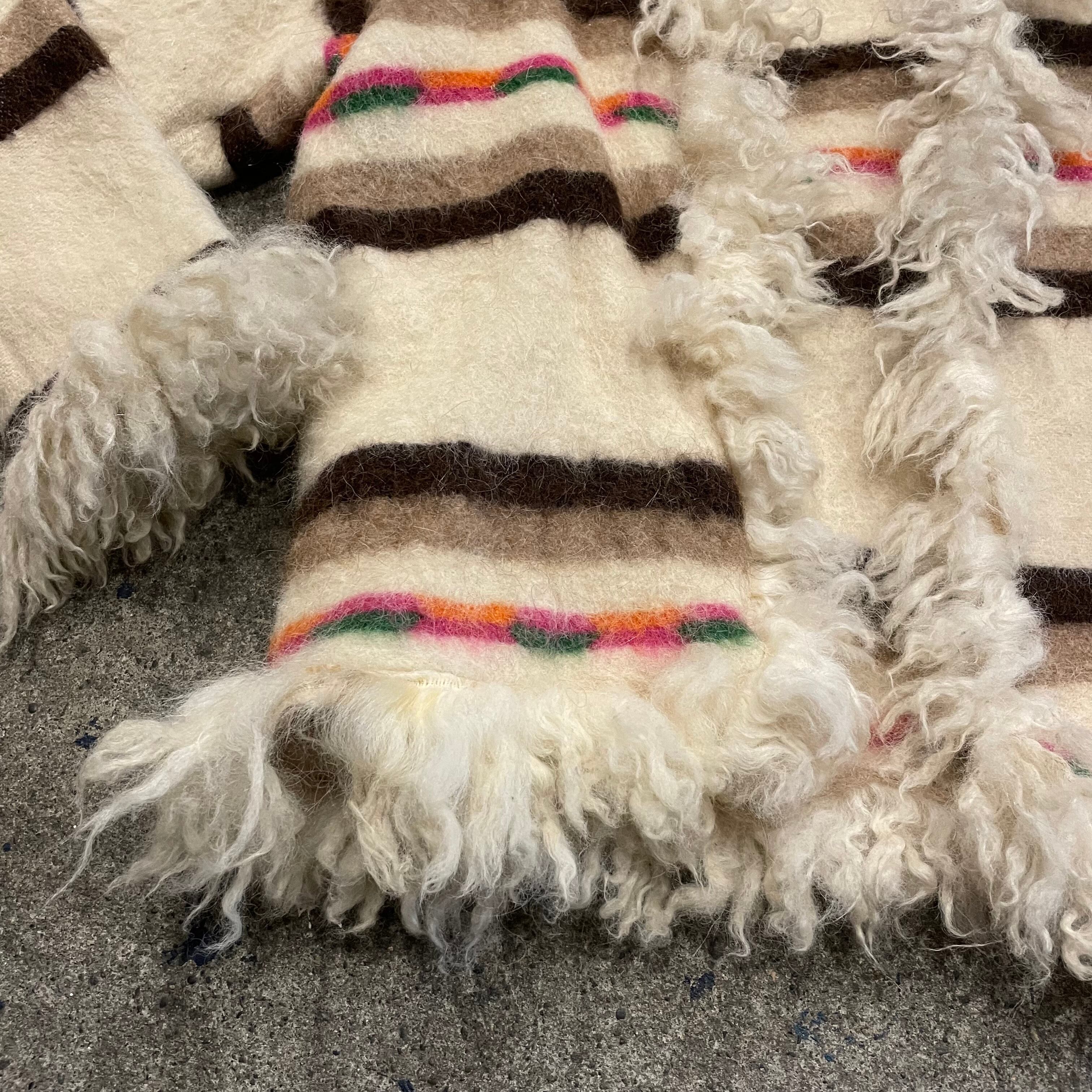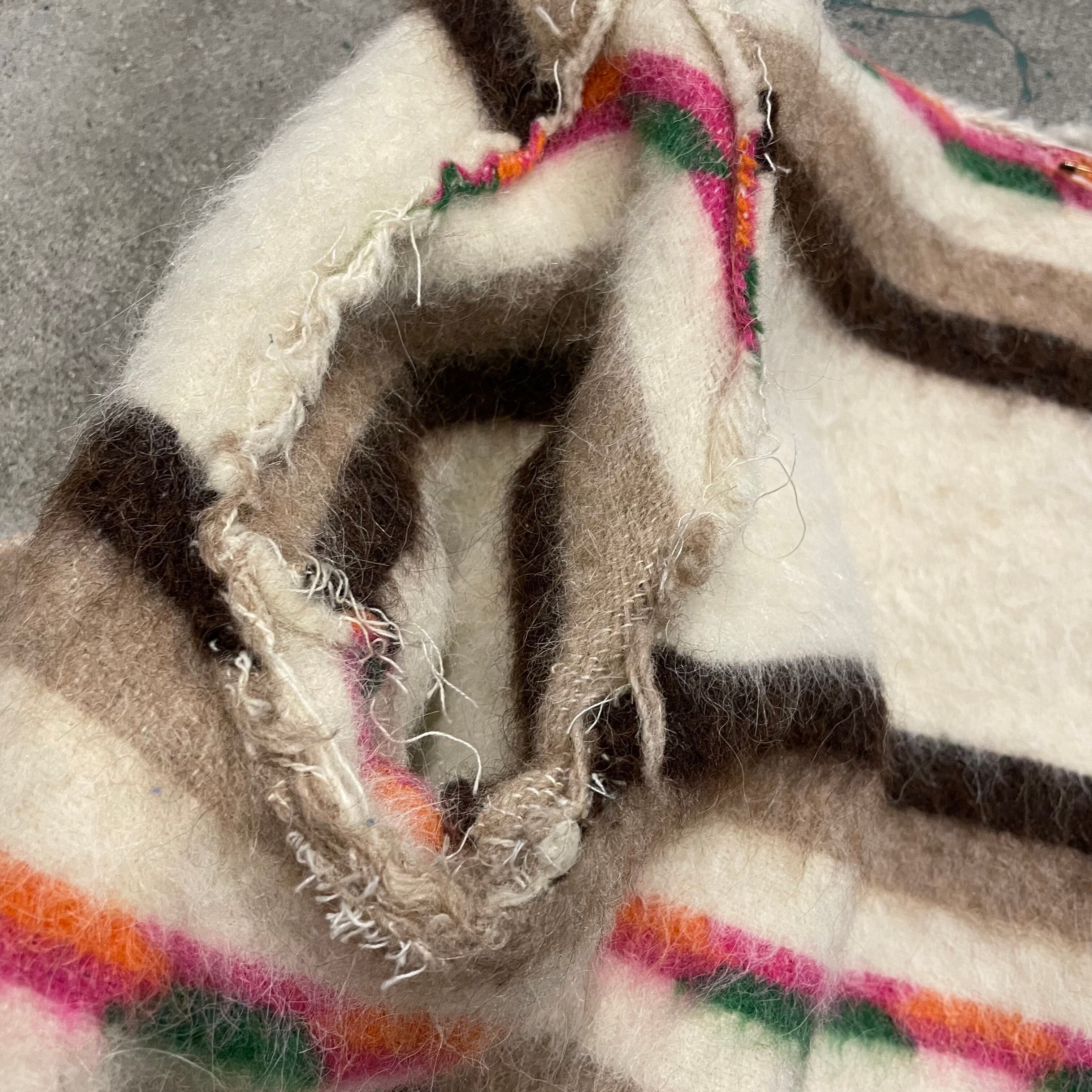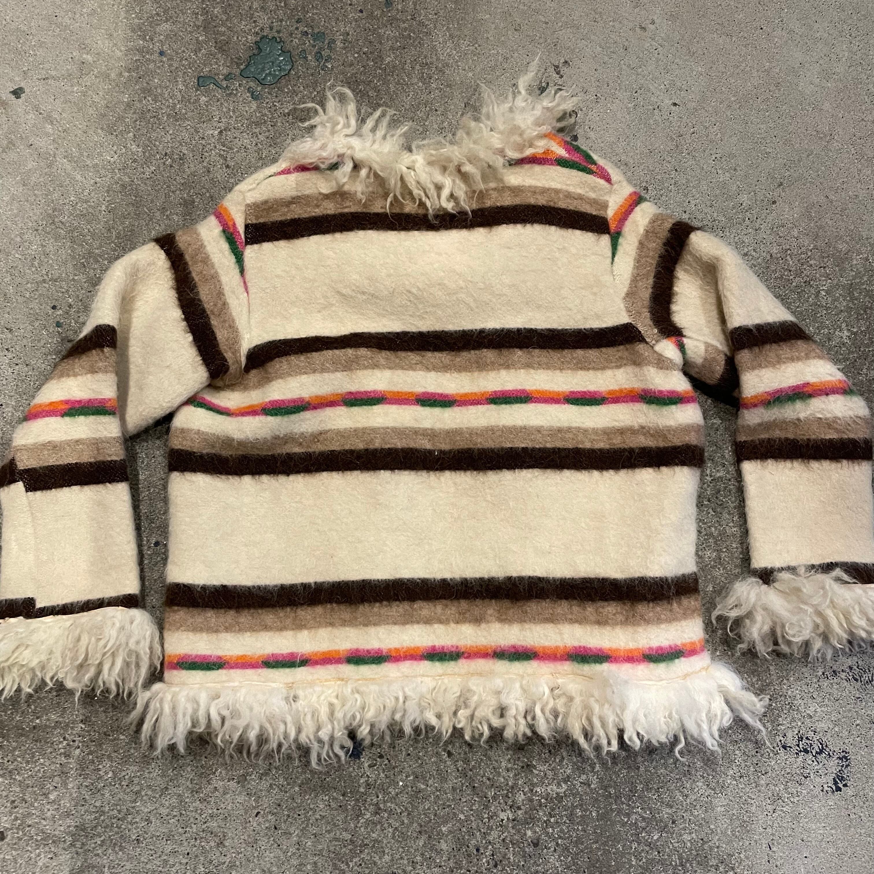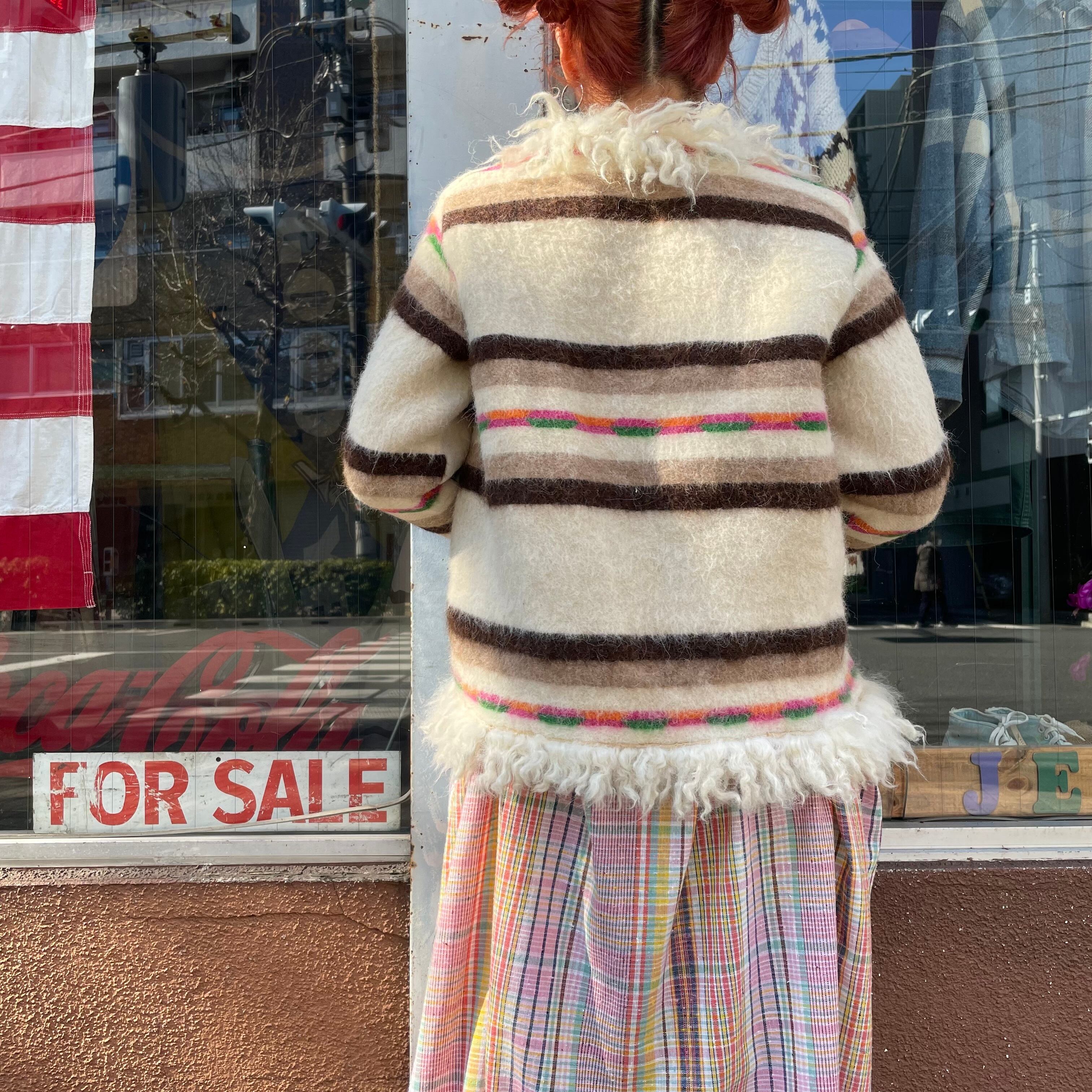 おそらく70年代頃にハンドメイドで作られたと思われるジャケットです。素材は不明ですが毛足のある柔らかいウールやモヘア、アルパカ等のような雰囲気でとても軽くて暖かい一着です。