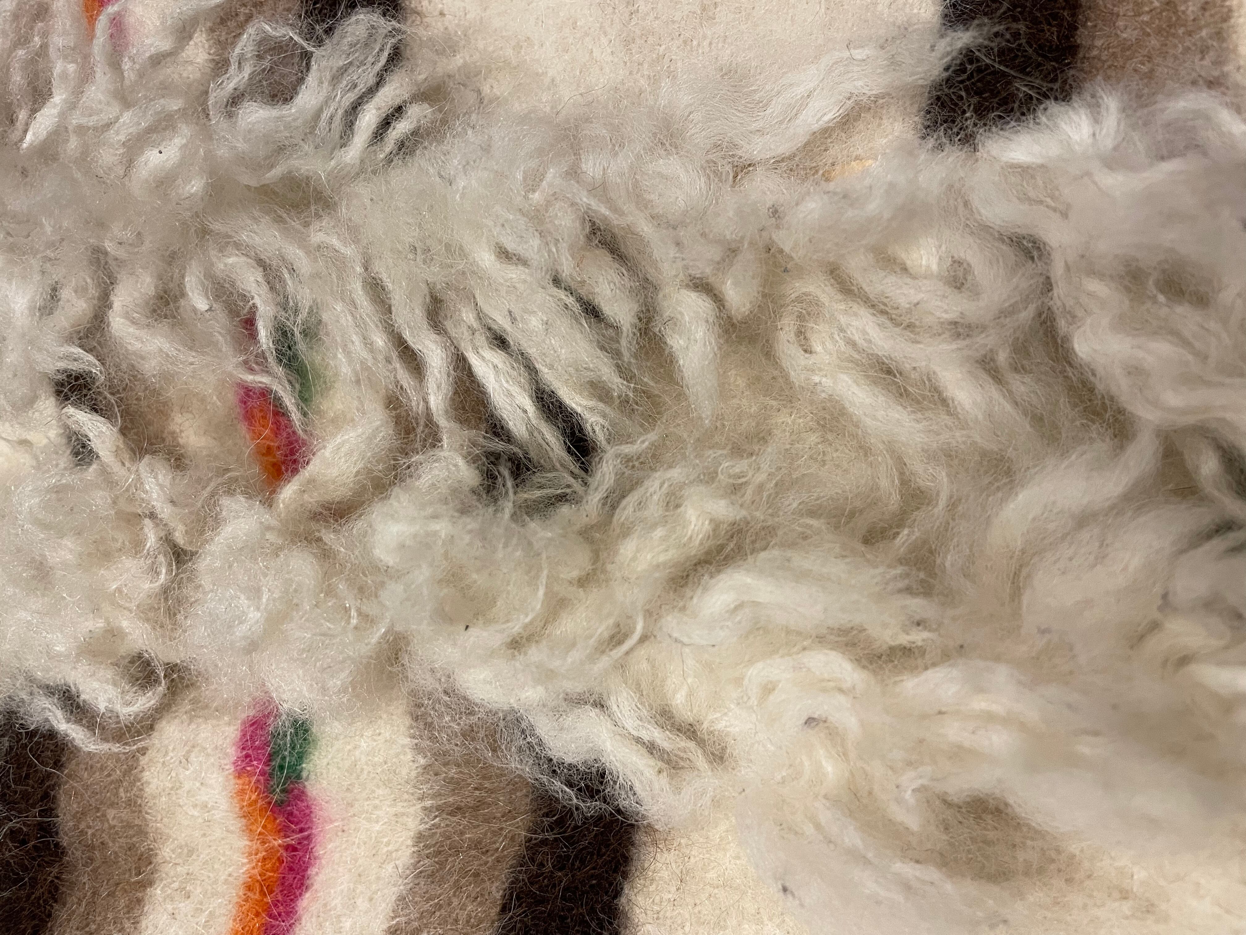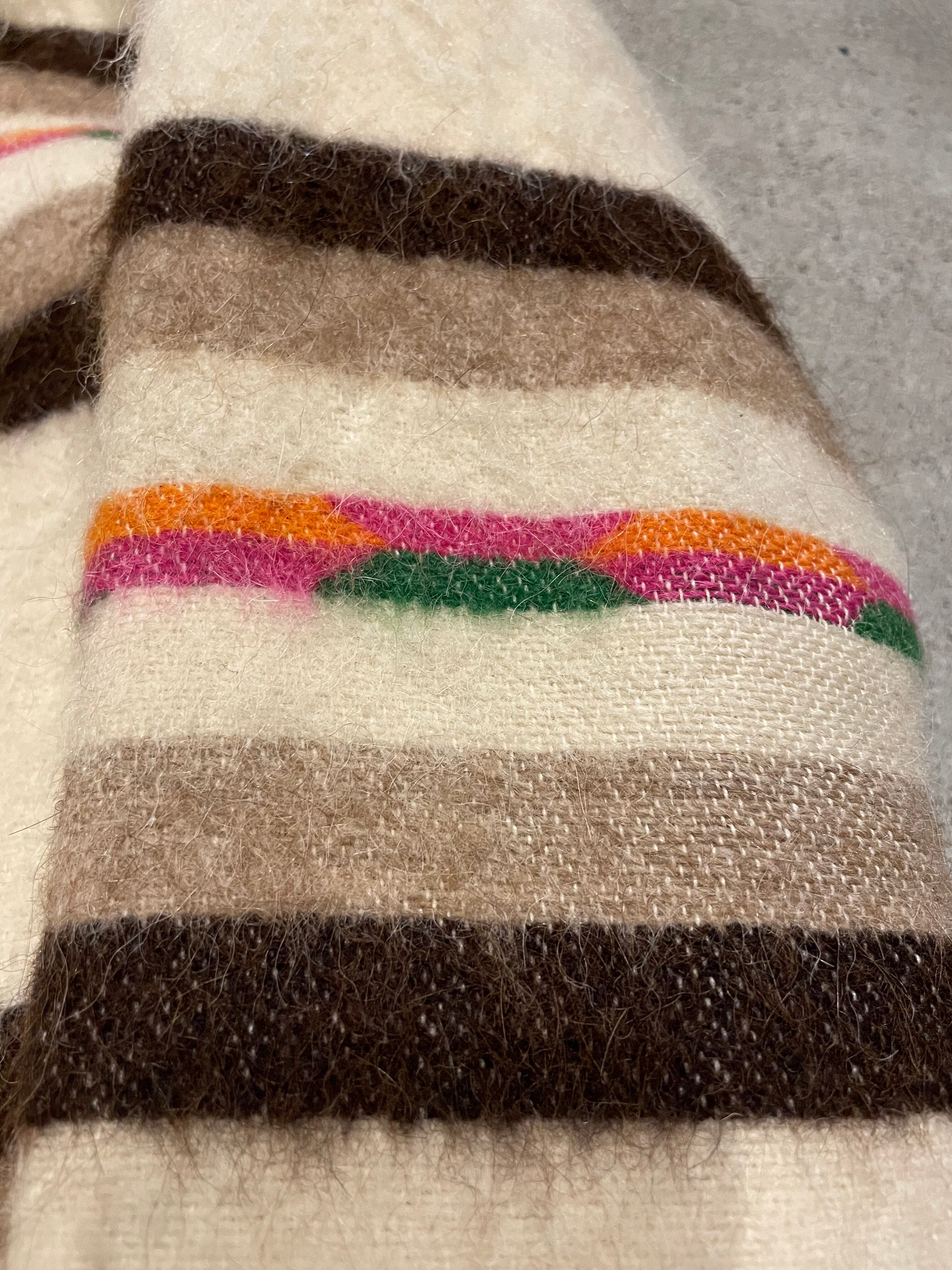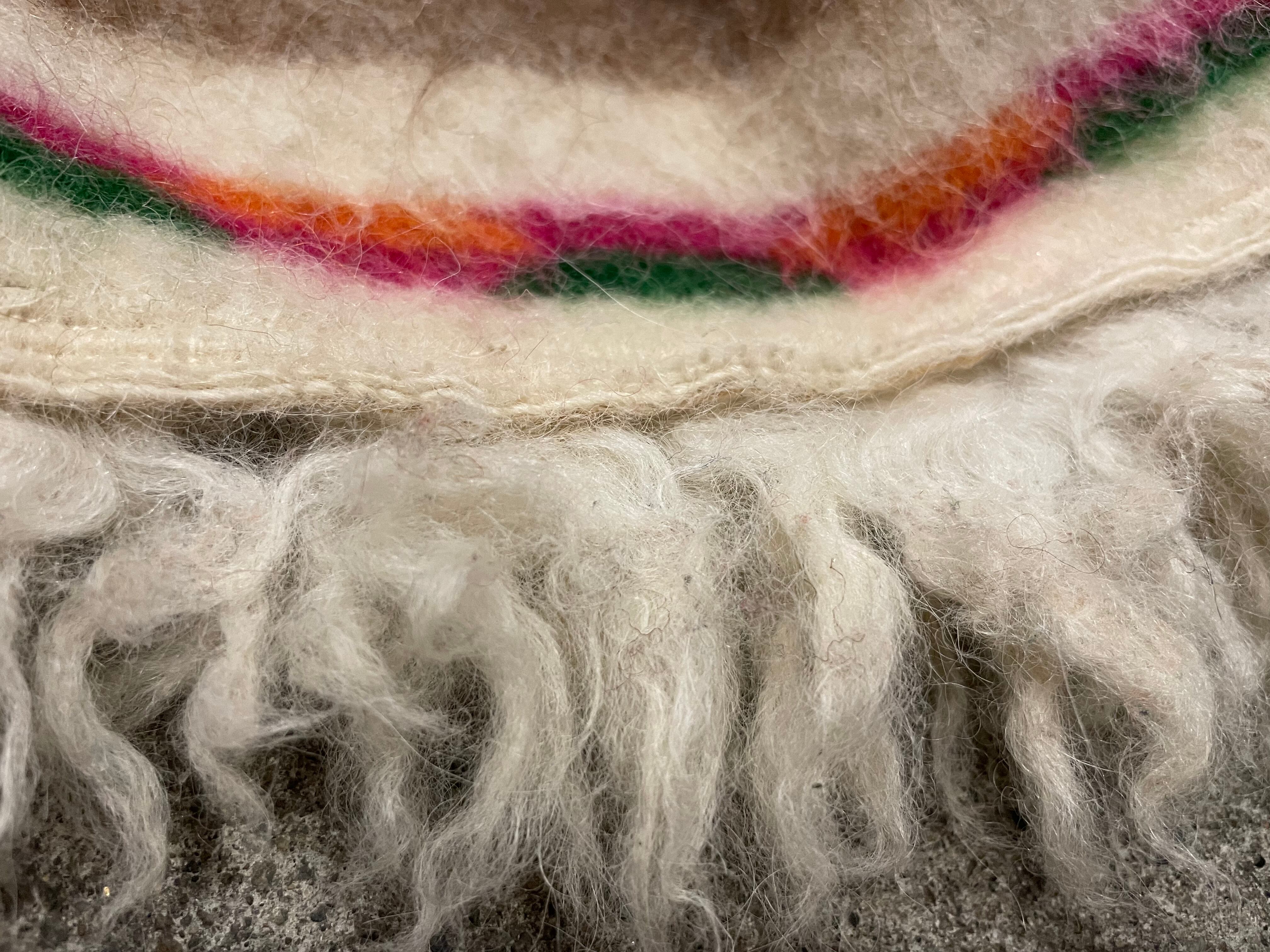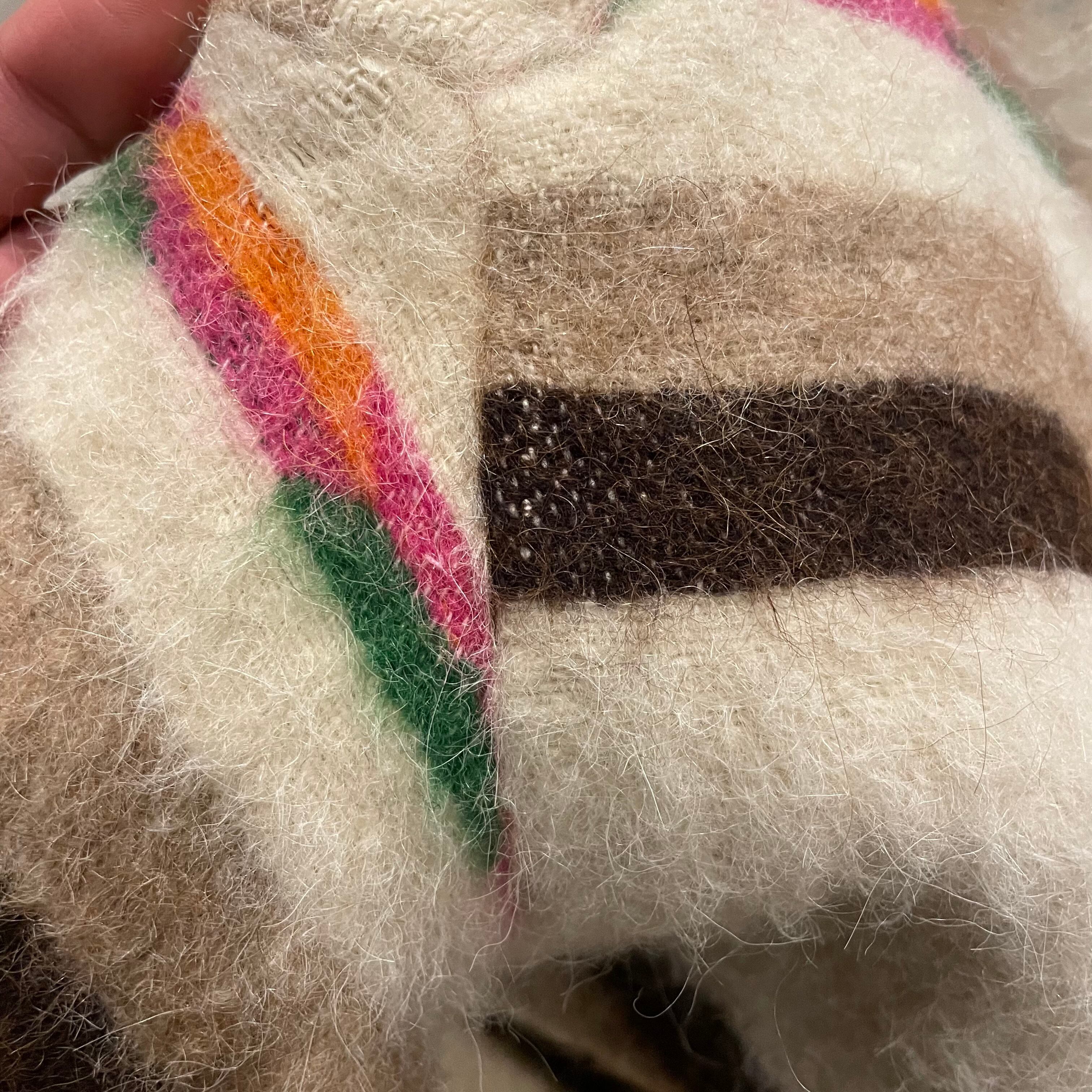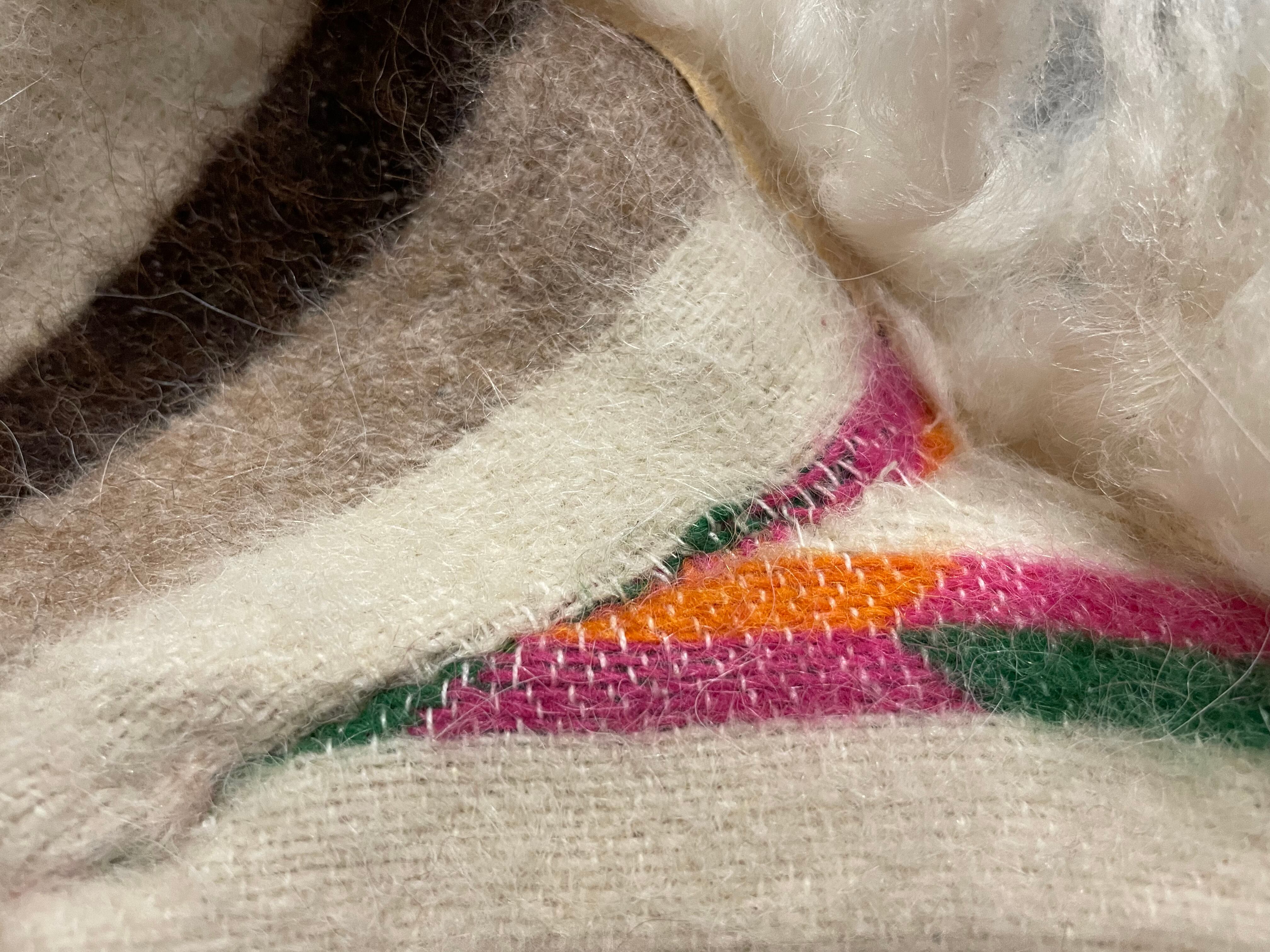 おそらく70年代頃にハンドメイドで作られたと思われるジャケットです。素材は不明ですが毛足のある柔らかいウールやモヘア、アルパカ等のような雰囲気でとても軽くて暖かい一着です。