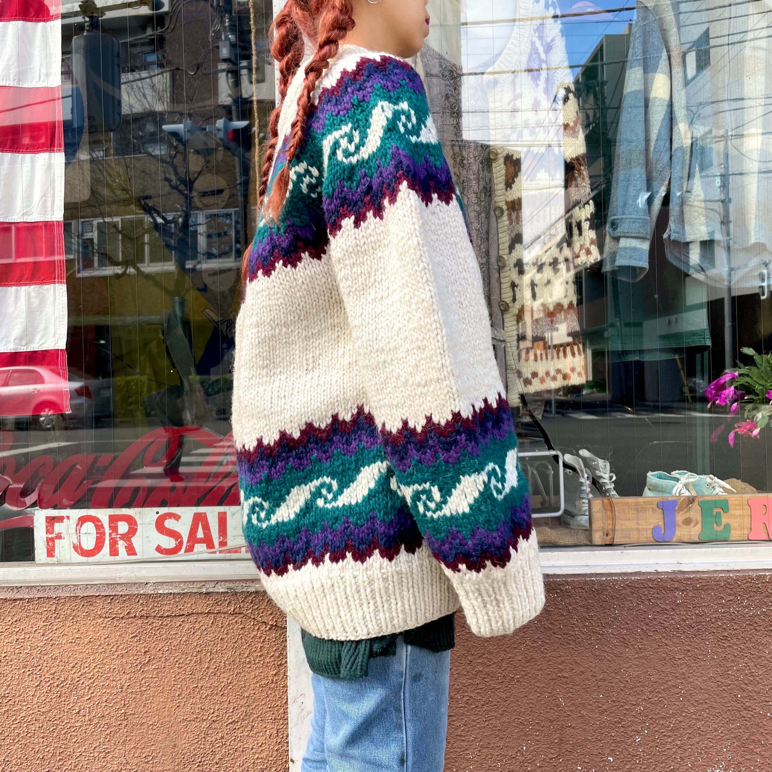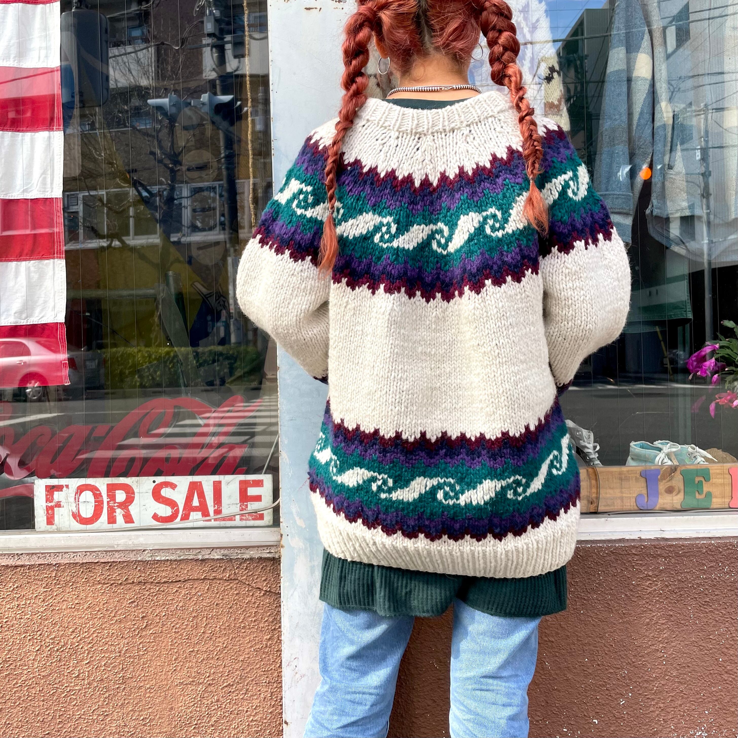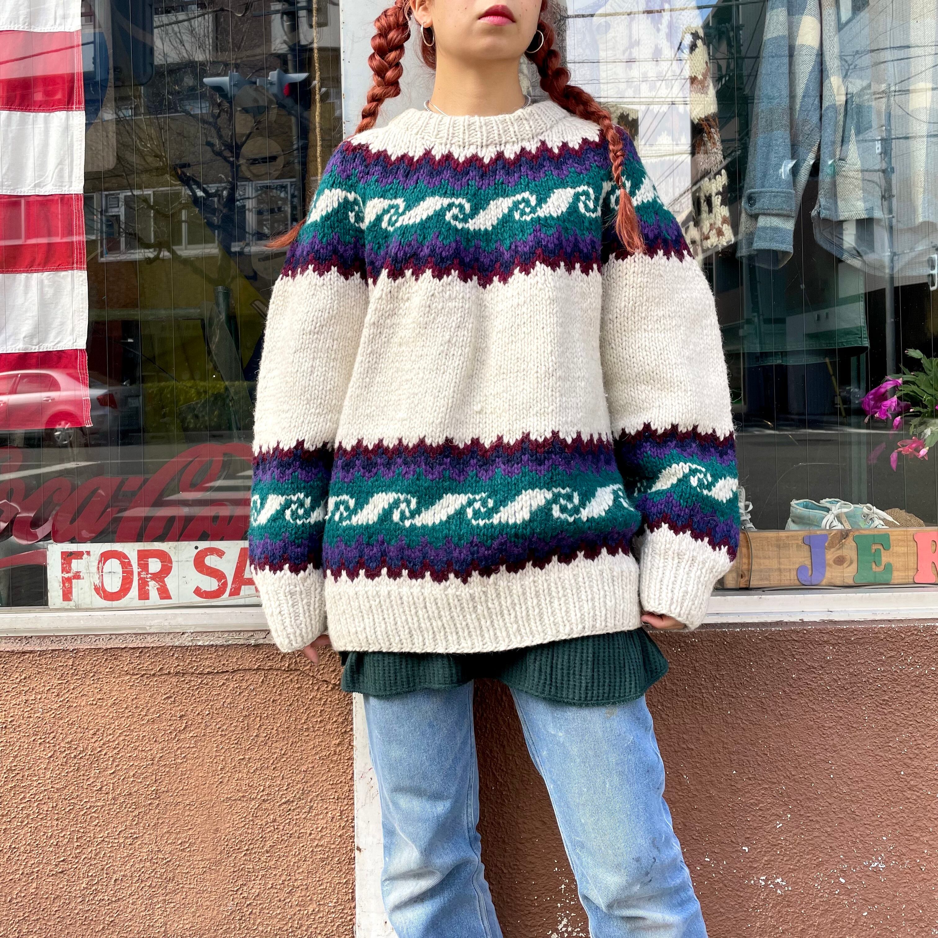 エクアドルニット特有の肉厚で大きめのサイズ感ですので、中にパーカーを着たり大きいシルエットを楽しめます。とても暖かくて安心感のある着心地がクセになると思います。