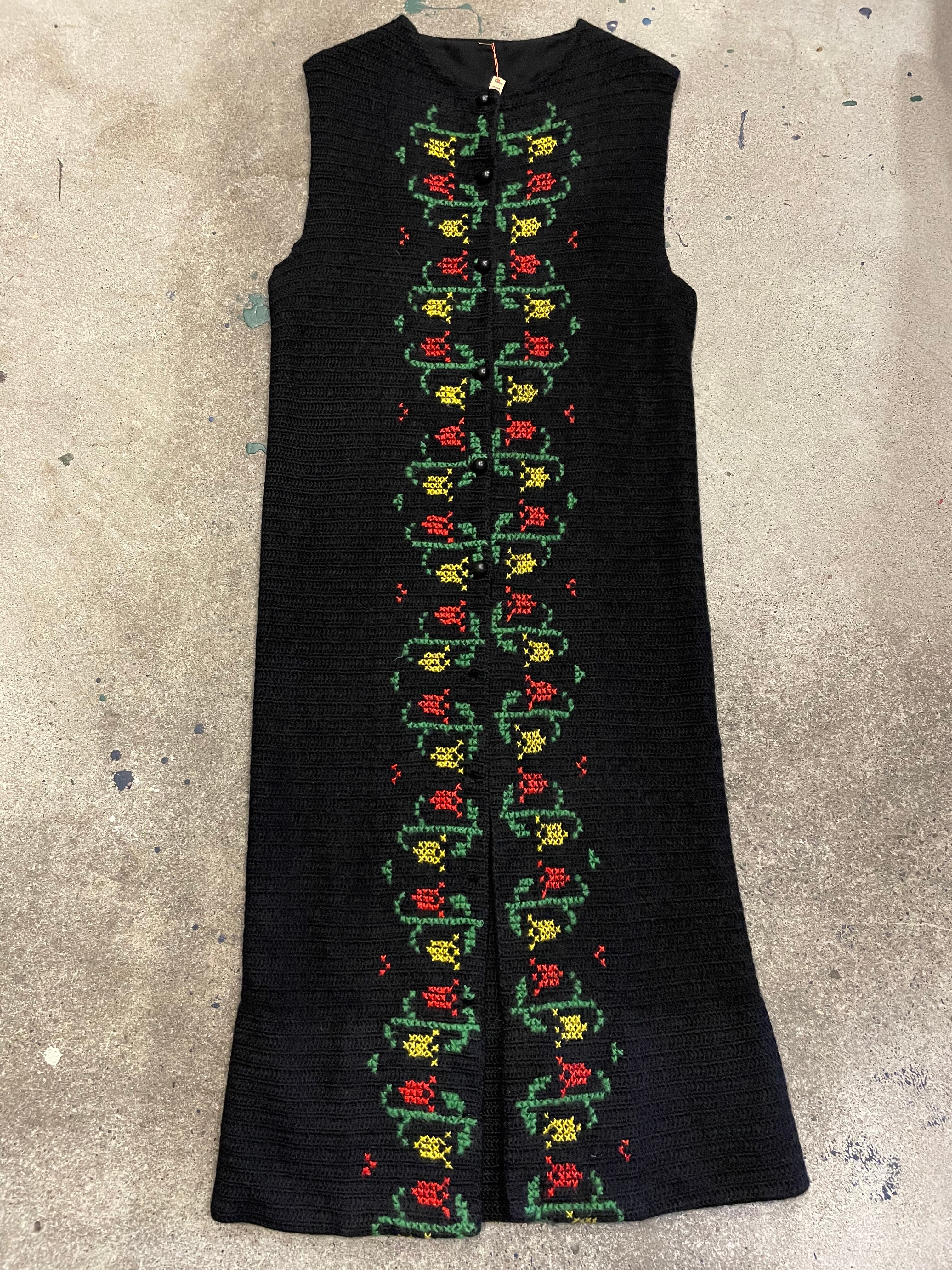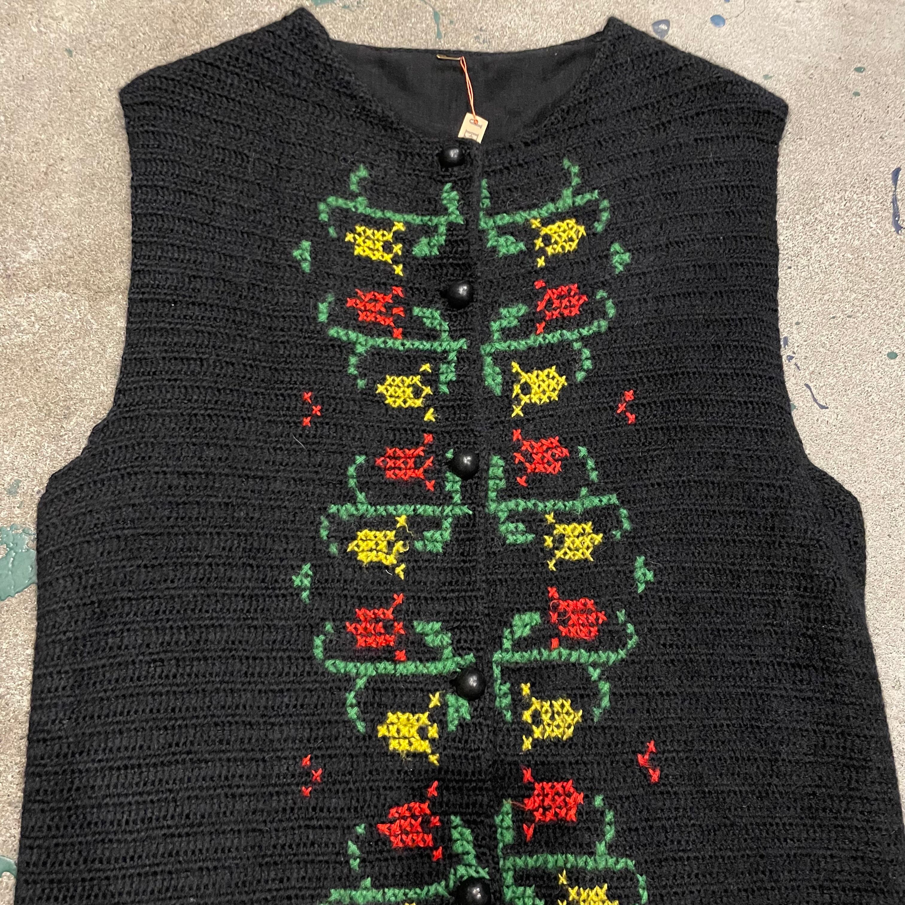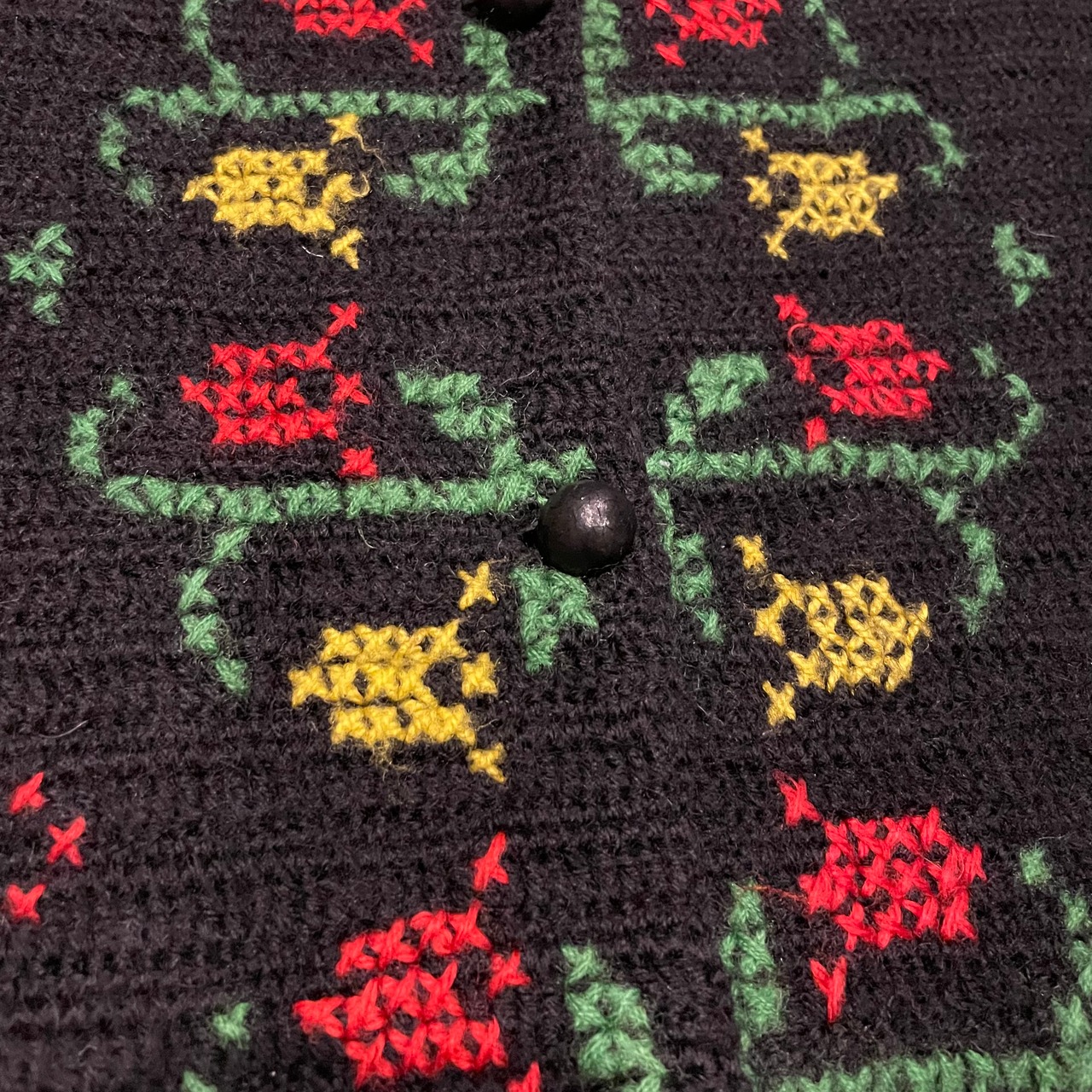 黒地にチロリアンっぽい雰囲気のクロスステッチ刺繍がかわいいニットベストです。