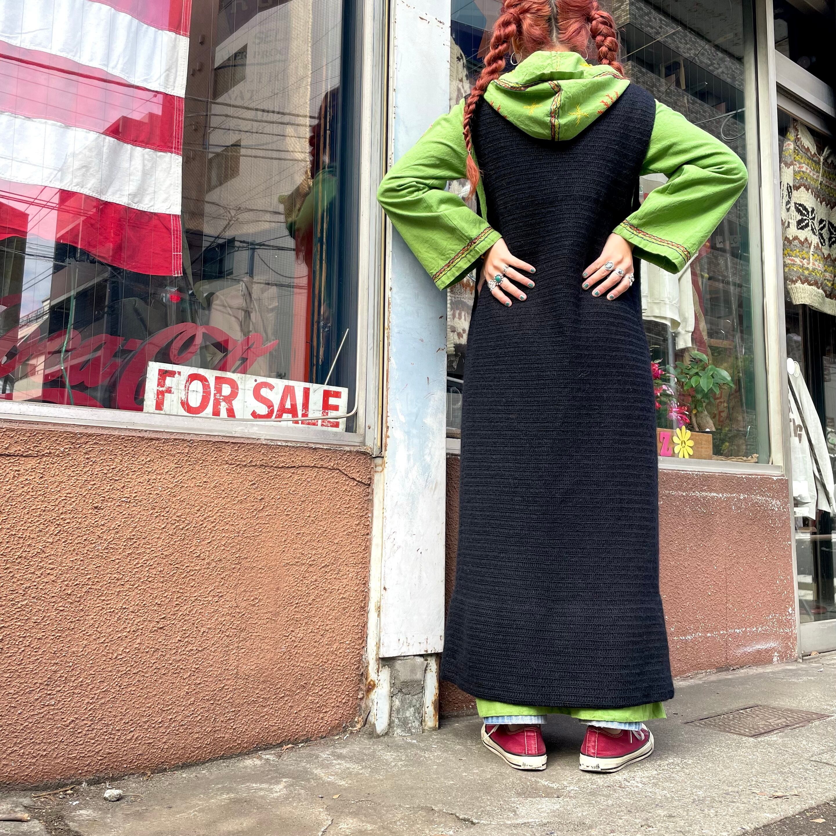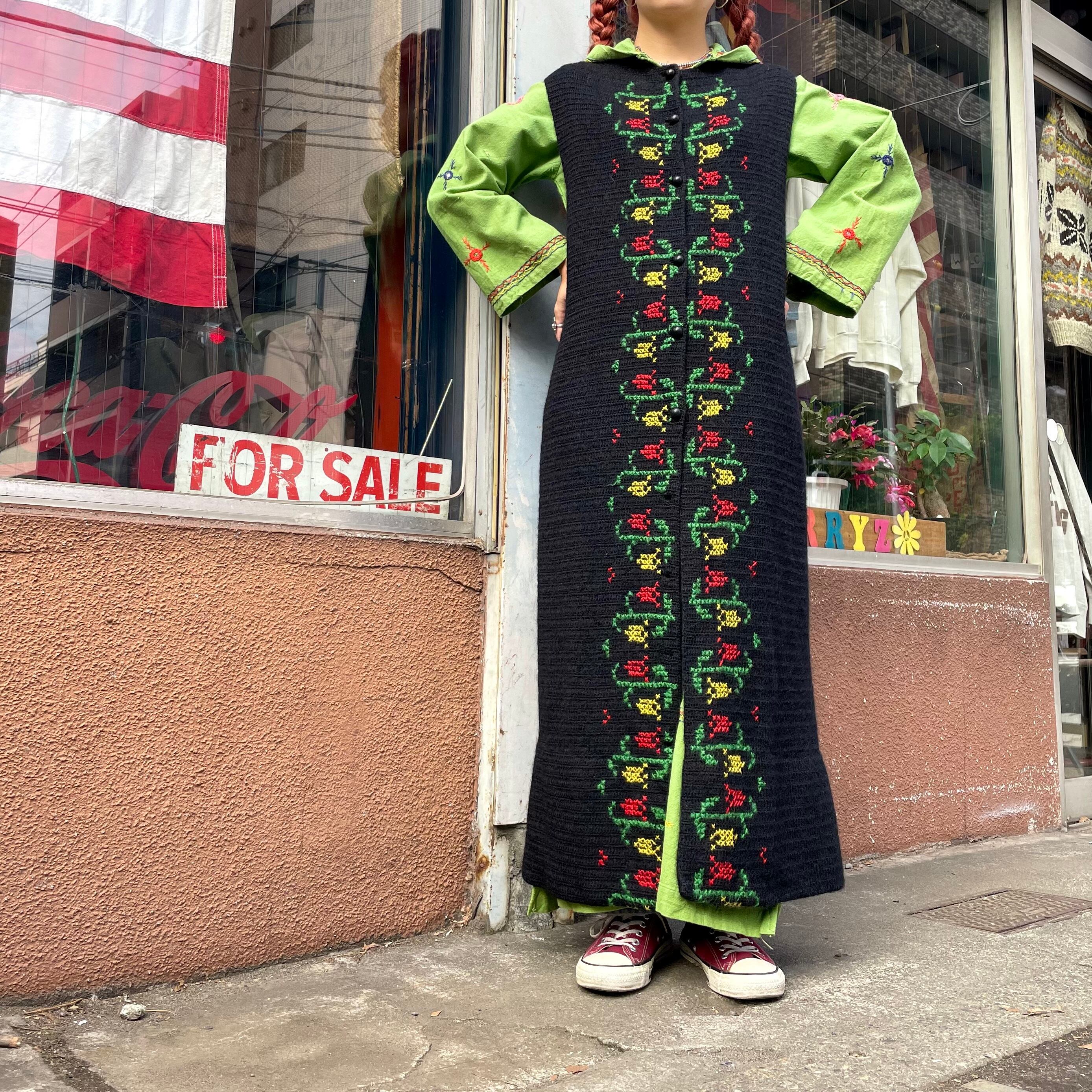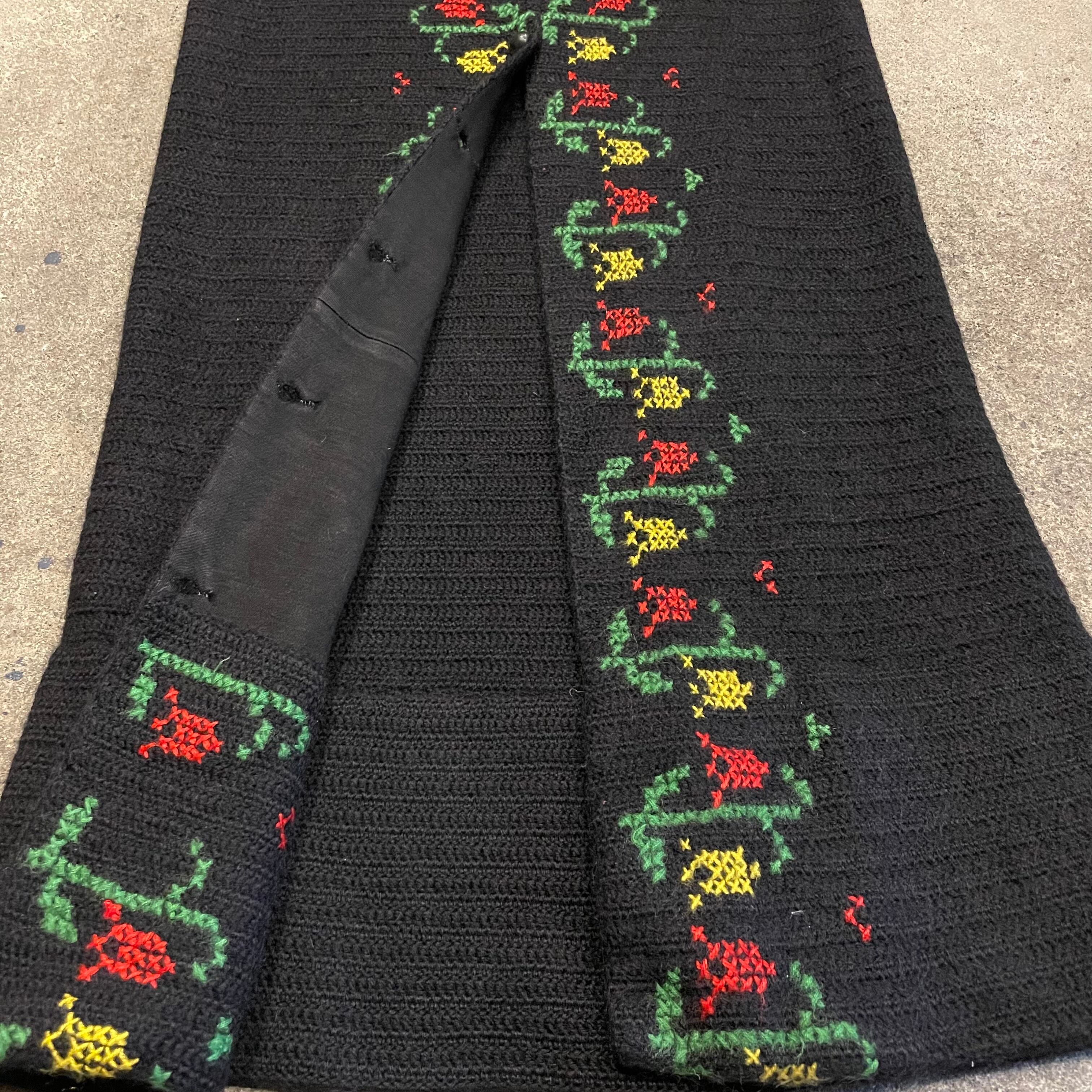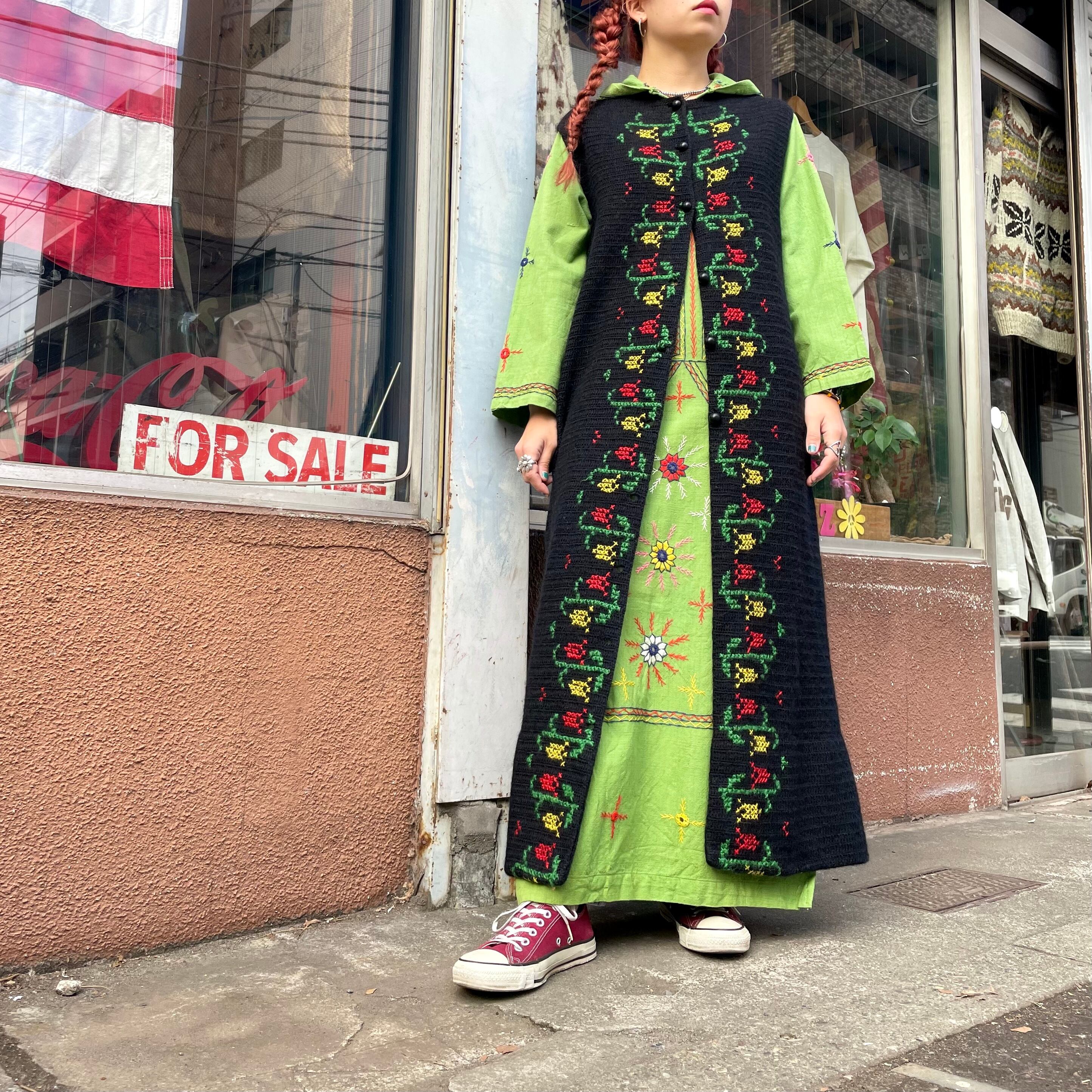 黒地にチロリアンっぽい雰囲気のクロスステッチ刺繍がかわいいニットベストです。