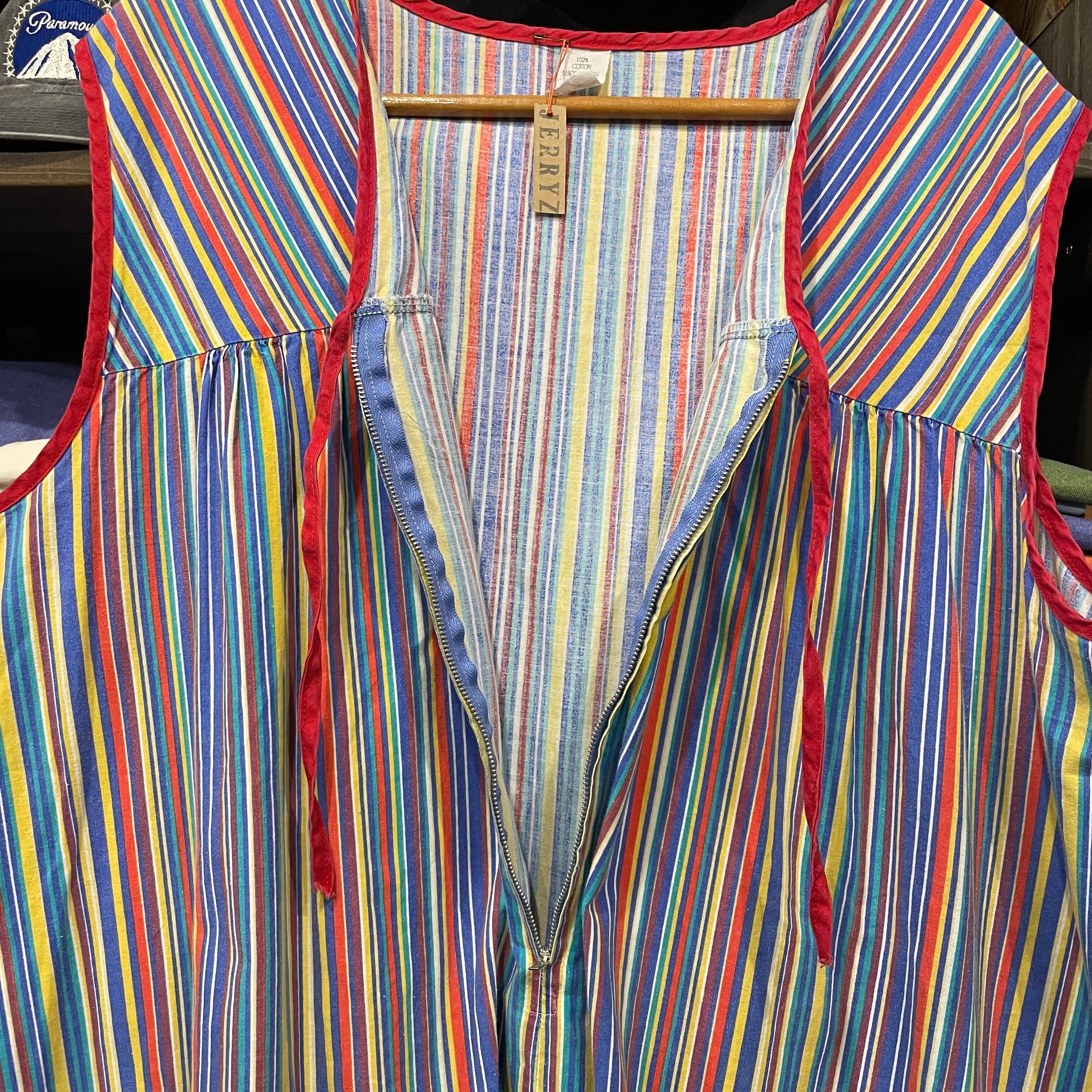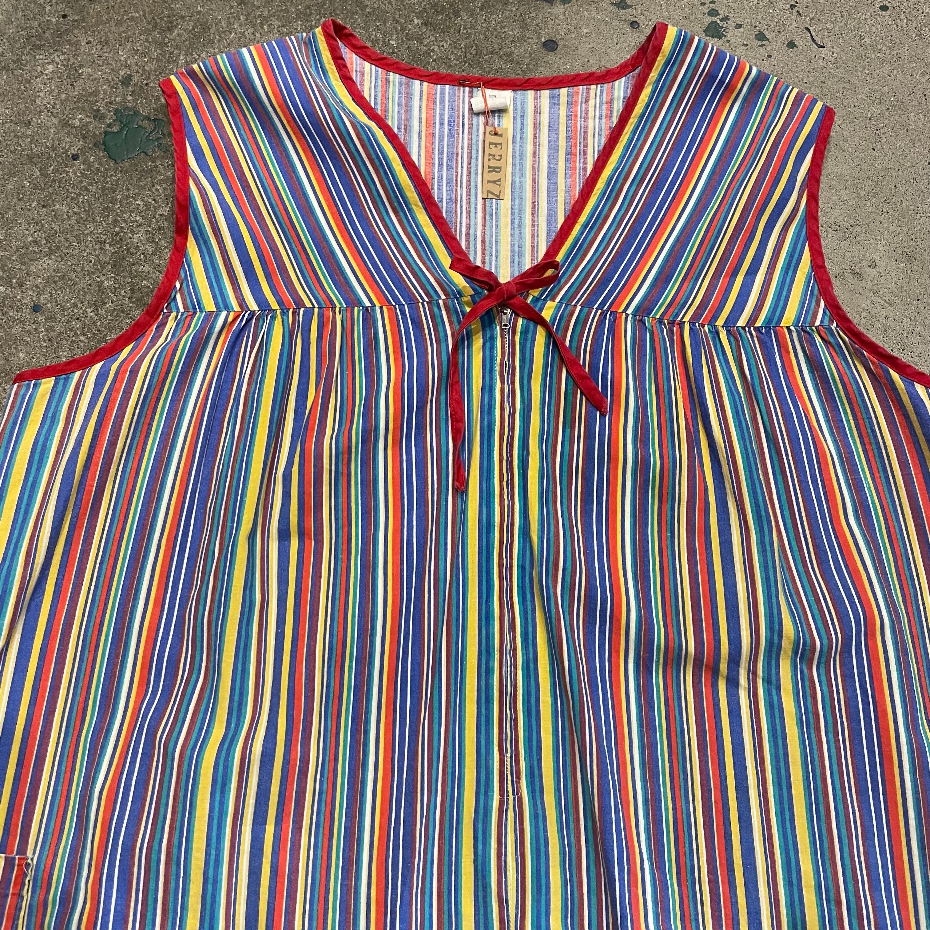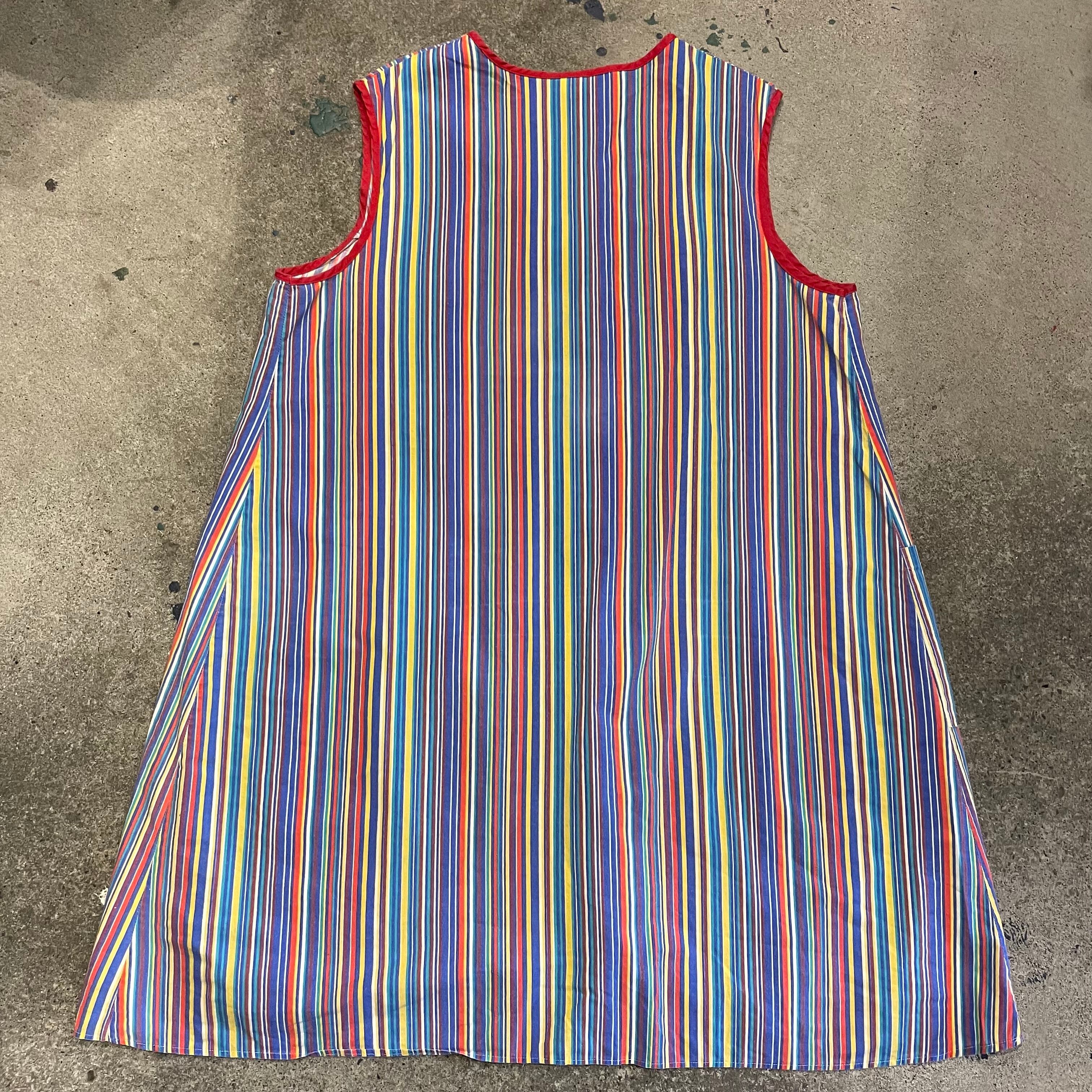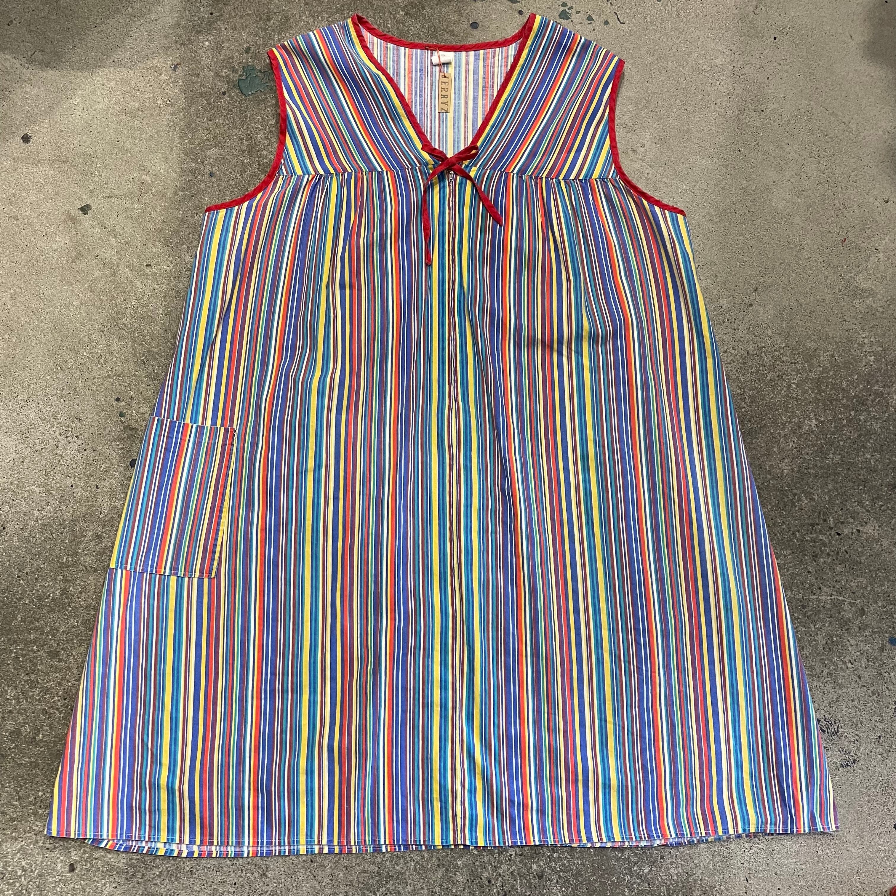 カラフルなストライプがかわいいワンピースです。薄手のコットン素材でサイズが3Xとかなりゆったり大きめですので中にいろいろ合わせられて楽しいアイテムです。