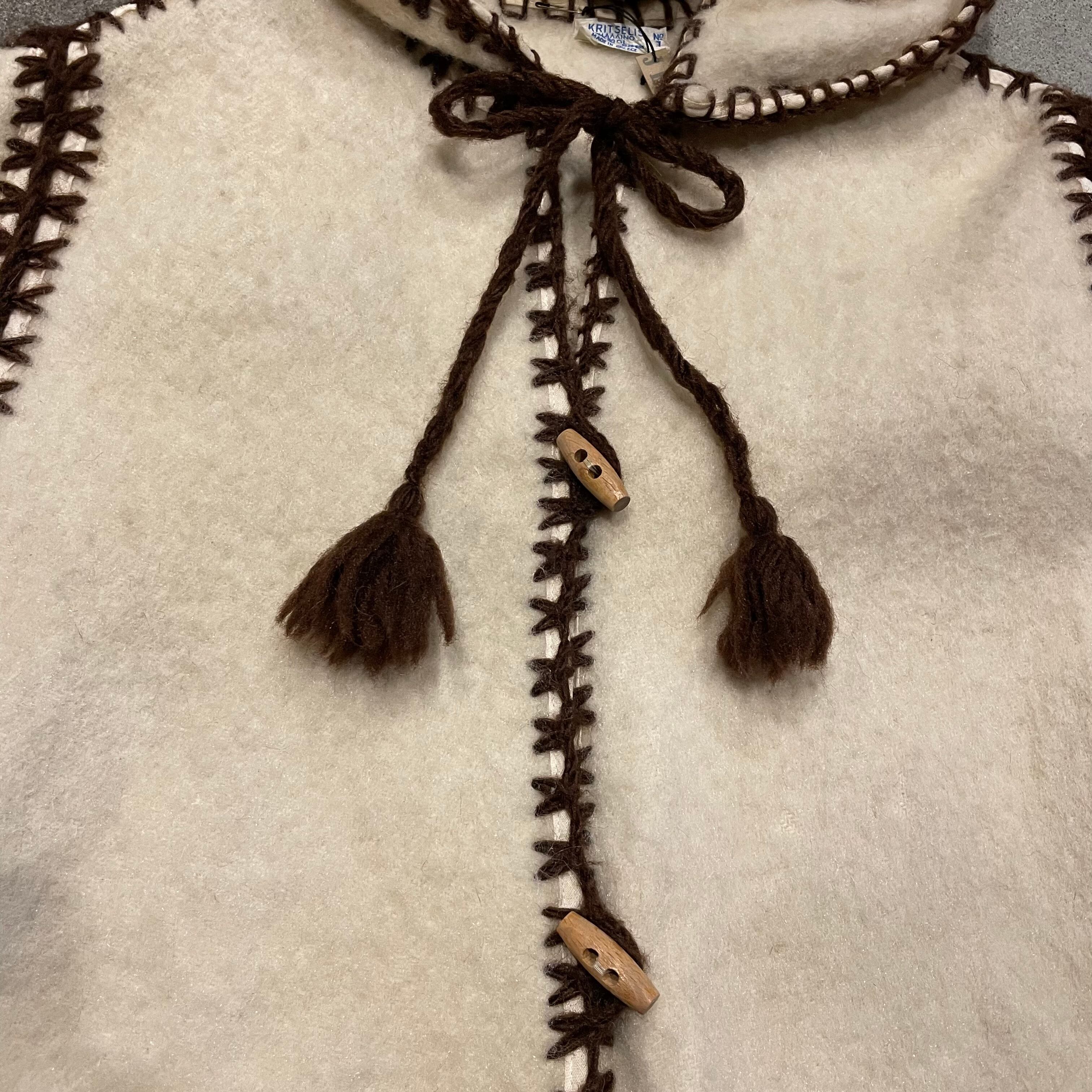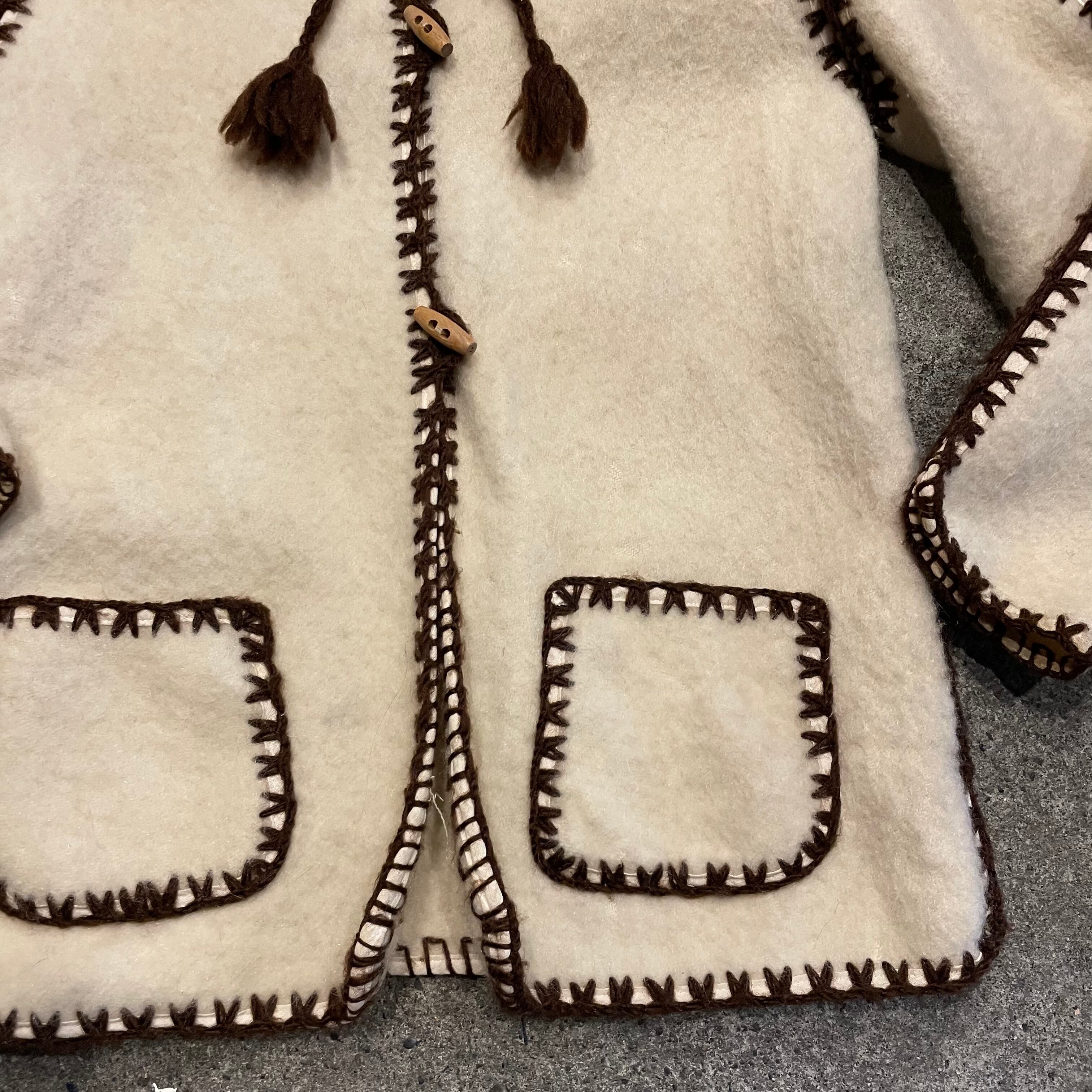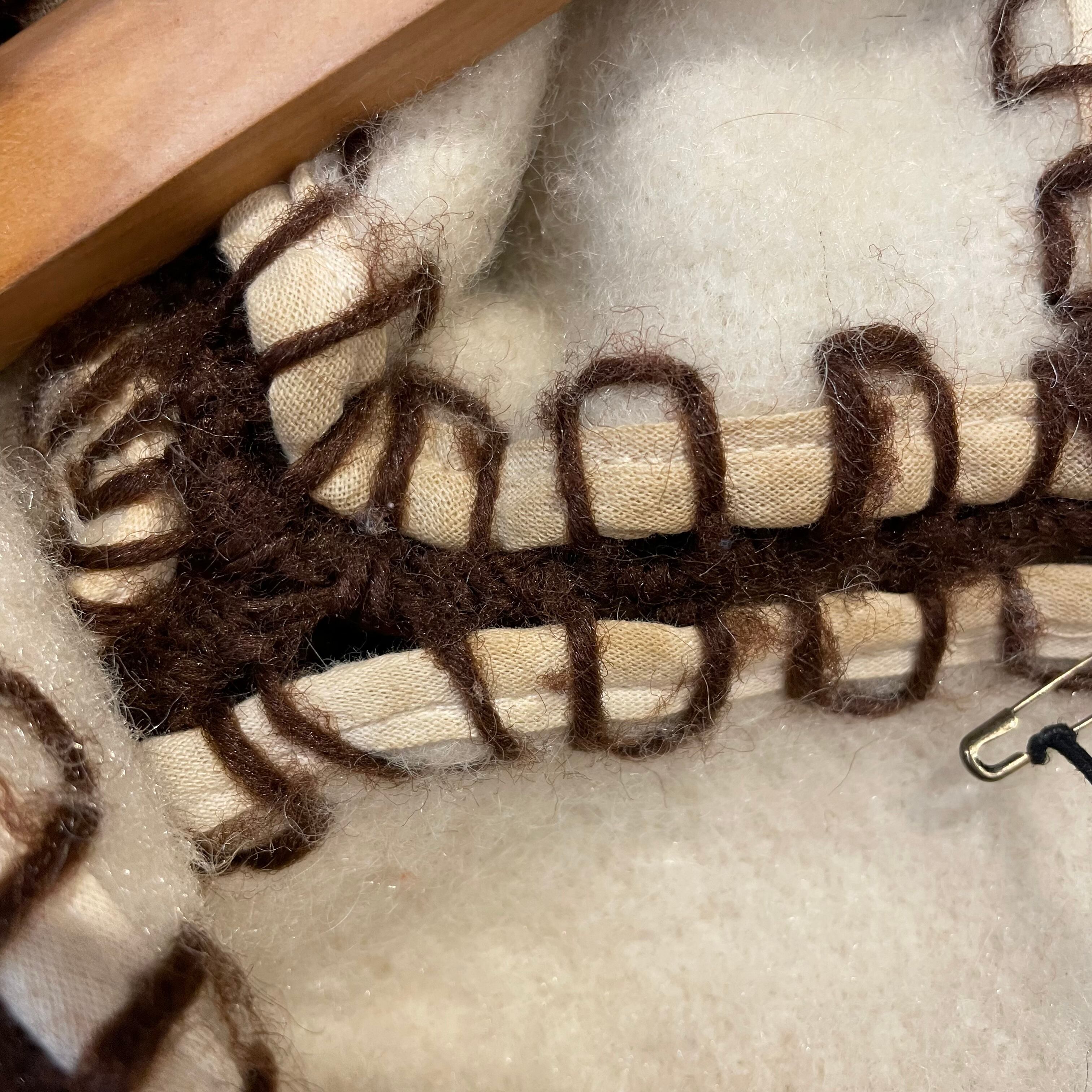 首元の紐、トグルボタン、パーツパーツを茶色の毛糸で繋げている感じが雰囲気がありとてもかわいいです。