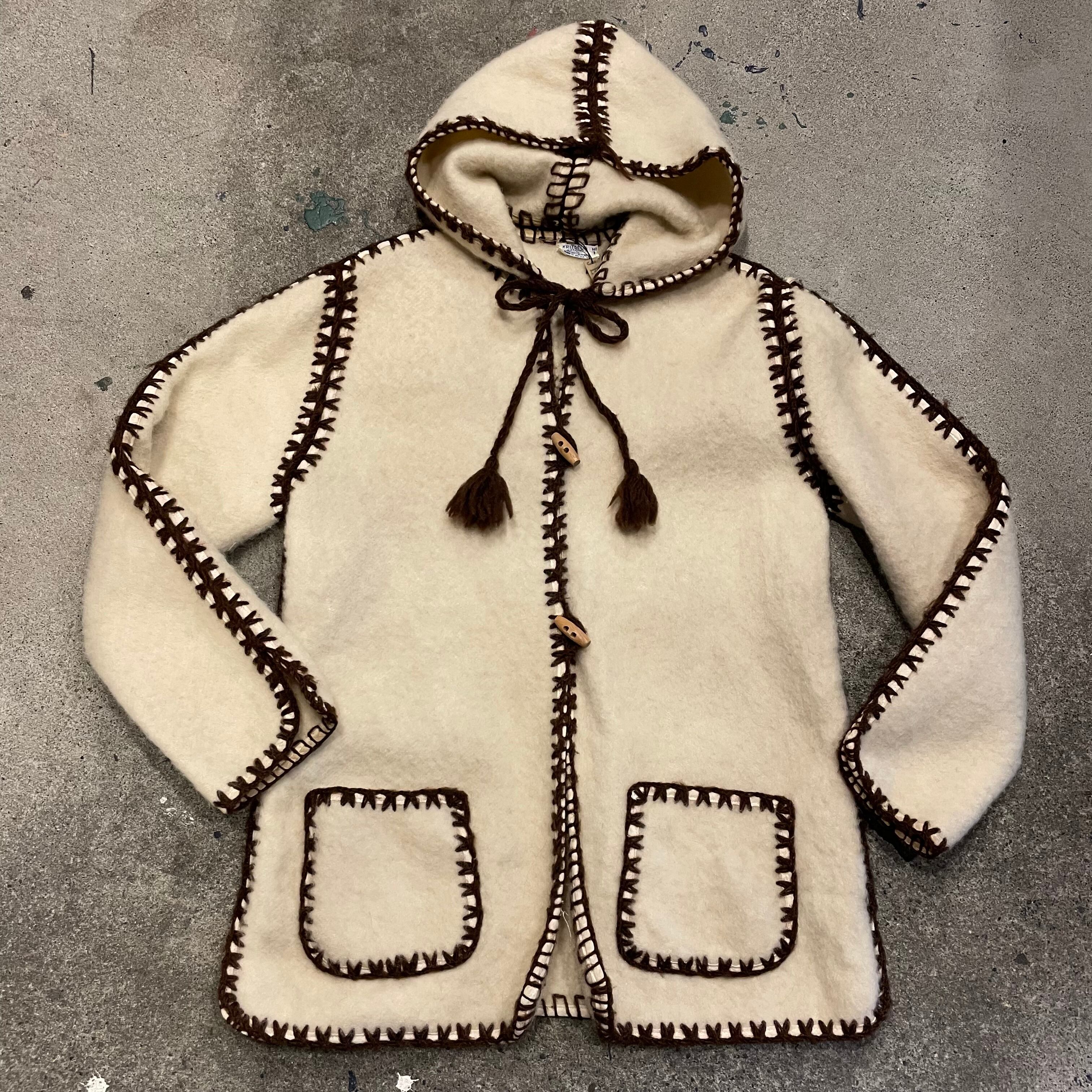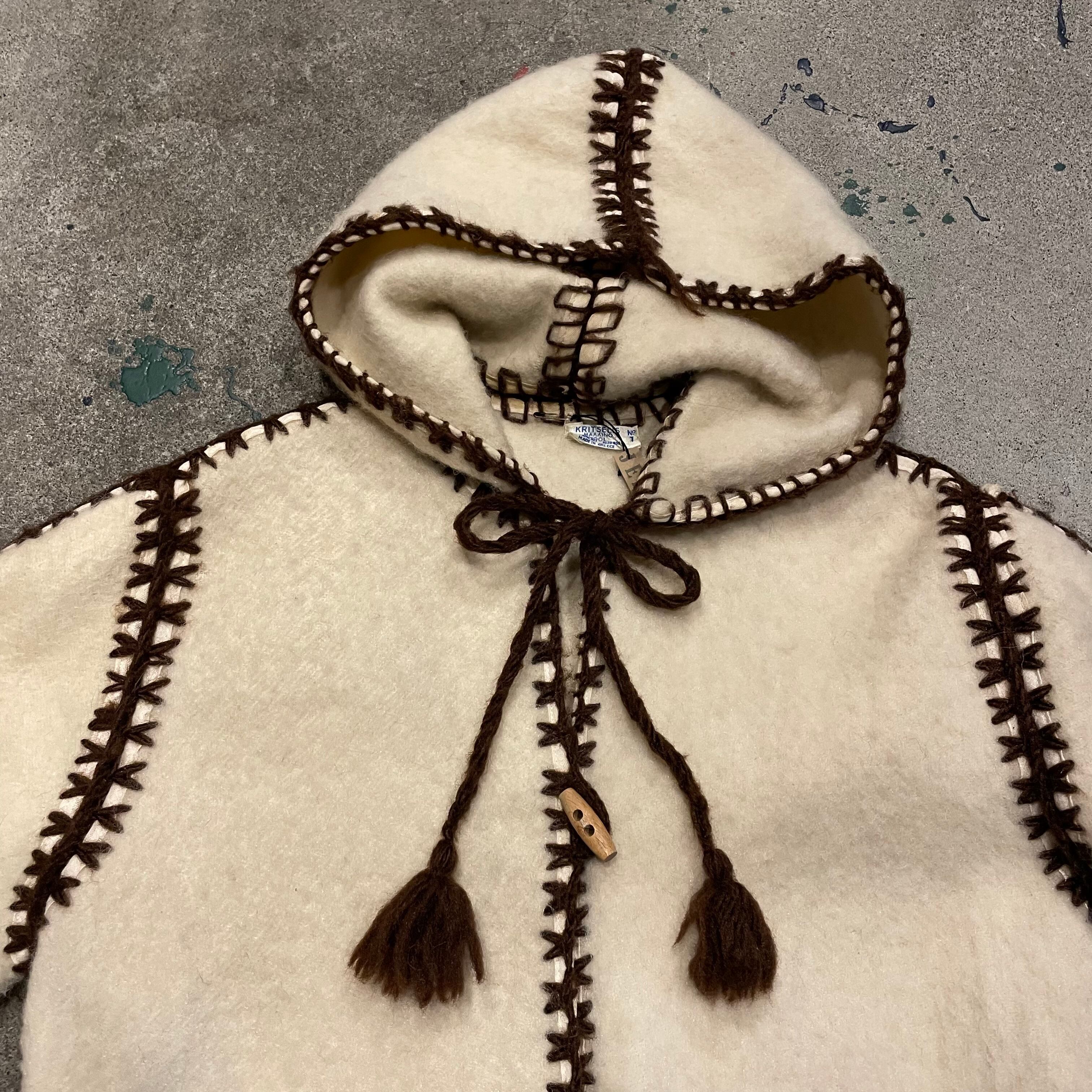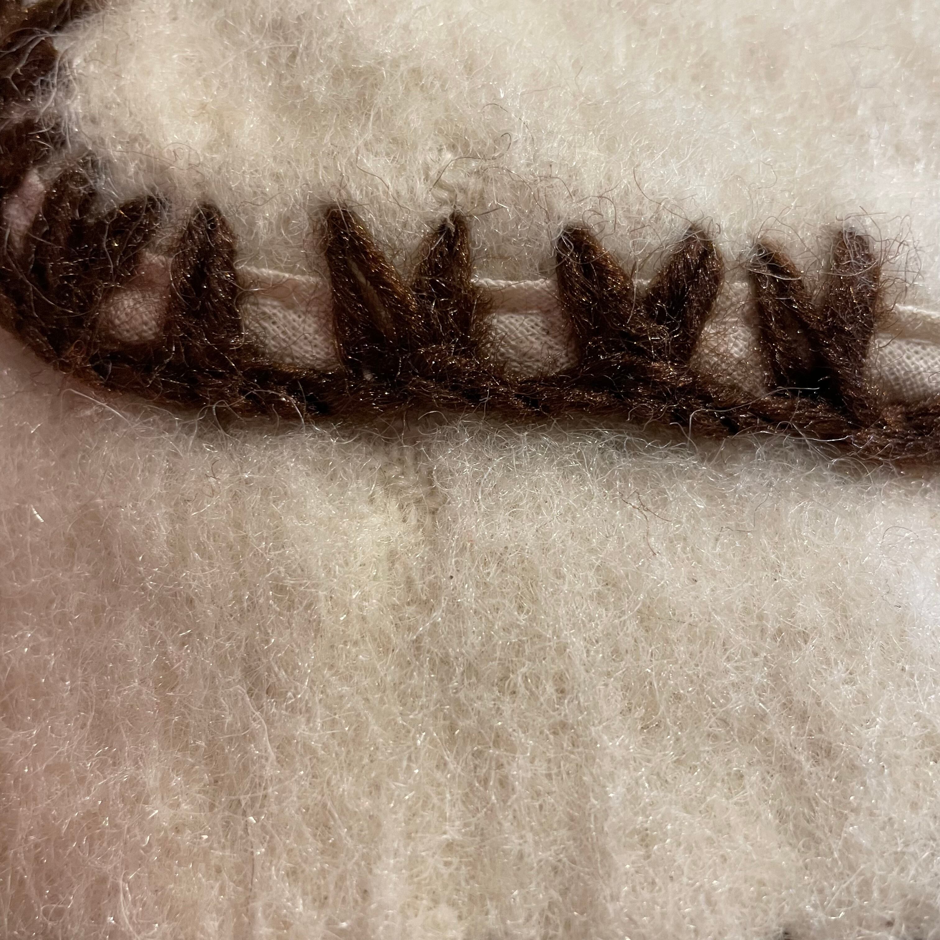 首元の紐、トグルボタン、パーツパーツを茶色の毛糸で繋げている感じが雰囲気がありとてもかわいいです。