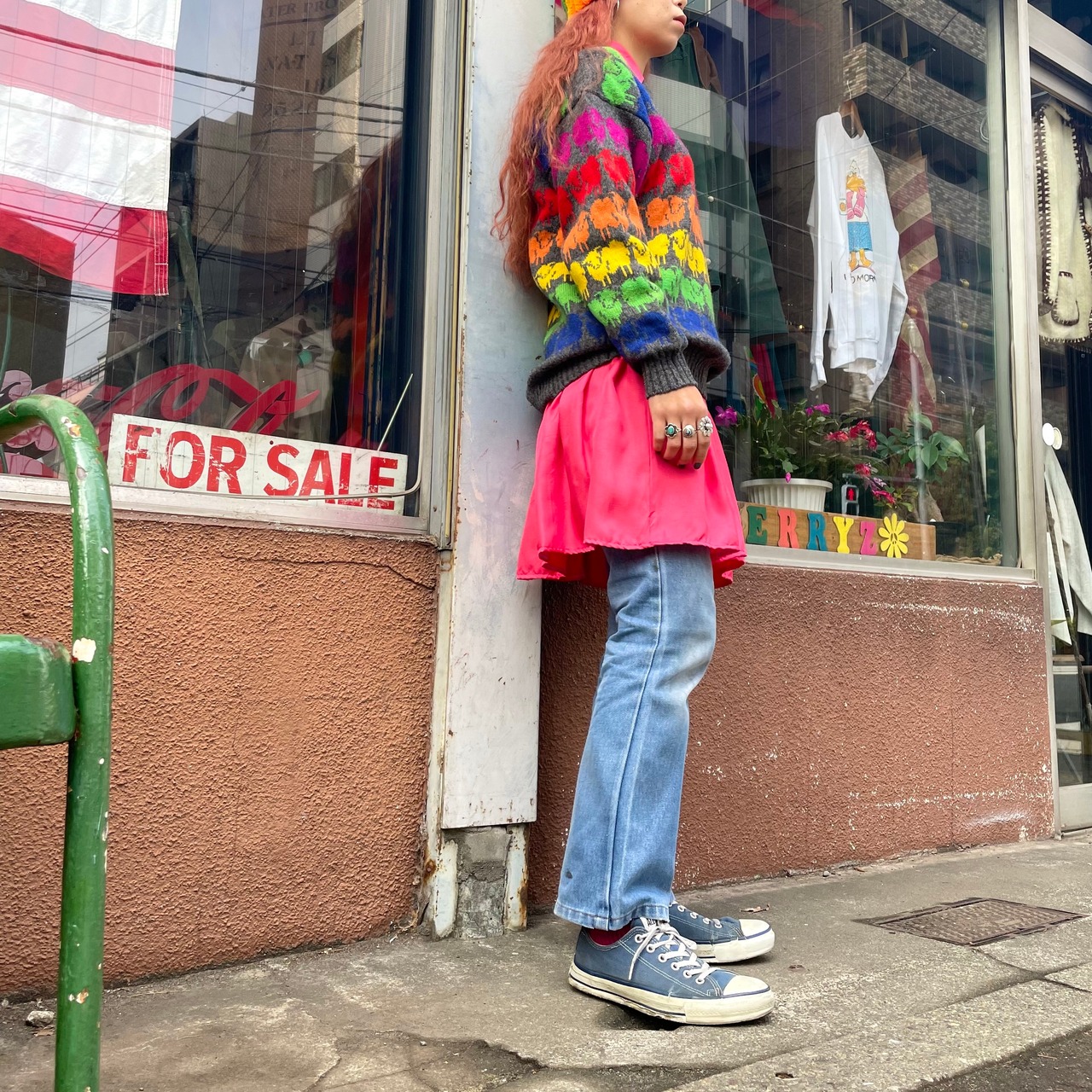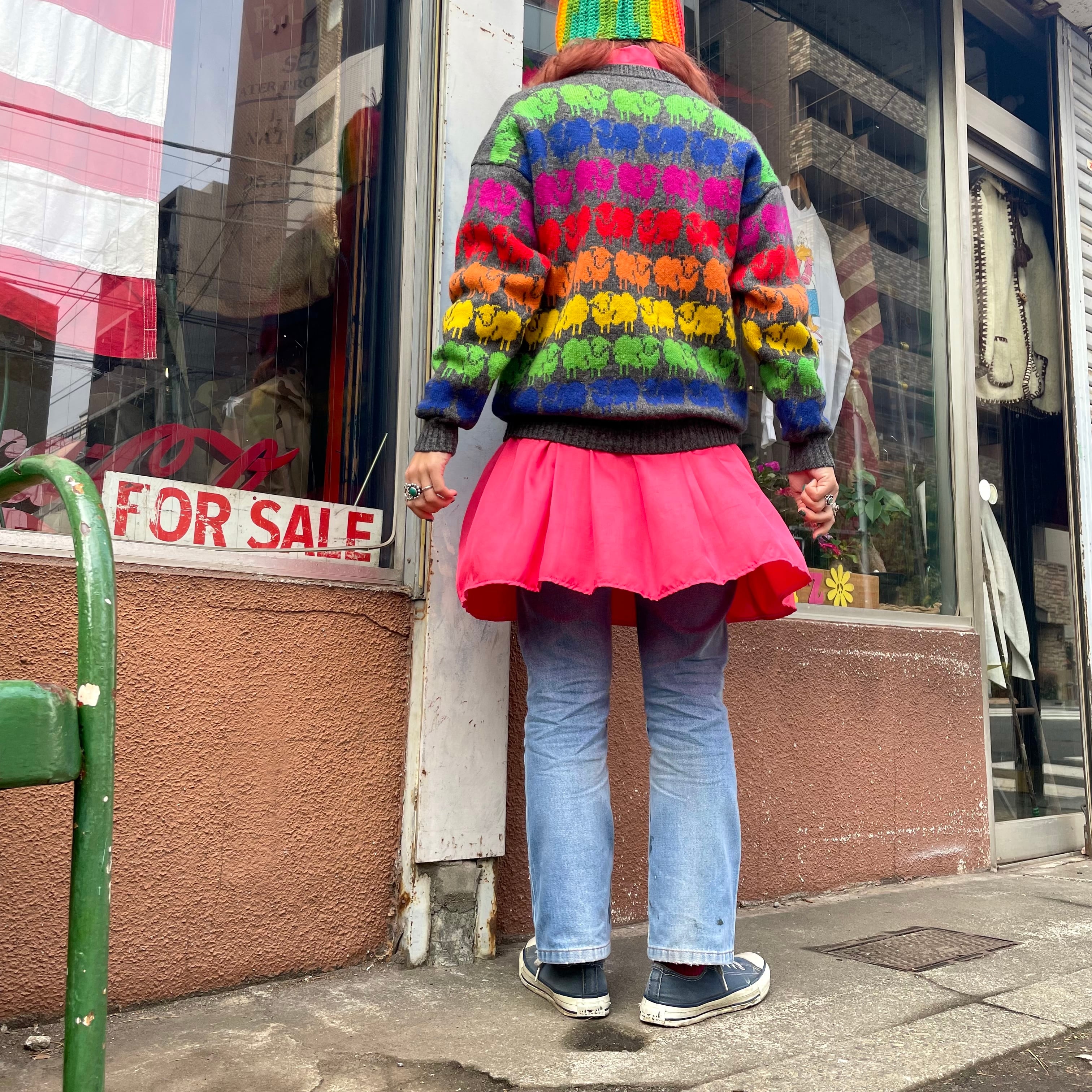 レインボーなひつじ達がかわいいセーターです。遠くから見てもとてもポップで目を惹く一枚だと思います。きれいな色のボトムと合わせても、シンプルにデニムパンツなどと合わせても良さそうですし、とてもハッピーな雰囲気が良いですね!