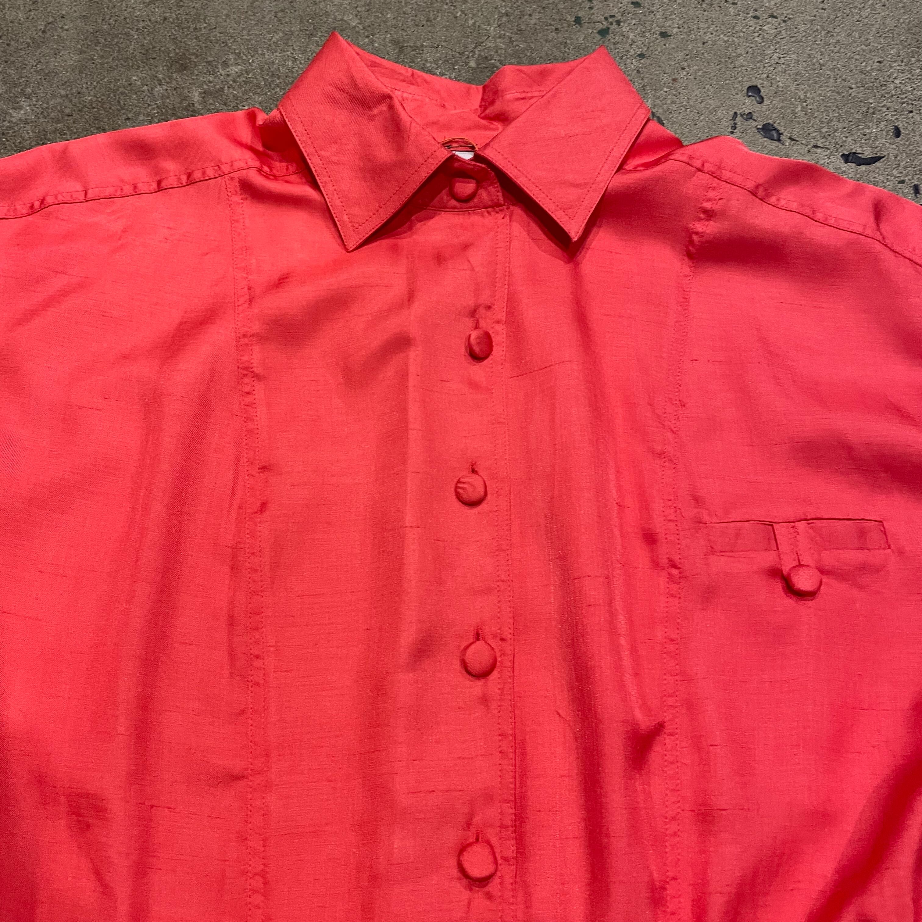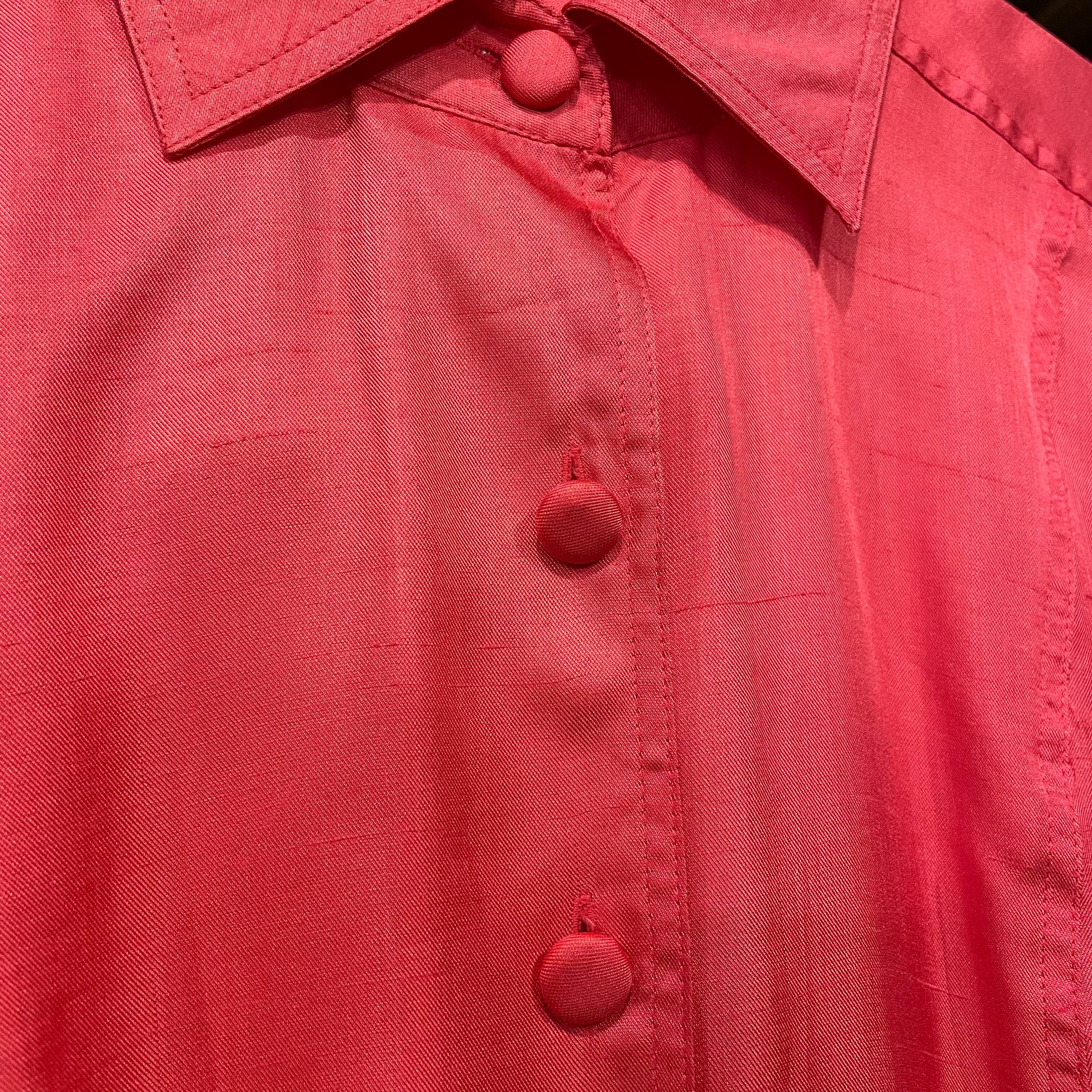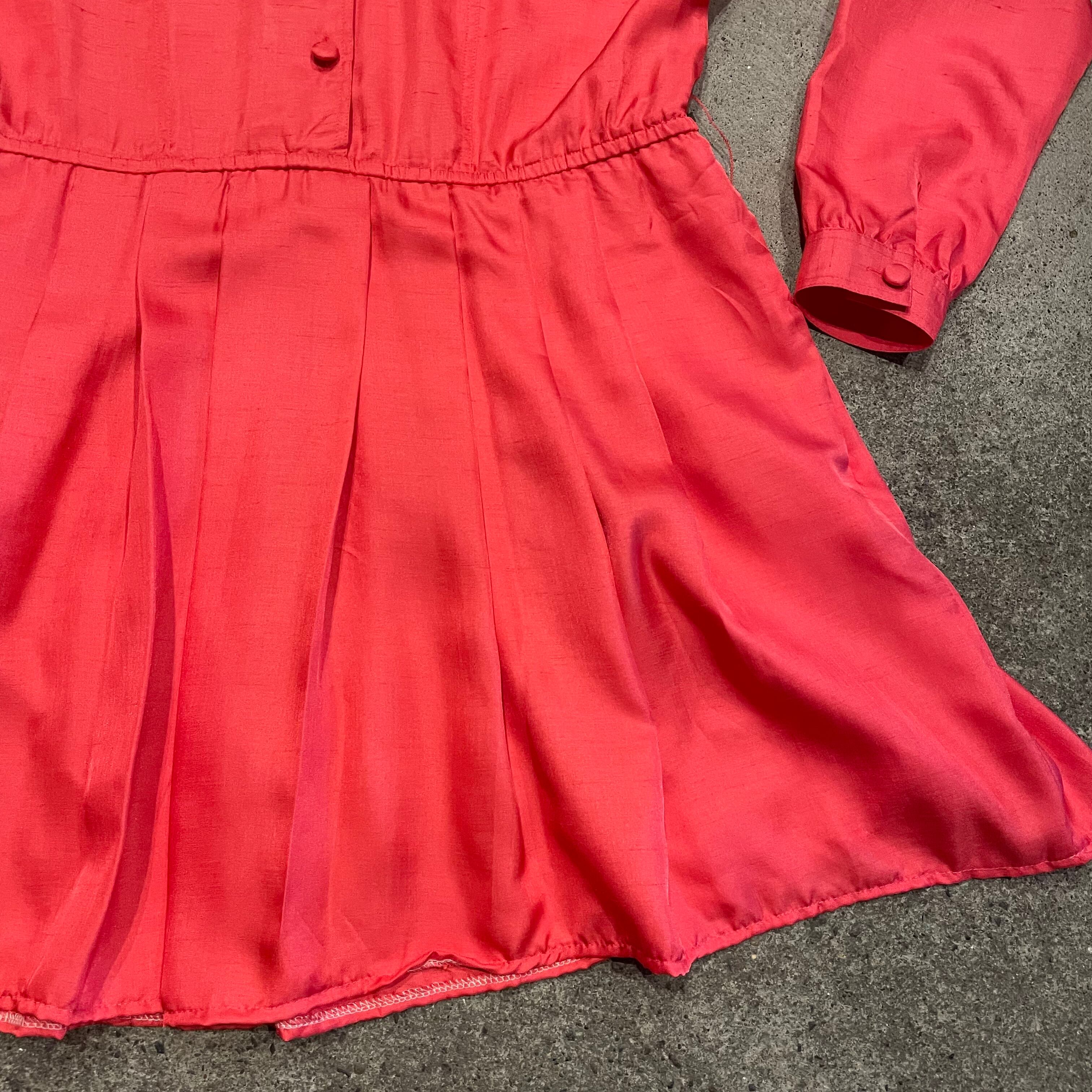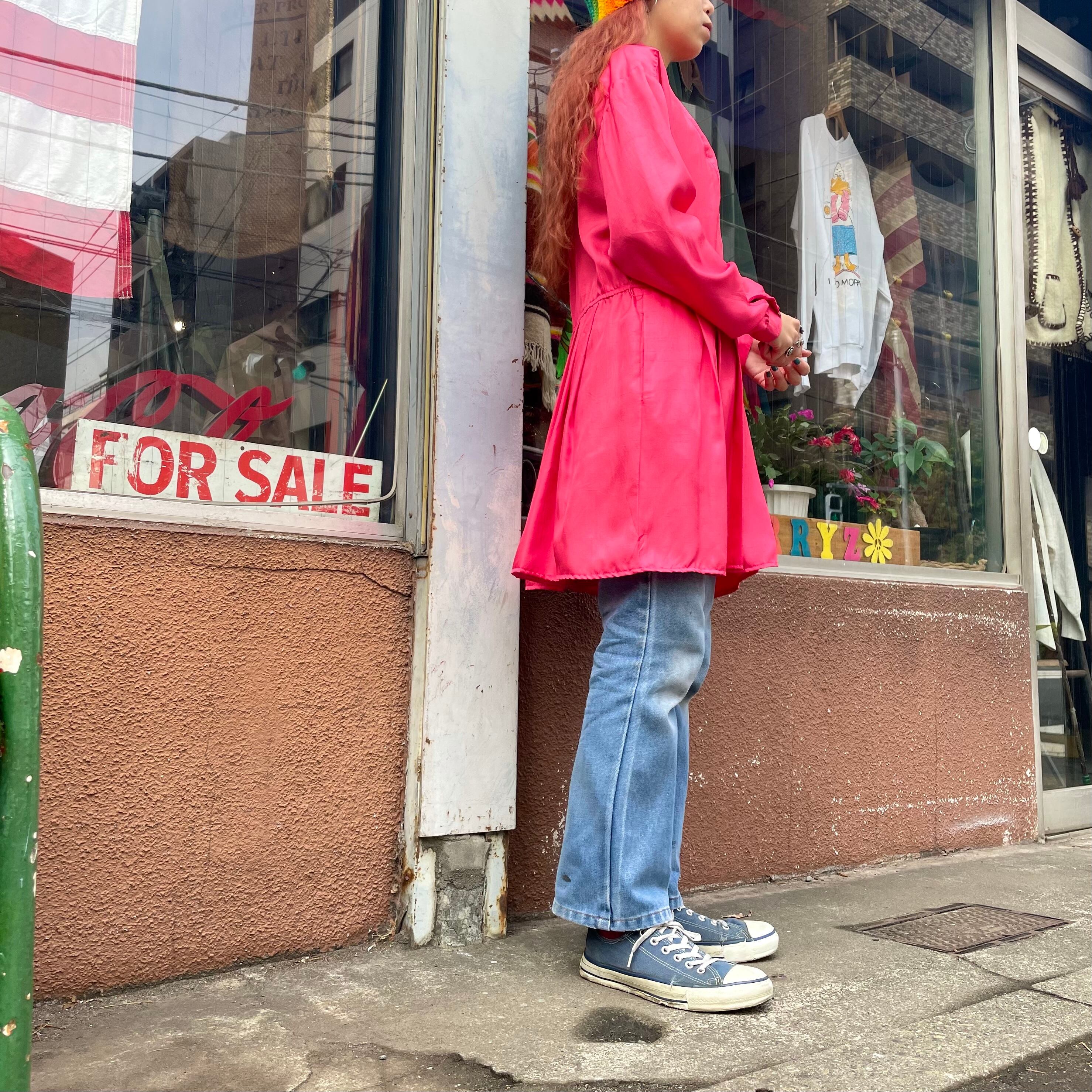 蛍光っぽいピンクがかわいいシャツワンピースです。テロンとした薄手のポリエステルがさらっと軽くて着やすい一着です。