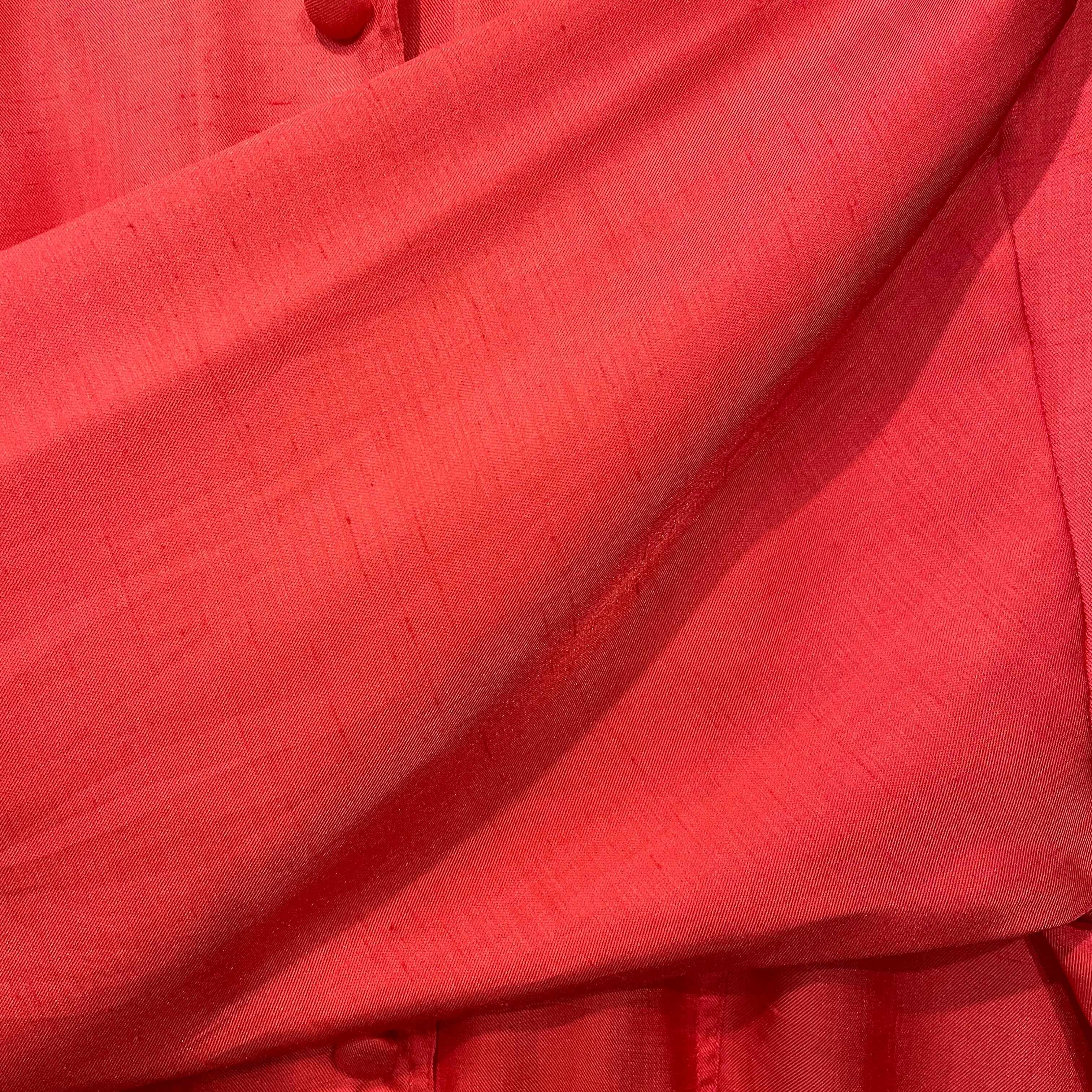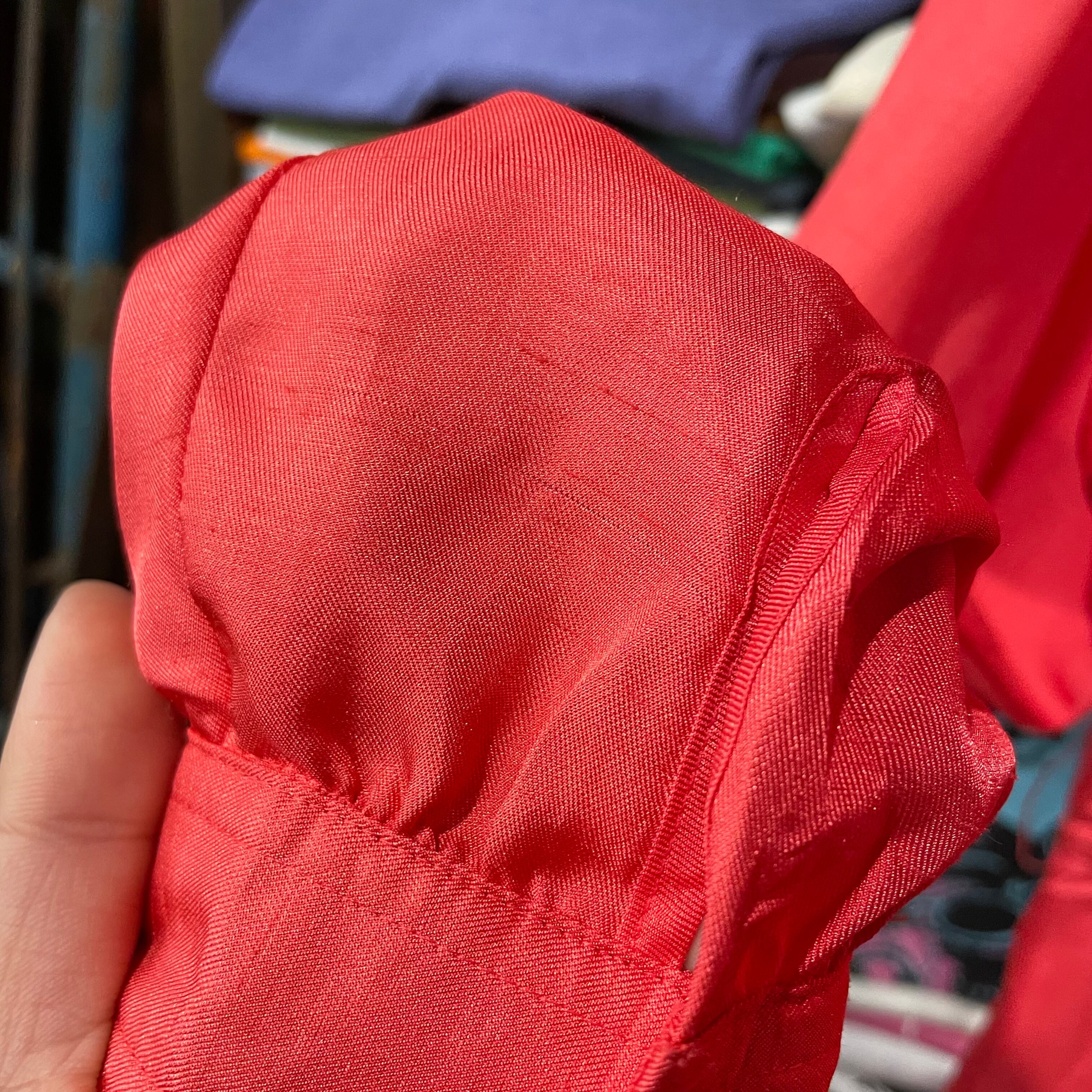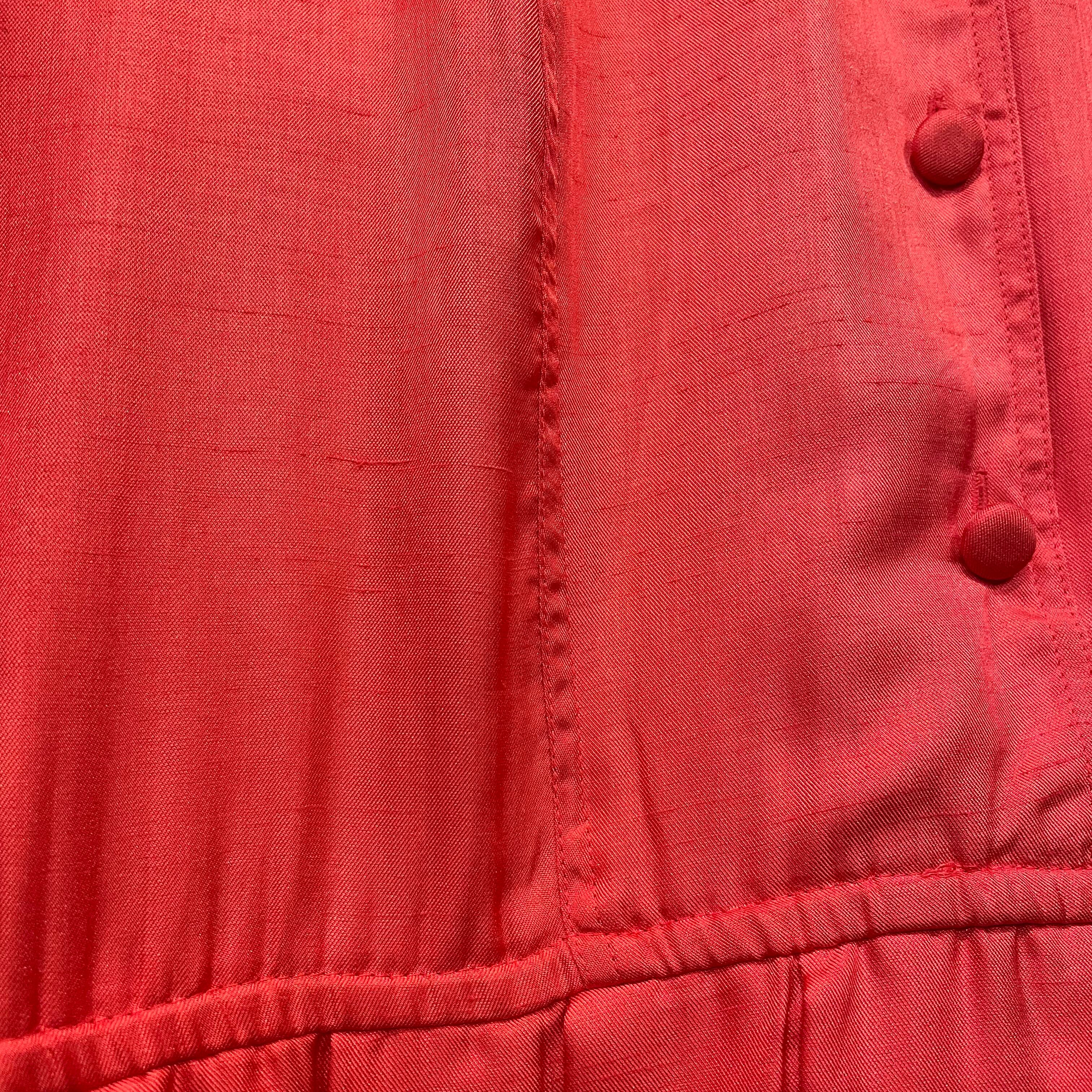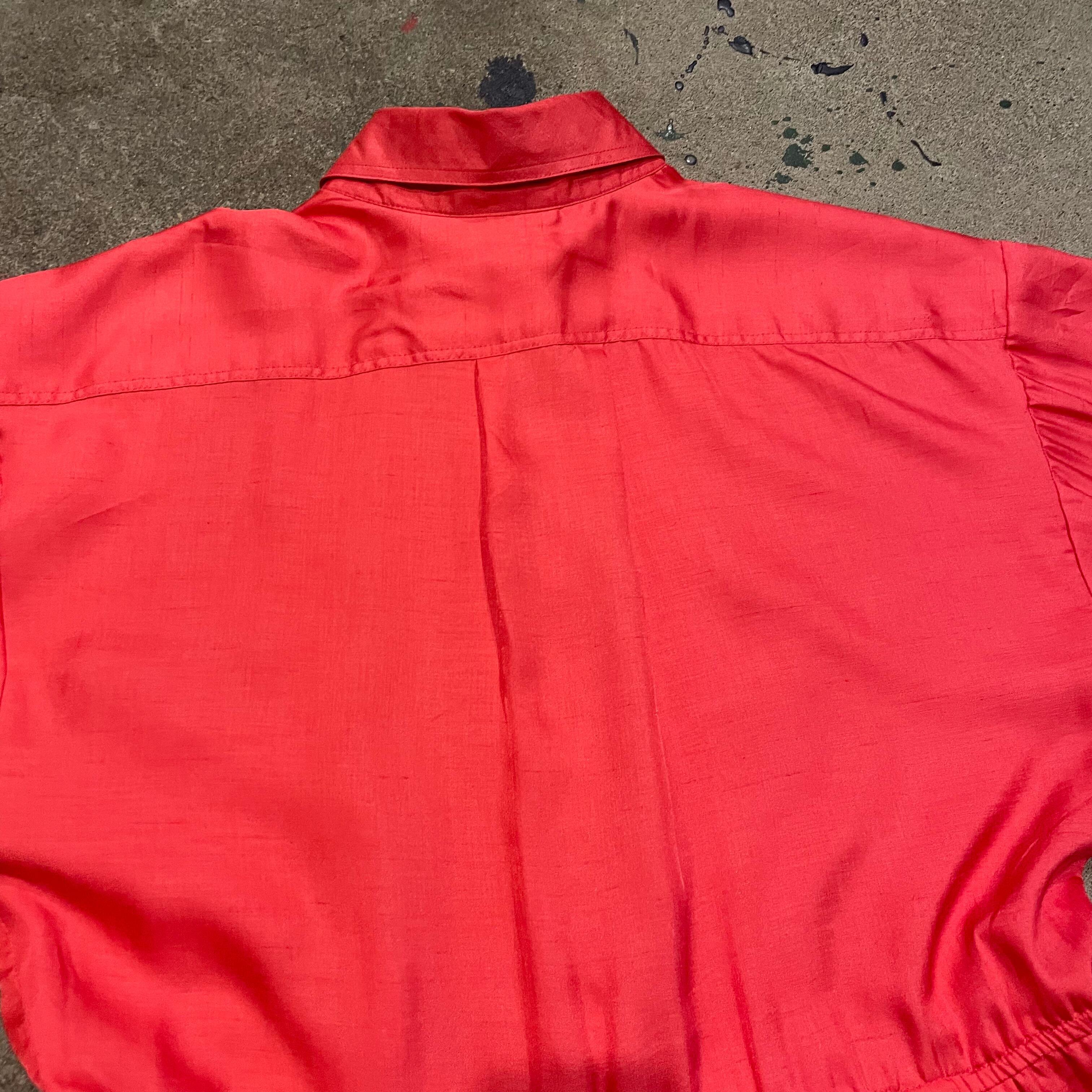 蛍光っぽいピンクがかわいいシャツワンピースです。テロンとした薄手のポリエステルがさらっと軽くて着やすい一着です。