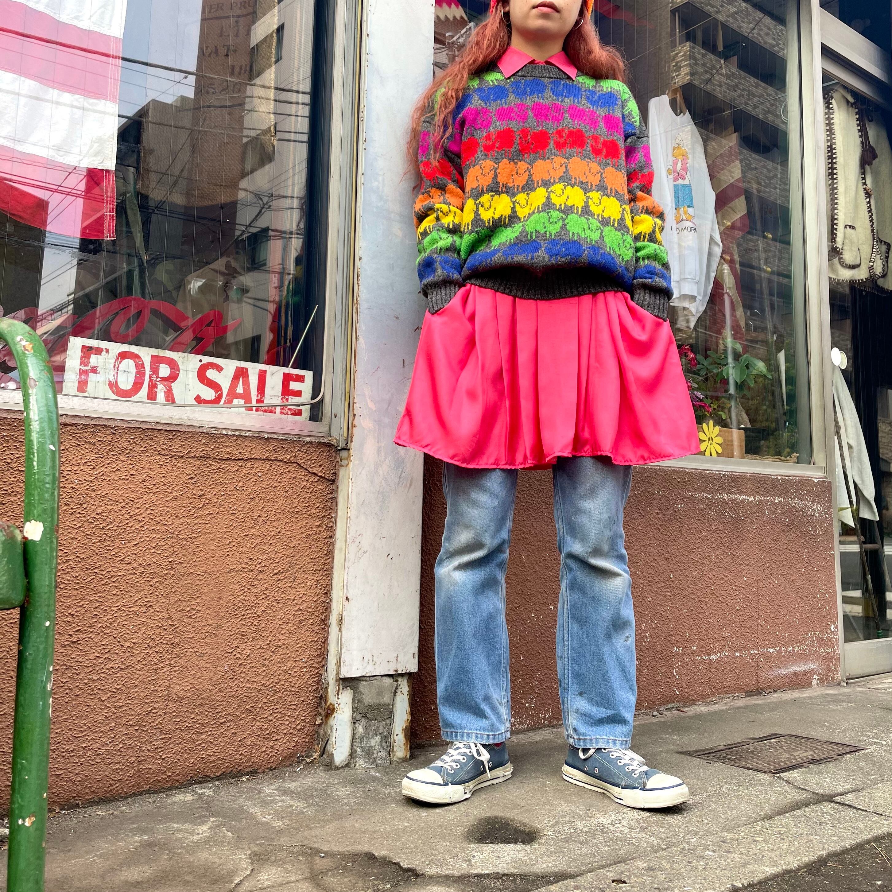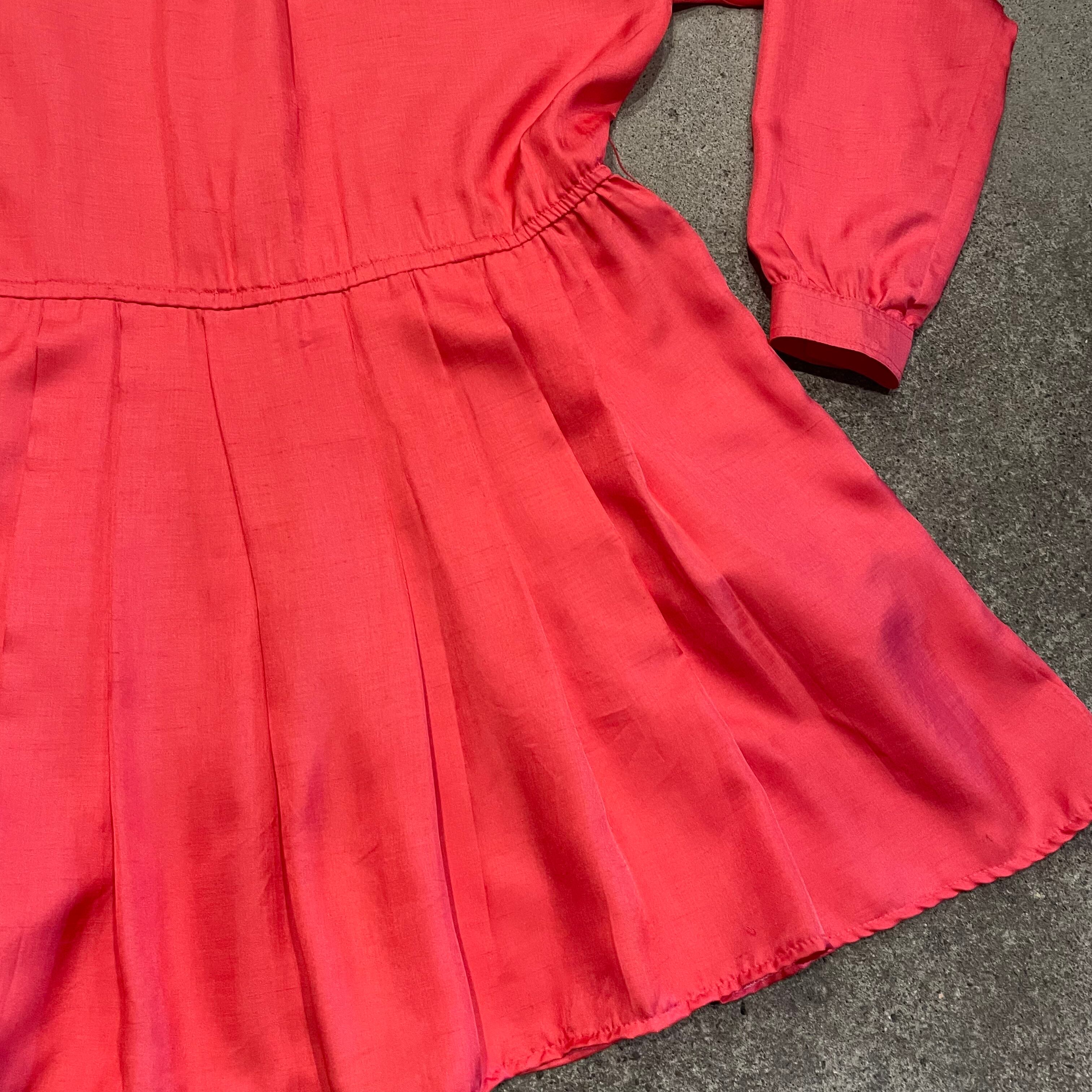 スカート部分は太めのプリーツになっていたり、絶妙な丈感でかわいいです。とても華やかな色合いですので春に一枚で着るのも良いですし、スウェットを重ねて靴下で遊んだり、袖まくりしてボタンを開けてもかわいいと思います。ベストやビスチェなどを重ねても楽しそうですね!
