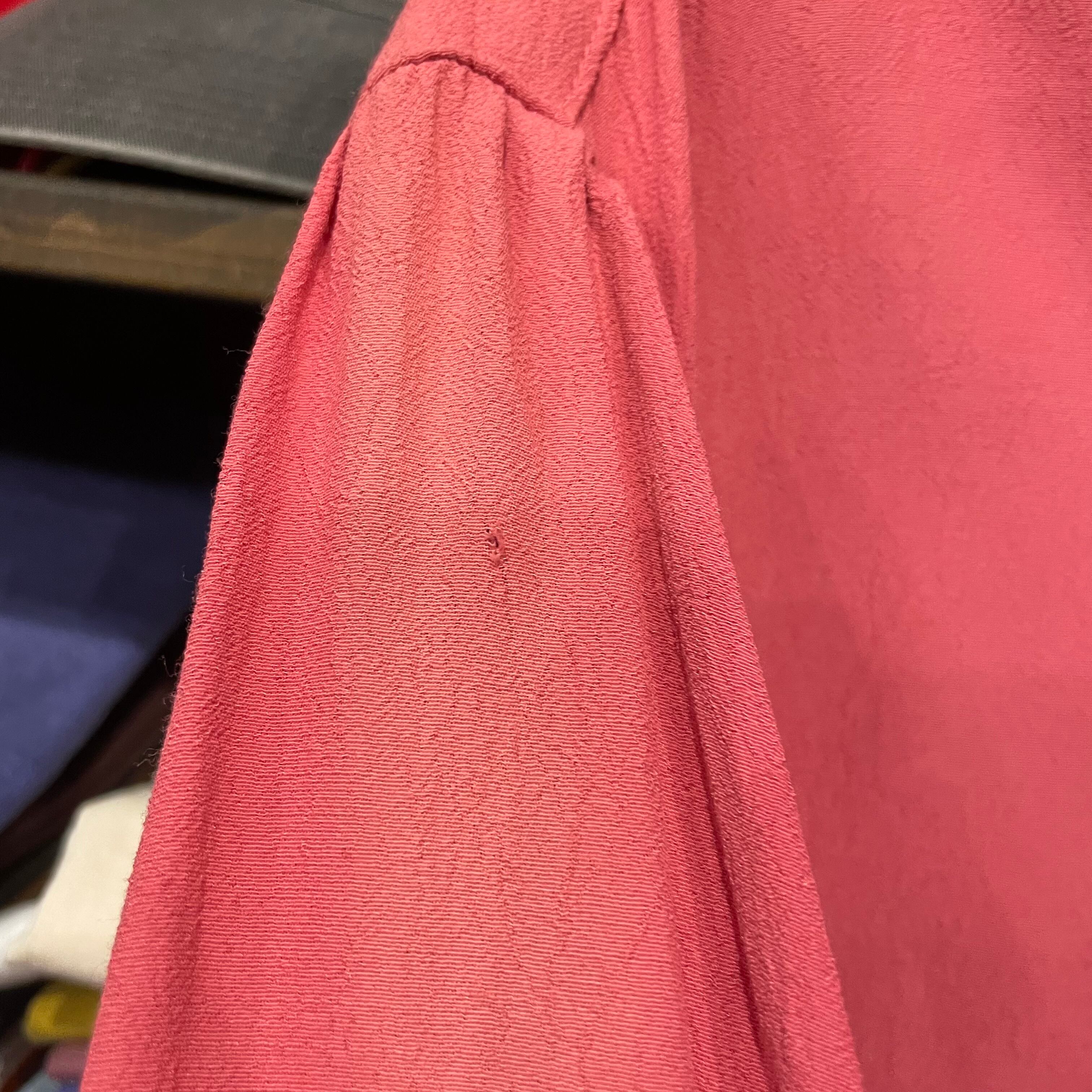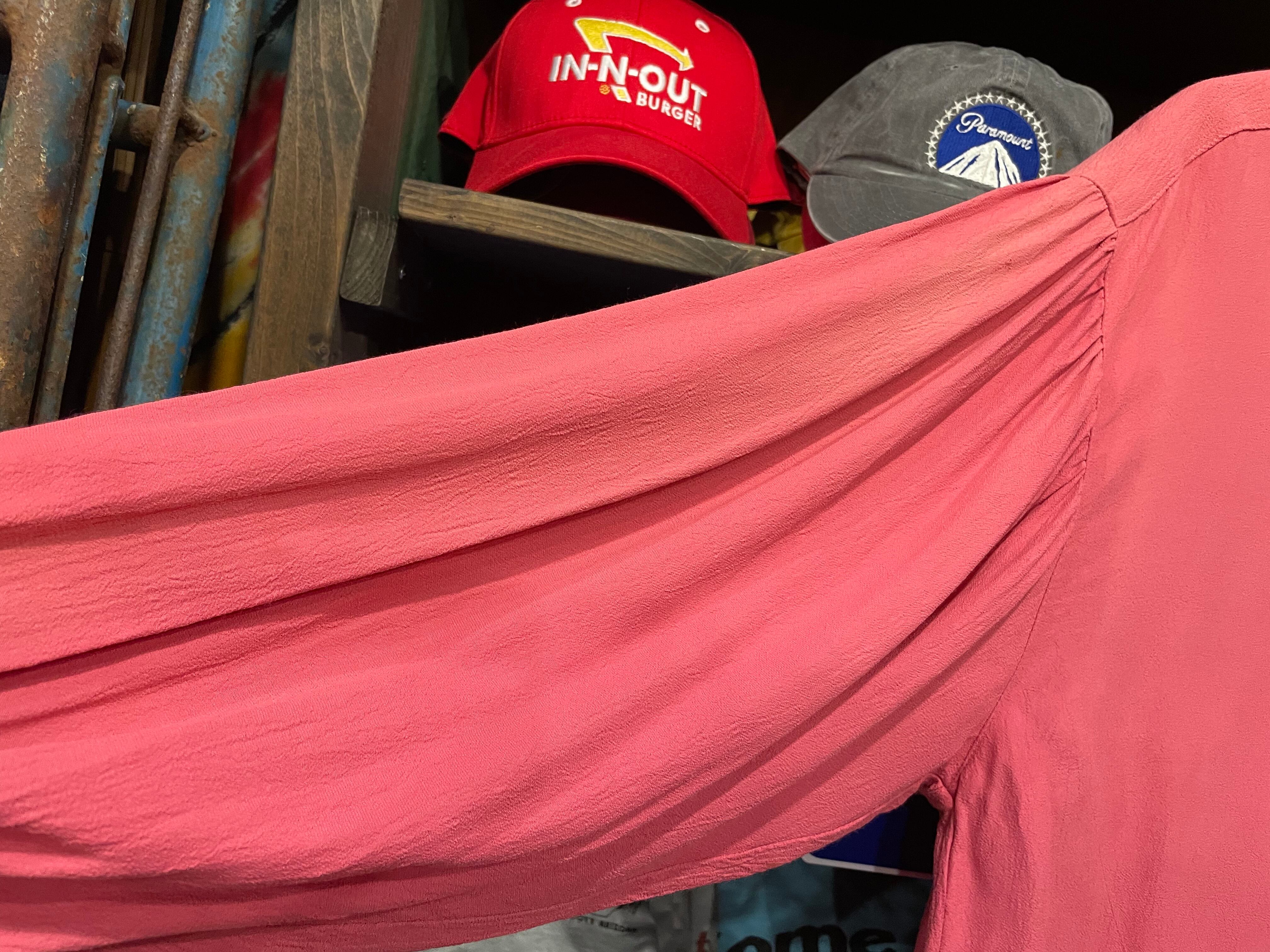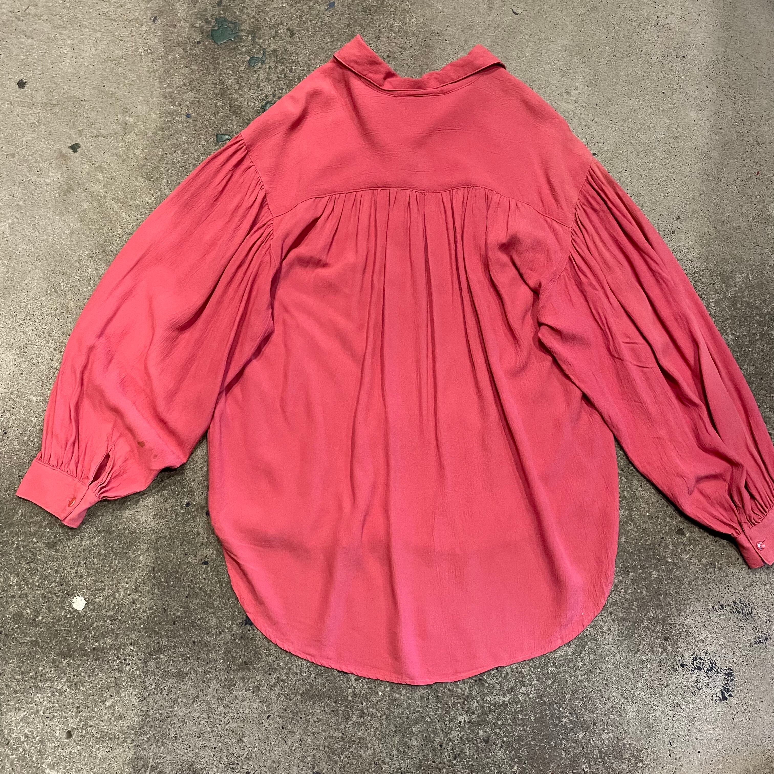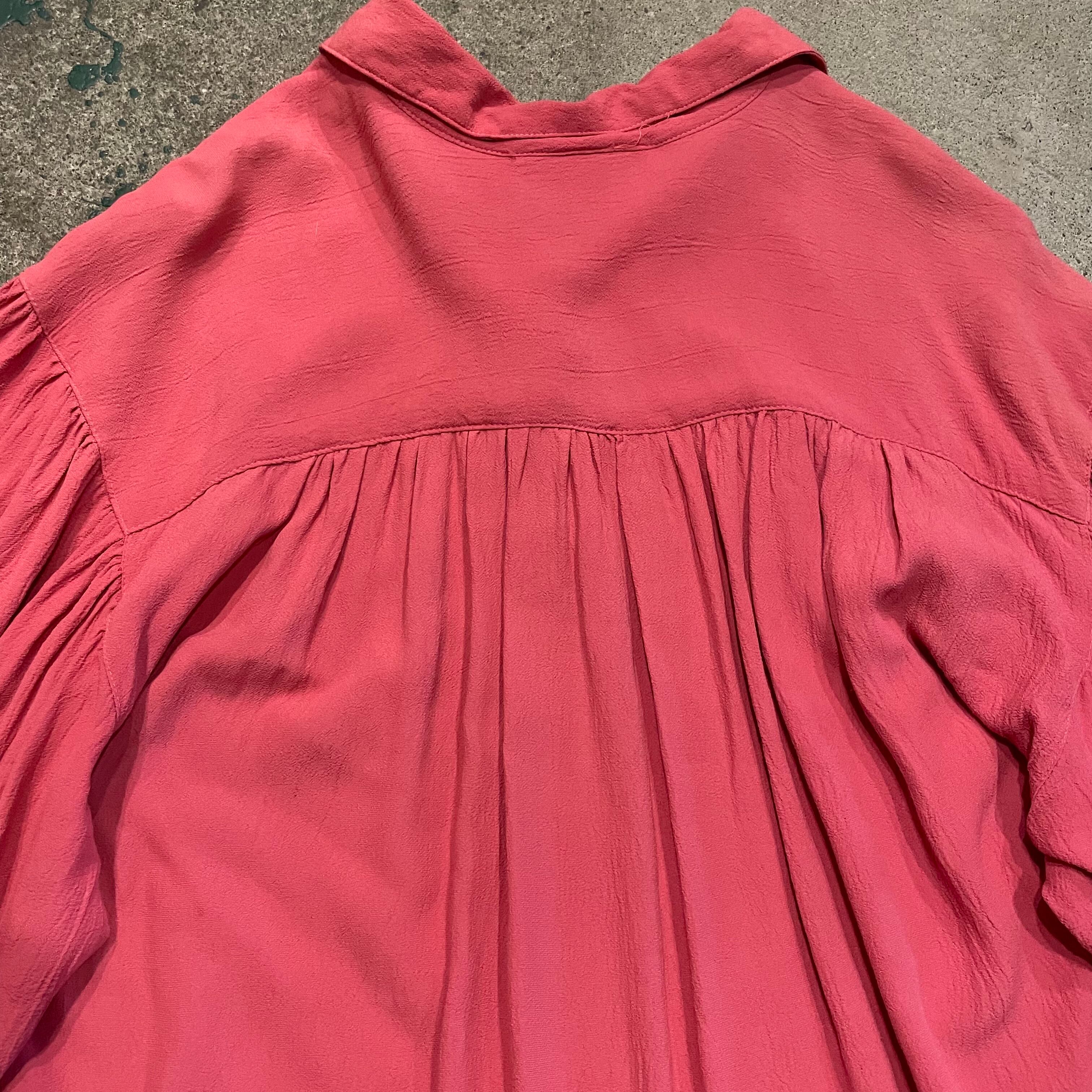 開襟タイプで、ものすごくボリューミーな袖や背中のヨークからのギャザー、後ろが長めの丈になっていたりディテールが女性らしい素敵なシルエットです。ベストと合わせたり中にタートルネックを合わせたり、春は羽織りとして使うのもかわいいと思います。