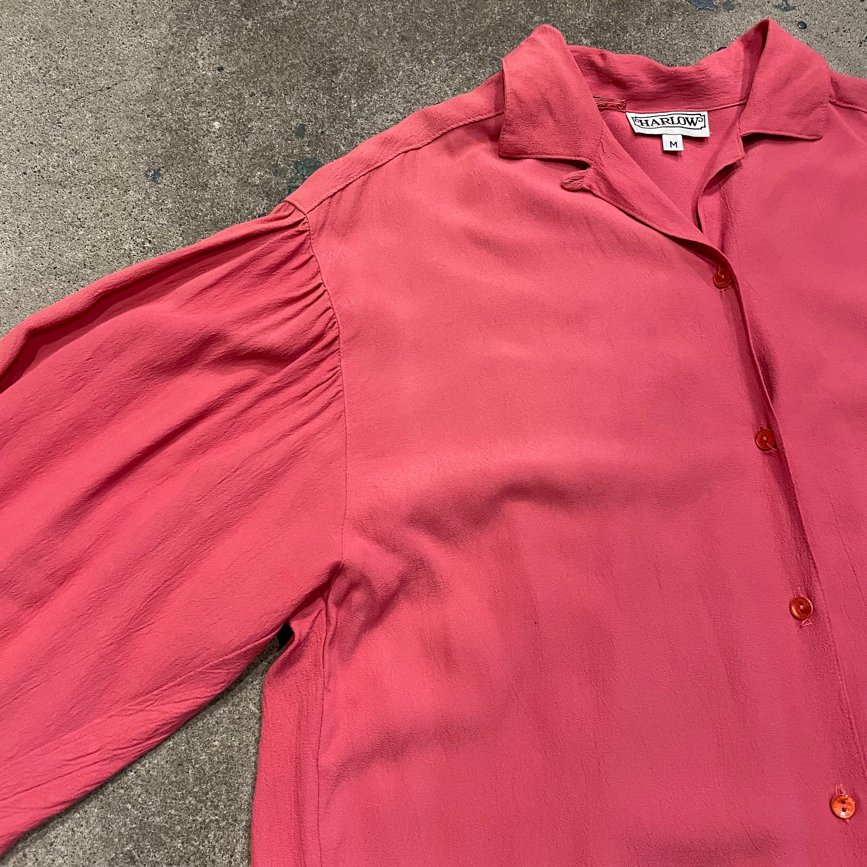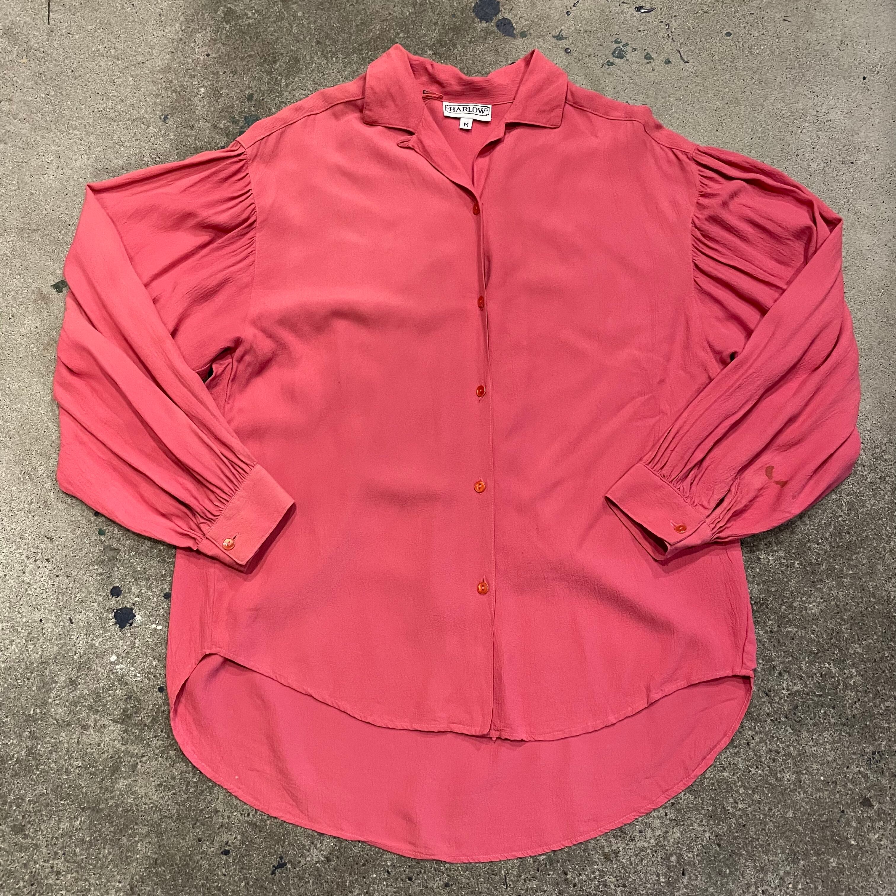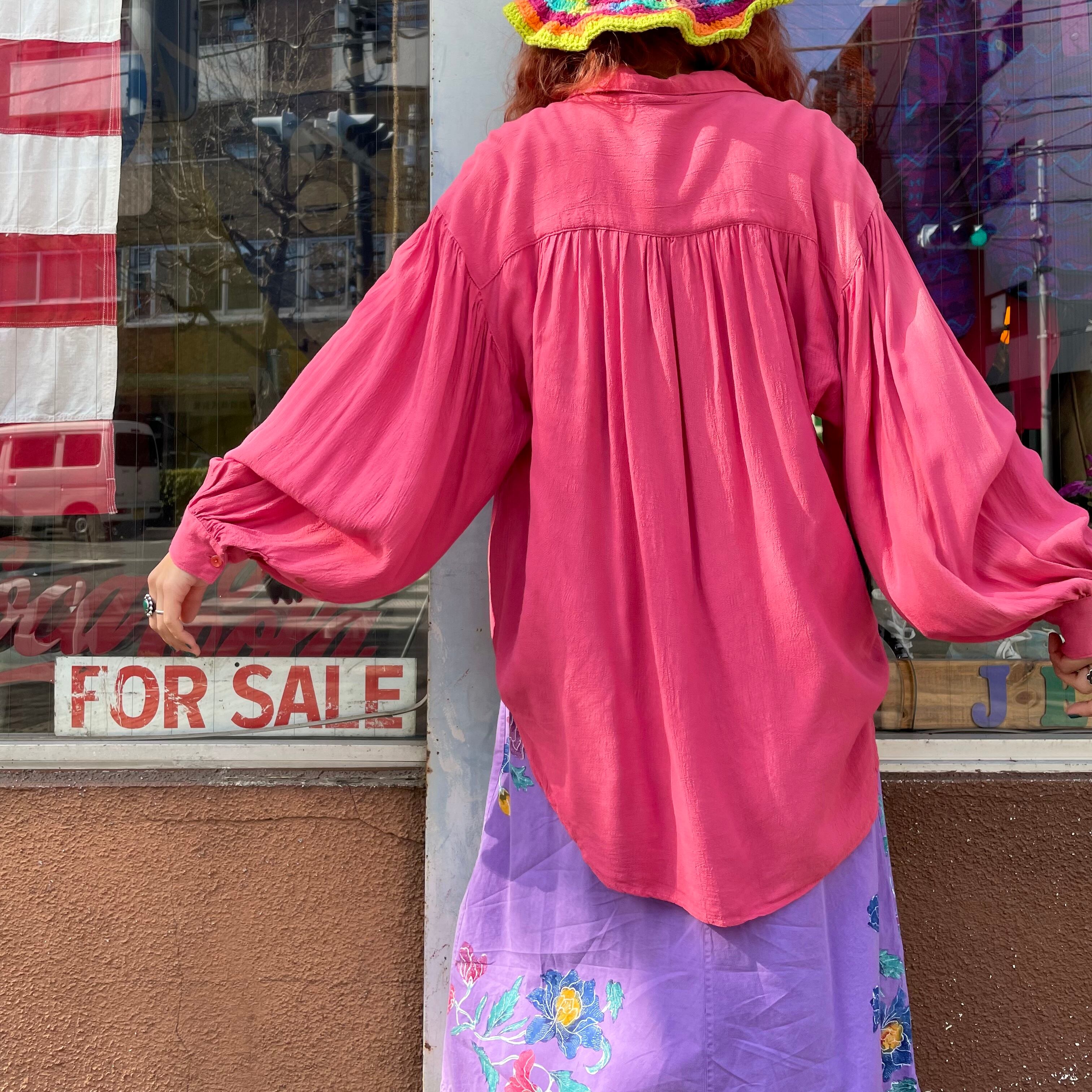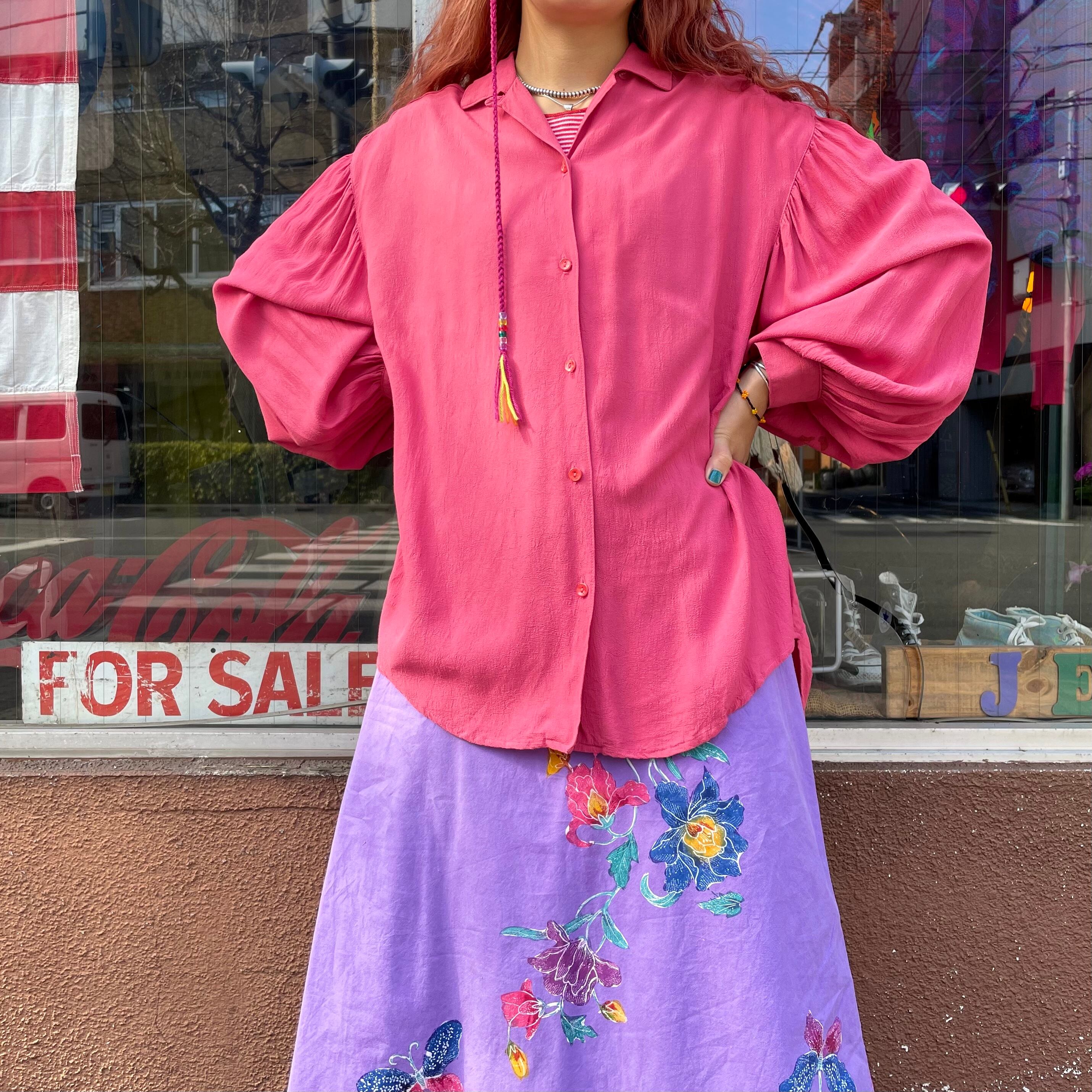 開襟タイプで、ものすごくボリューミーな袖や背中のヨークからのギャザー、後ろが長めの丈になっていたりディテールが女性らしい素敵なシルエットです。ベストと合わせたり中にタートルネックを合わせたり、春は羽織りとして使うのもかわいいと思います。