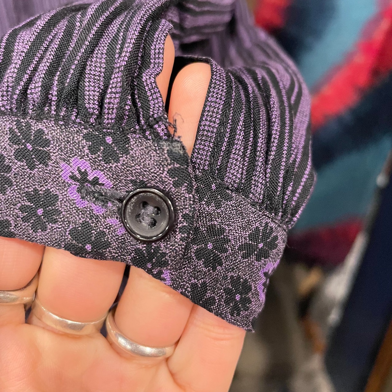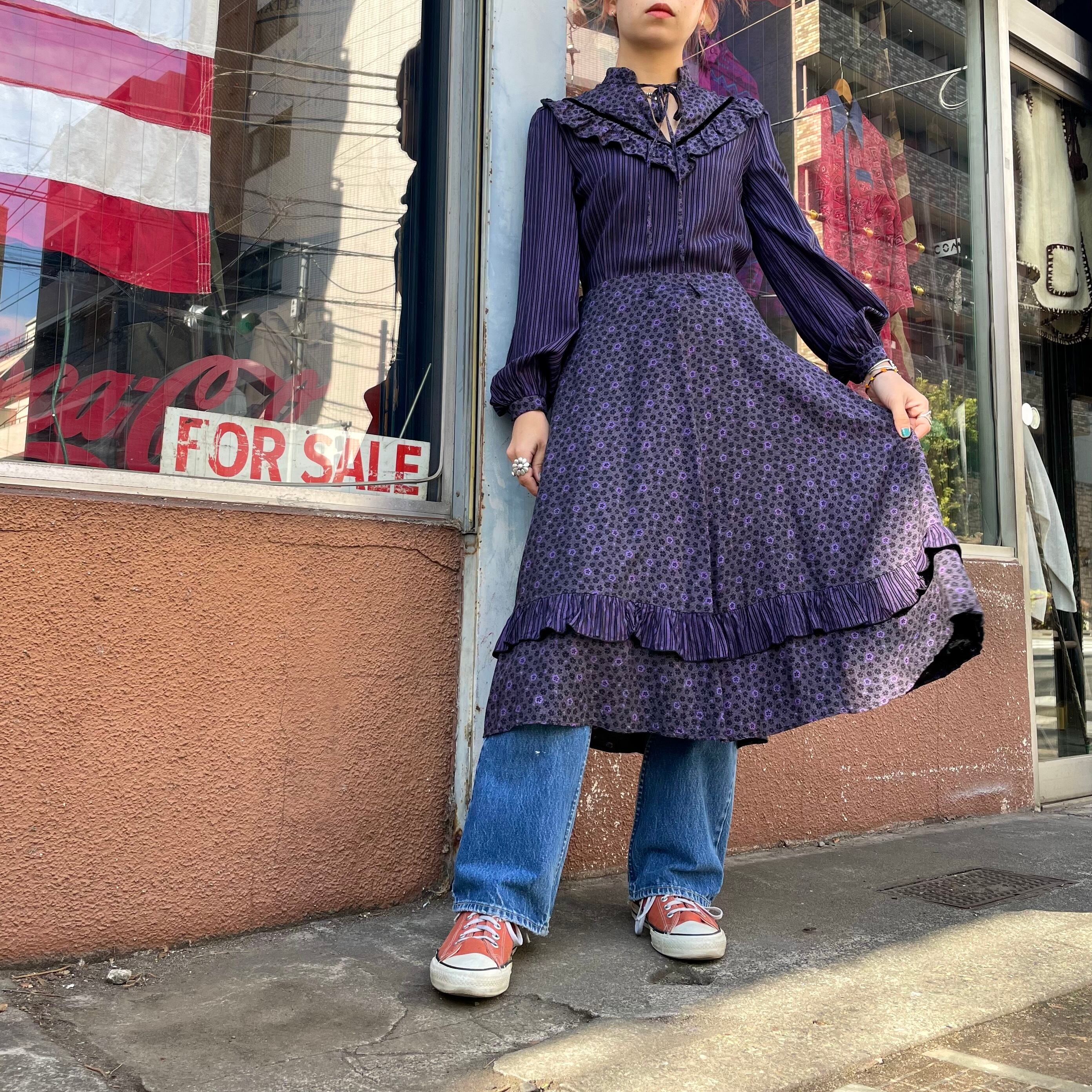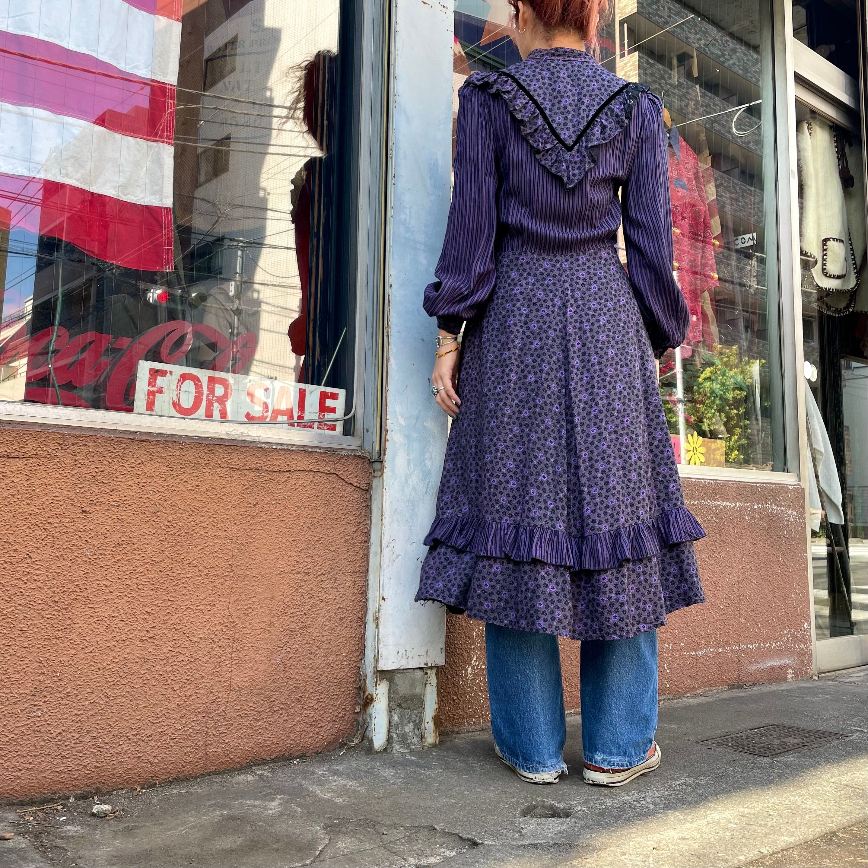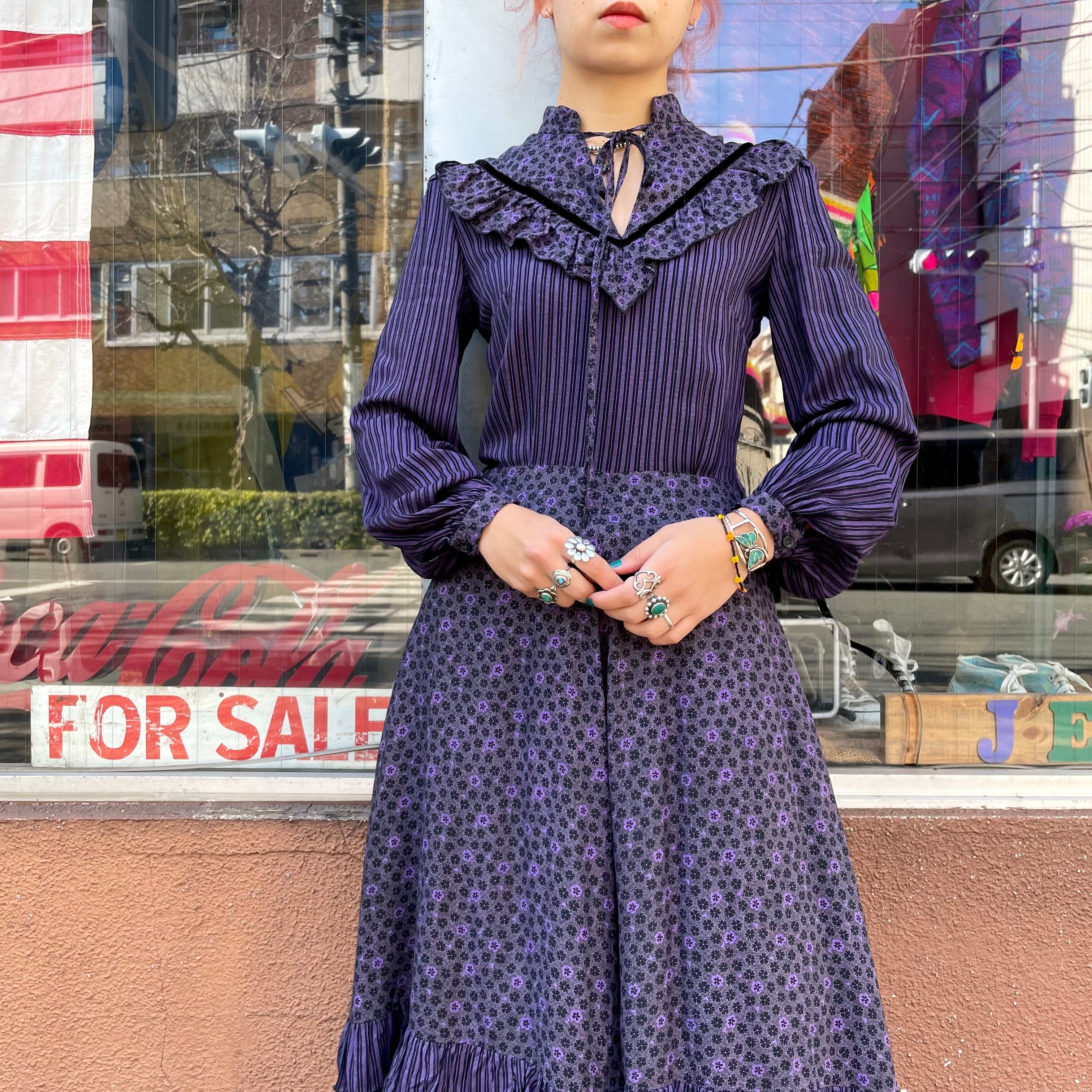 紫と黒のストライプ×花柄がかわいいワンピースです。首回りが襟のようなデザインになっておりベロアテープが付いていて、袖口のぽわっと膨らむ感じやウエストがキュッと細めでスカートの裾にもフリルが、なんともロマンチックなデザインですが色味が渋めなのでラブリーになり過ぎず着ていただけるかと思います。ジージャンやミリタリージャケット、ライダースなどを合わせて甘辛なスタイルもかわいいと思います。