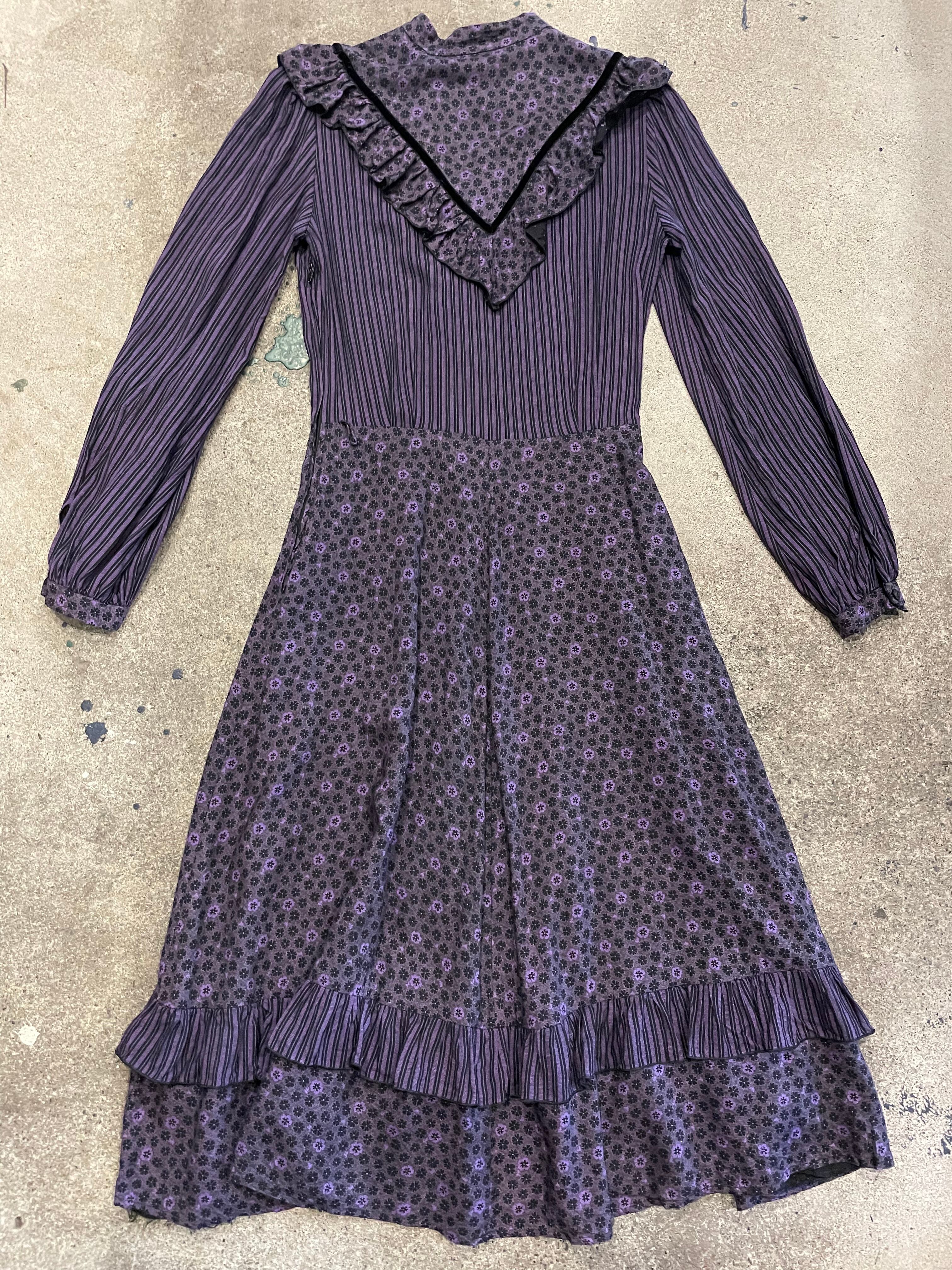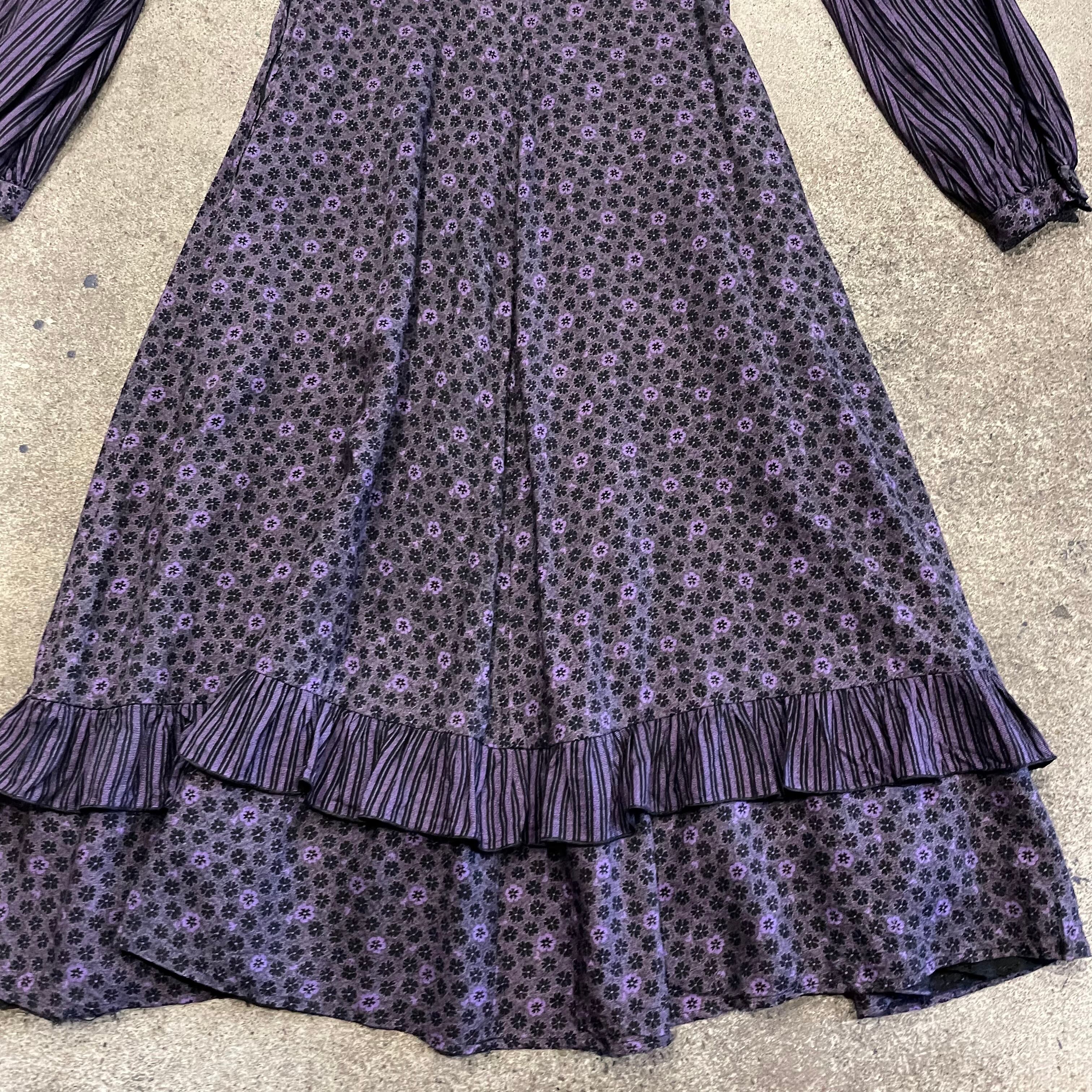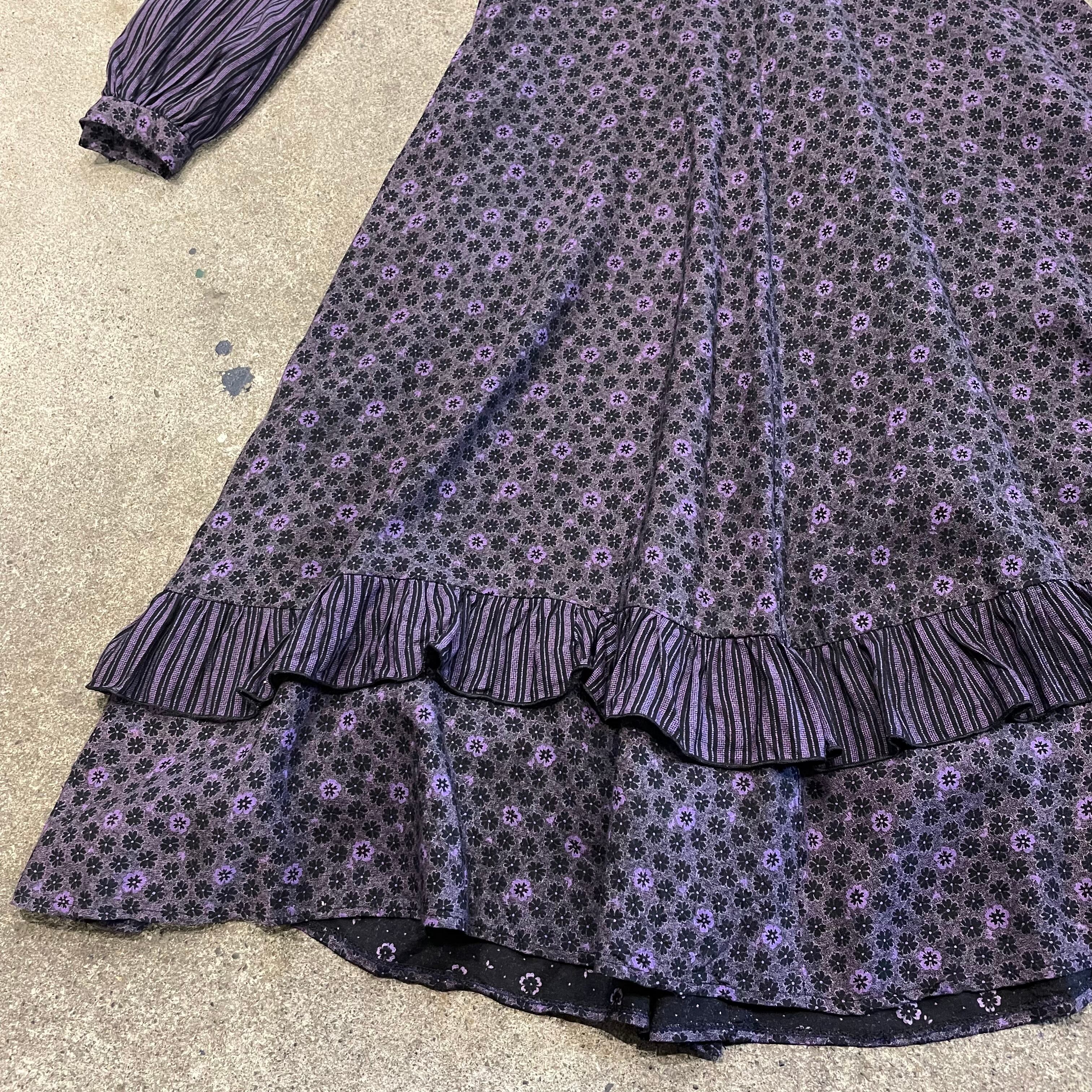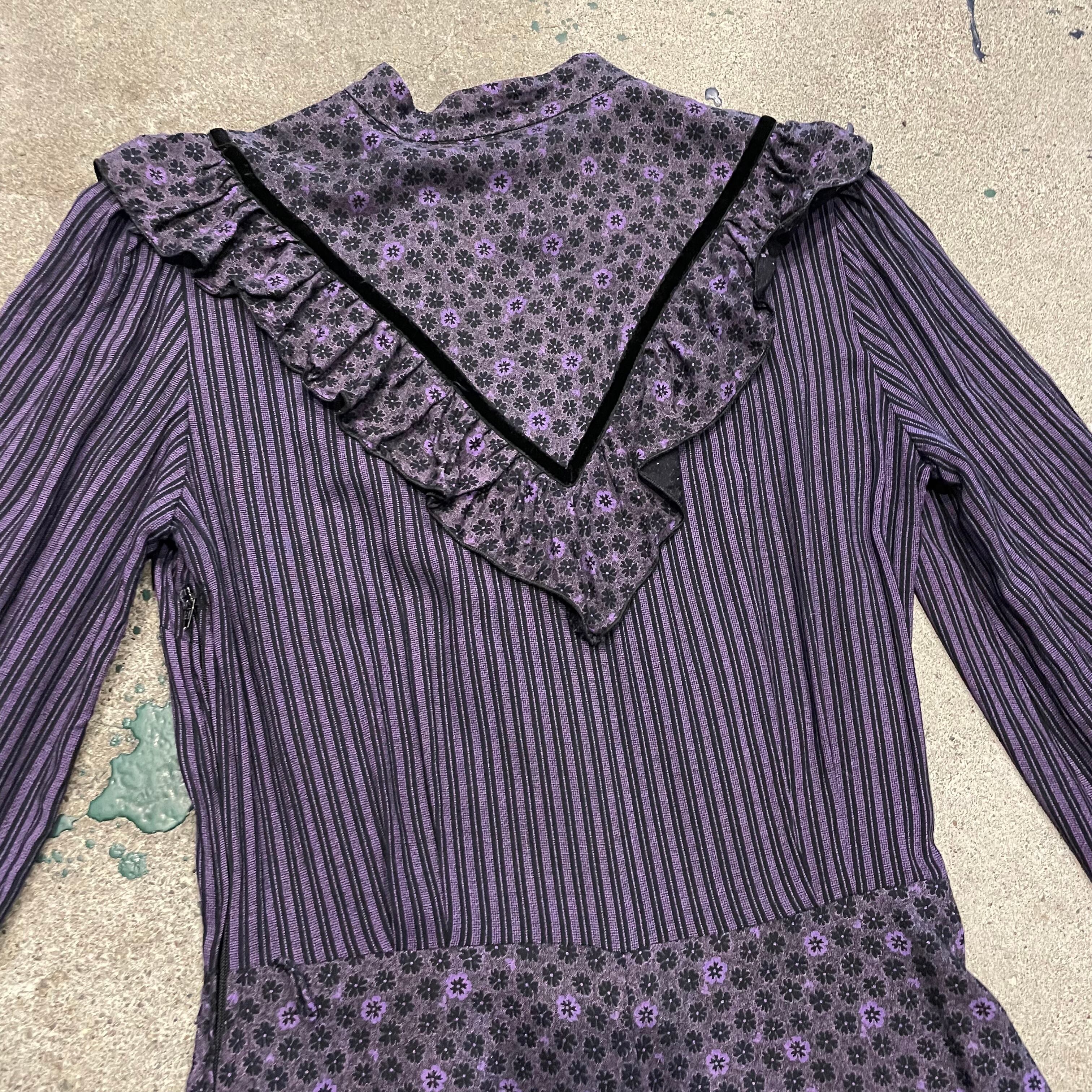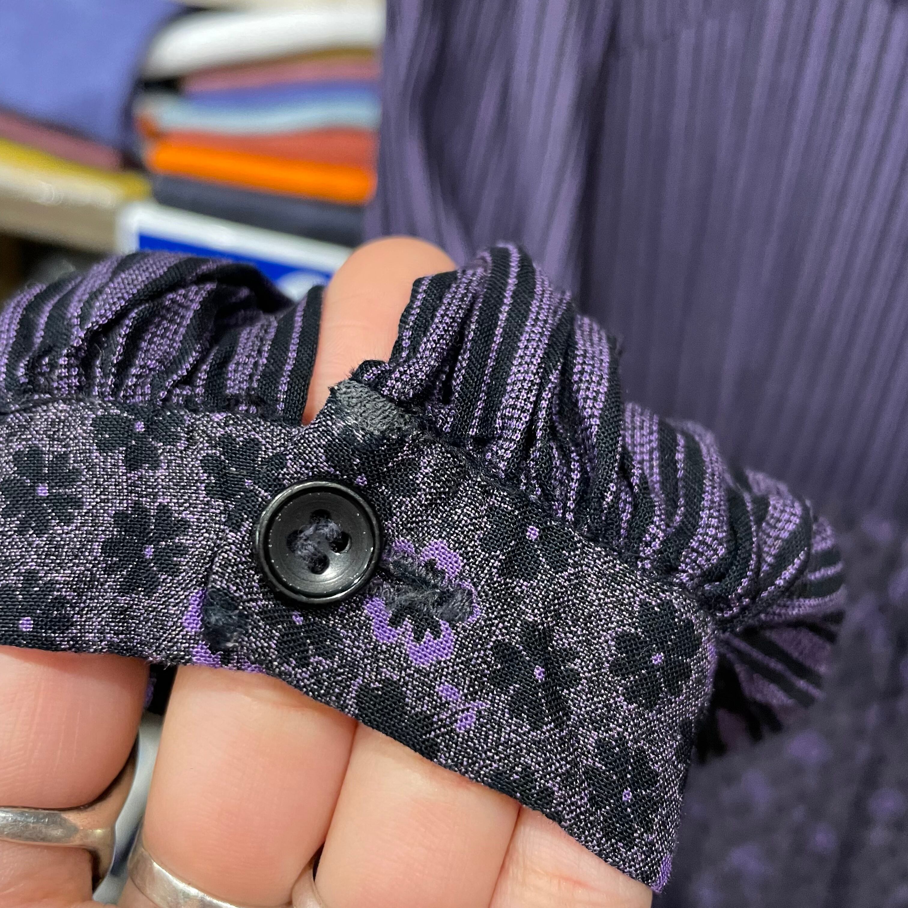 紫と黒のストライプ×花柄がかわいいワンピースです。首回りが襟のようなデザインになっておりベロアテープが付いていて、袖口のぽわっと膨らむ感じやウエストがキュッと細めでスカートの裾にもフリルが、なんともロマンチックなデザインですが色味が渋めなのでラブリーになり過ぎず着ていただけるかと思います。ジージャンやミリタリージャケット、ライダースなどを合わせて甘辛なスタイルもかわいいと思います。
