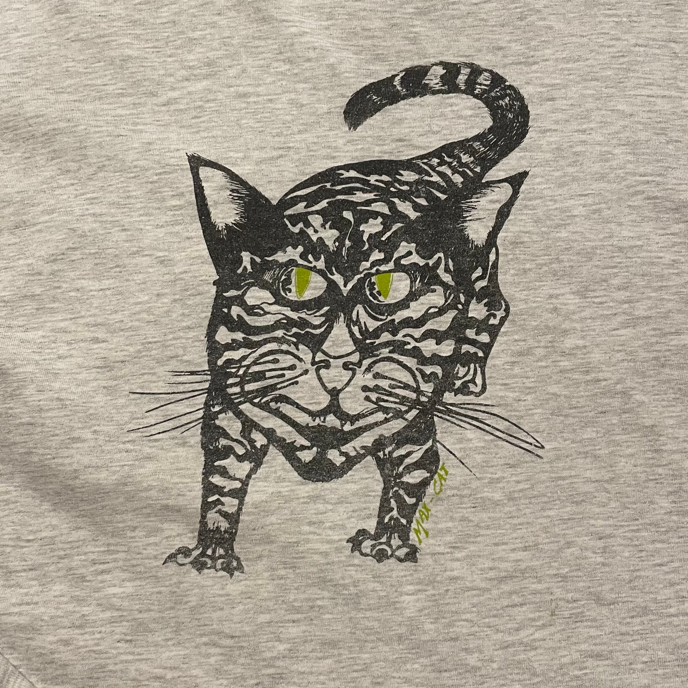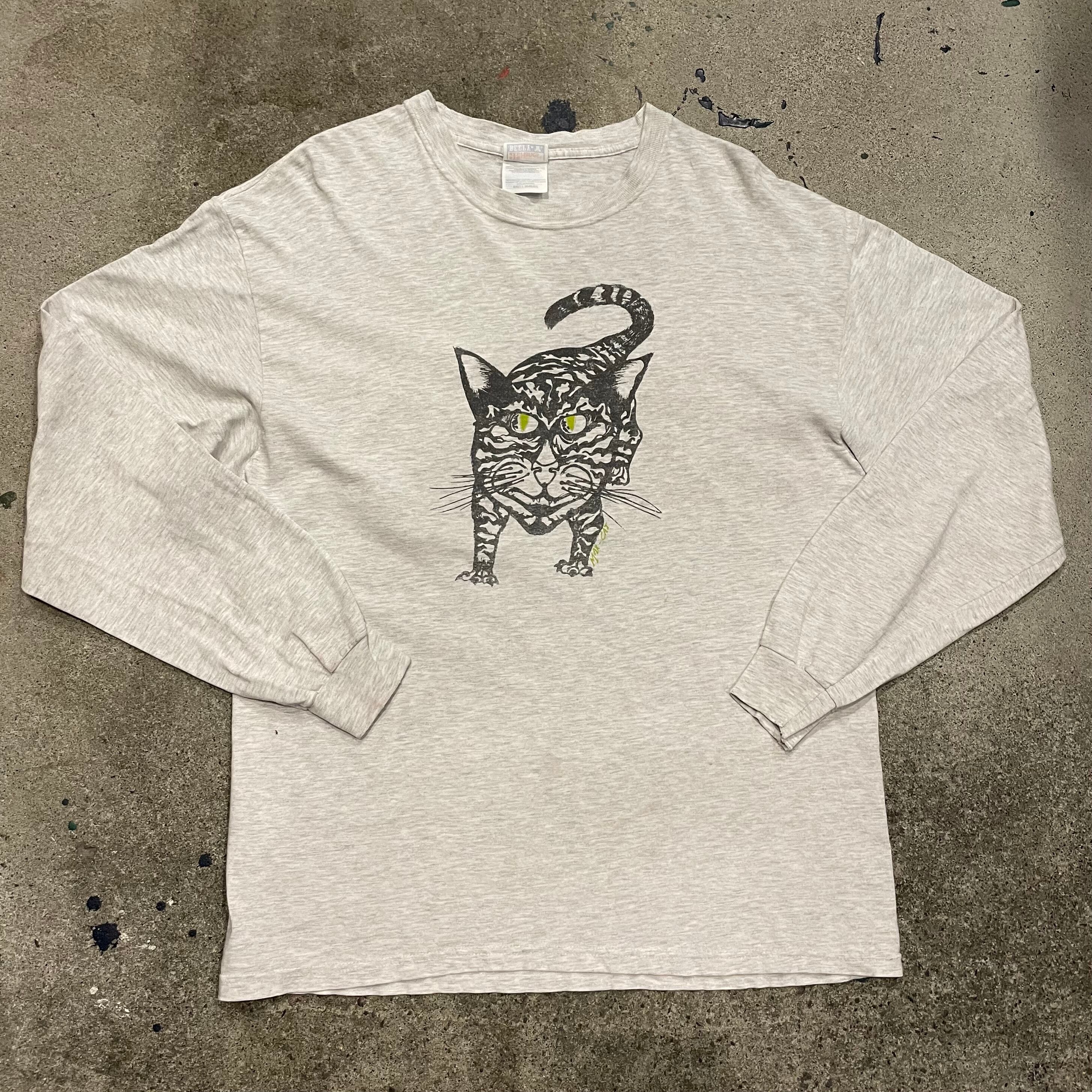 かわいくない顔のネコのイラストがとても良い雰囲気のロンTです。黄緑の目でにやっと笑っている感じがやや不気味てすが、かわいくないところがポイントです。