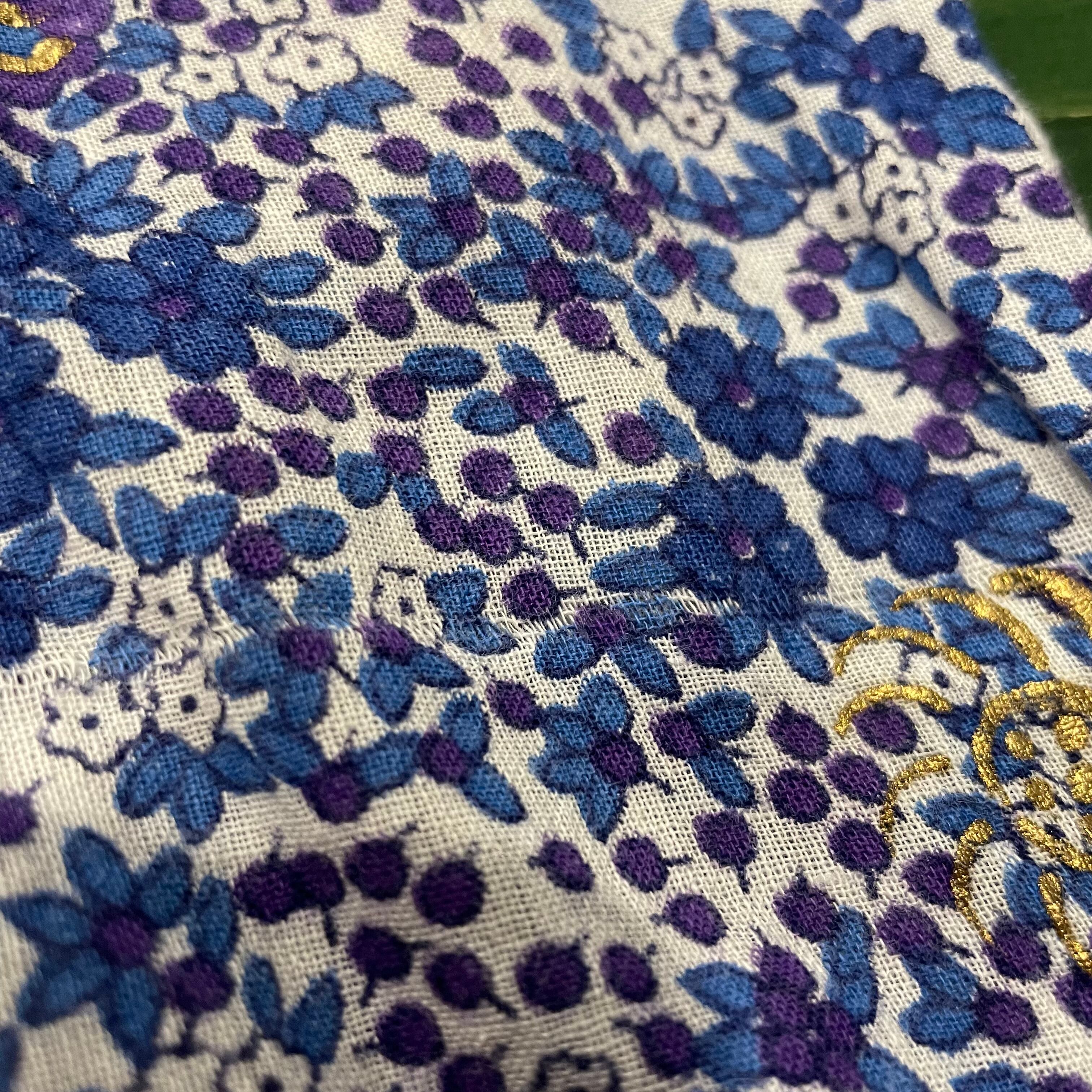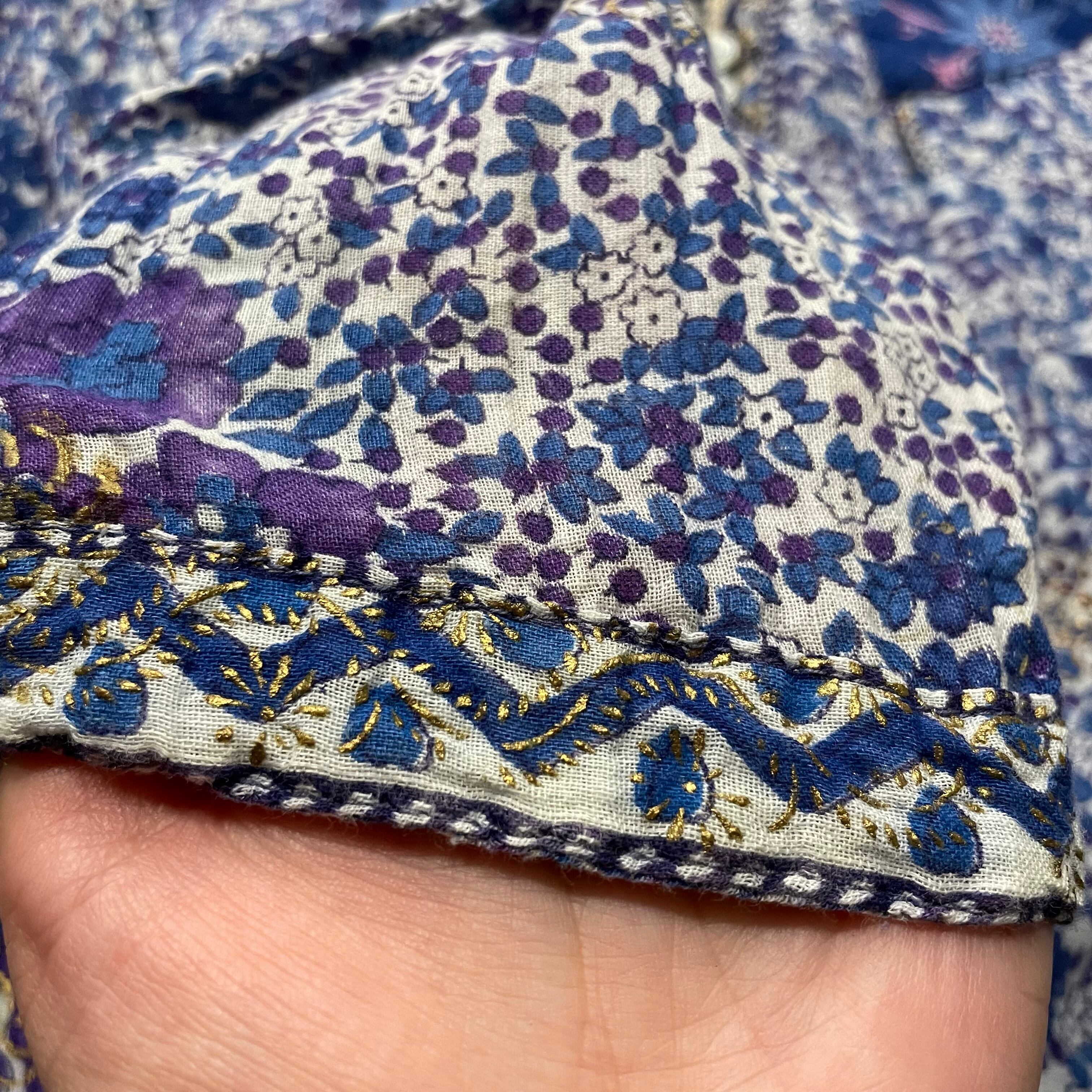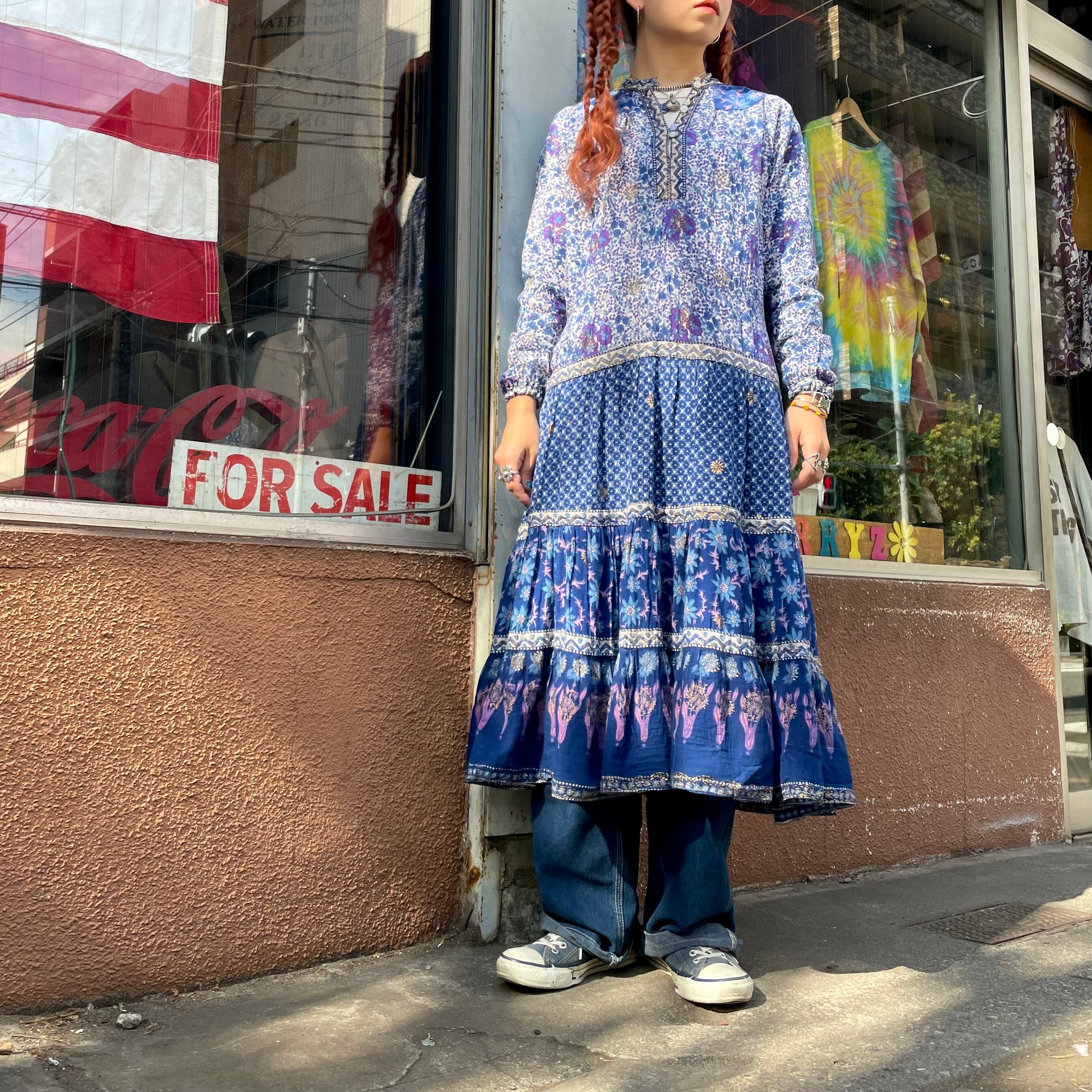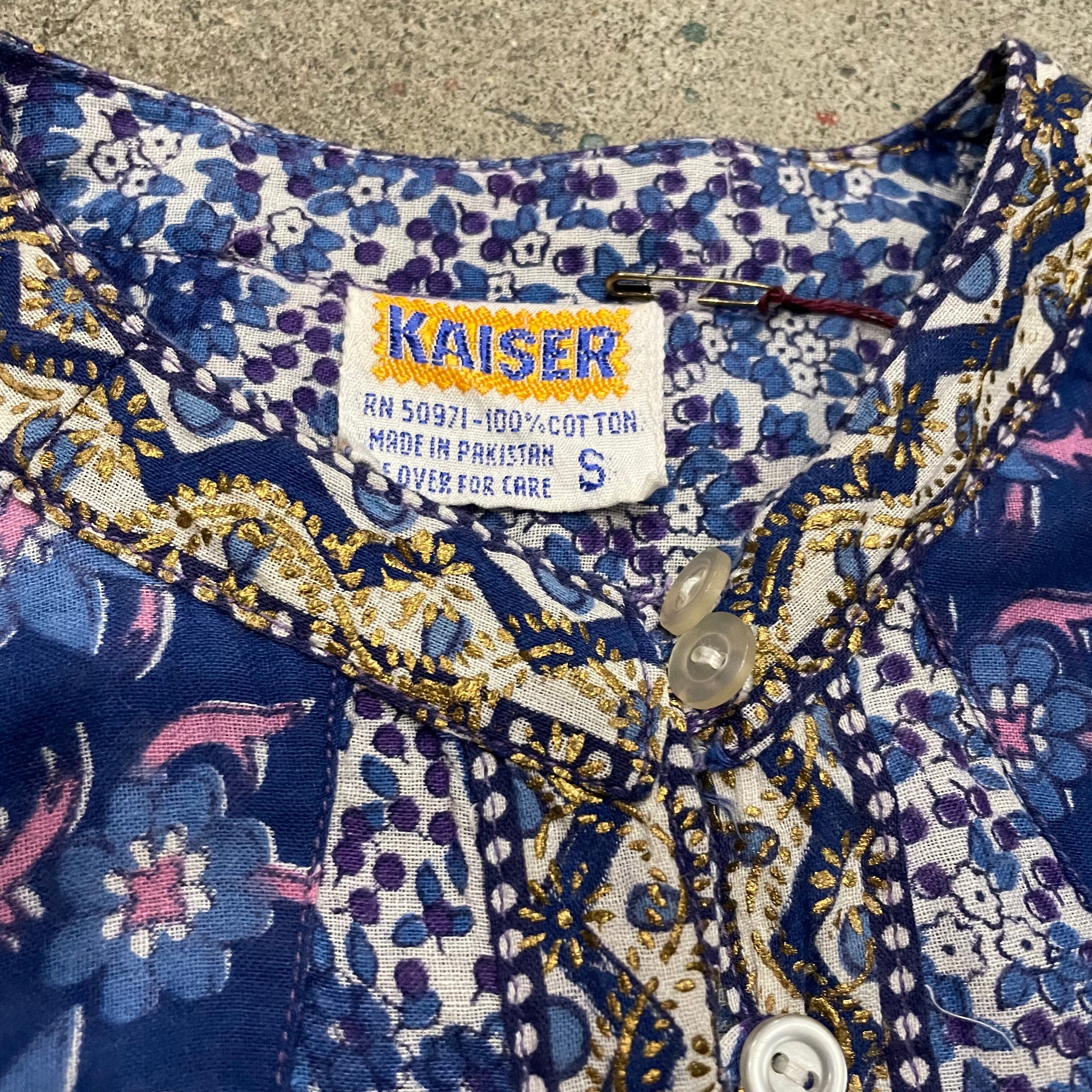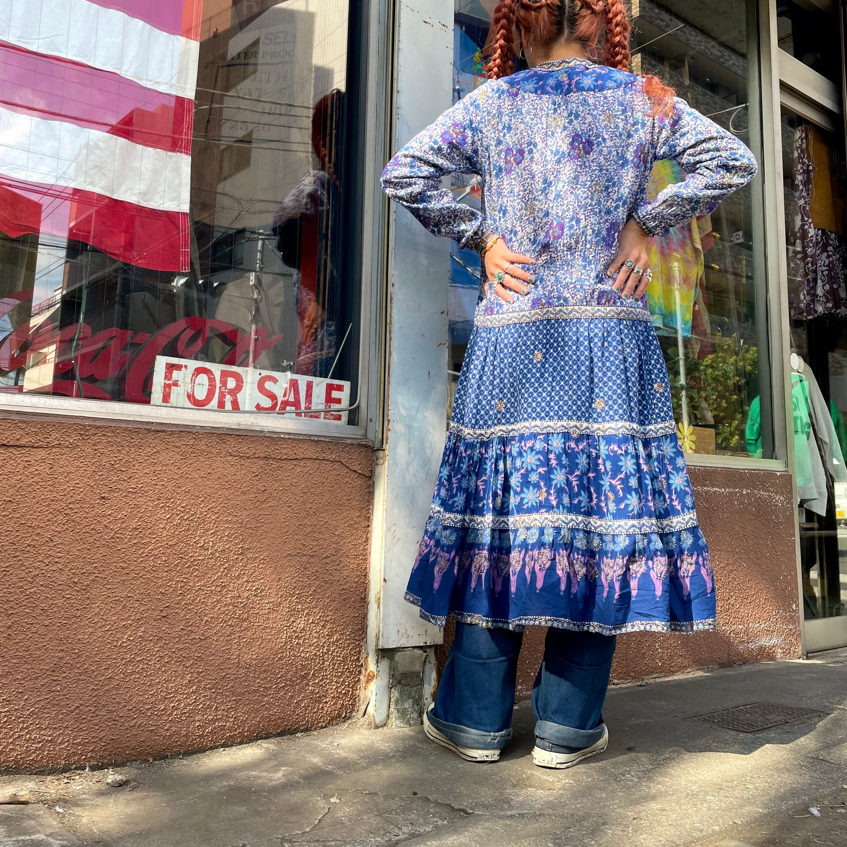70年代ごろのパキスタンコットンのワンピースです。ガーゼのような薄手のコットンでブルー系の爽やかな色味とすっきりしたシルエットがとても素敵な一着です。ゴールドスタンプもいろんなパターンのものが押されておりさりげなくキラッと光って素敵です。