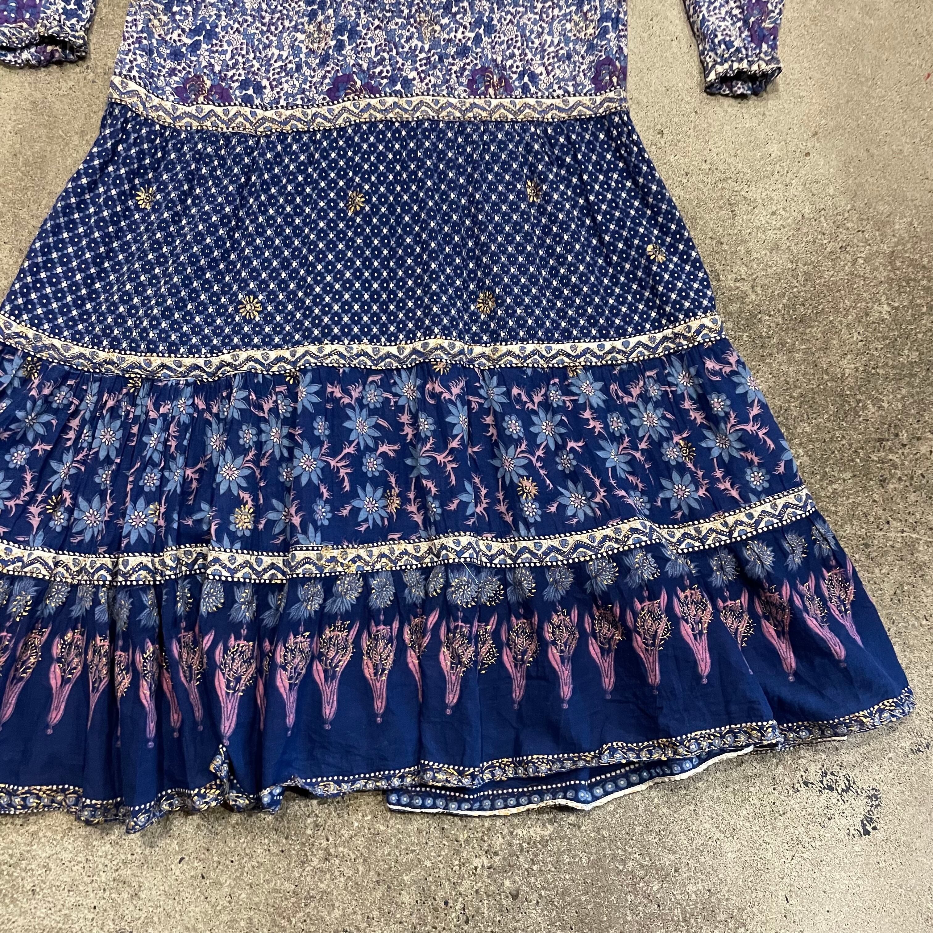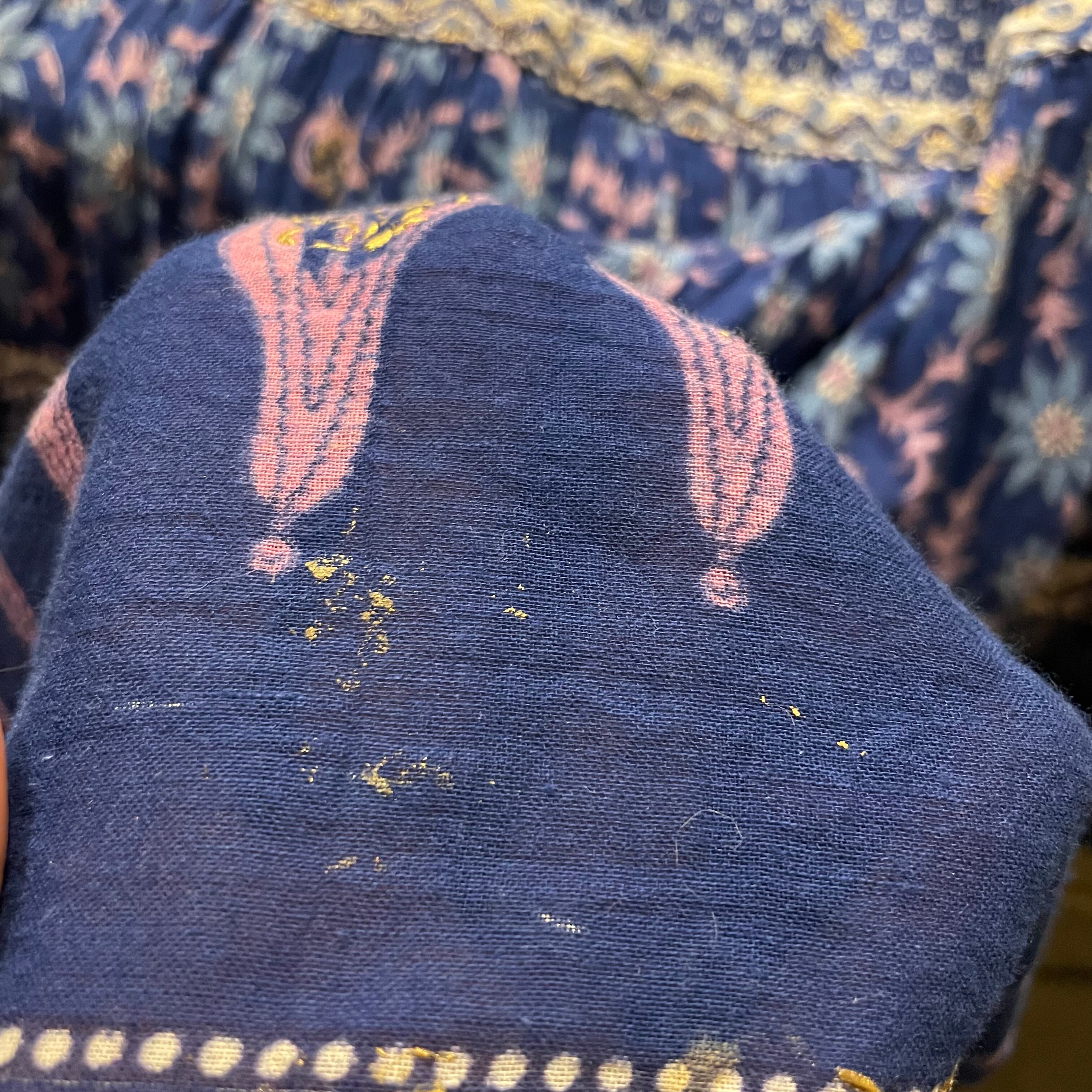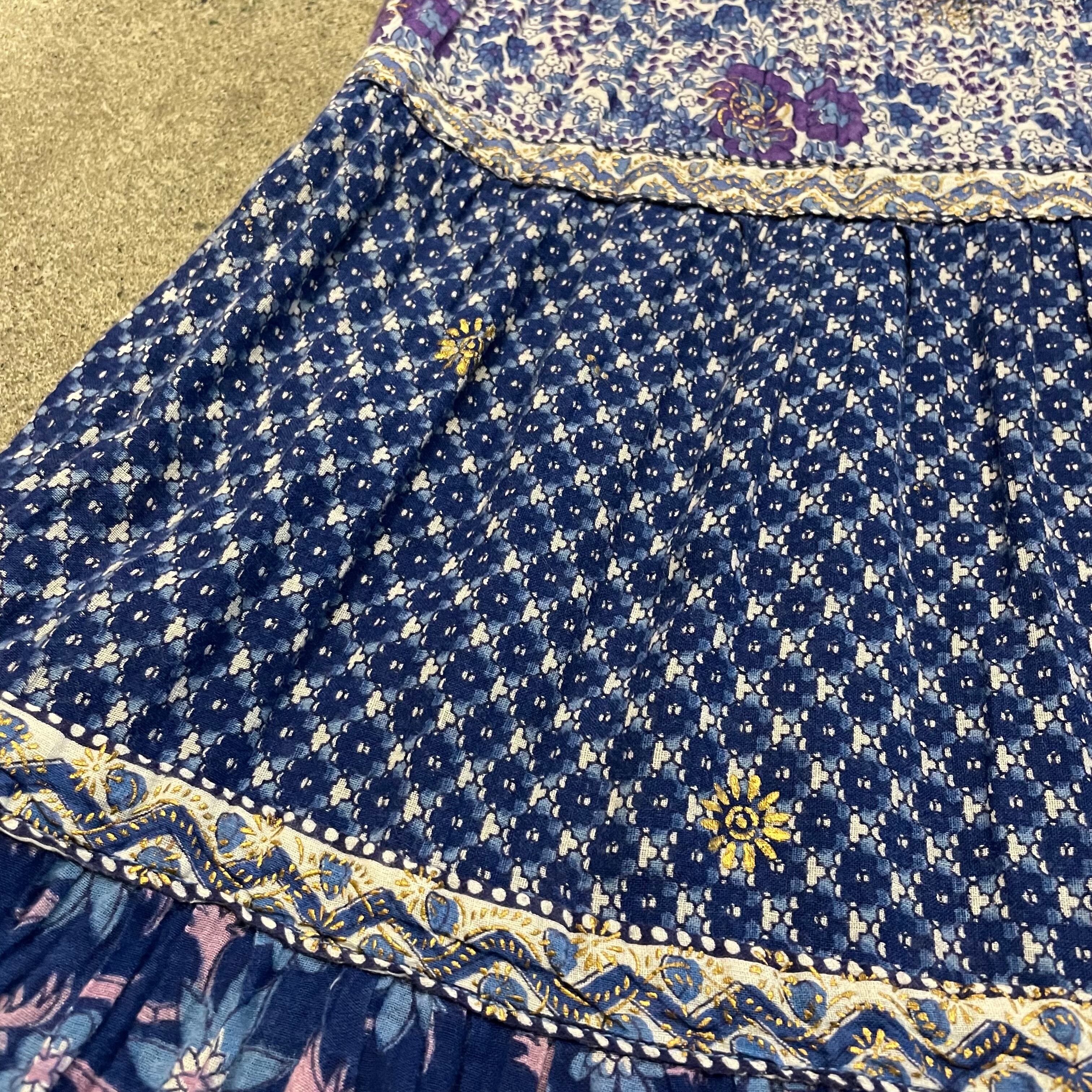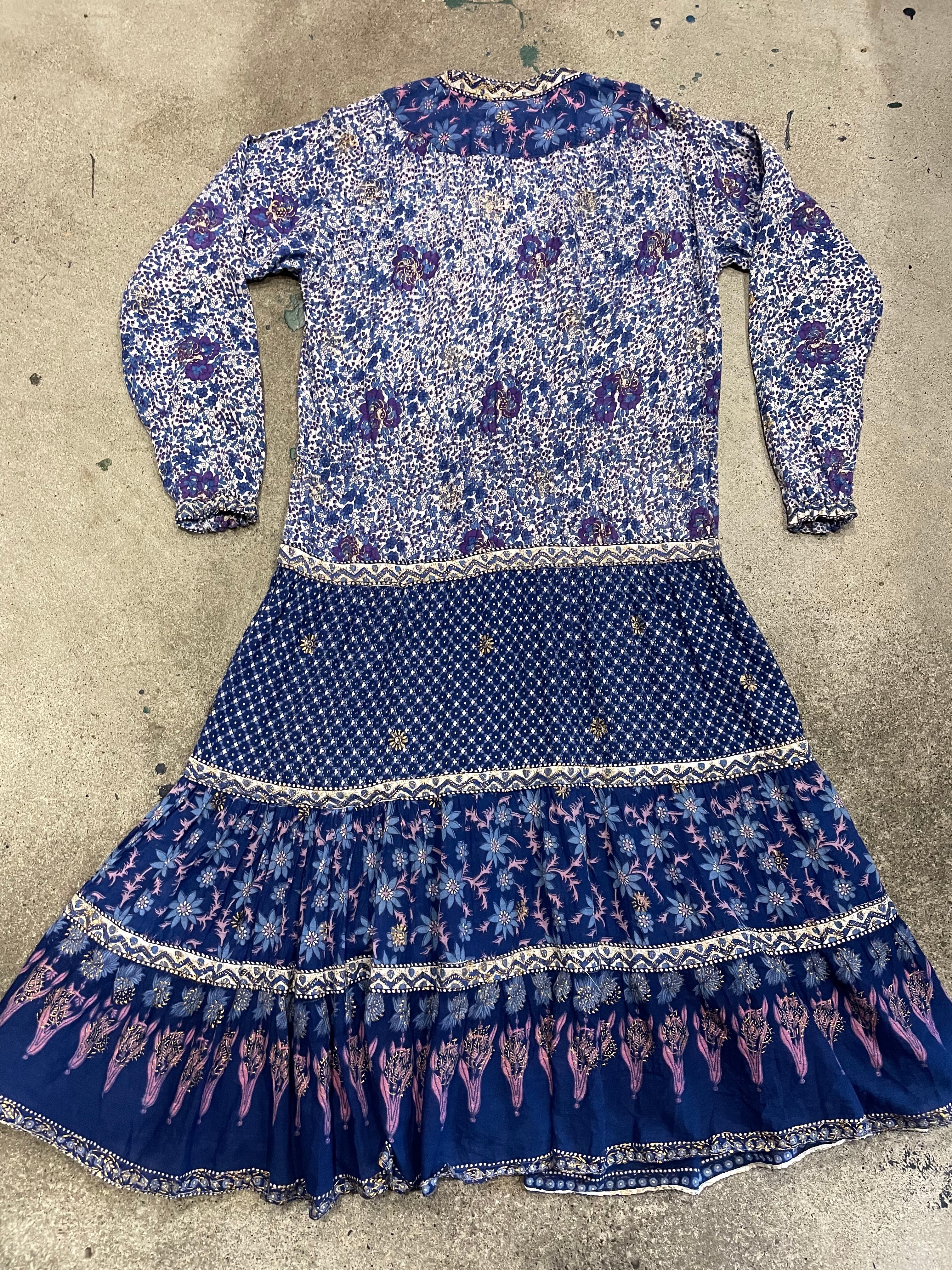 70年代ごろのパキスタンコットンのワンピースです。ガーゼのような薄手のコットンでブルー系の爽やかな色味とすっきりしたシルエットがとても素敵な一着です。ゴールドスタンプもいろんなパターンのものが押されておりさりげなくキラッと光って素敵です。