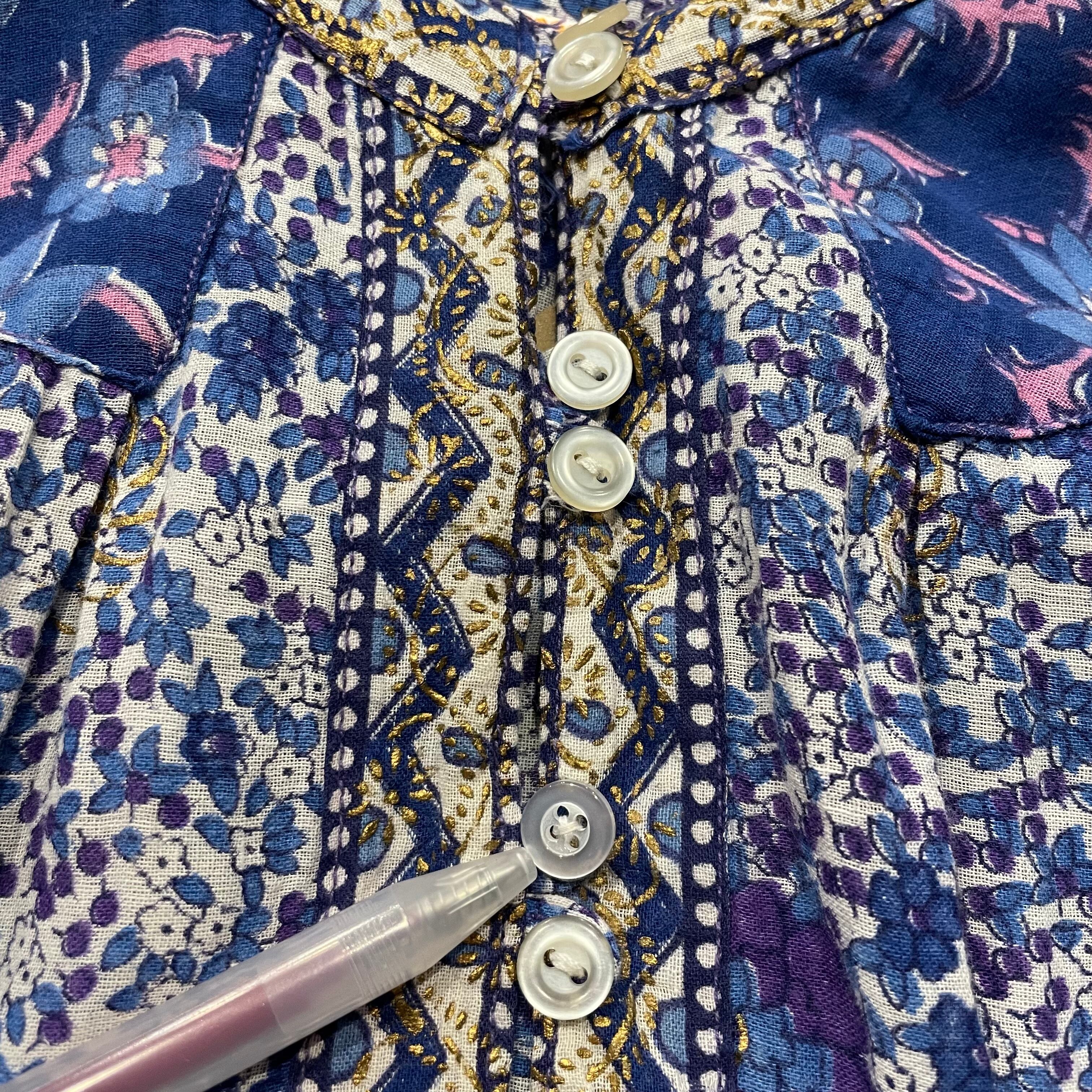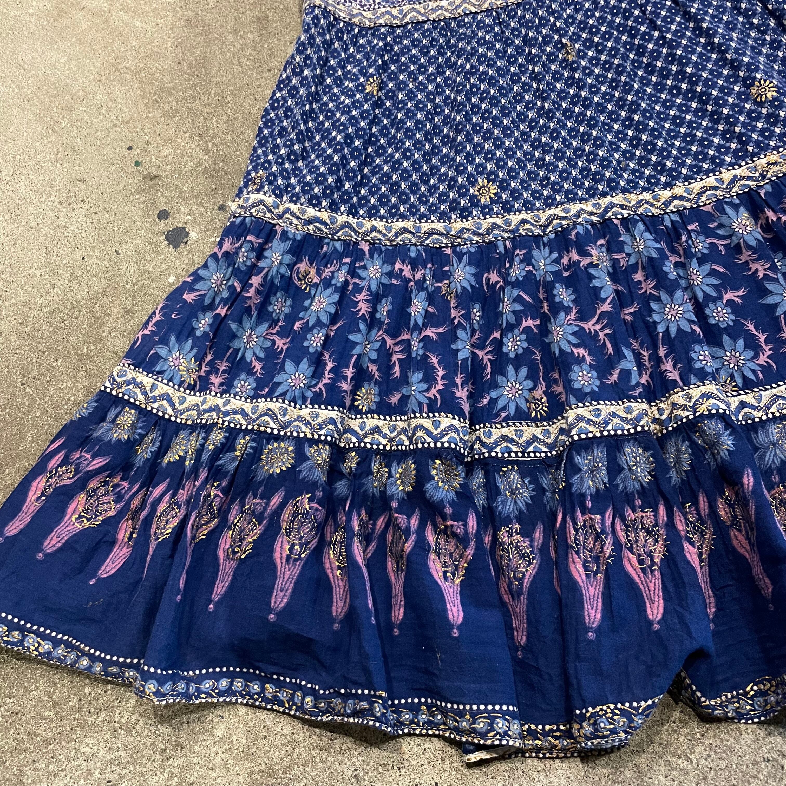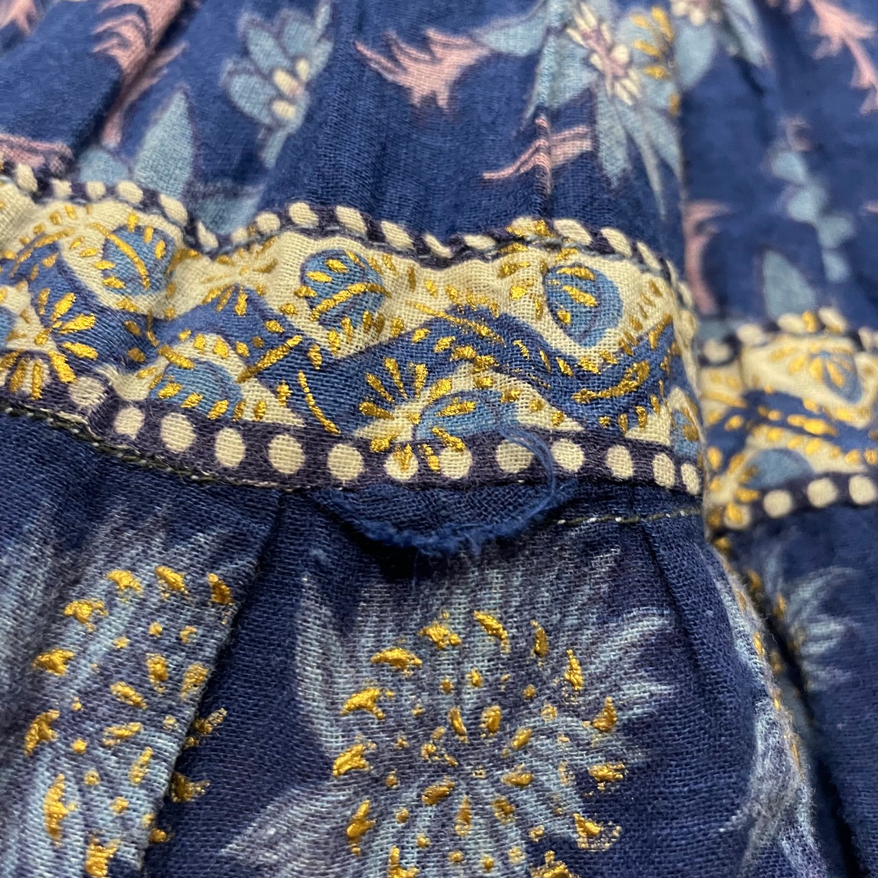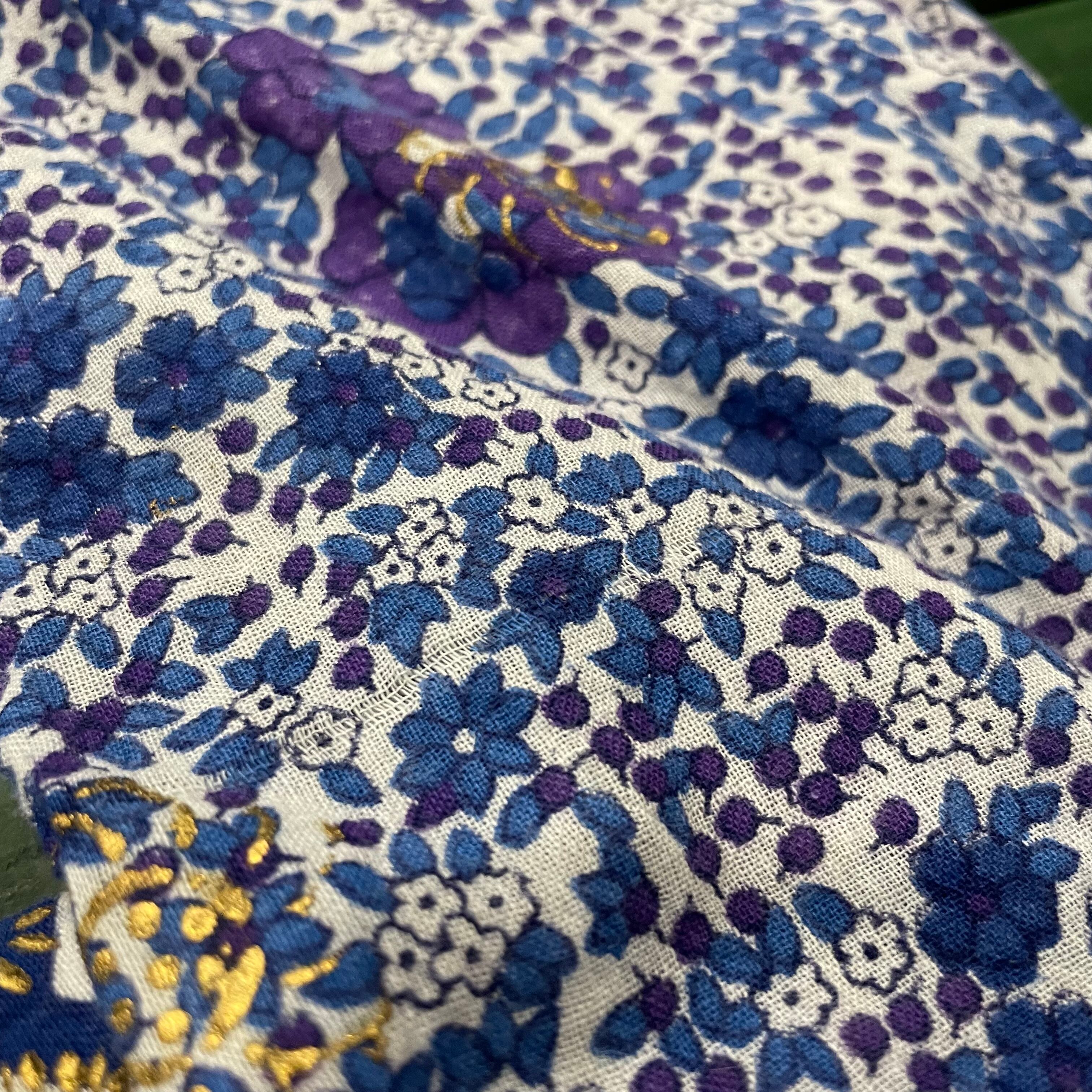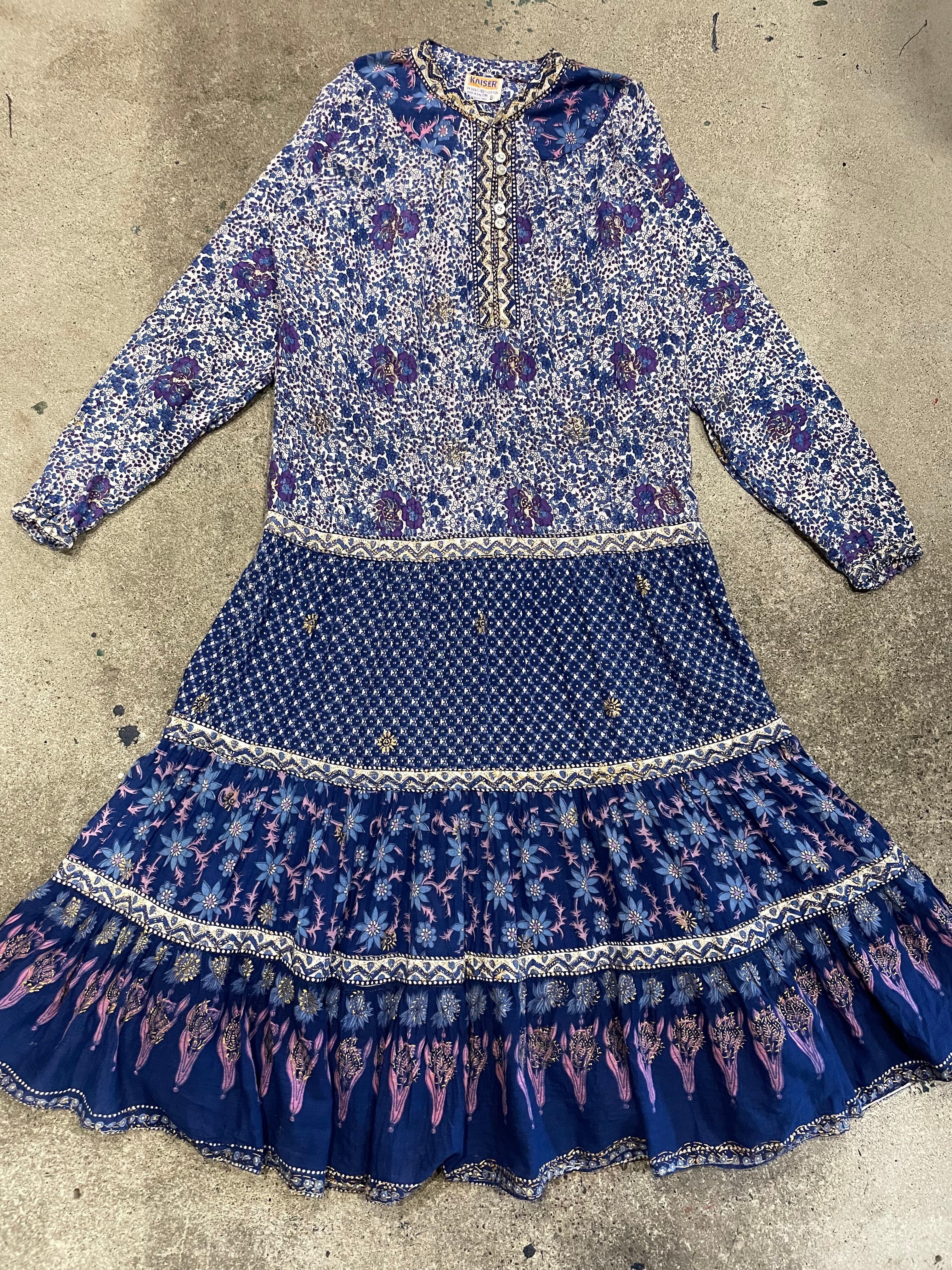 70年代ごろのパキスタンコットンのワンピースです。ガーゼのような薄手のコットンでブルー系の爽やかな色味とすっきりしたシルエットがとても素敵な一着です。ゴールドスタンプもいろんなパターンのものが押されておりさりげなくキラッと光って素敵です。