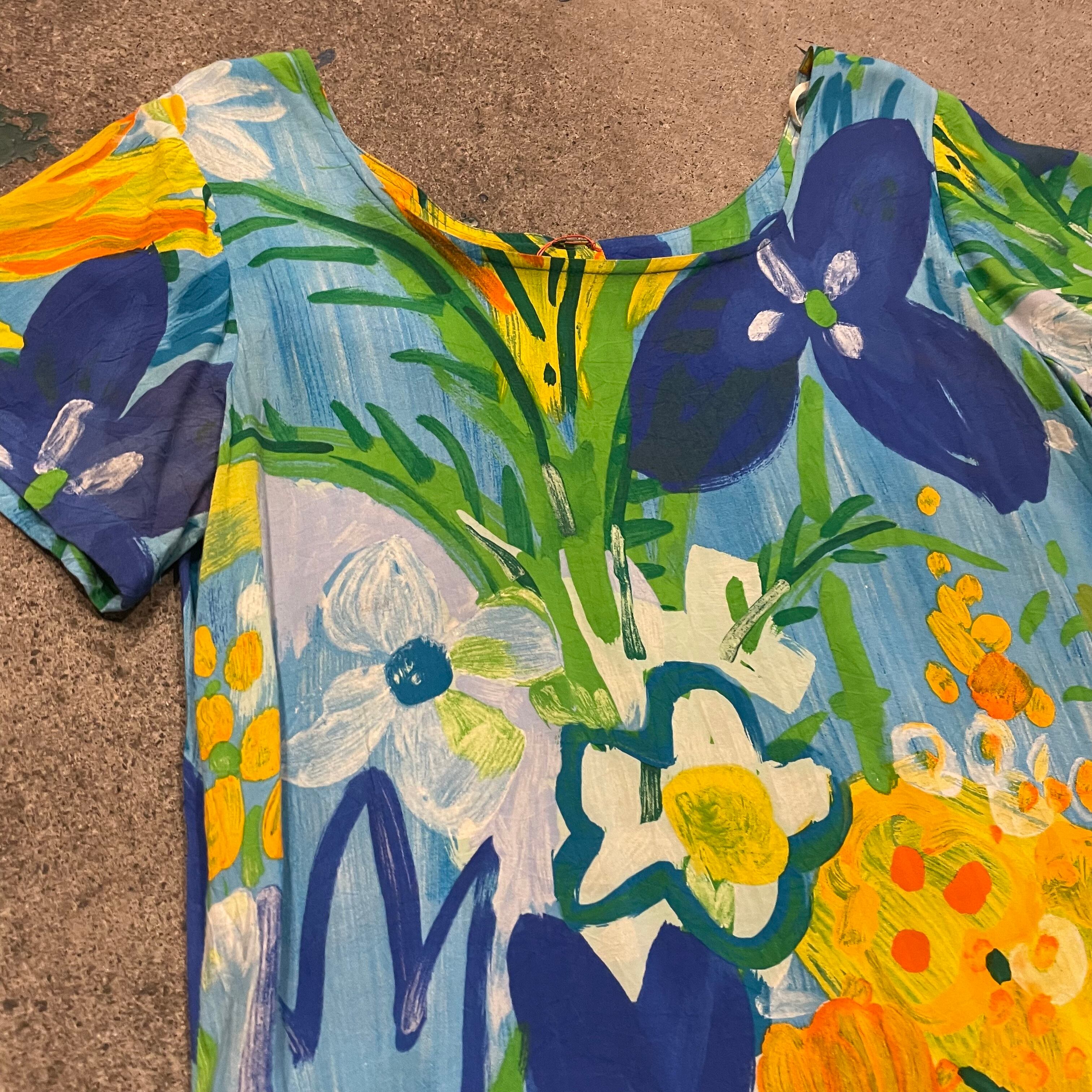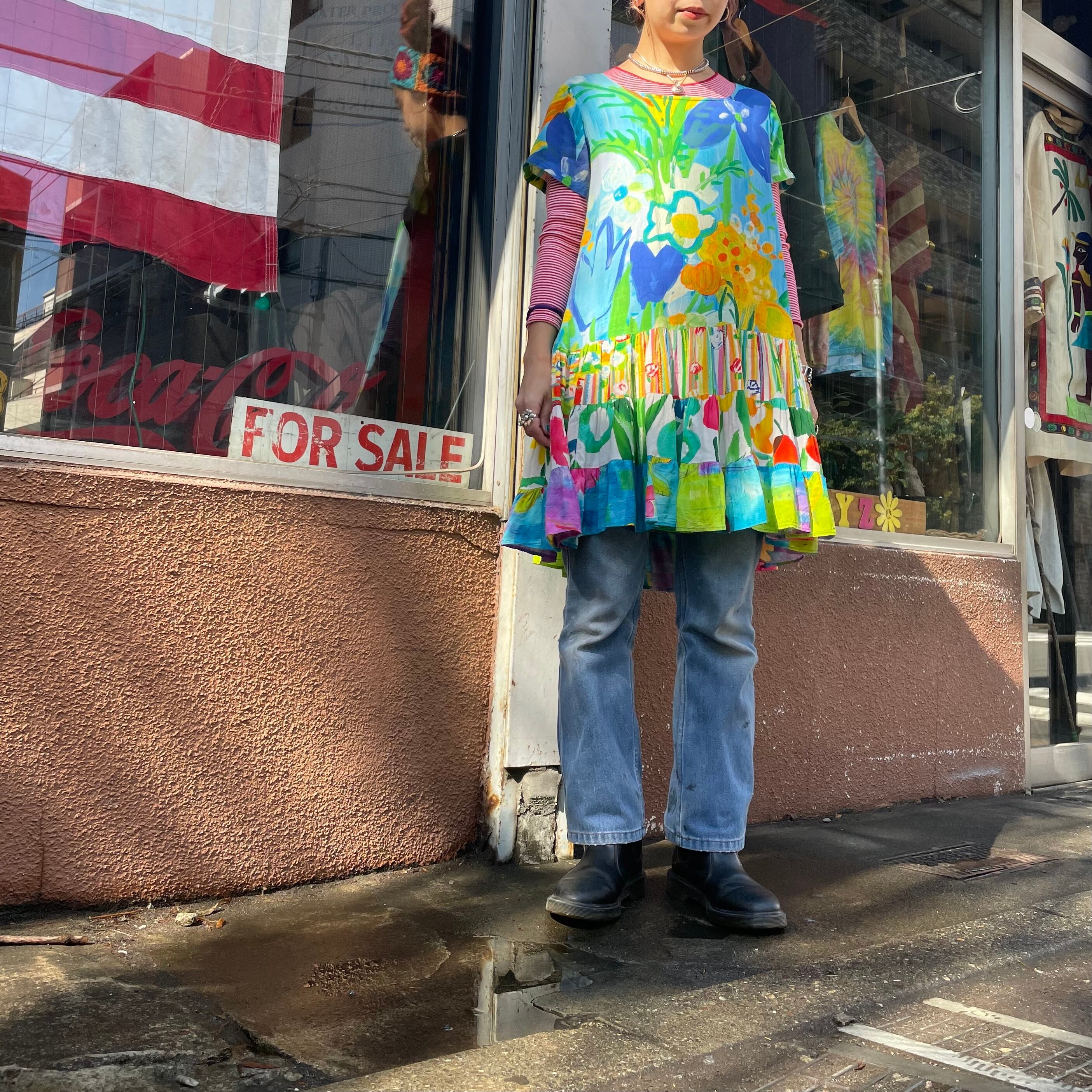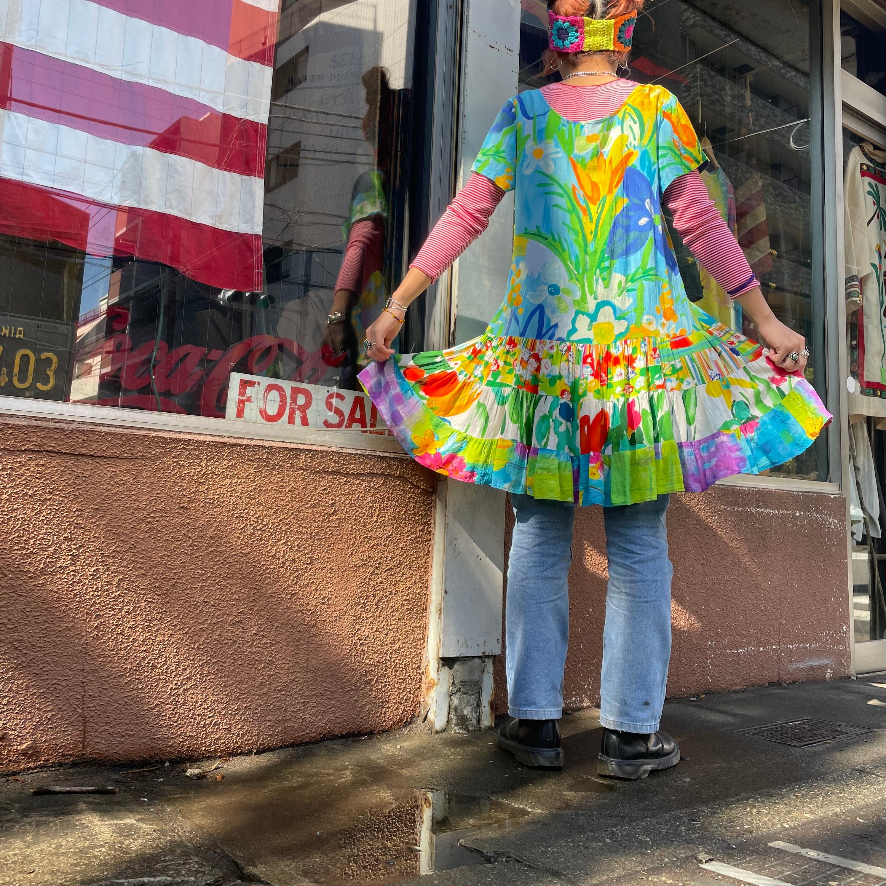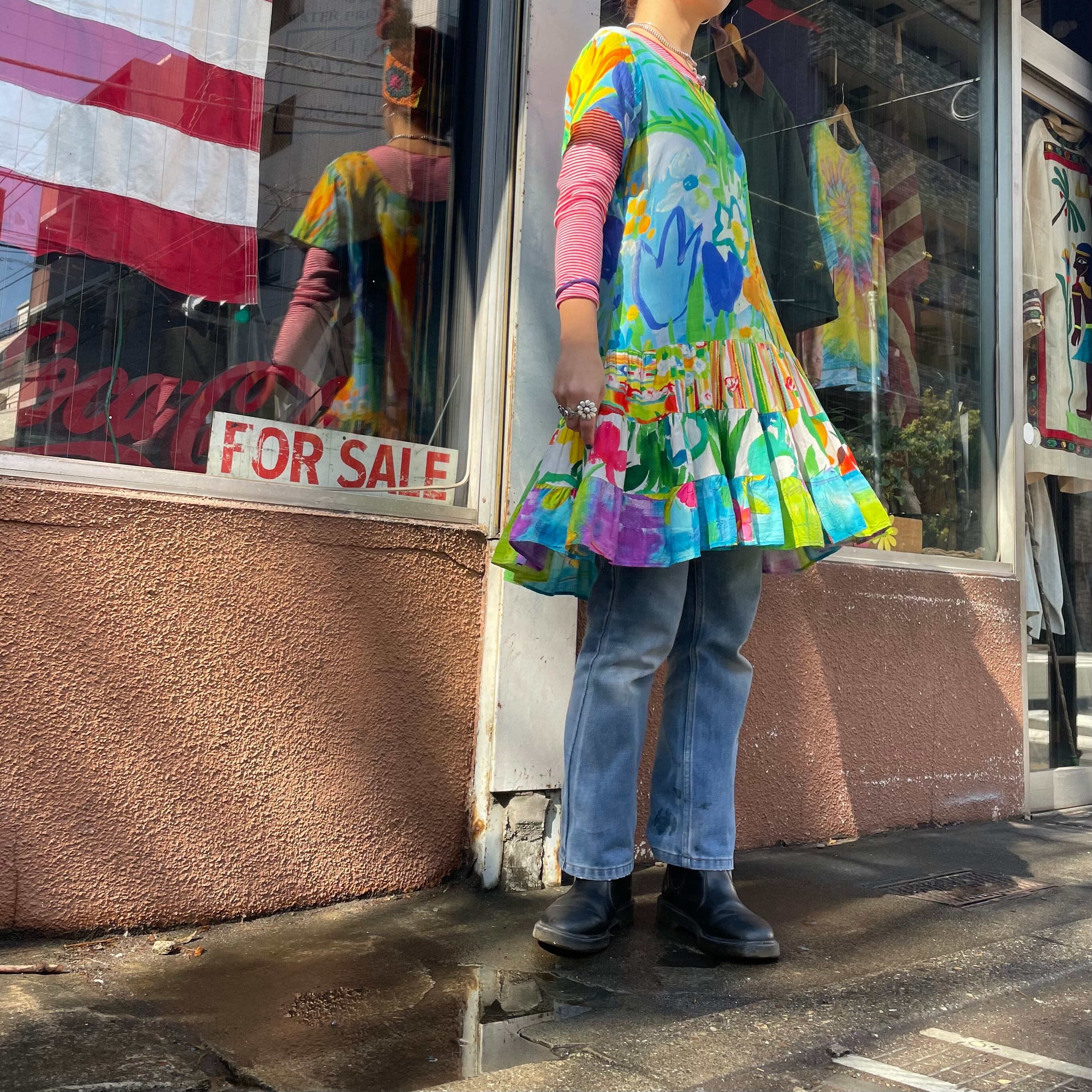 絵の具で描いたような花柄がとてもかわいいワンピースです。