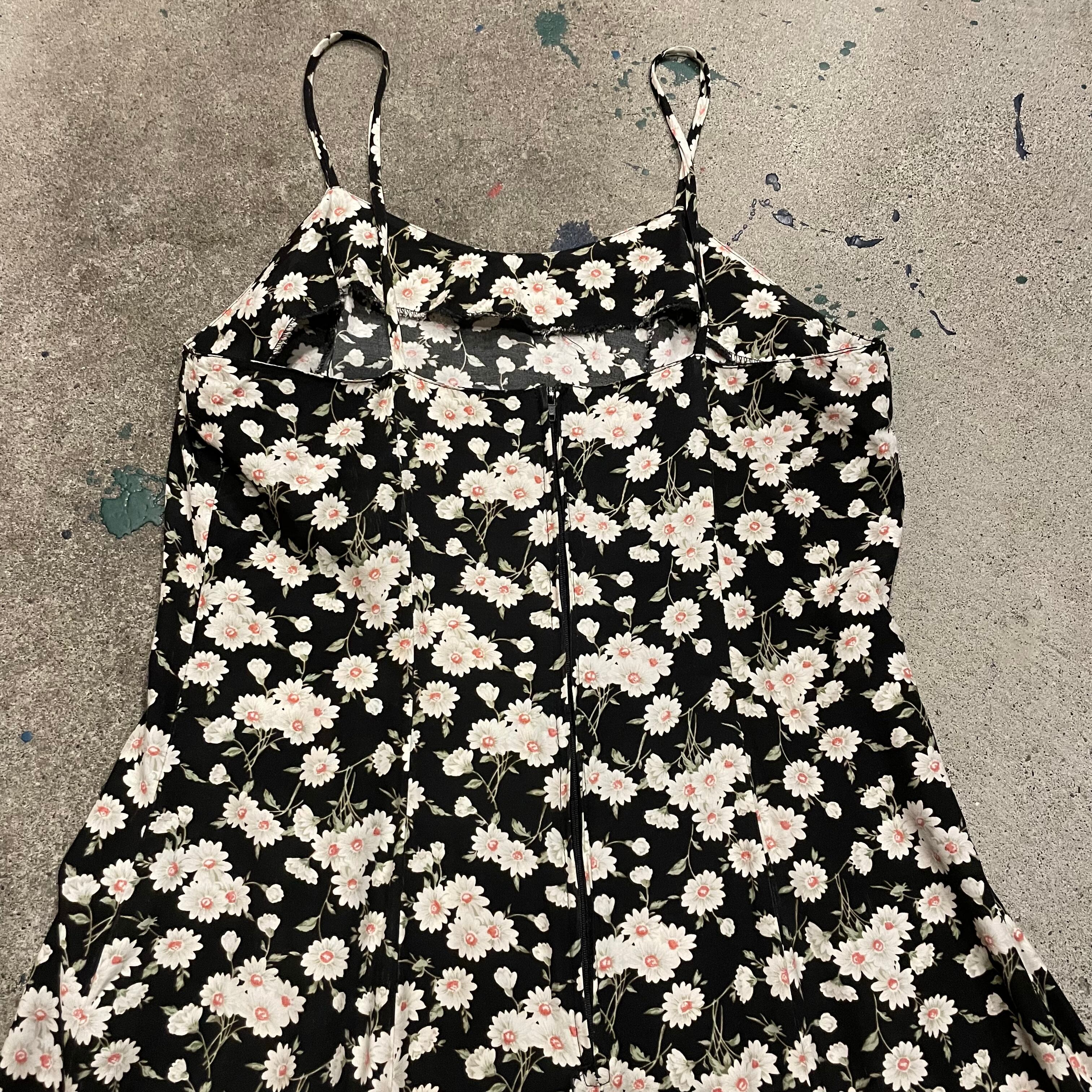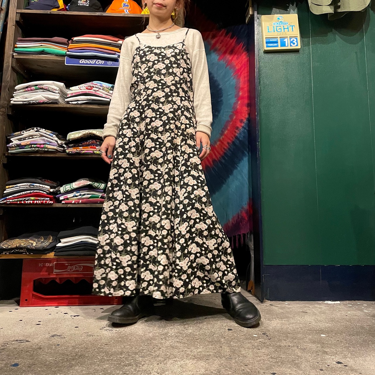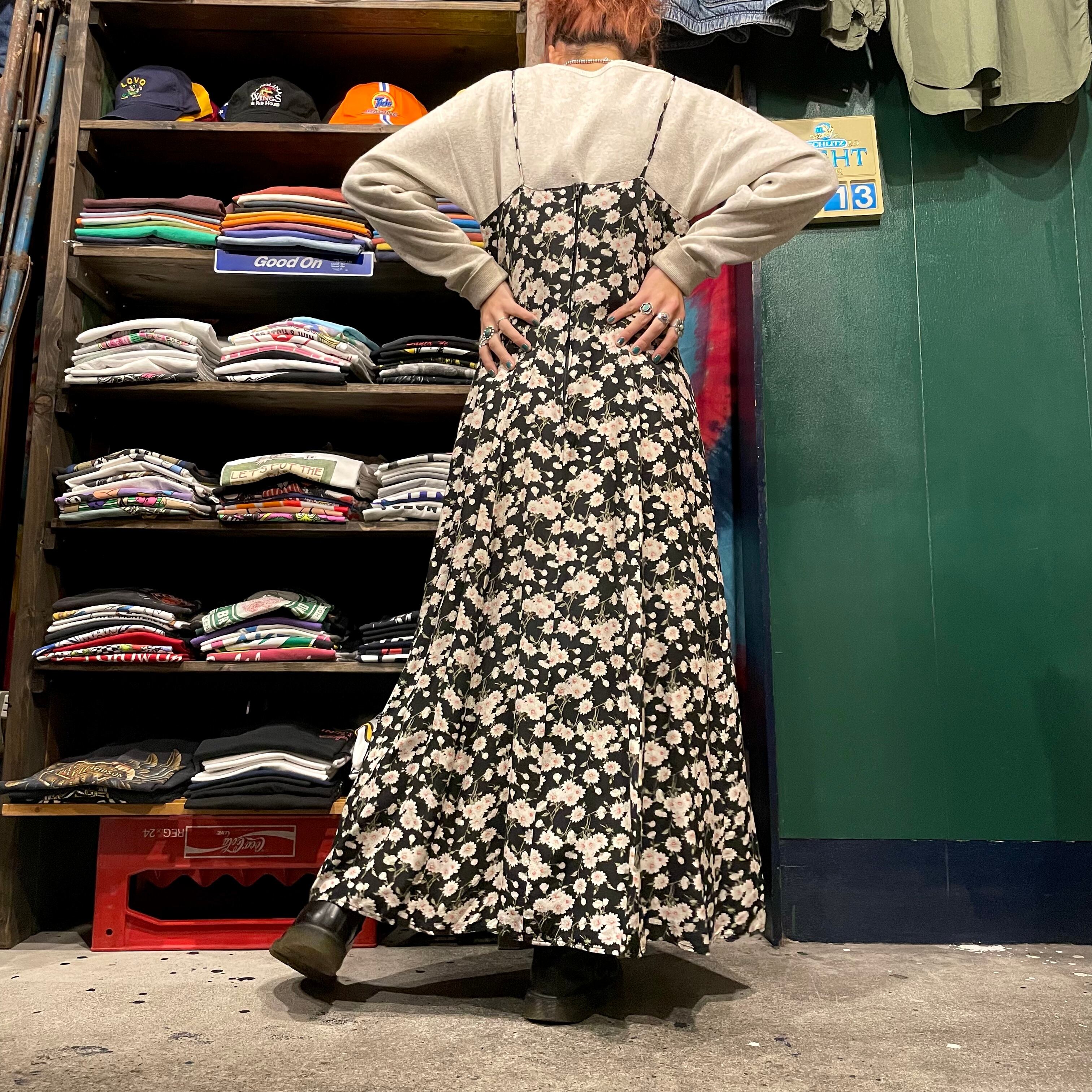 黒地に白い可憐な花柄がかわいいワンピースです。スカート部分がきれいに広がるシルエットも素敵ですし、キャミソールタイプで脇が広めですので中にいろいろ重ねられます。背中が広めに開いているのでバックプリントのあるTシャツなどを重ねて楽しみたいですね!