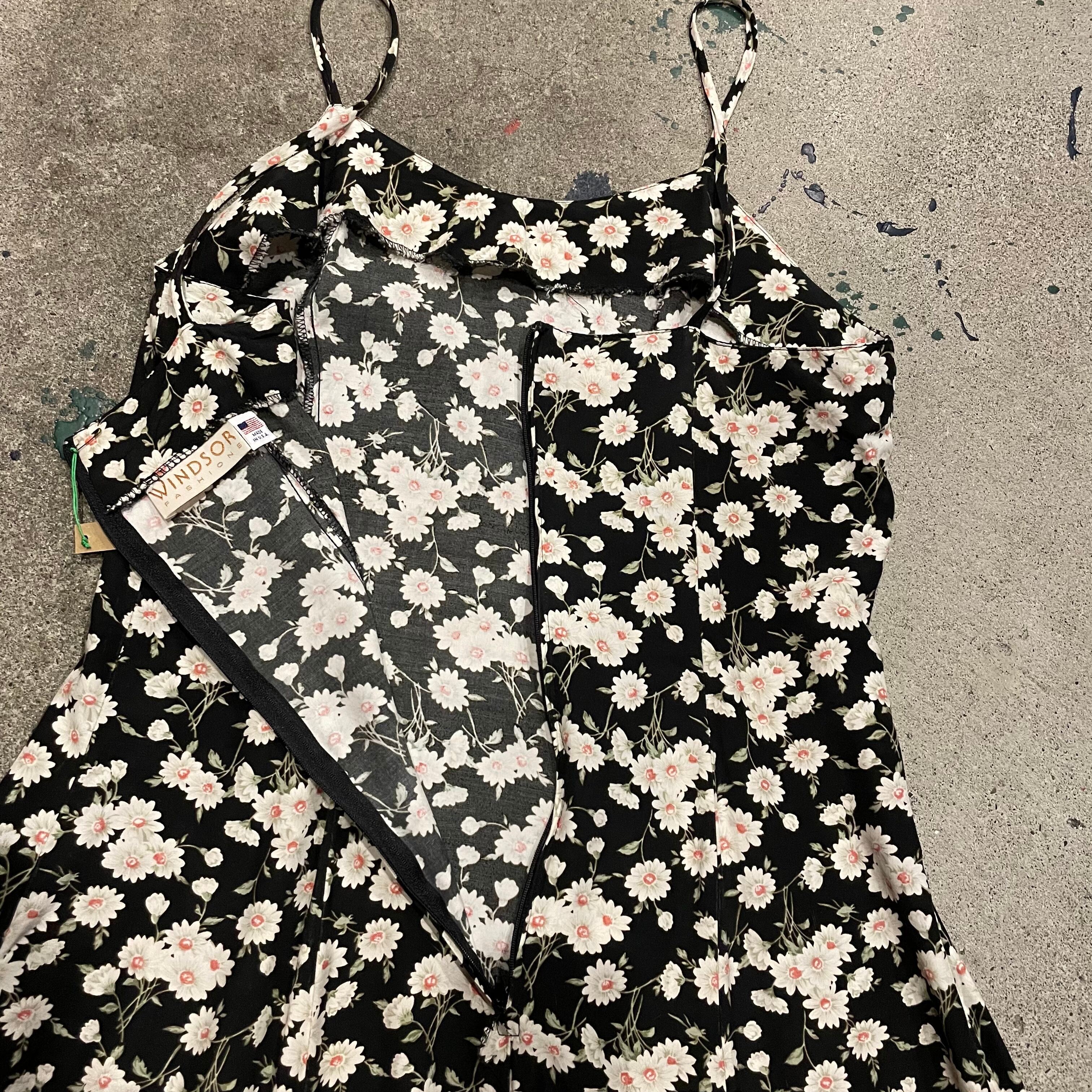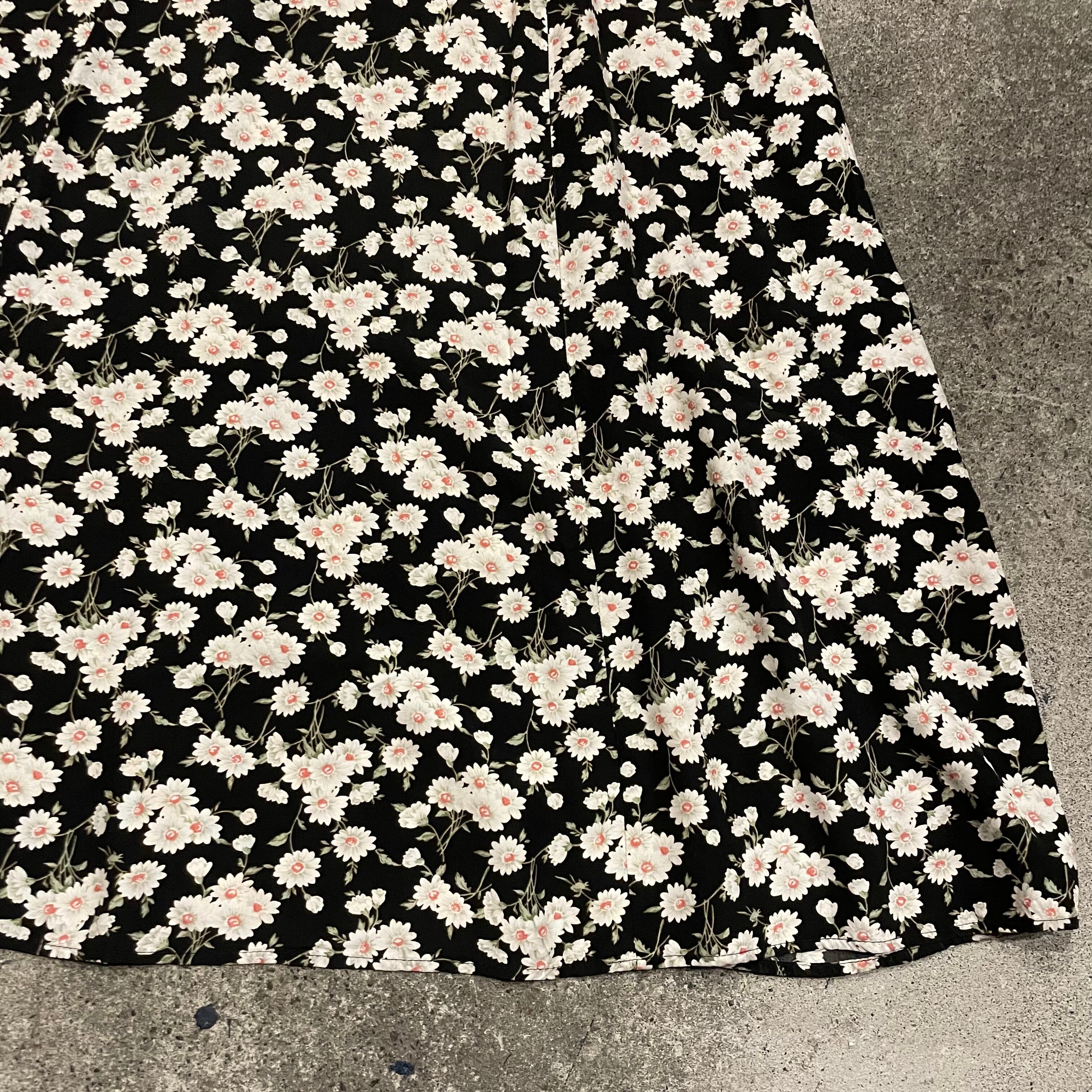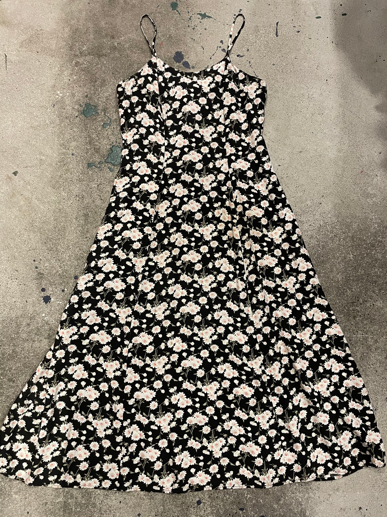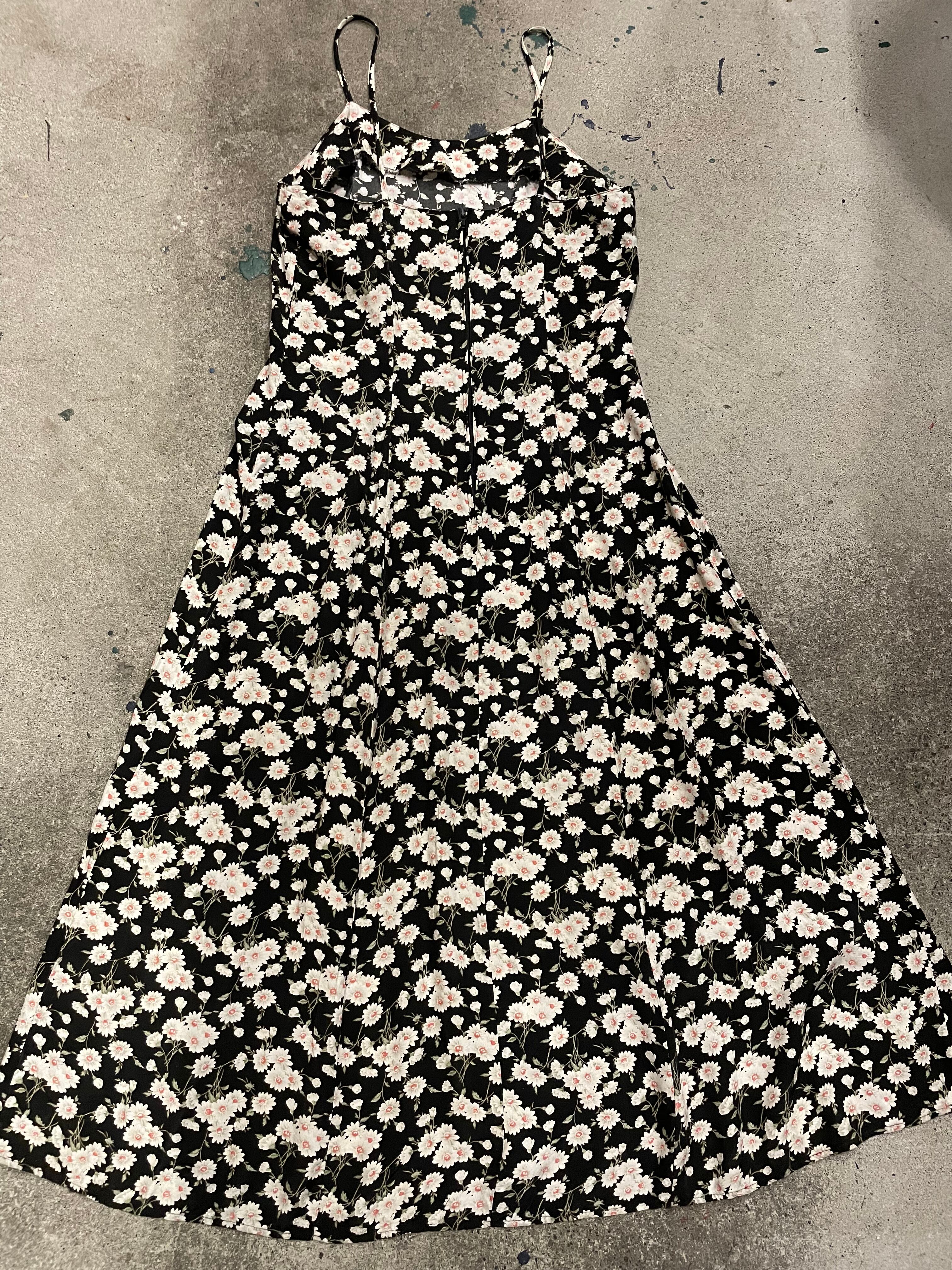 黒地に白い可憐な花柄がかわいいワンピースです。スカート部分がきれいに広がるシルエットも素敵ですし、キャミソールタイプで脇が広めですので中にいろいろ重ねられます。背中が広めに開いているのでバックプリントのあるTシャツなどを重ねて楽しみたいですね!