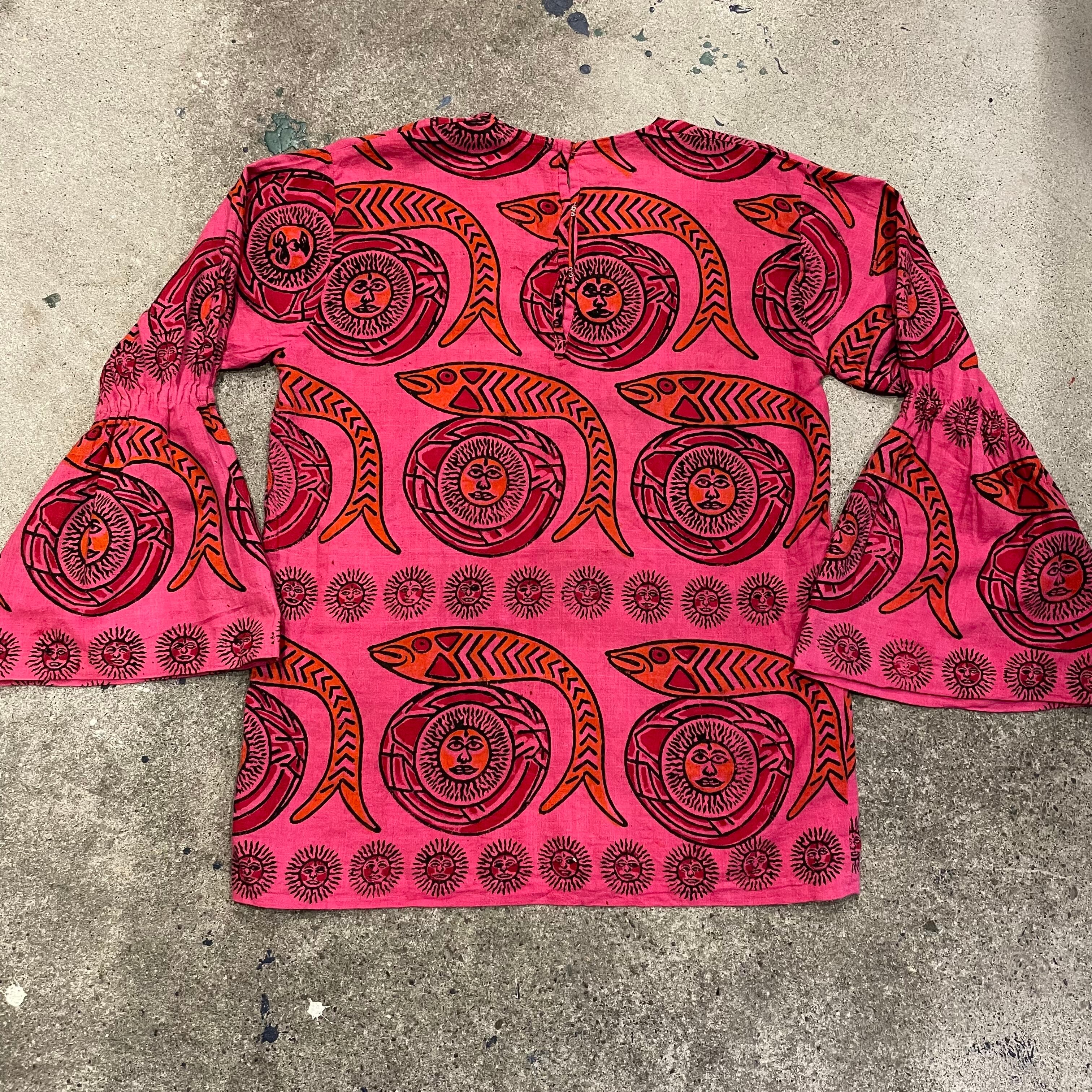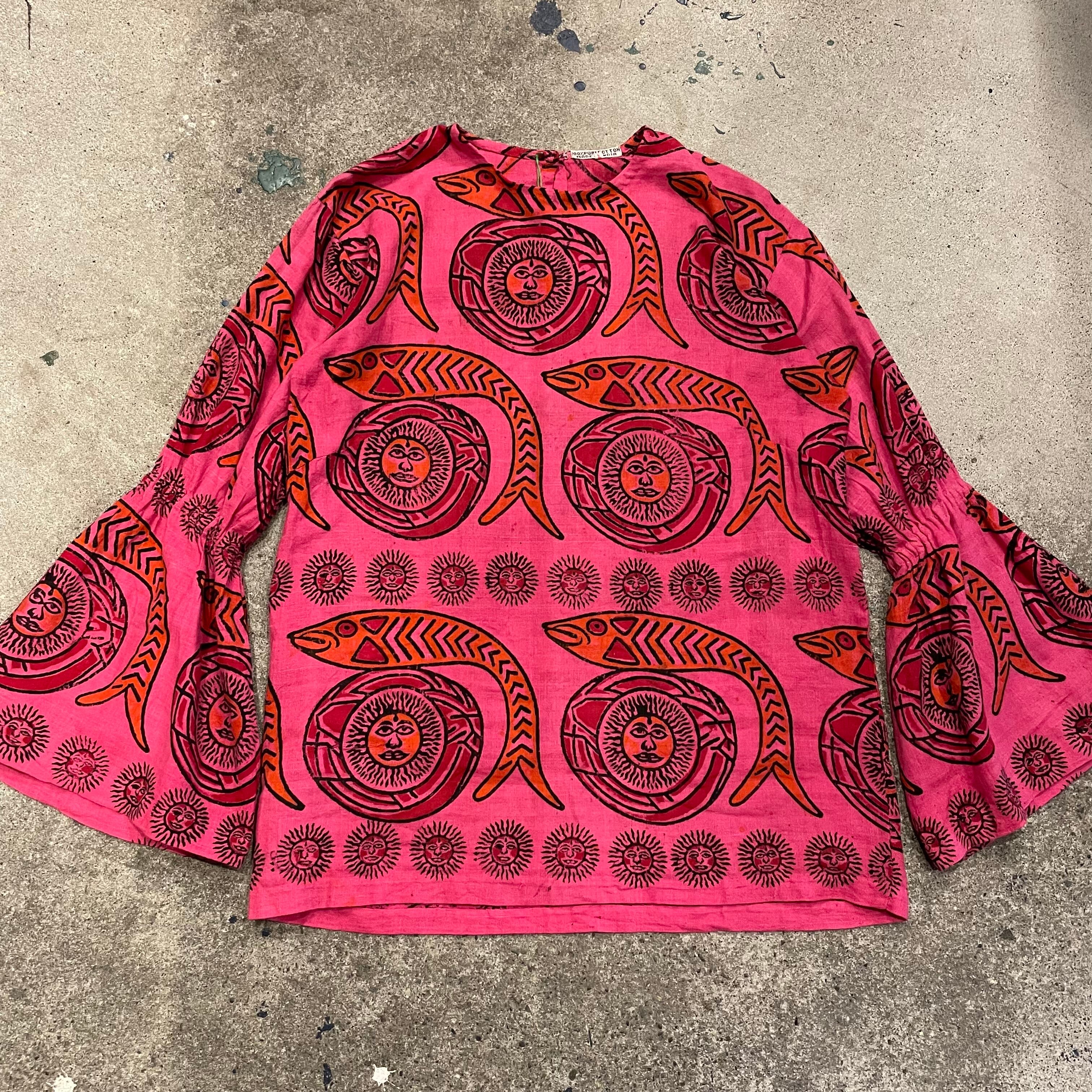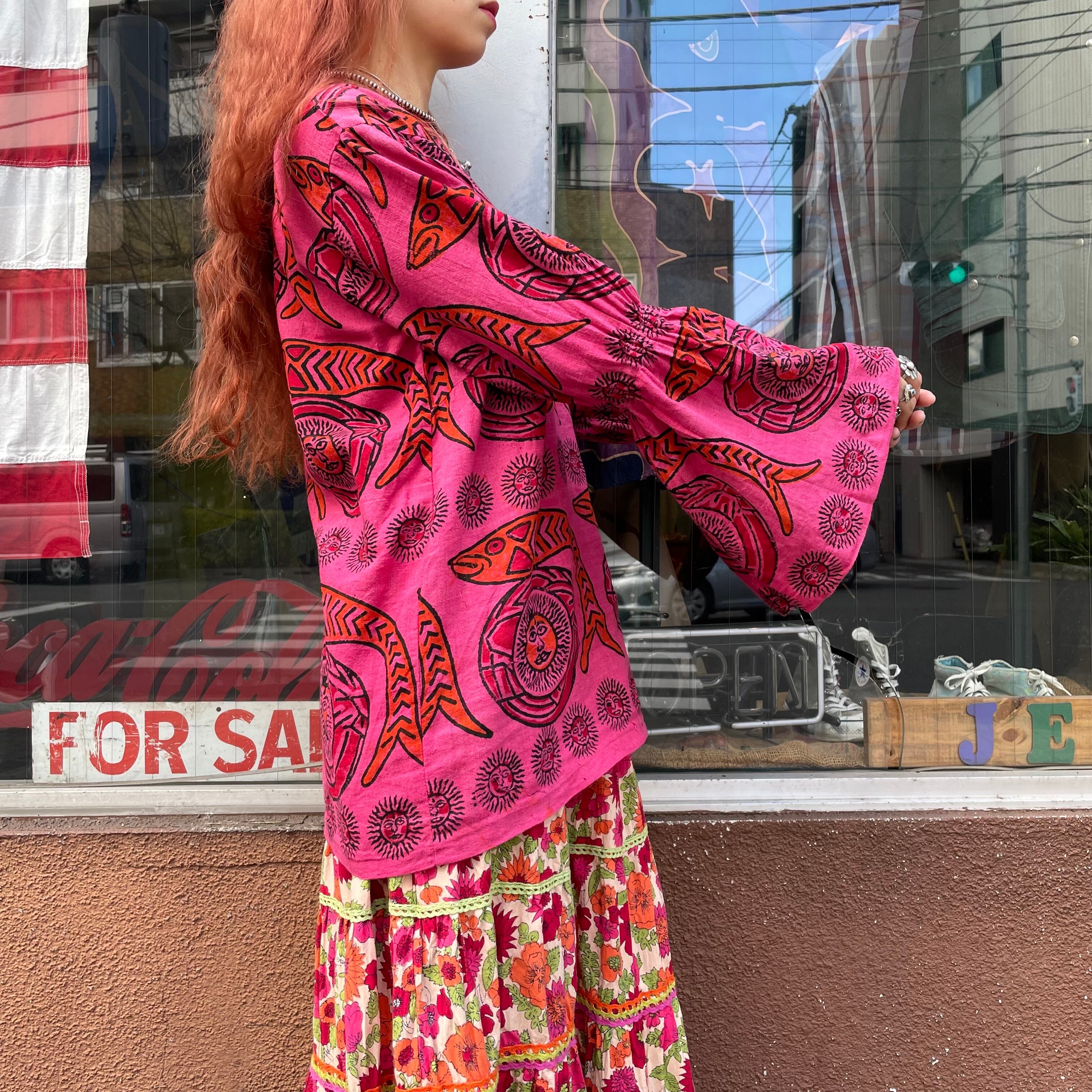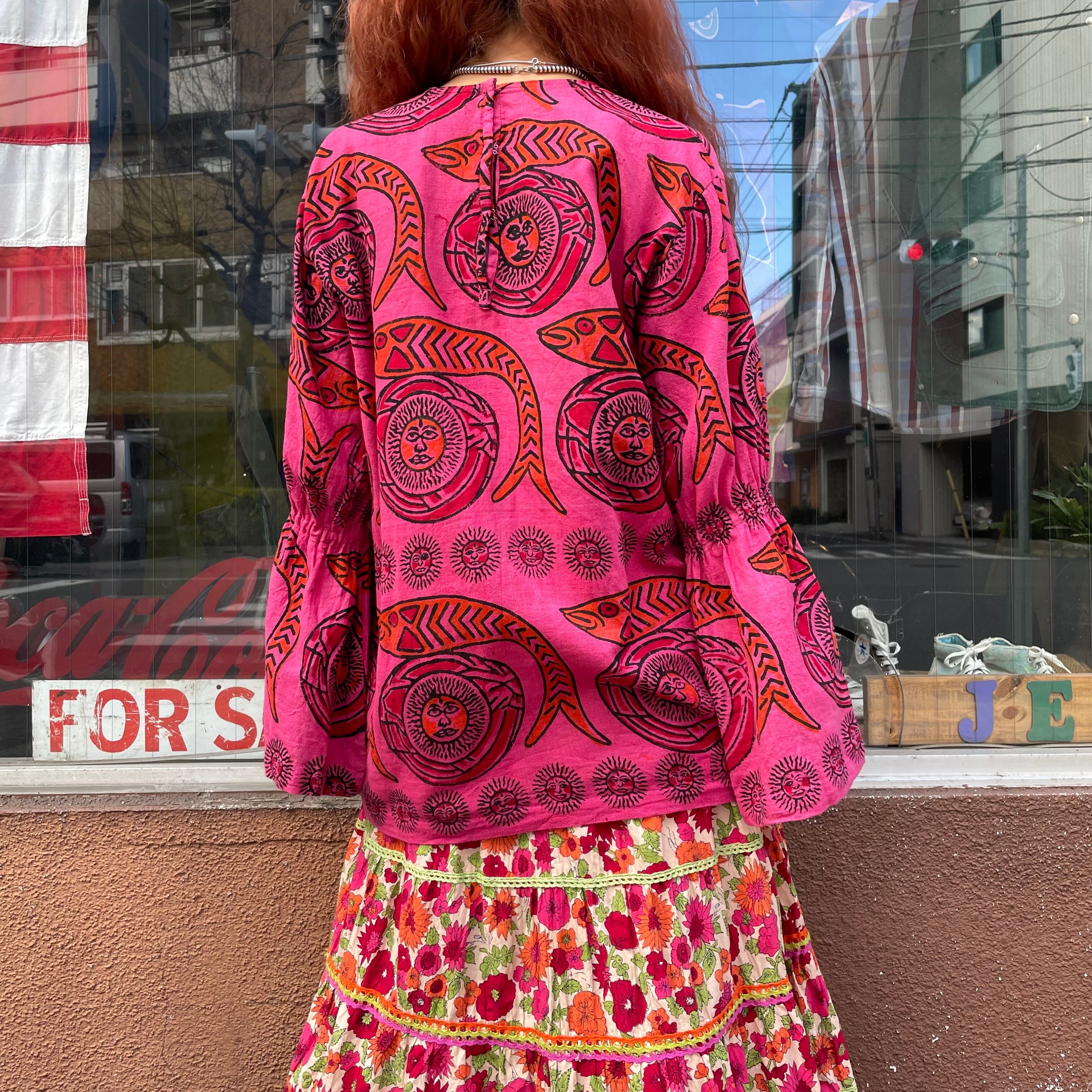 濃いピンク色に太陽と魚の模様がヘンテコでかわいいトップスです。