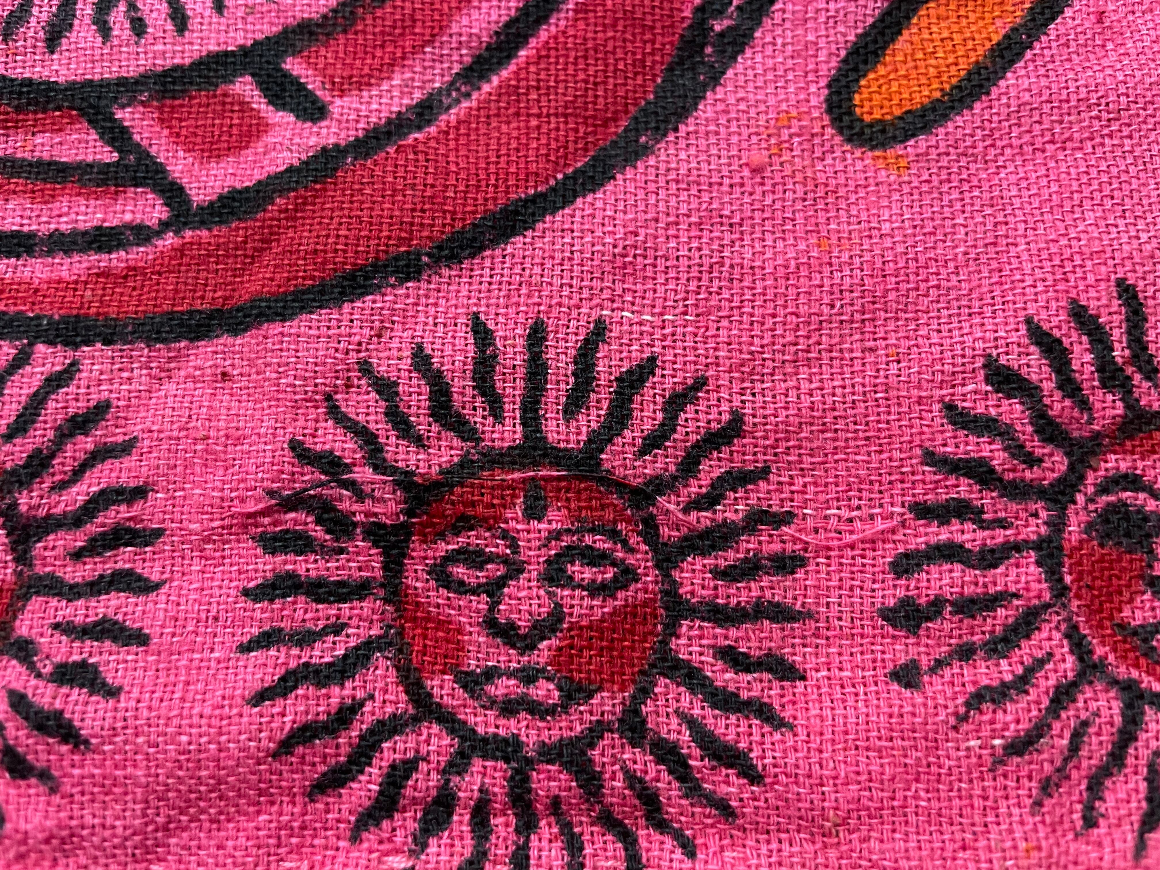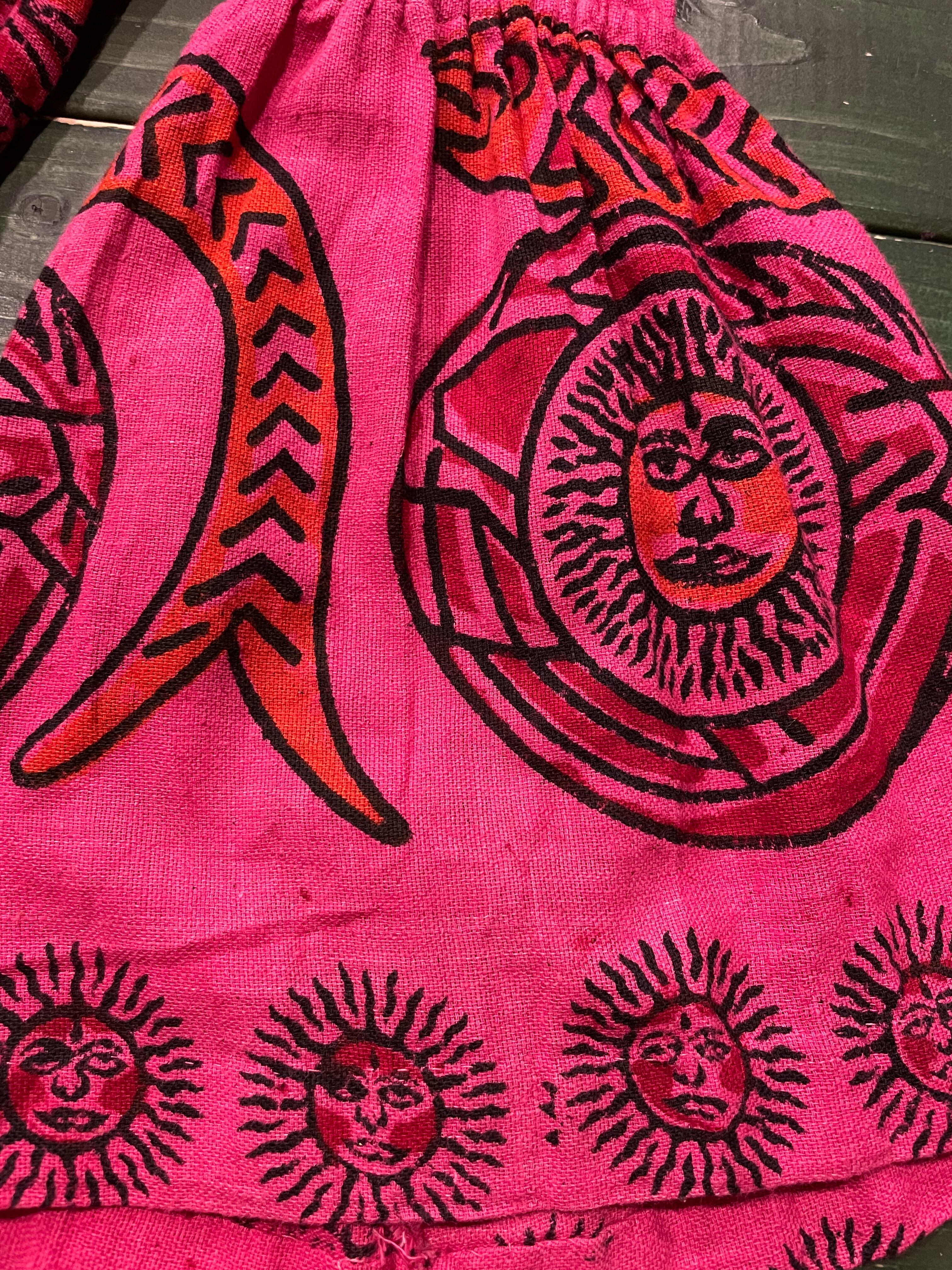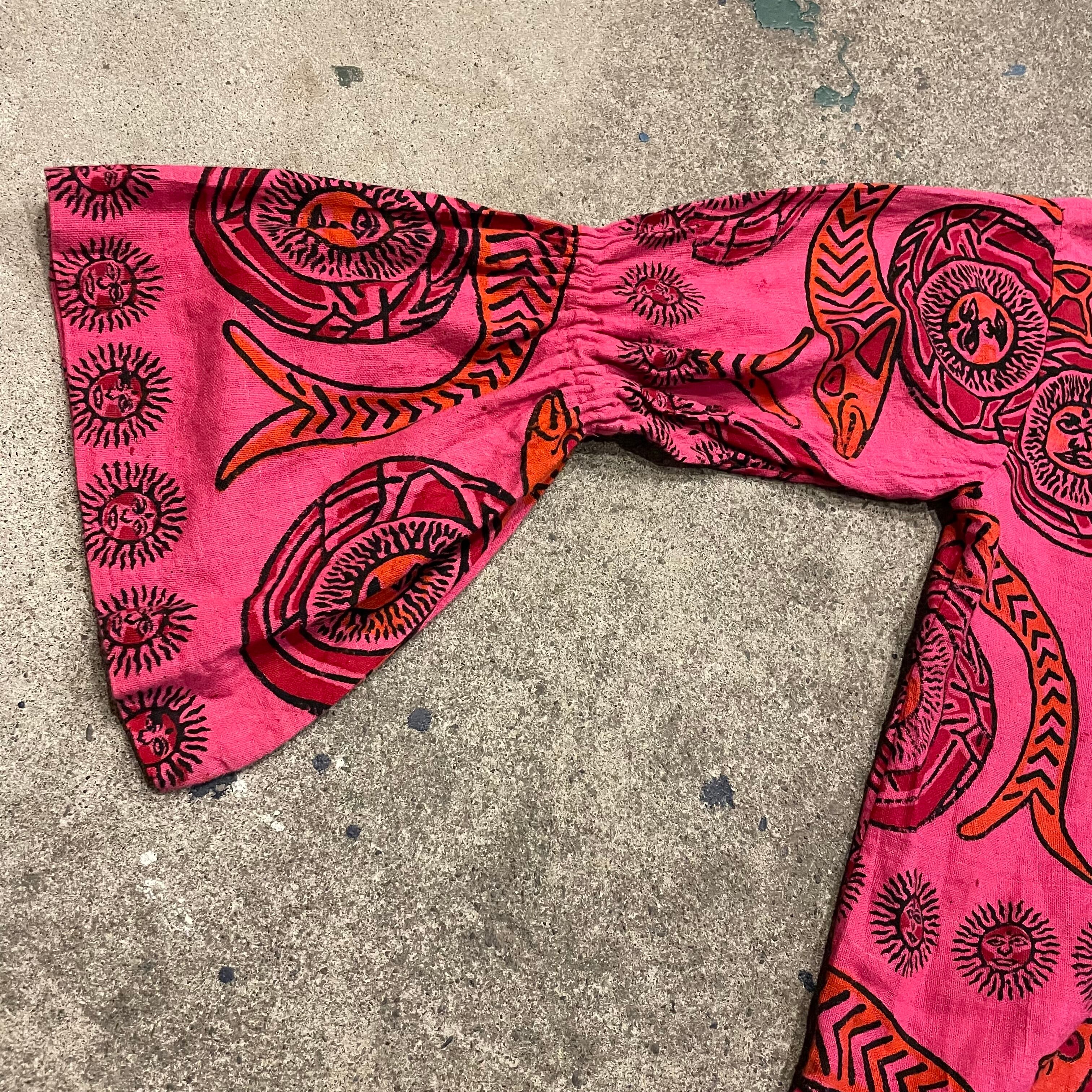 濃いピンク色に太陽と魚の模様がヘンテコでかわいいトップスです。