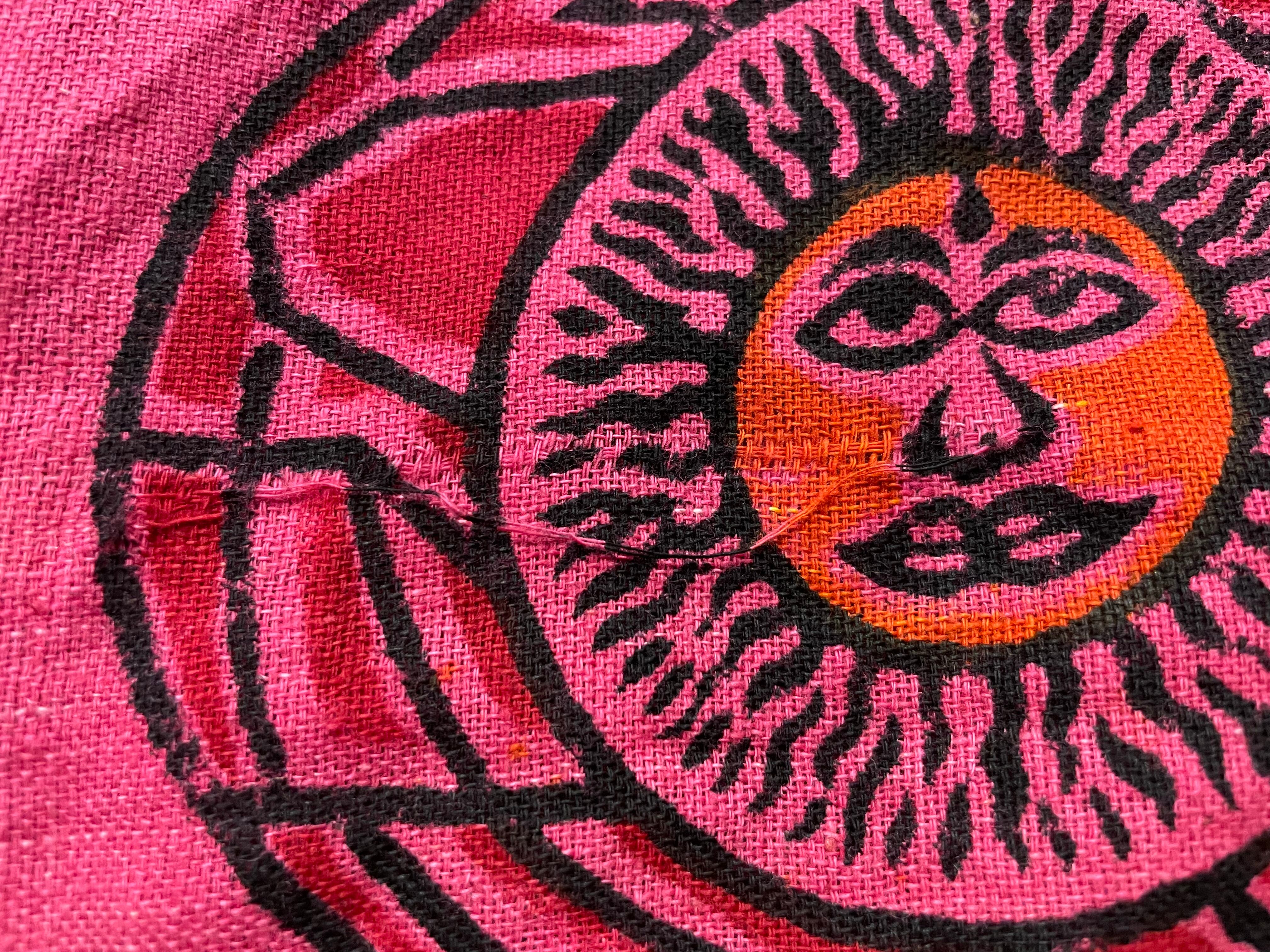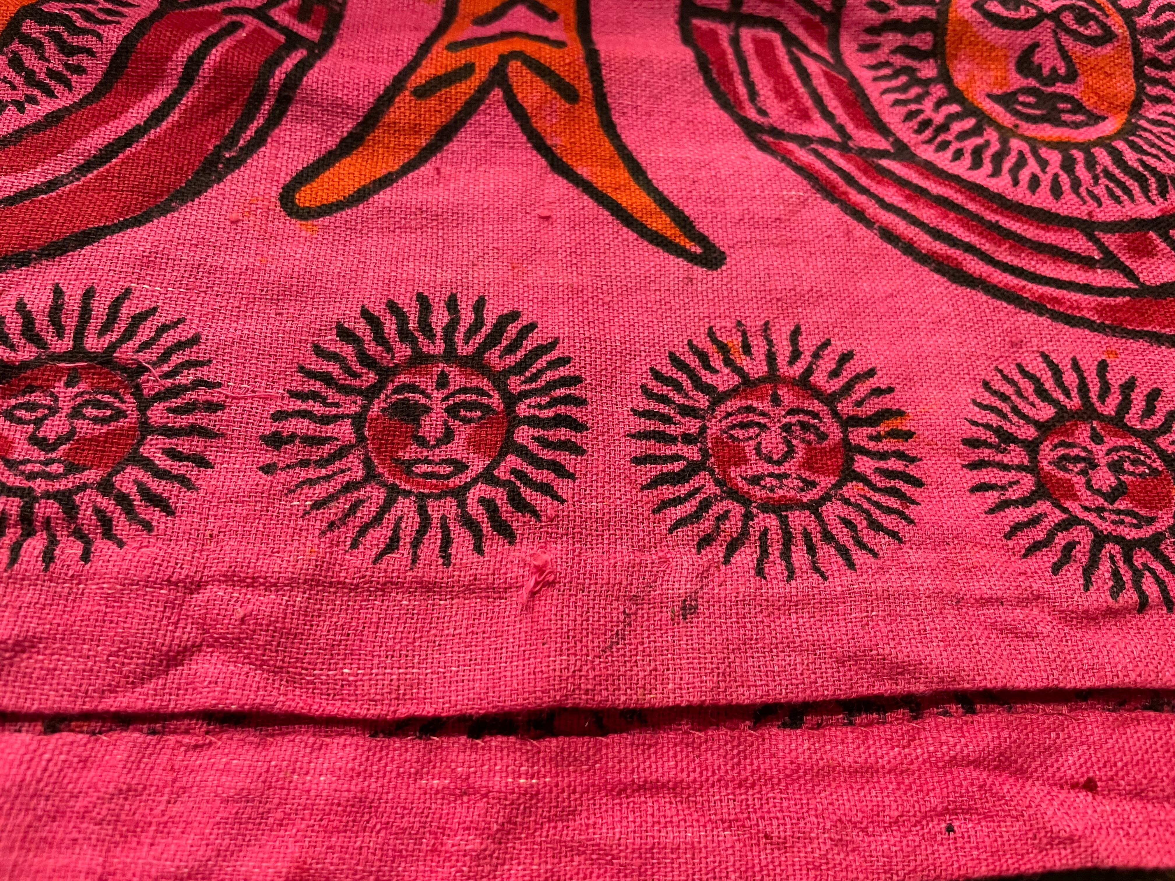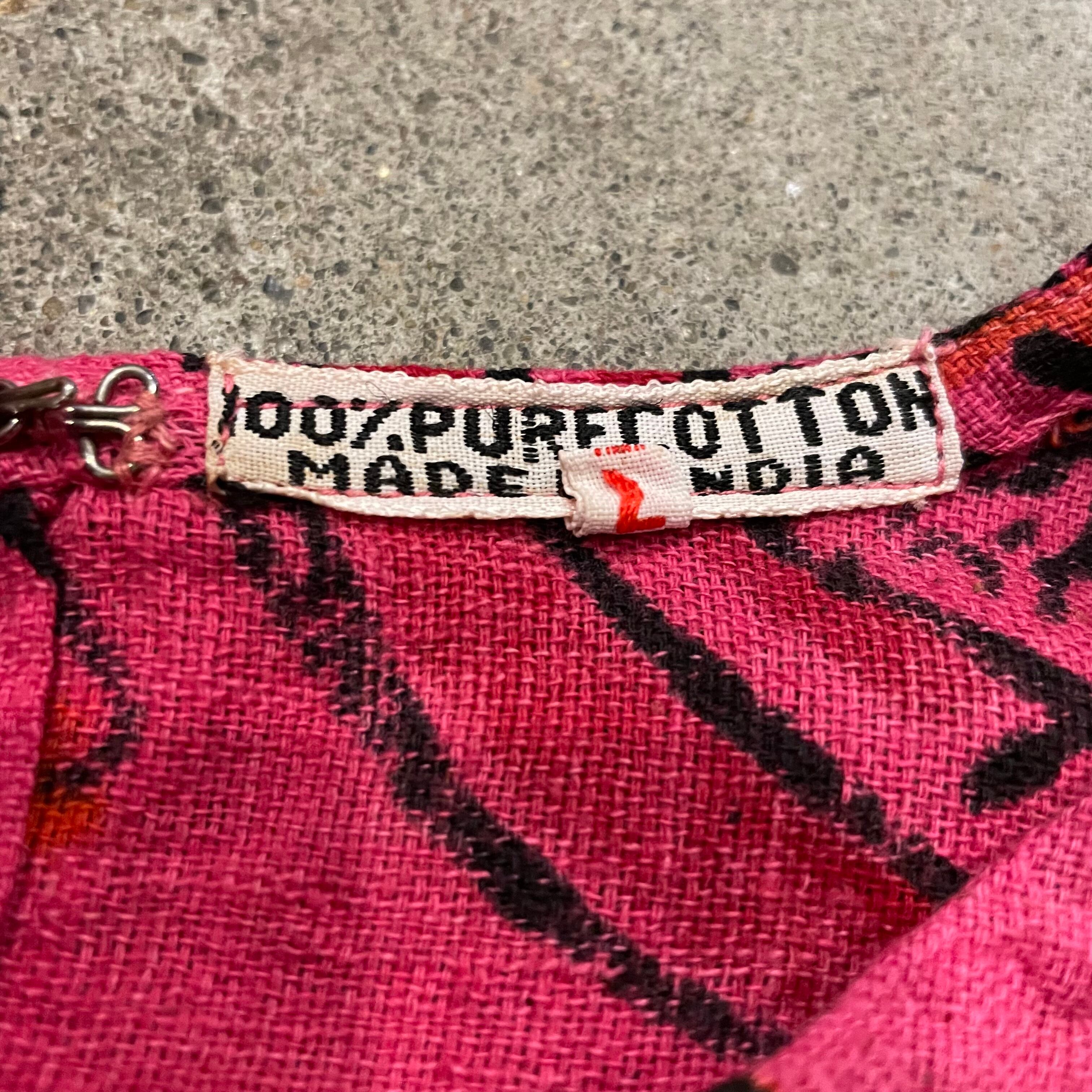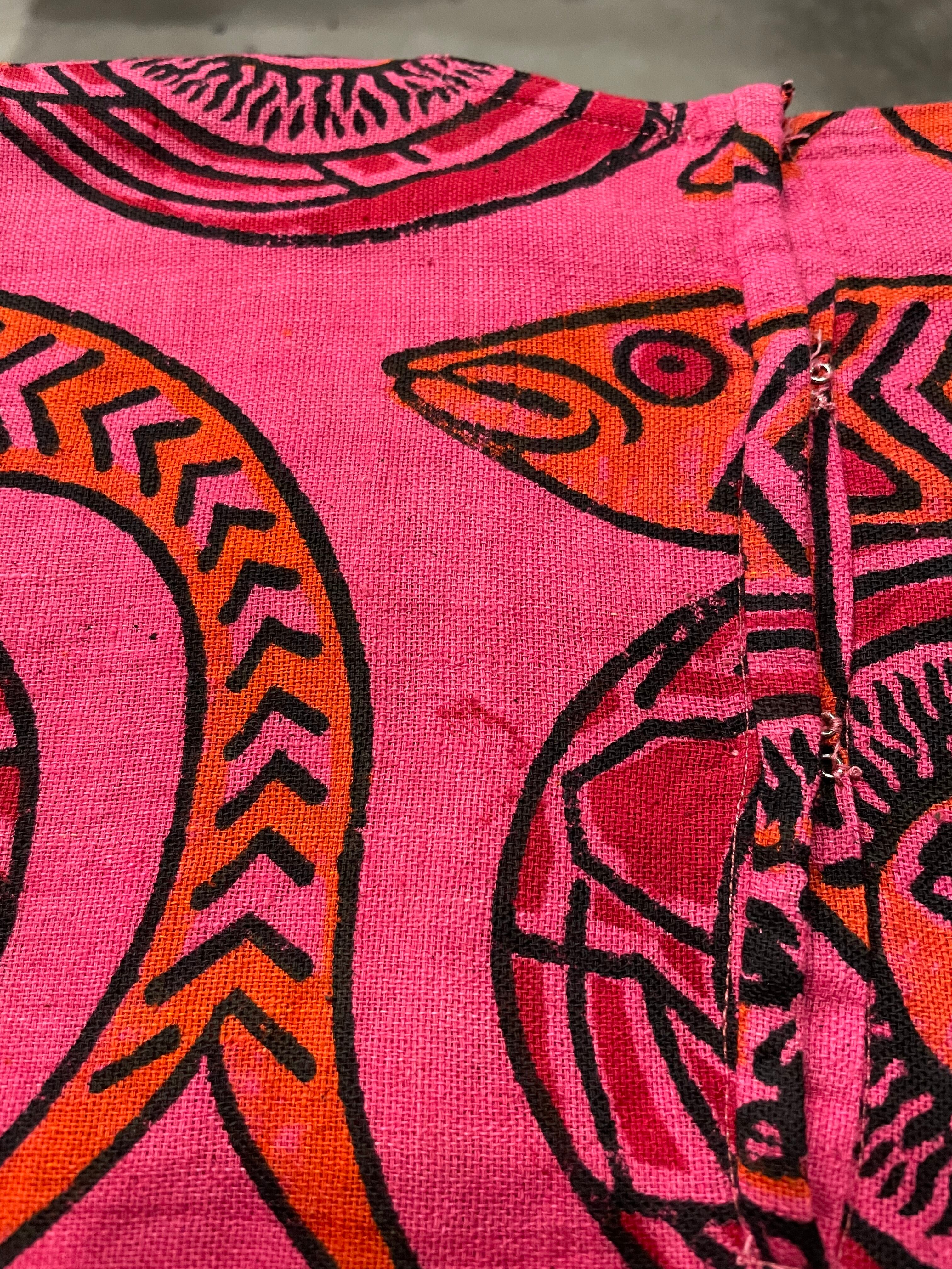濃いピンク色に太陽と魚の模様がヘンテコでかわいいトップスです。