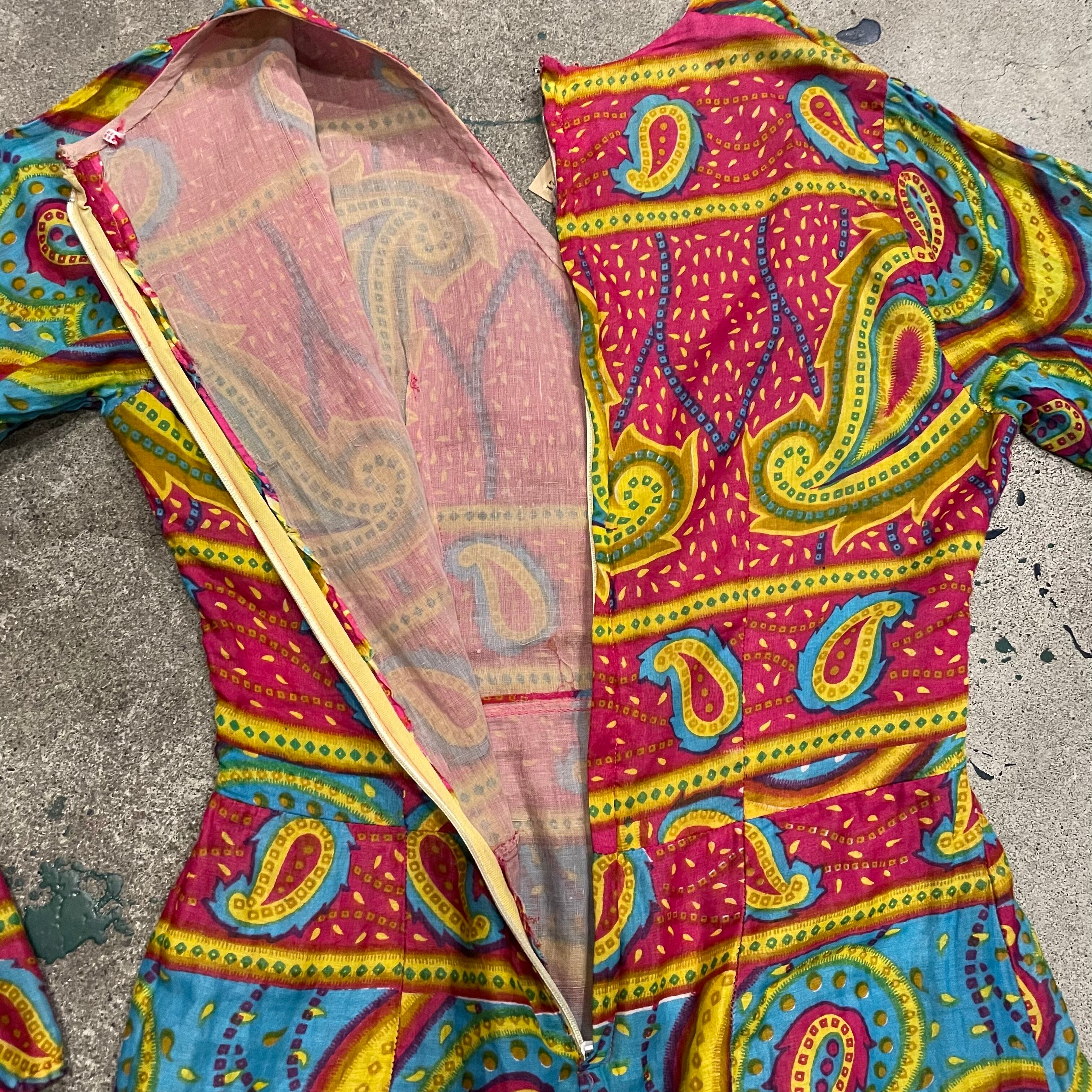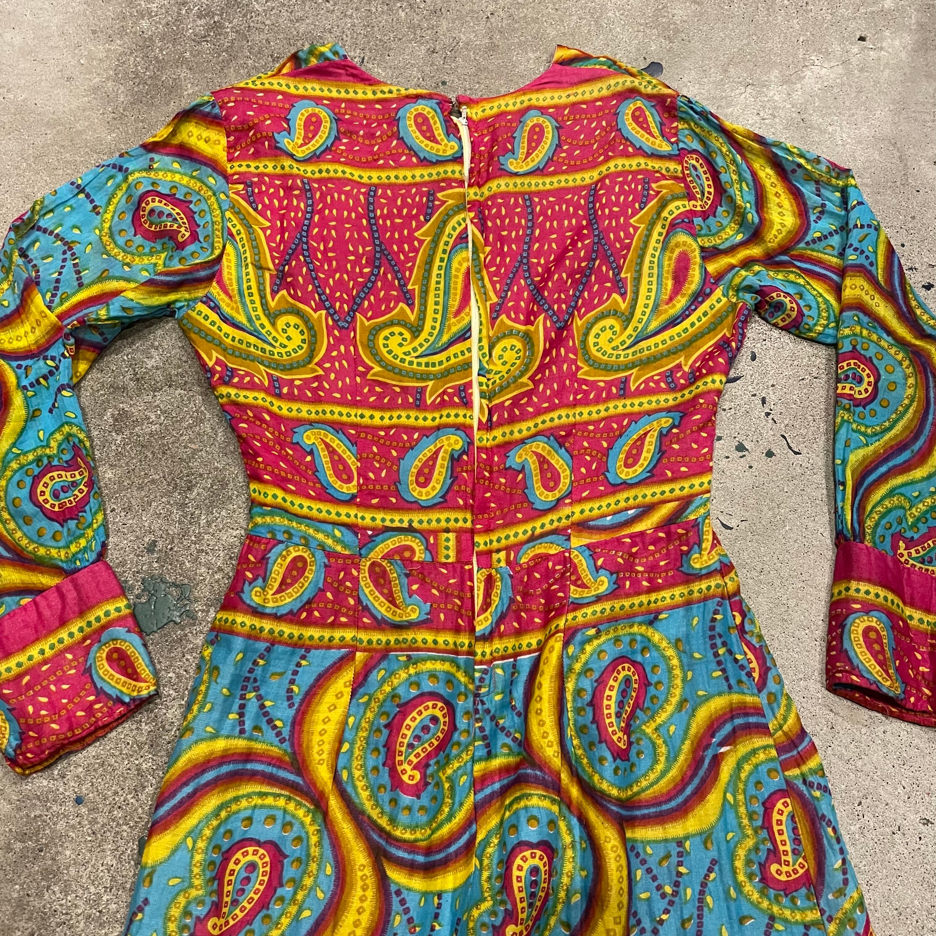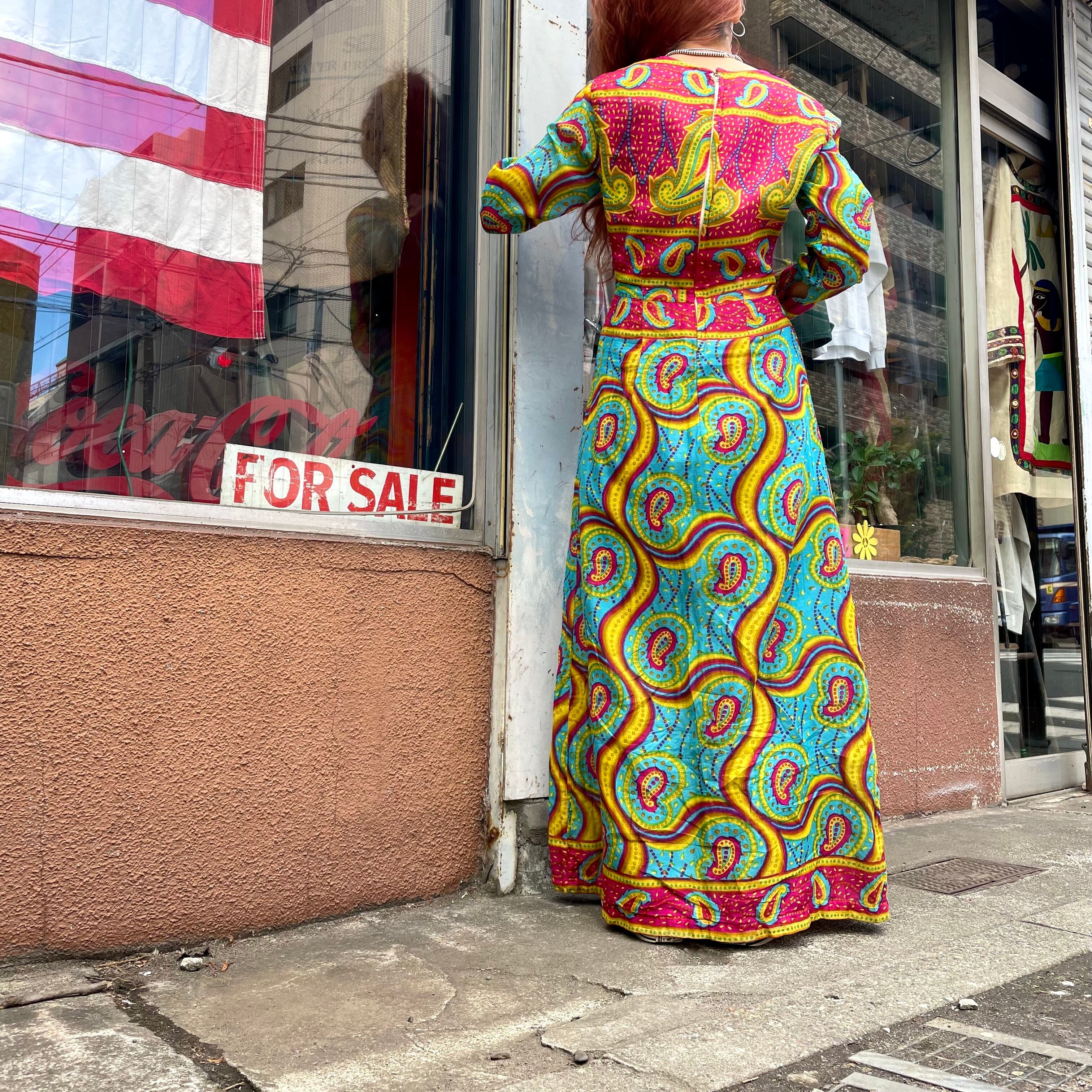 ペイズリーとうねうねした模様が素敵なワンピースです。色味も激しめでかわいいですね。