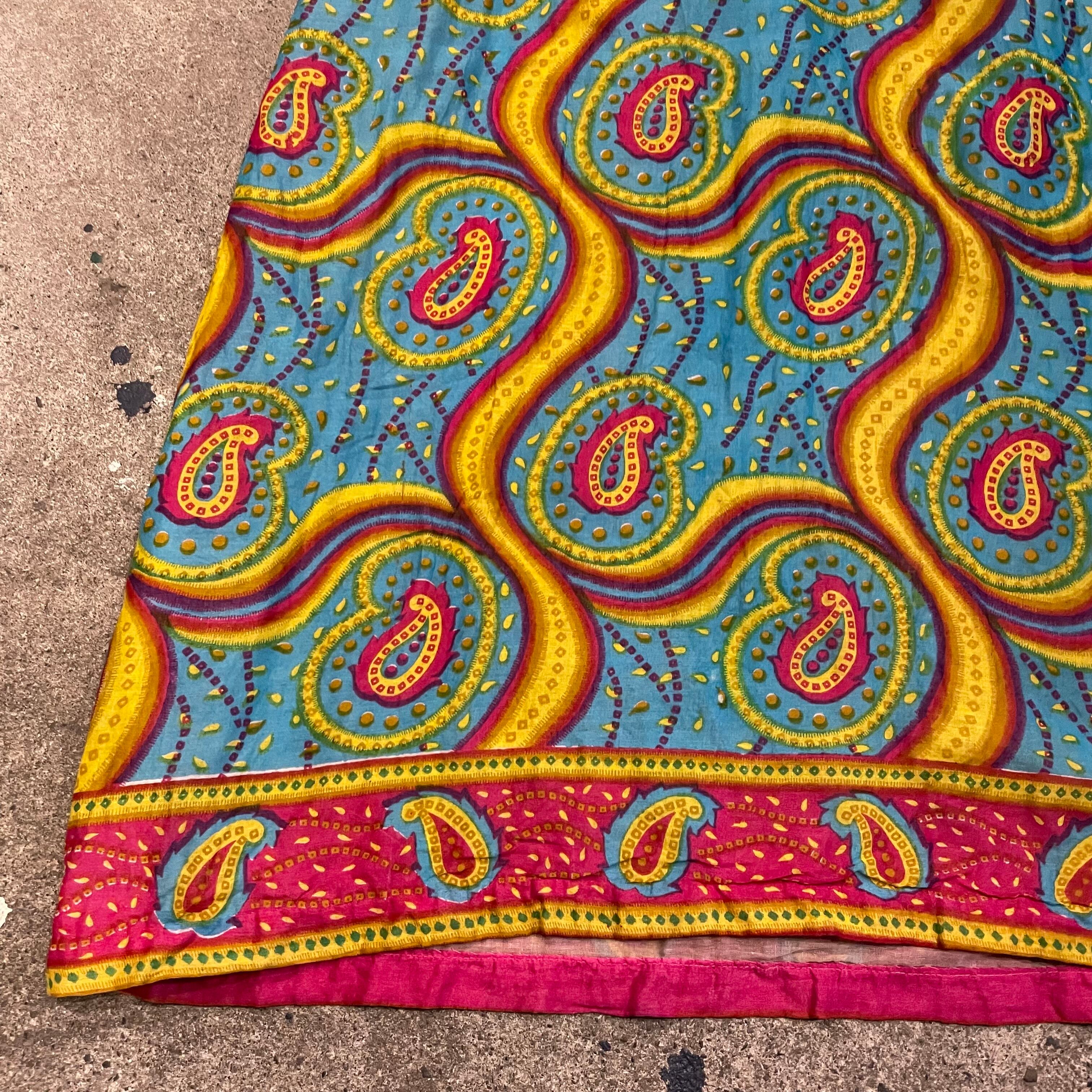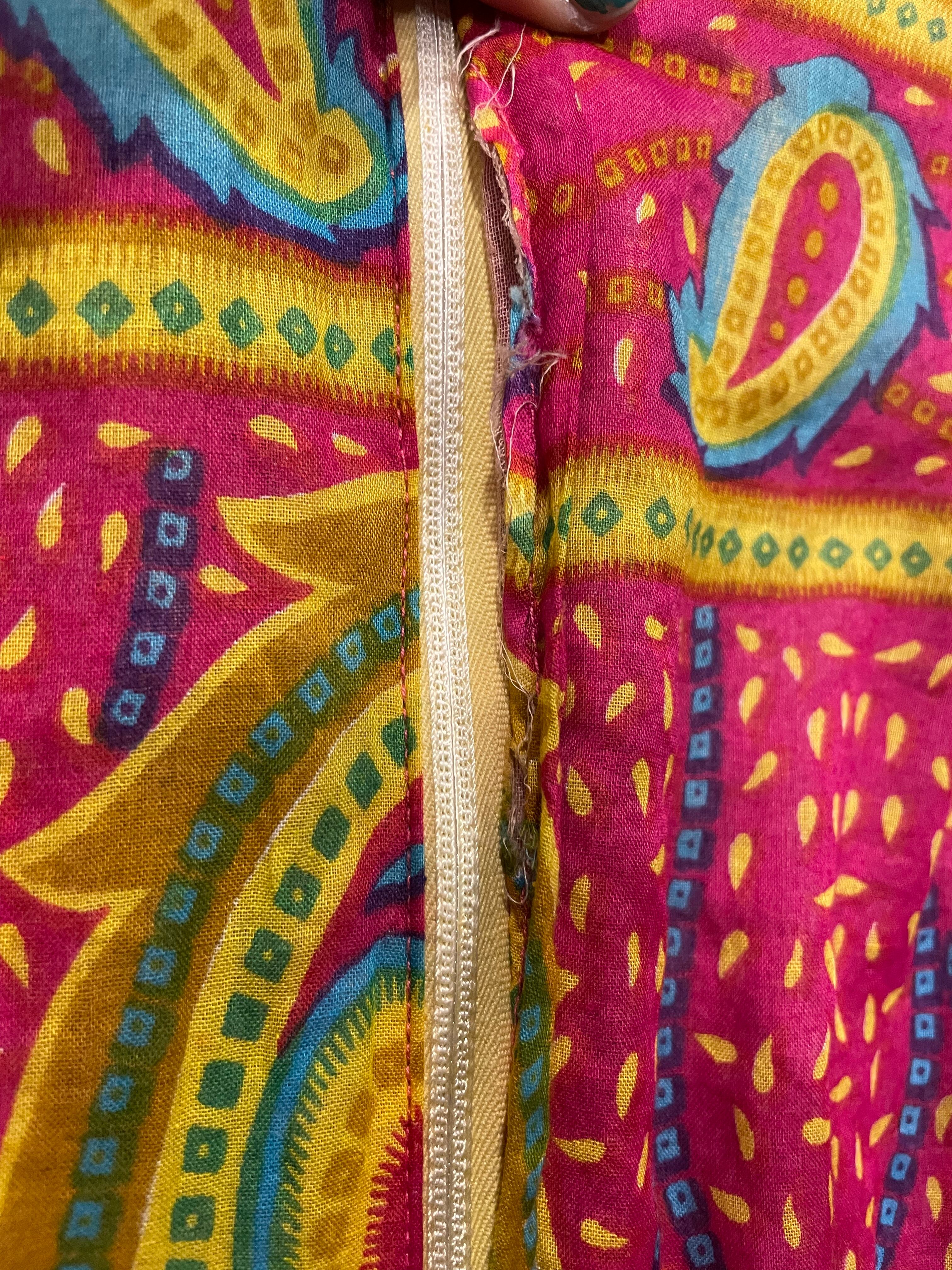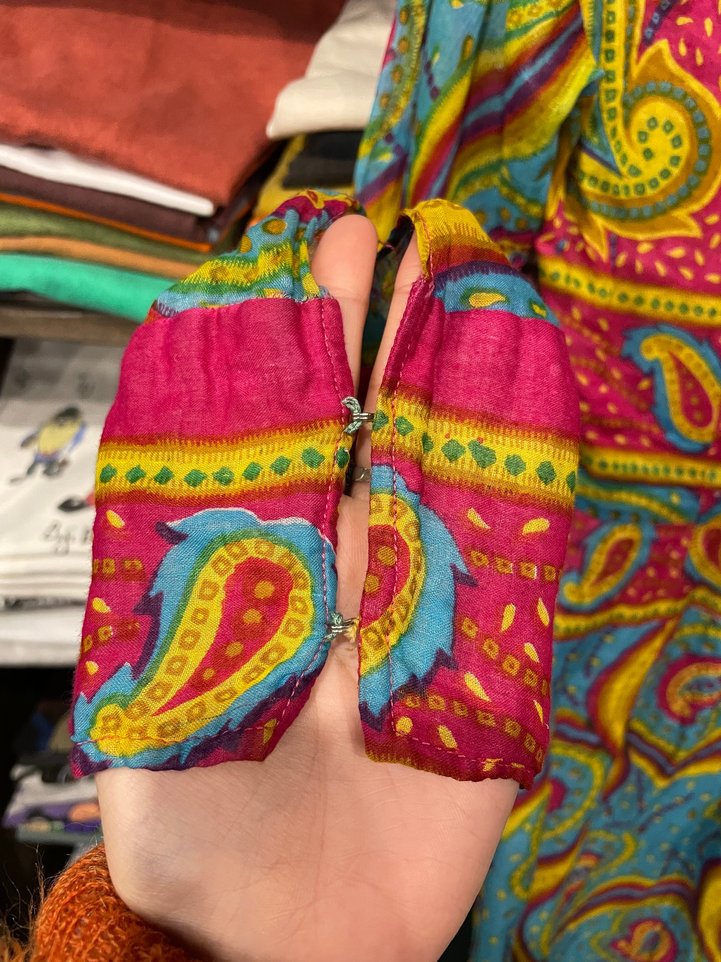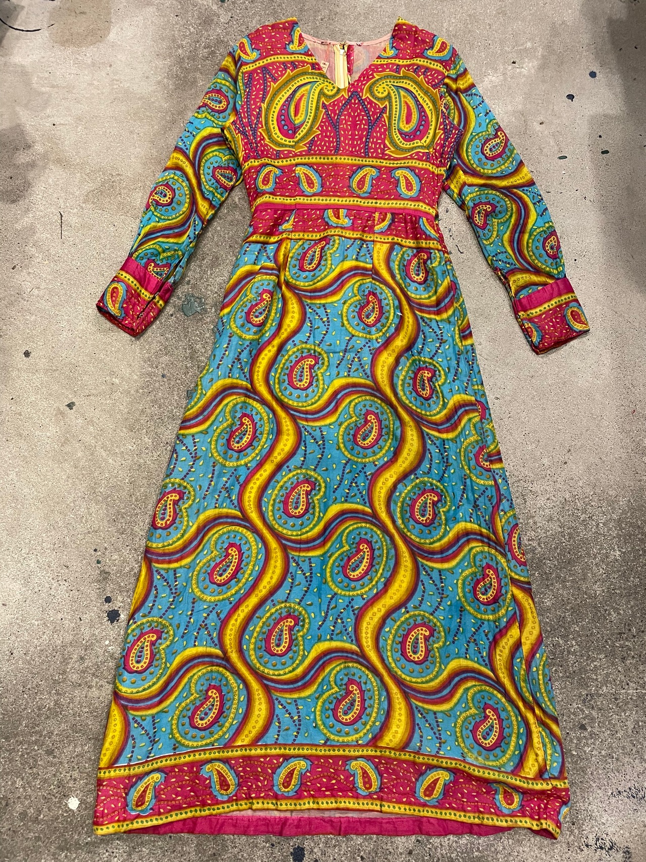 ペイズリーとうねうねした模様が素敵なワンピースです。色味も激しめでかわいいですね。