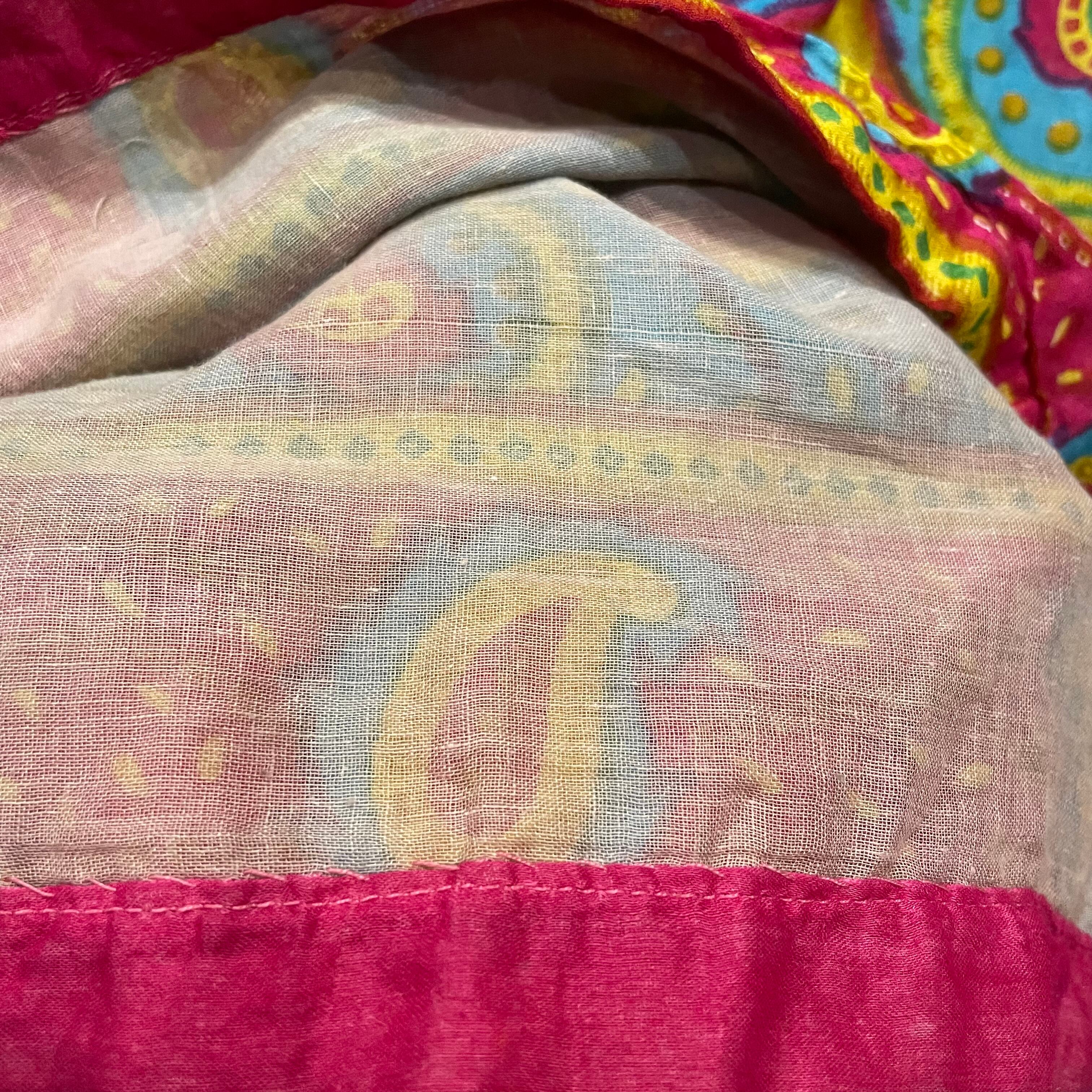 かなり薄手のコットンガーゼのような素材が二重になっていて、とても軽くて過ごしやすいと思います。袖のみ裏地がついておらず夏にも着られそうな素材感です。異国感漂う雰囲気が魅力的でおすすめの一着です。