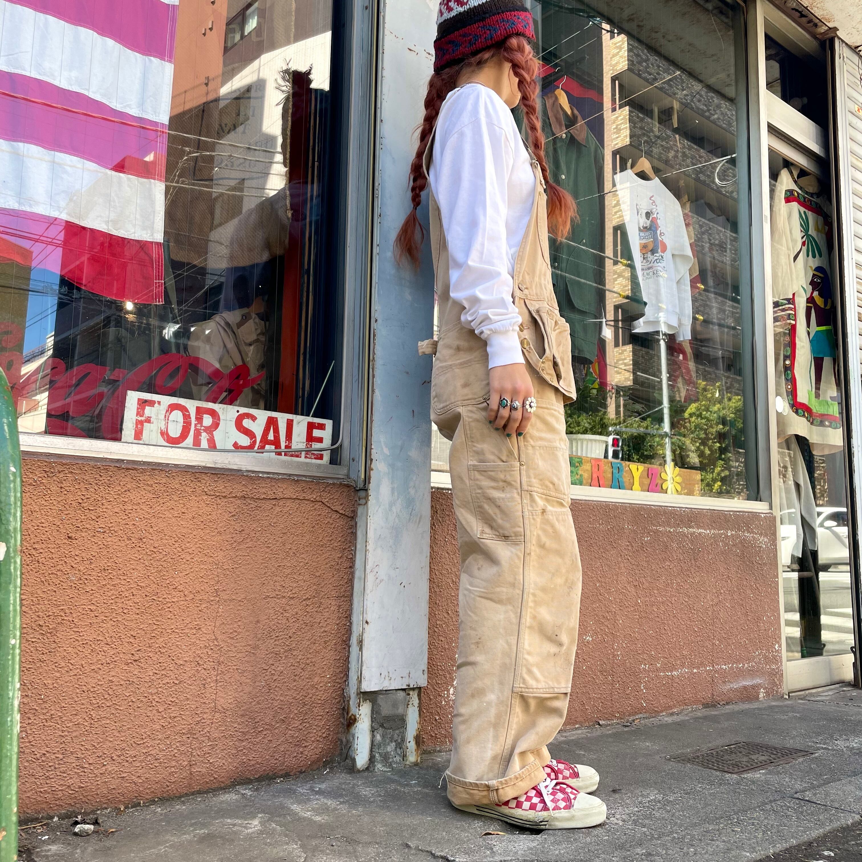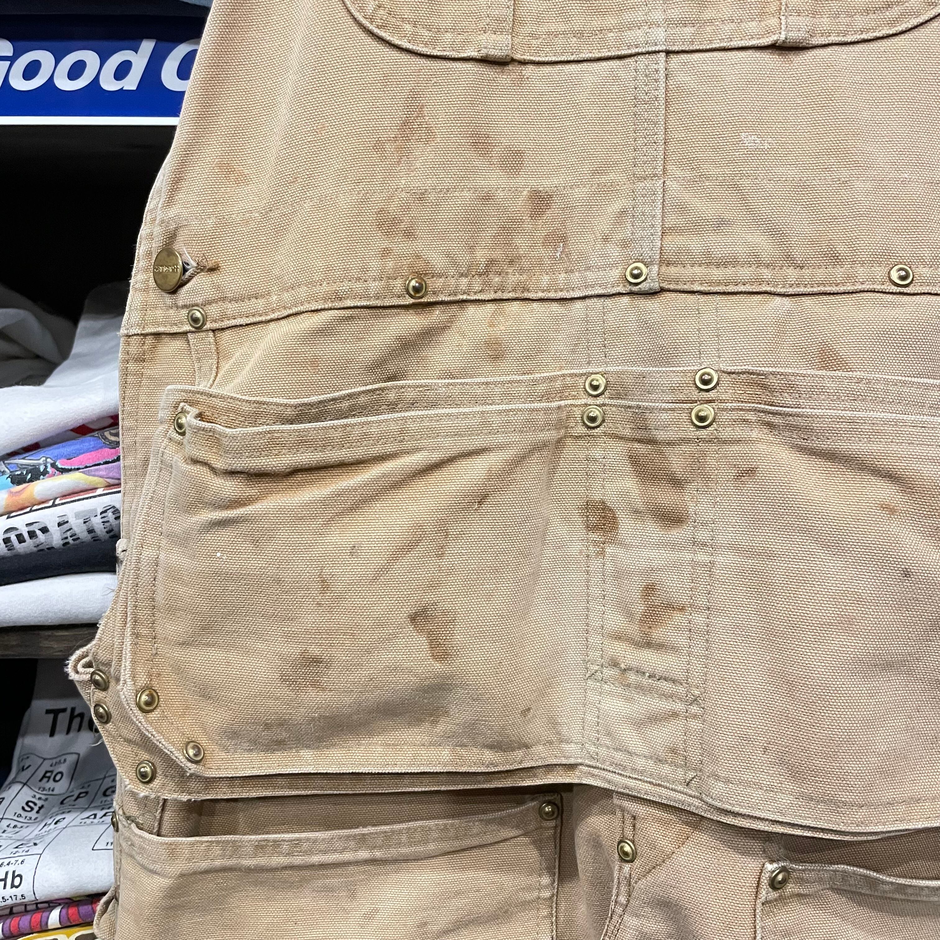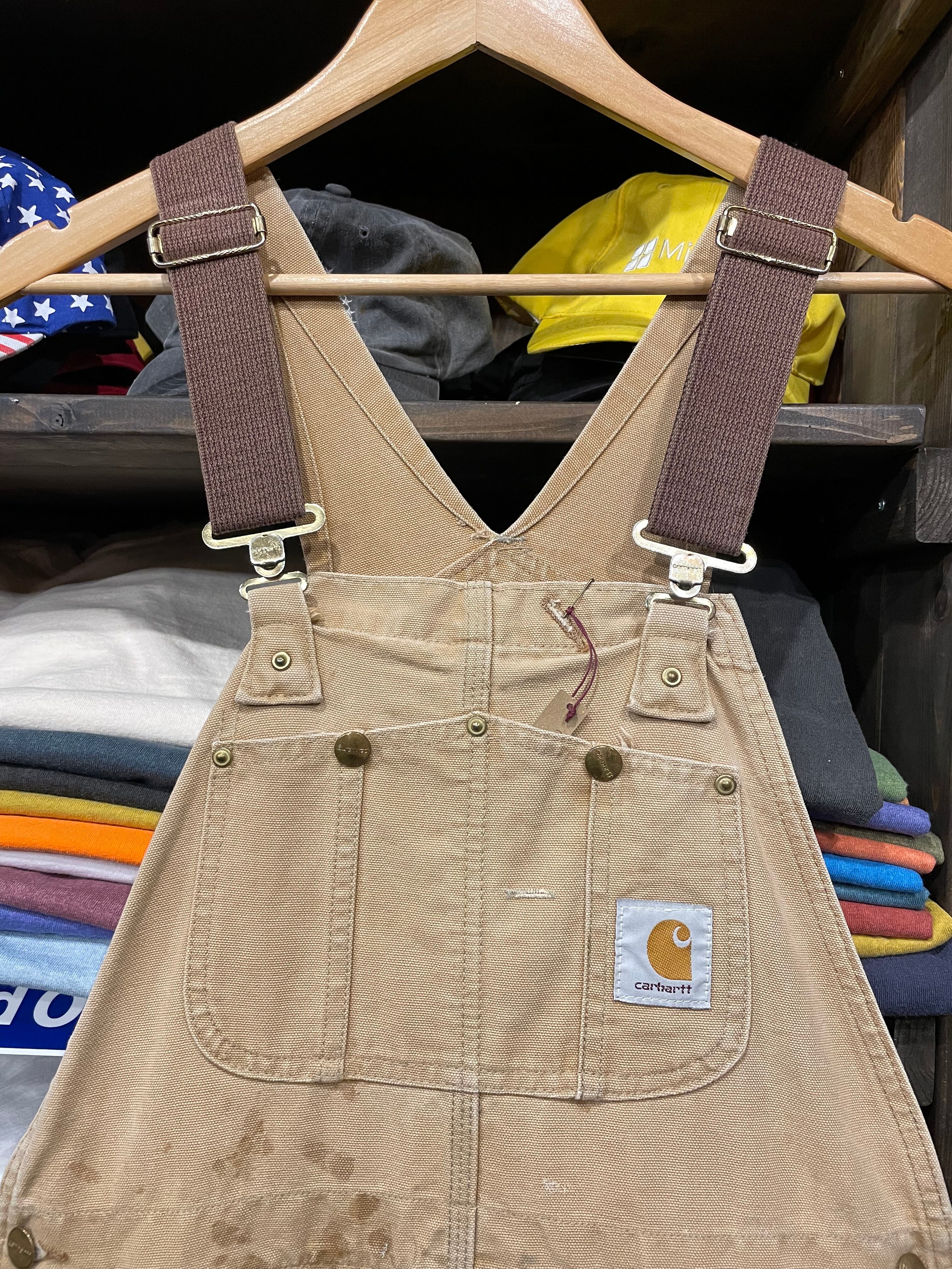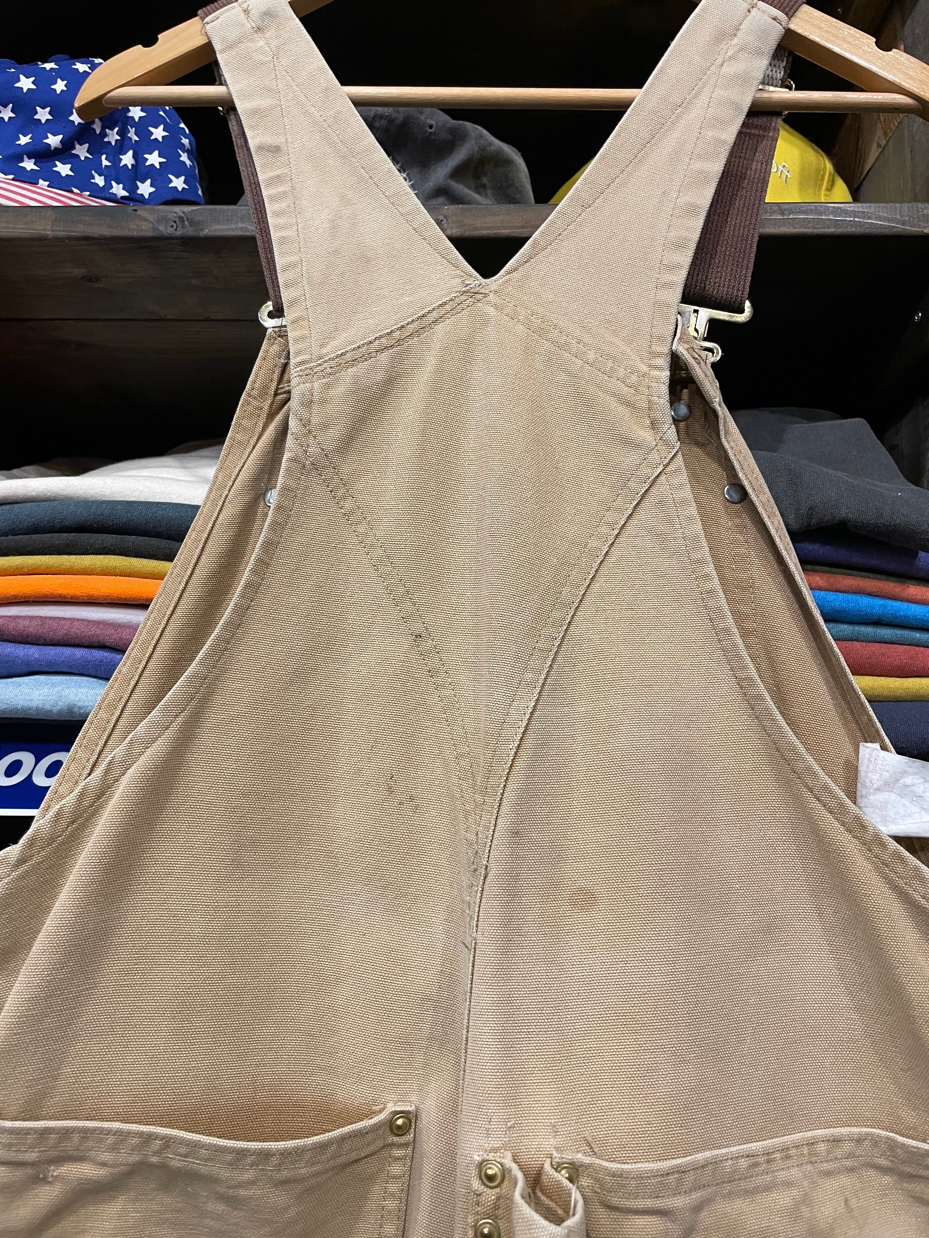 80〜90年代、カーハートのダック地オーバーオールです。エプロン付きでポケットがたくさん付いていてダブルニー仕様で、ザ・ワーク!というデザインですし、リアルな汚れやキズが良い雰囲気の一着です。