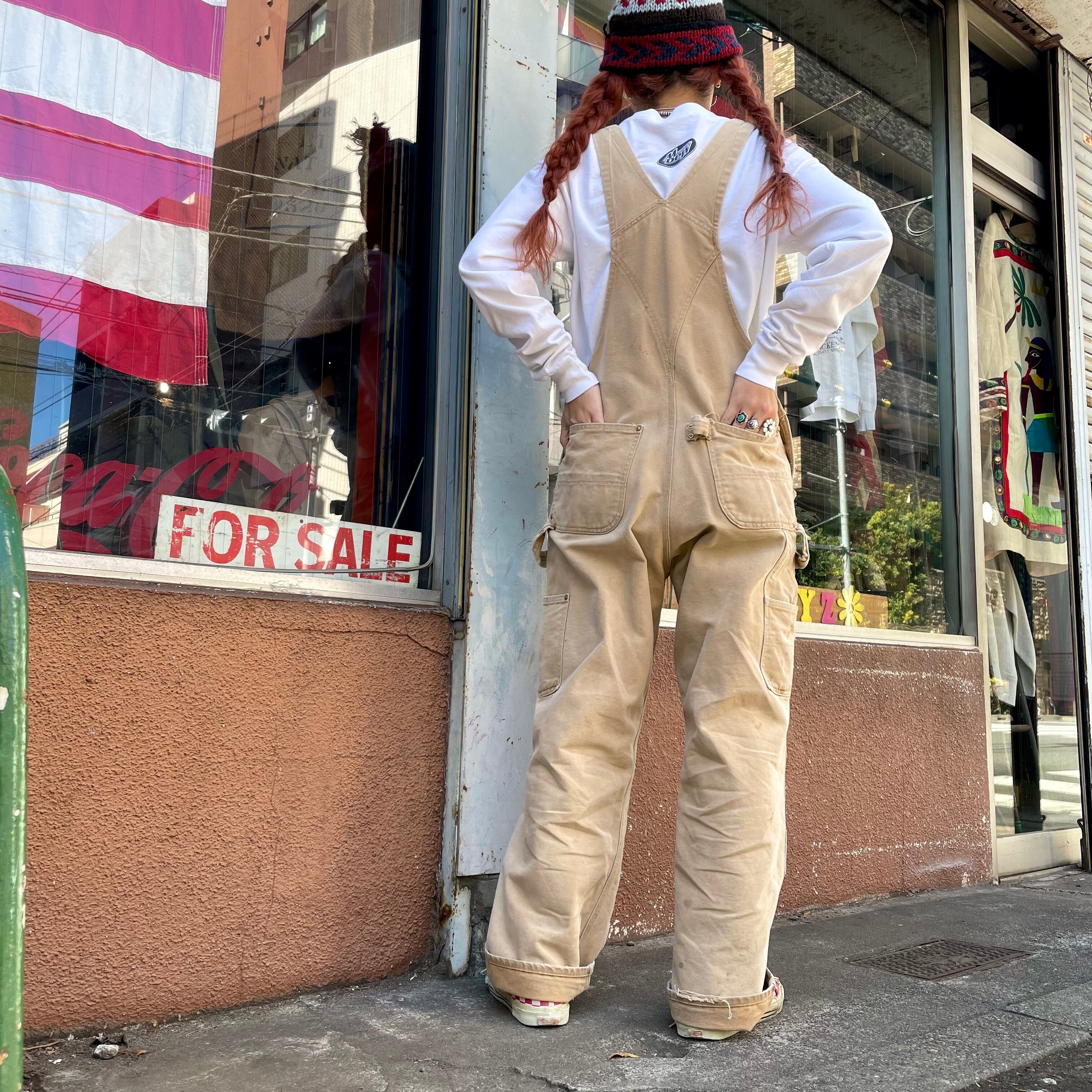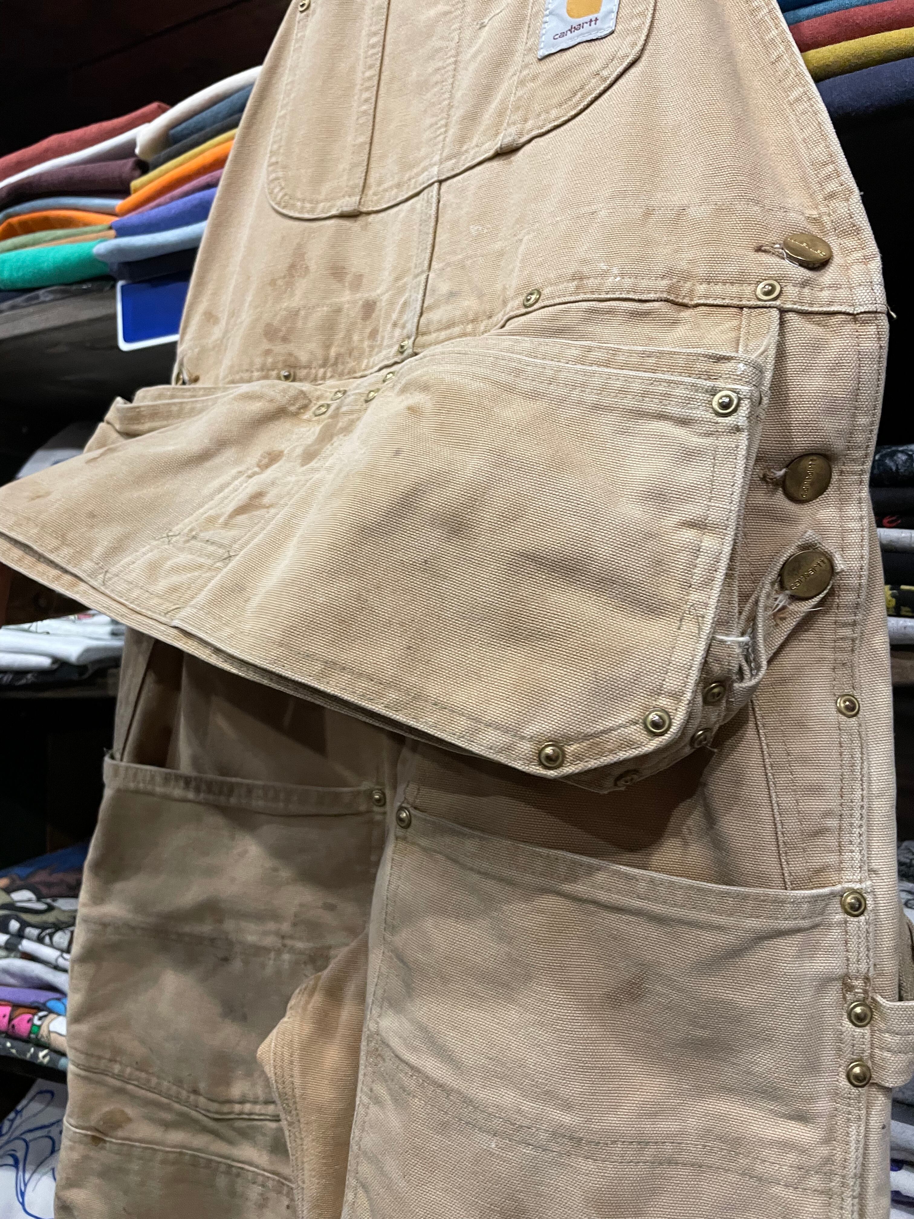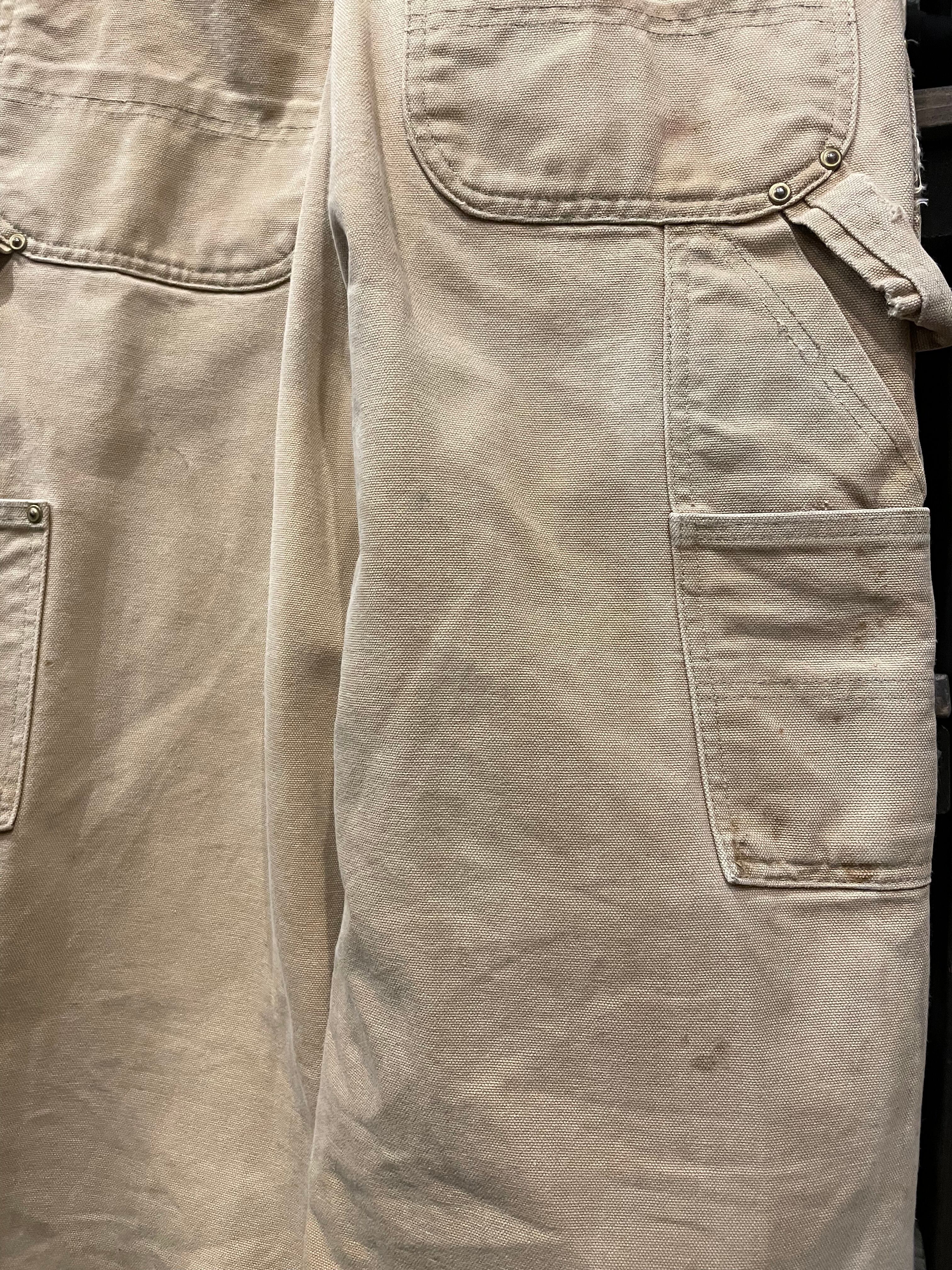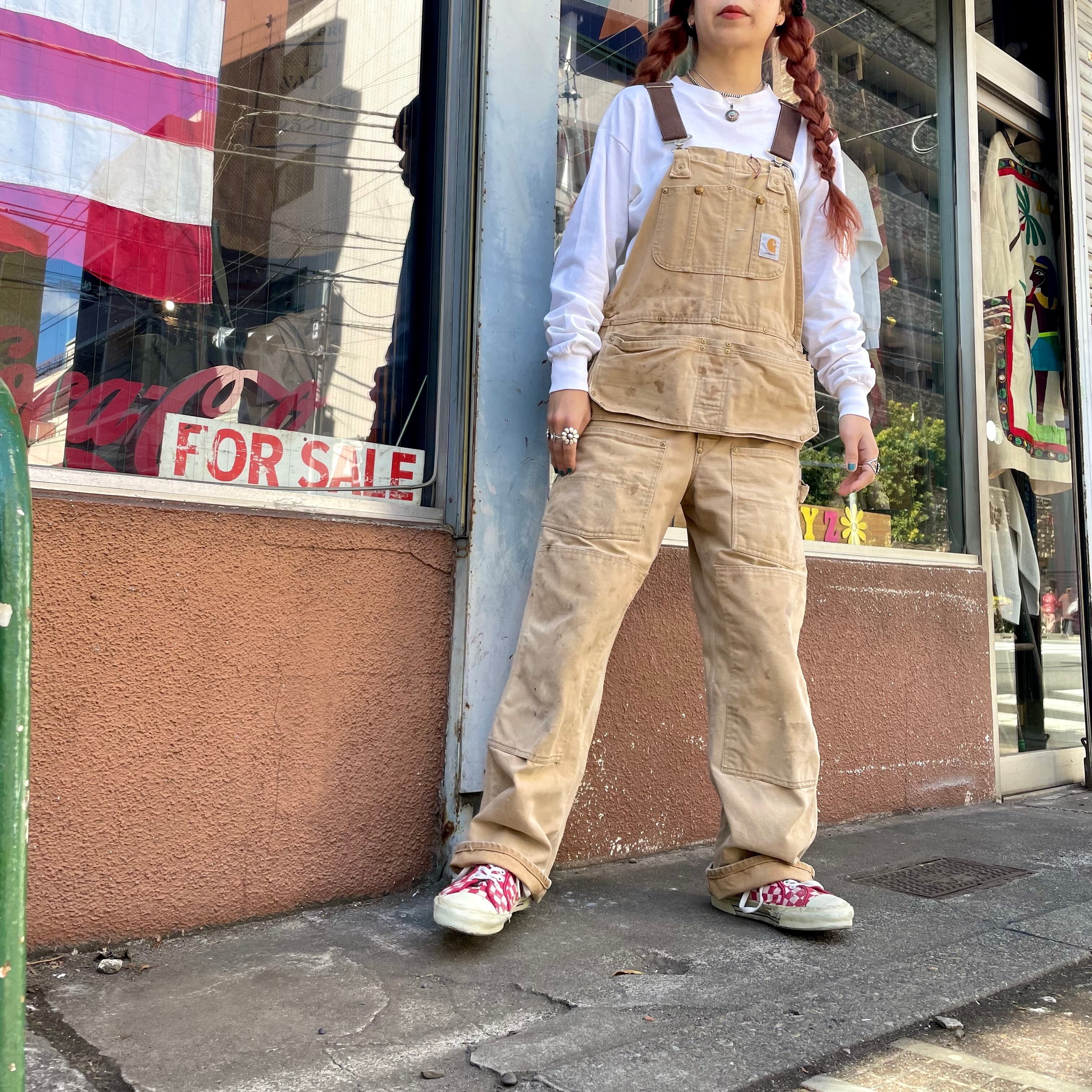80〜90年代、カーハートのダック地オーバーオールです。エプロン付きでポケットがたくさん付いていてダブルニー仕様で、ザ・ワーク!というデザインですし、リアルな汚れやキズが良い雰囲気の一着です。