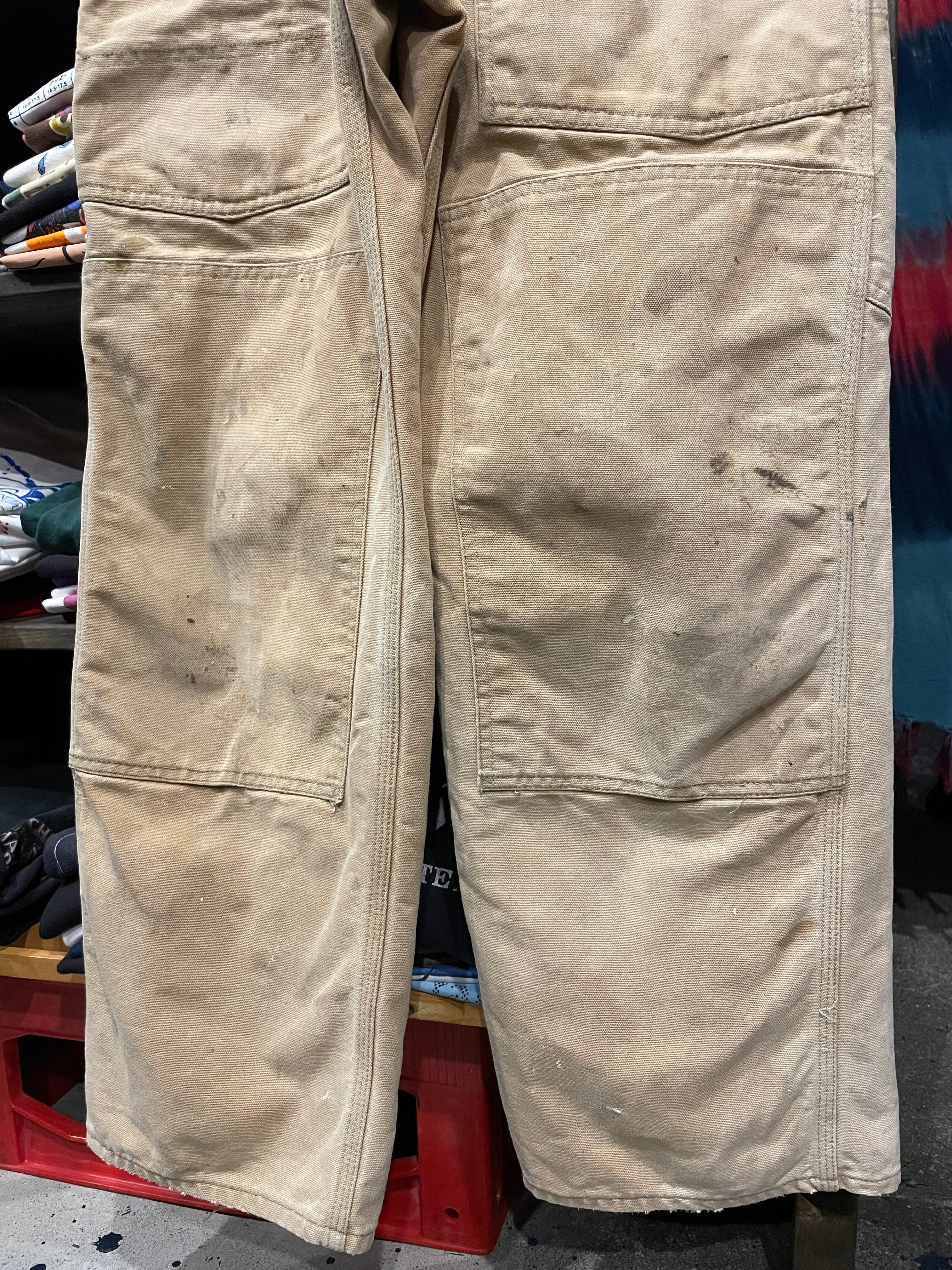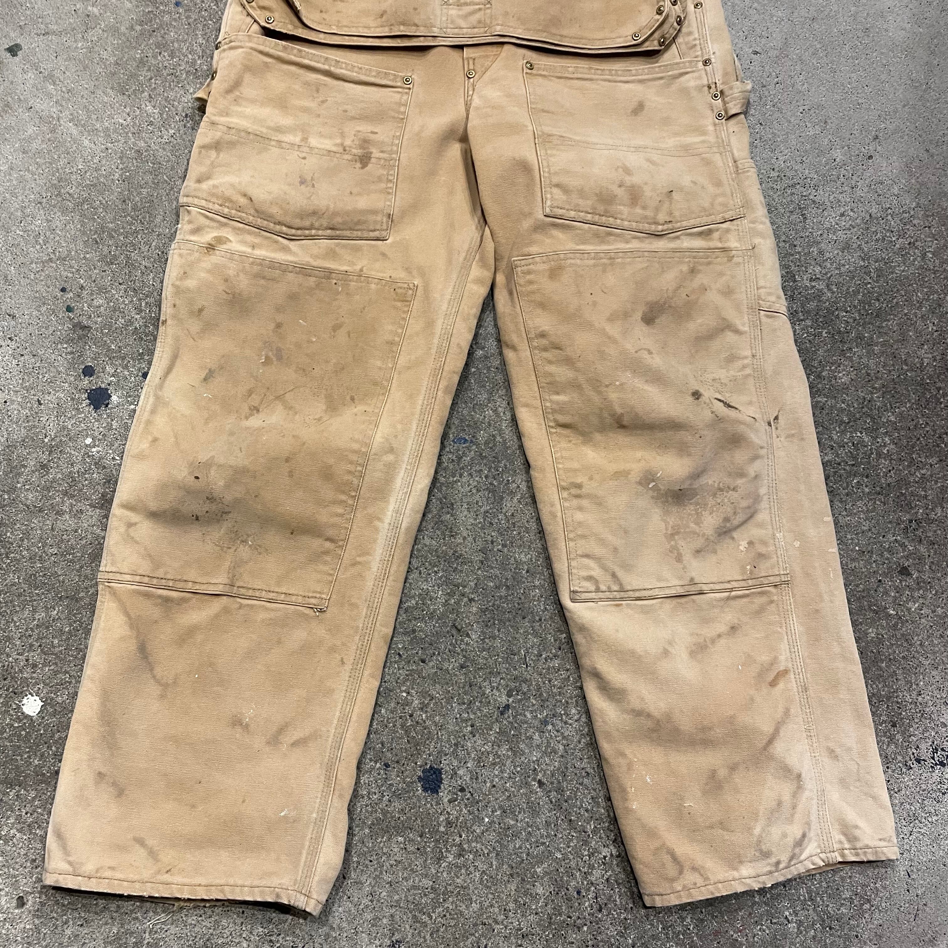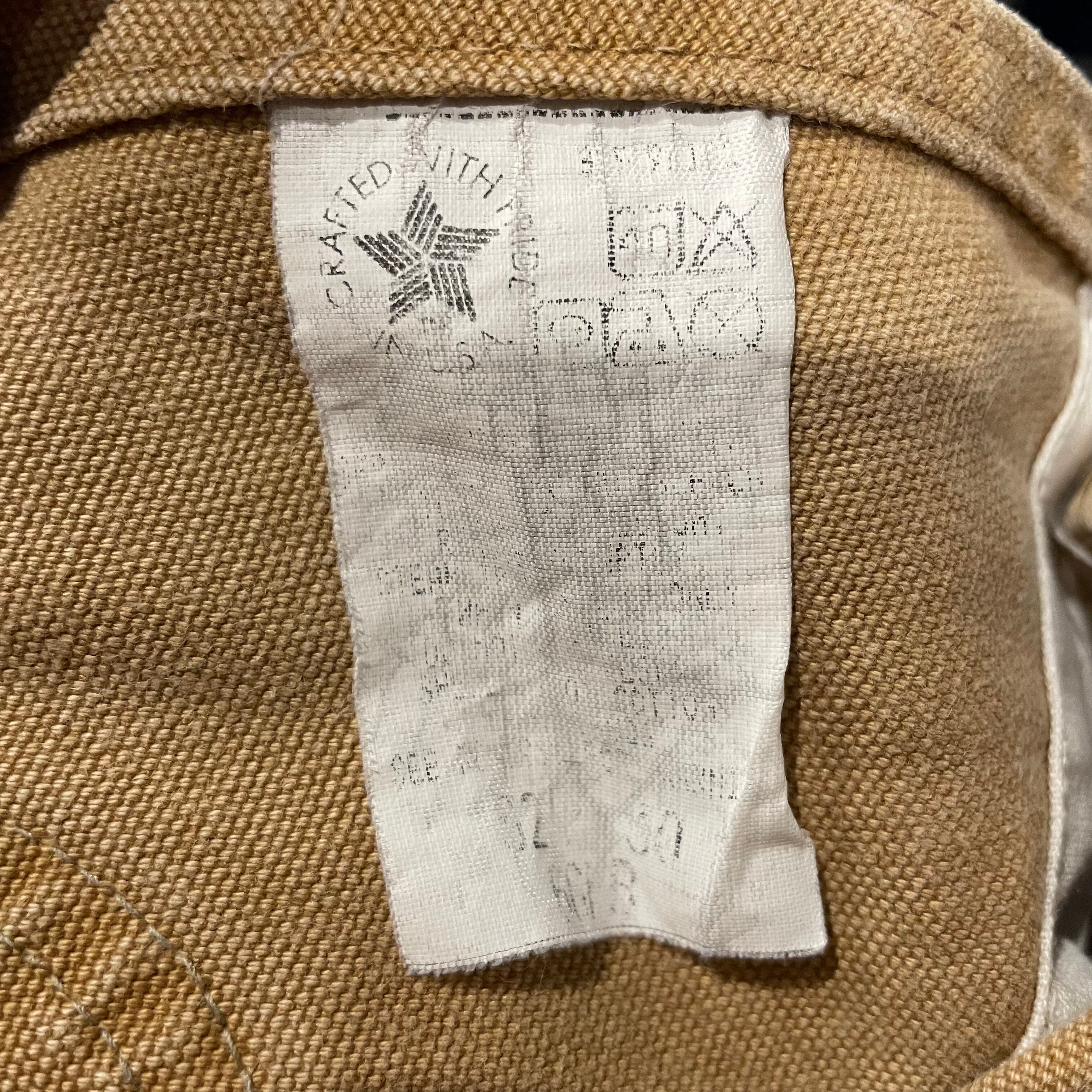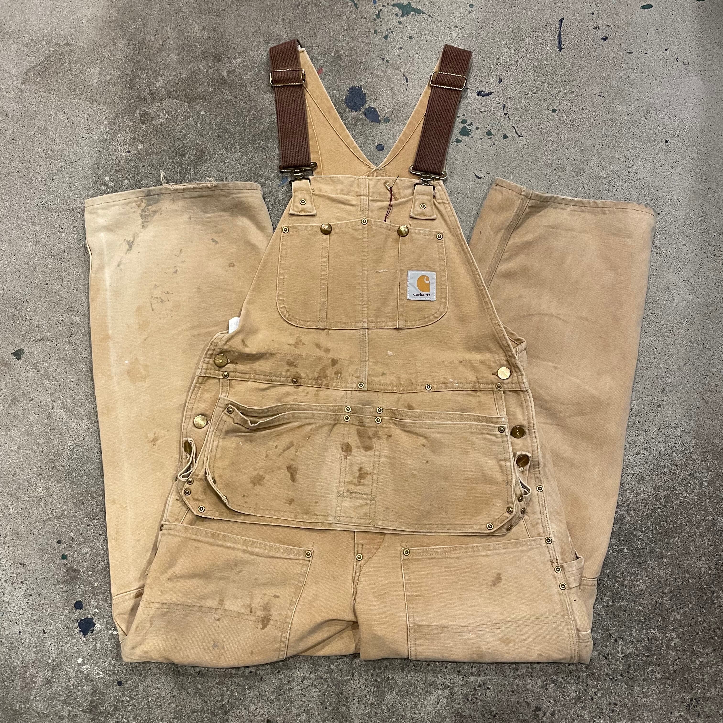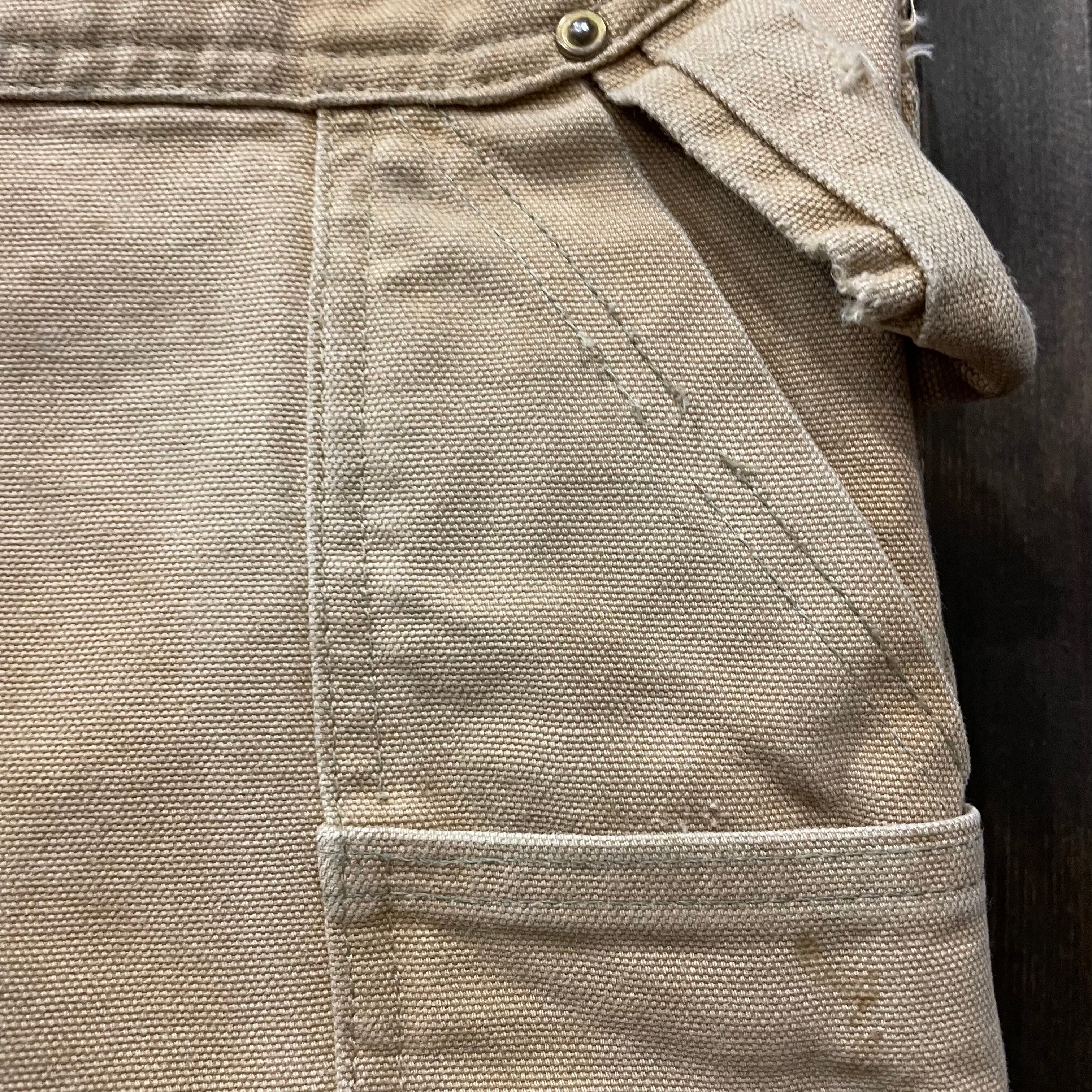80〜90年代、カーハートのダック地オーバーオールです。エプロン付きでポケットがたくさん付いていてダブルニー仕様で、ザ・ワーク!というデザインですし、リアルな汚れやキズが良い雰囲気の一着です。