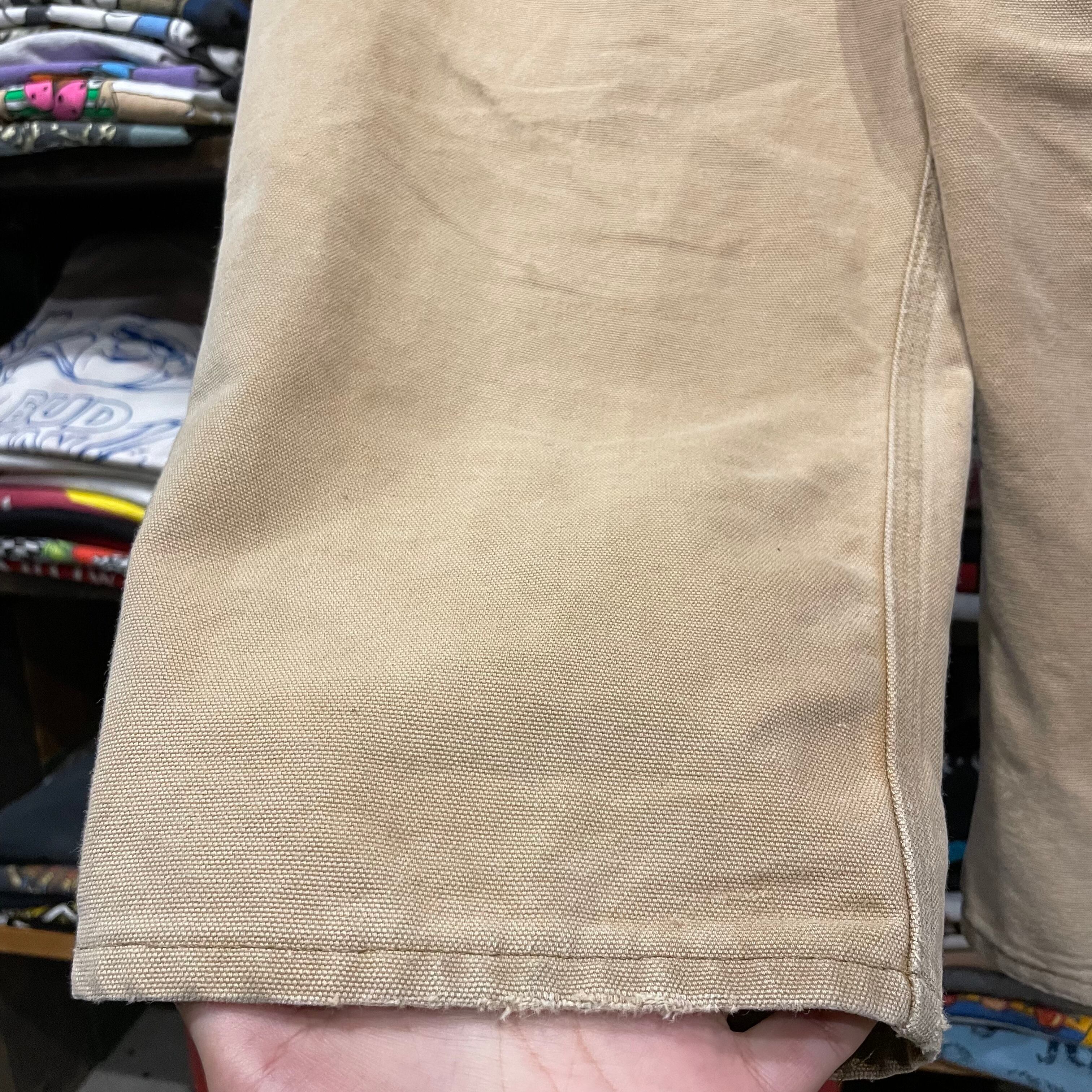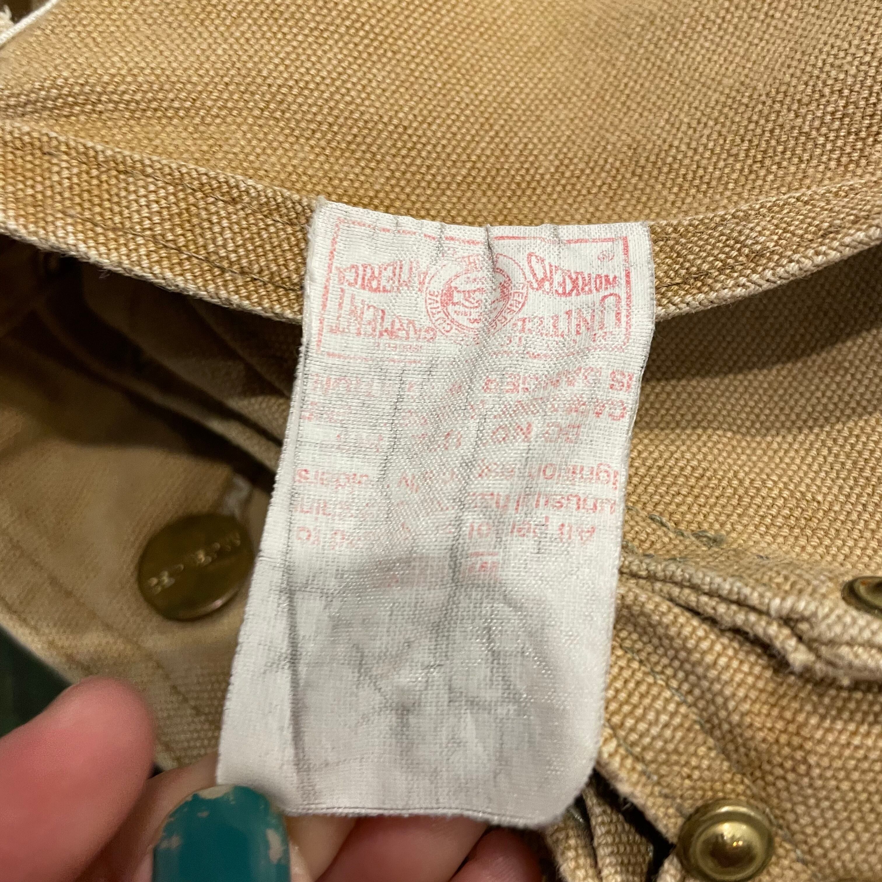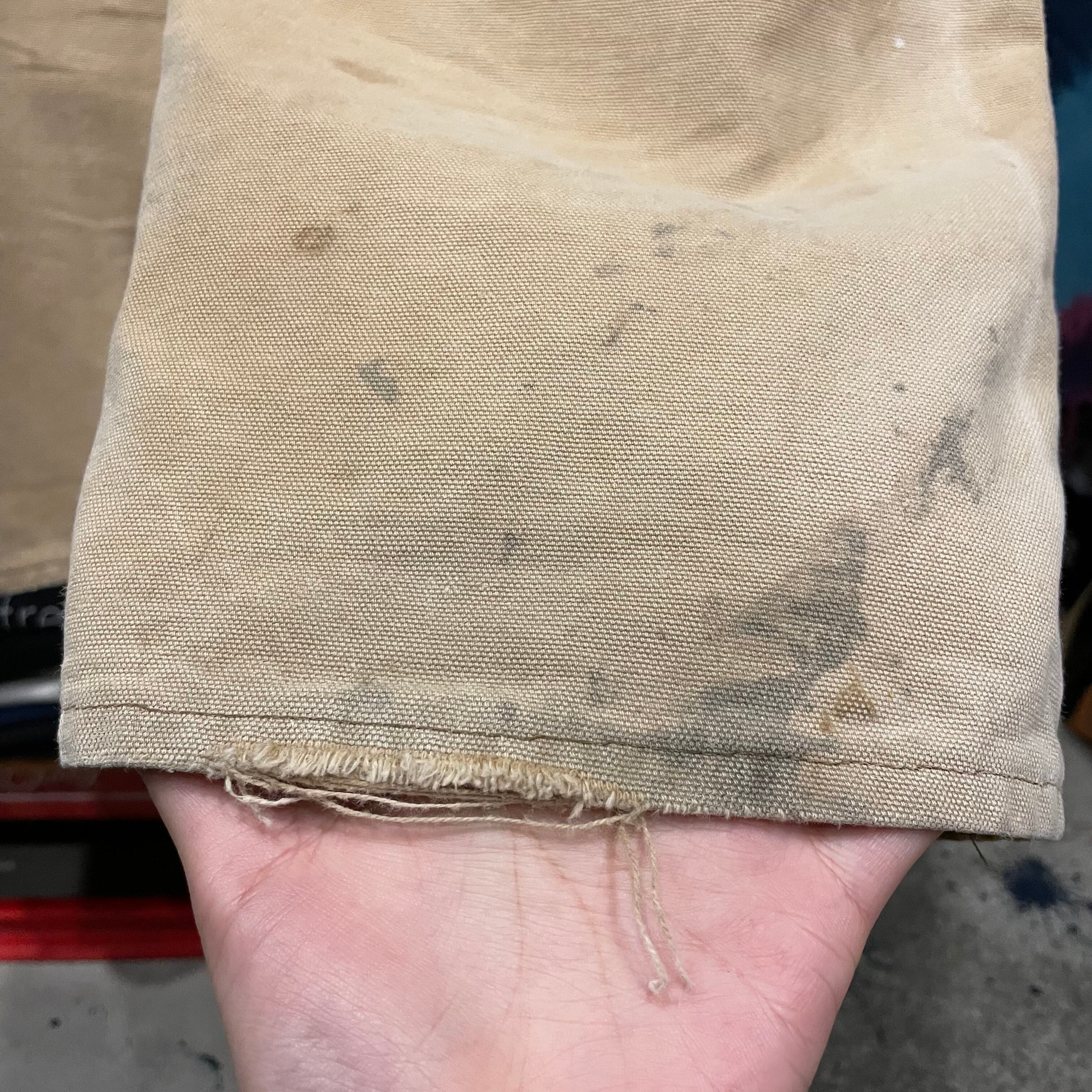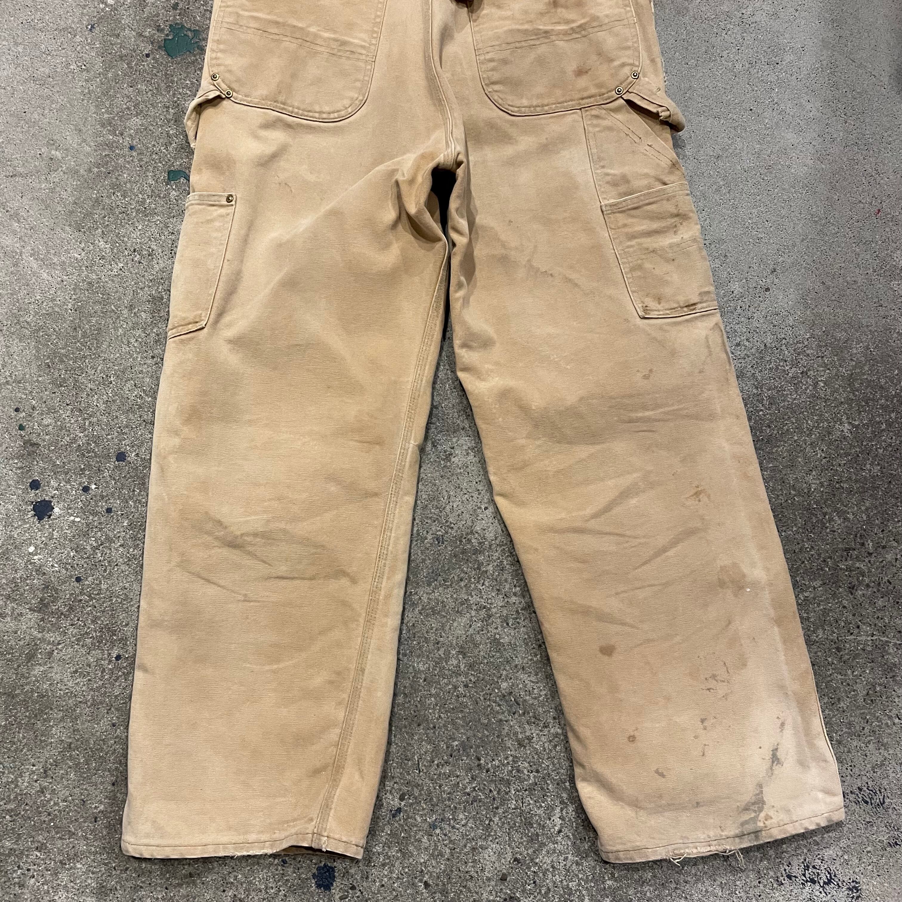 80〜90年代、カーハートのダック地オーバーオールです。エプロン付きでポケットがたくさん付いていてダブルニー仕様で、ザ・ワーク!というデザインですし、リアルな汚れやキズが良い雰囲気の一着です。