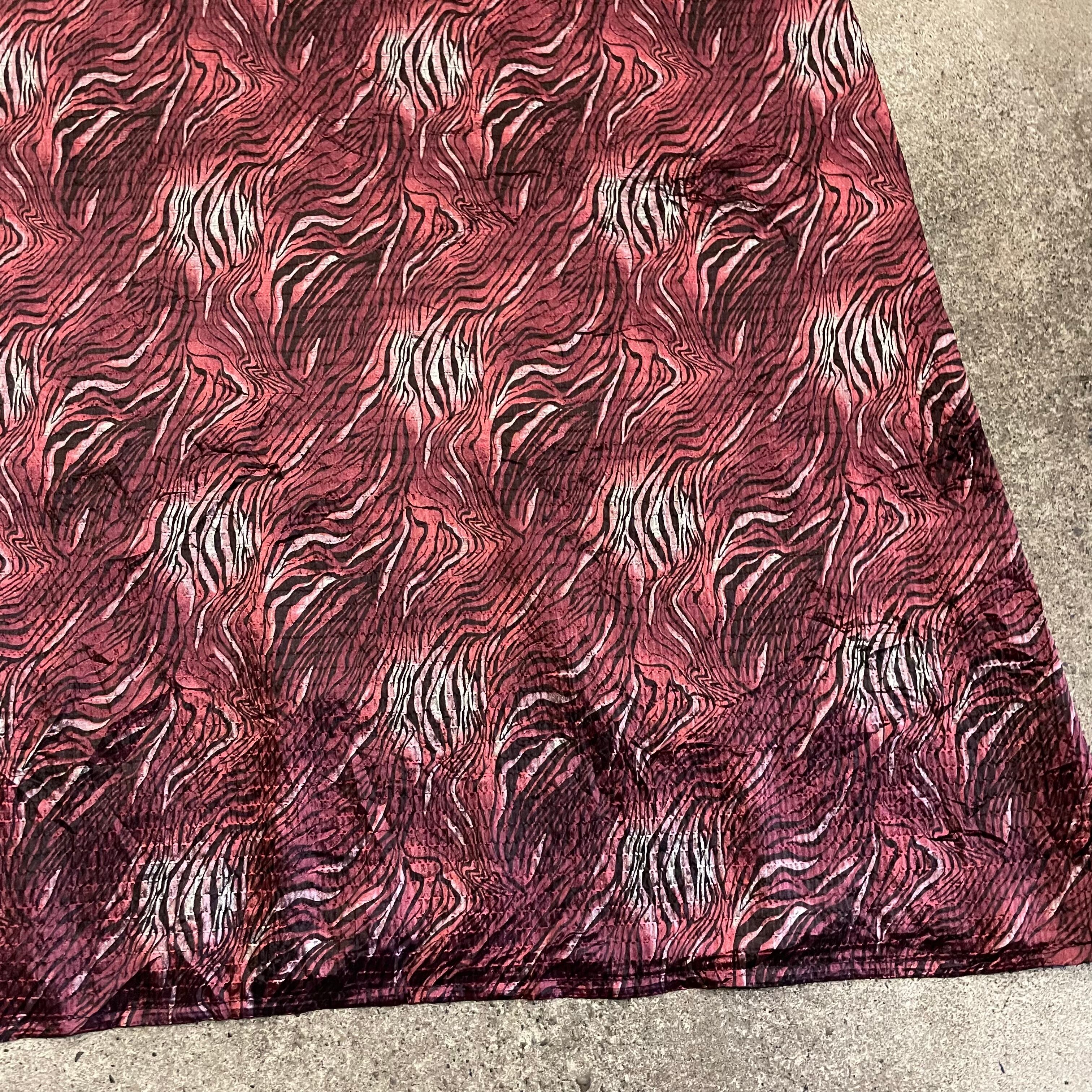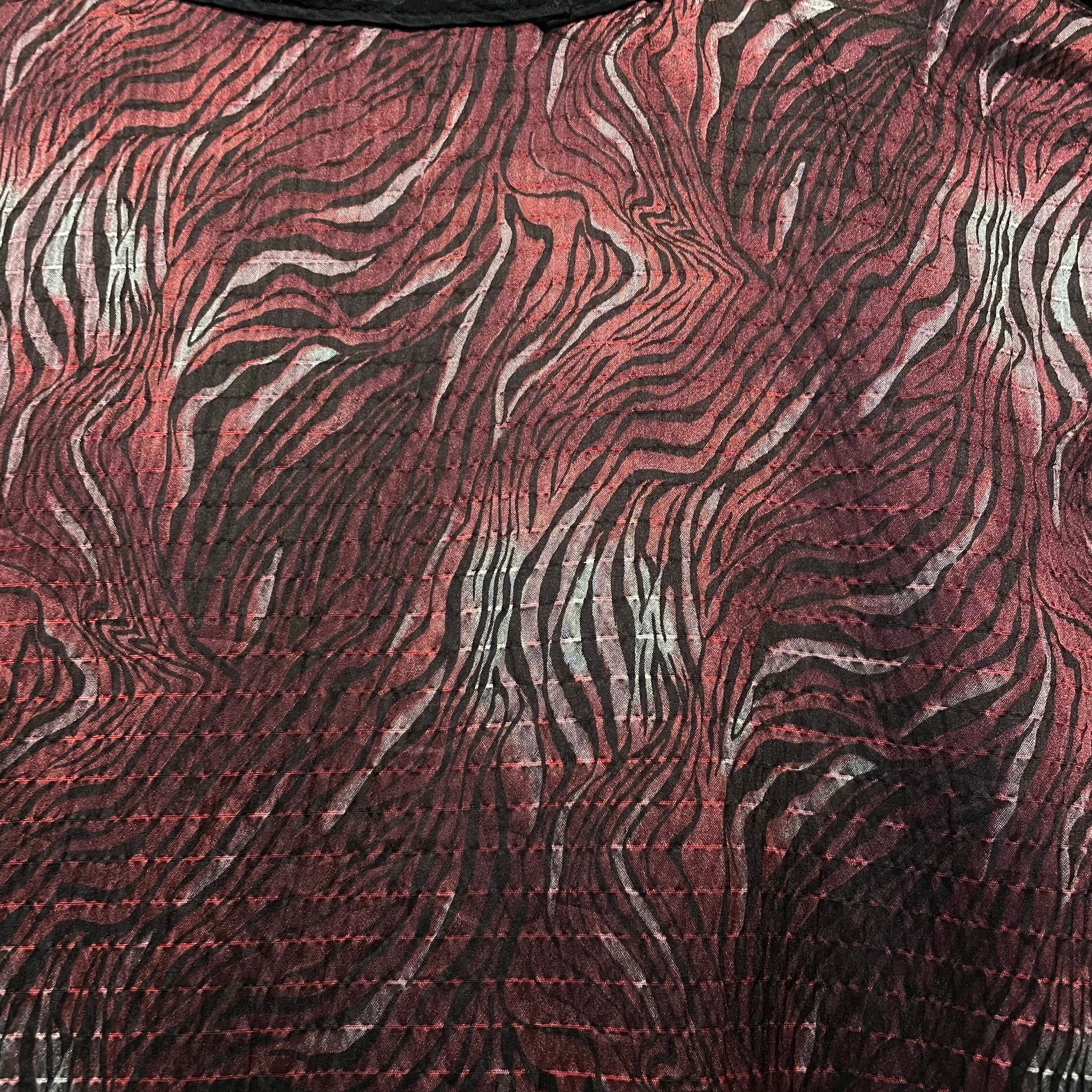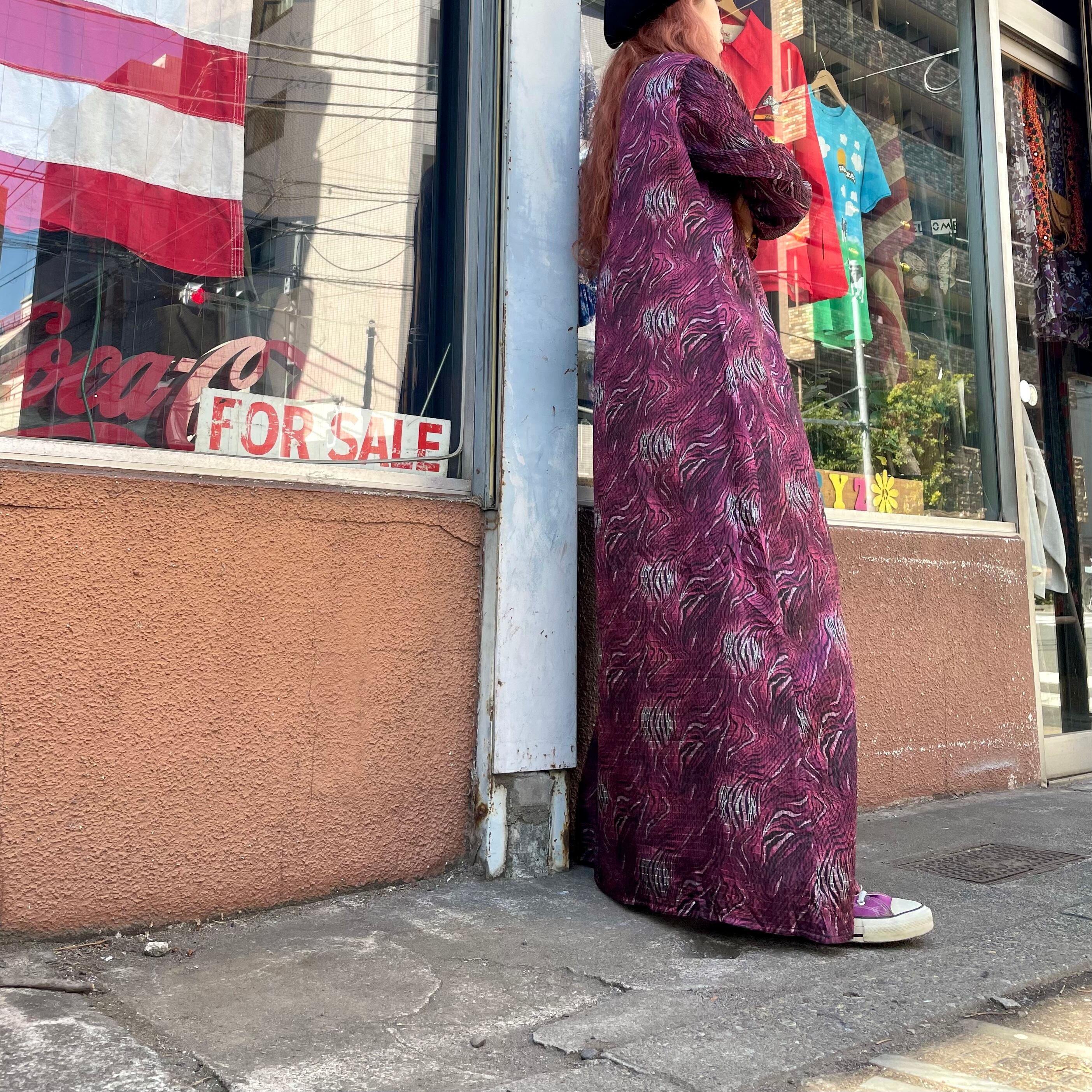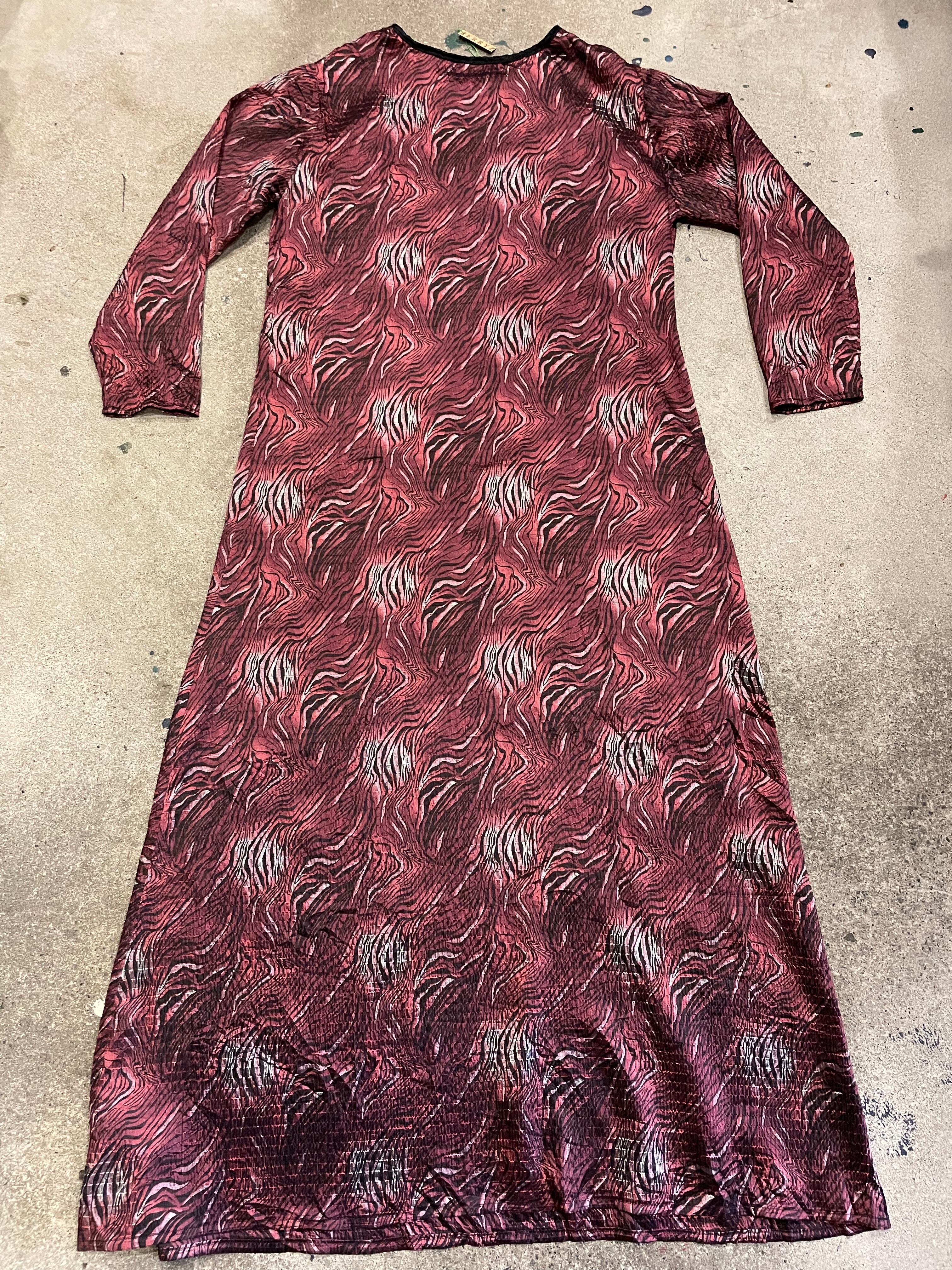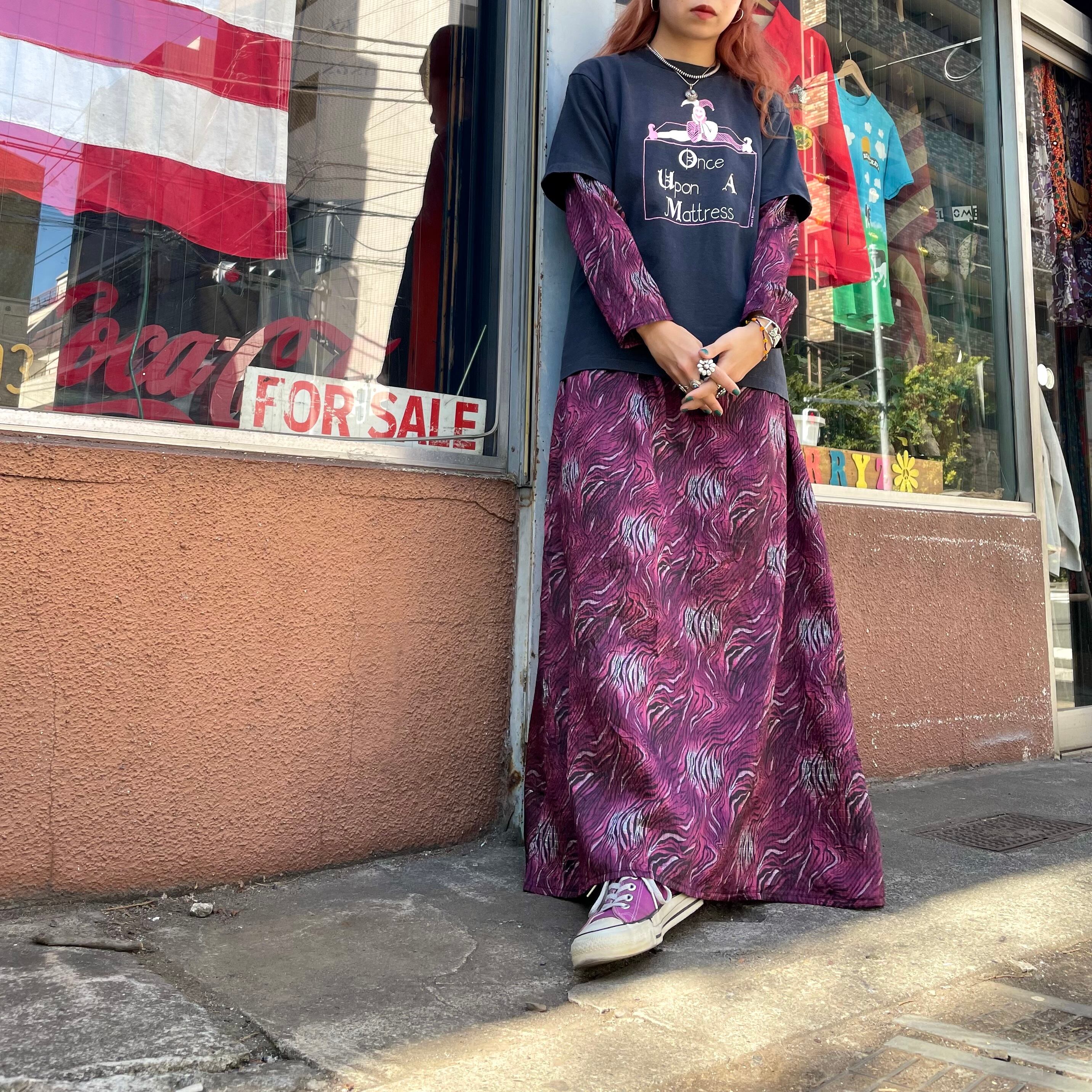 こちらは何柄?といった不思議な雰囲気が素敵な模様のワンピースです。とても薄手のやや光沢のある素材感が大人っぽく、小物使いで印象がかなり変わりそうな一着です。嵩張らないので上からTシャツも着られますし、中にブラウスを着て襟を出したり、ベルトをしたり、いろいろお楽しみ頂けると思います。