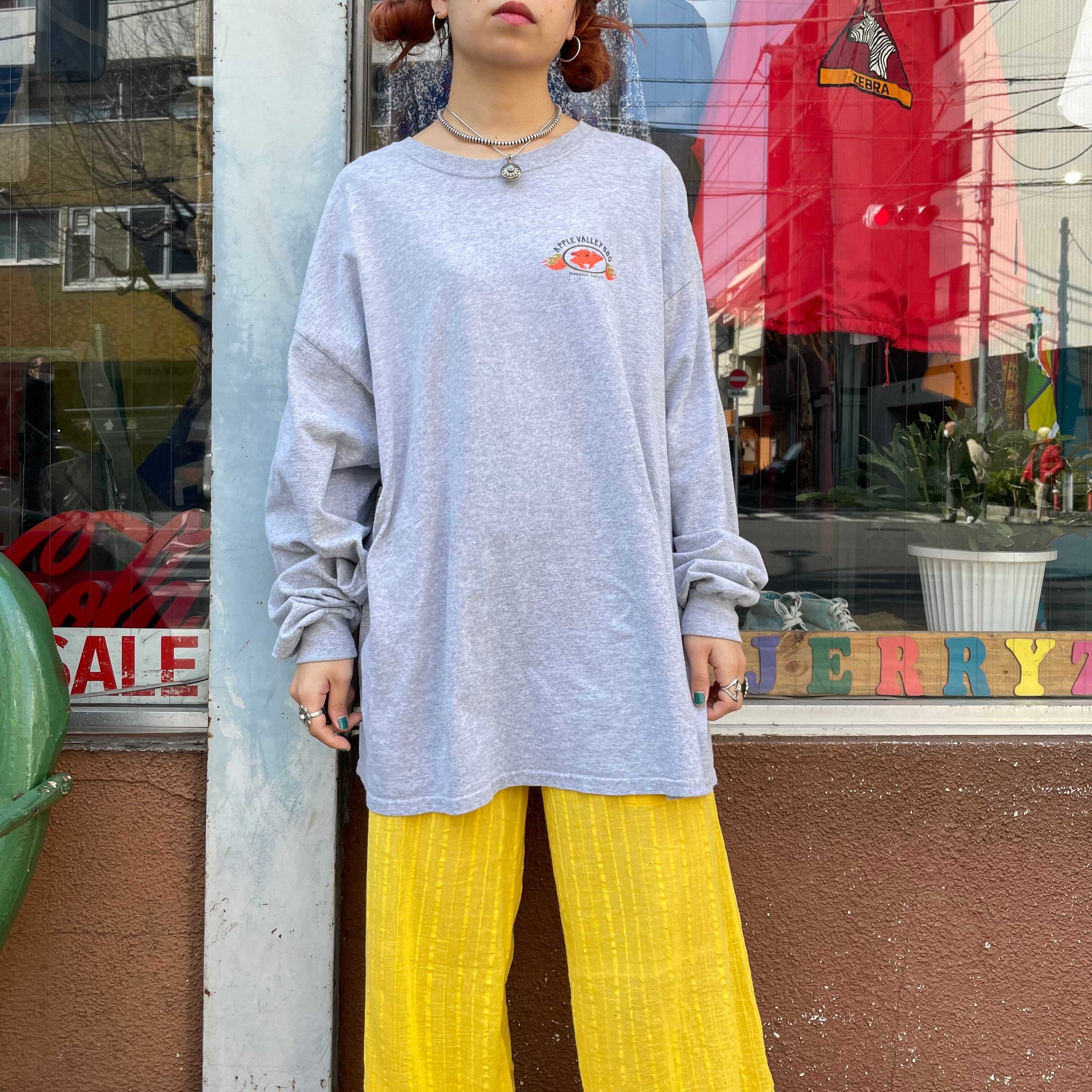グレーでかなり大きめのサイズ感が緩くて良い感じです。バックプリントがあるのでキャミソールワンピースなど背中の開いているトップスを重ねて見せたり、一枚でミニワンピース風に着るのもかわいいですね。