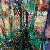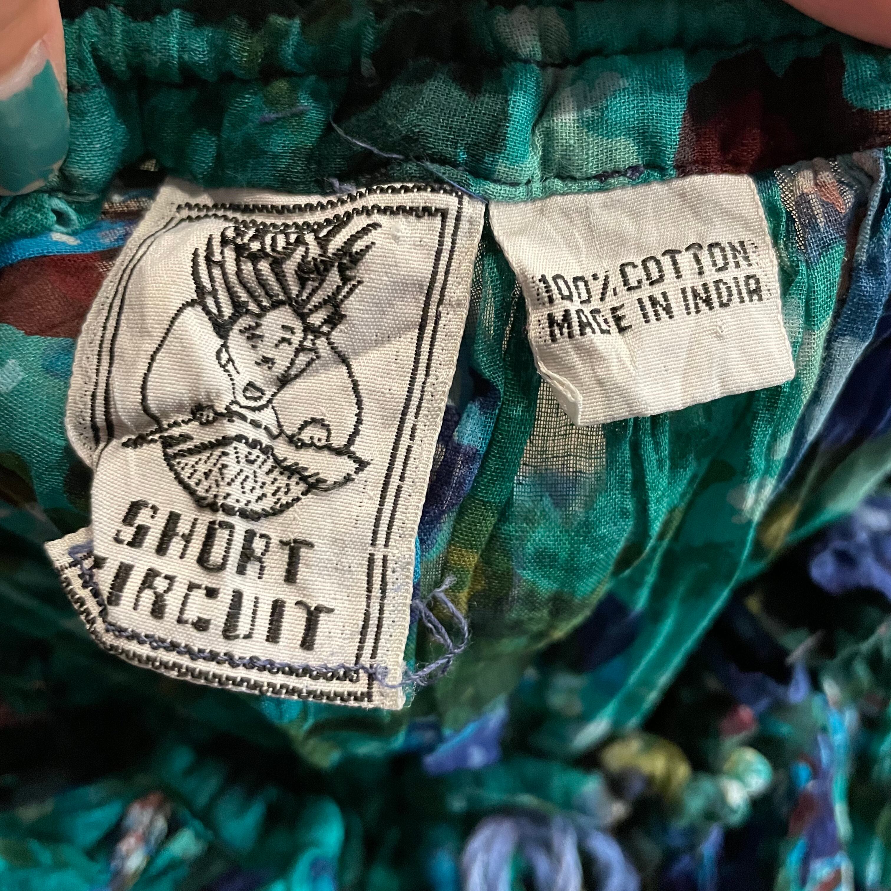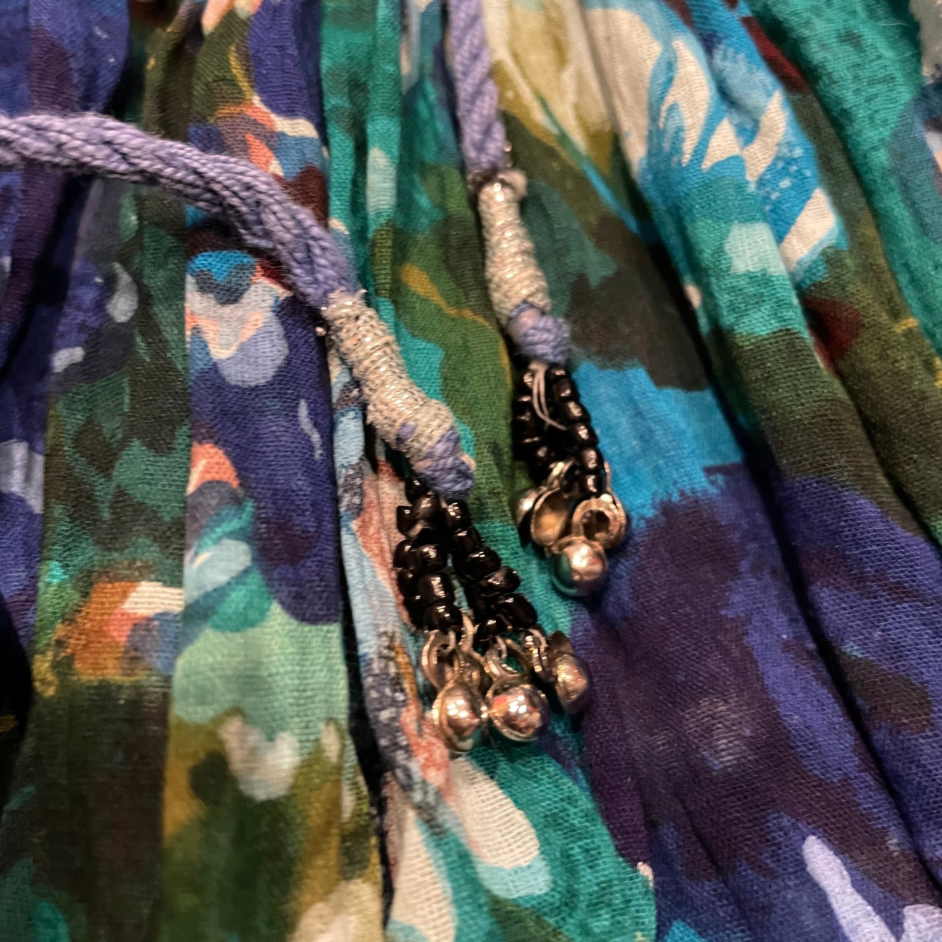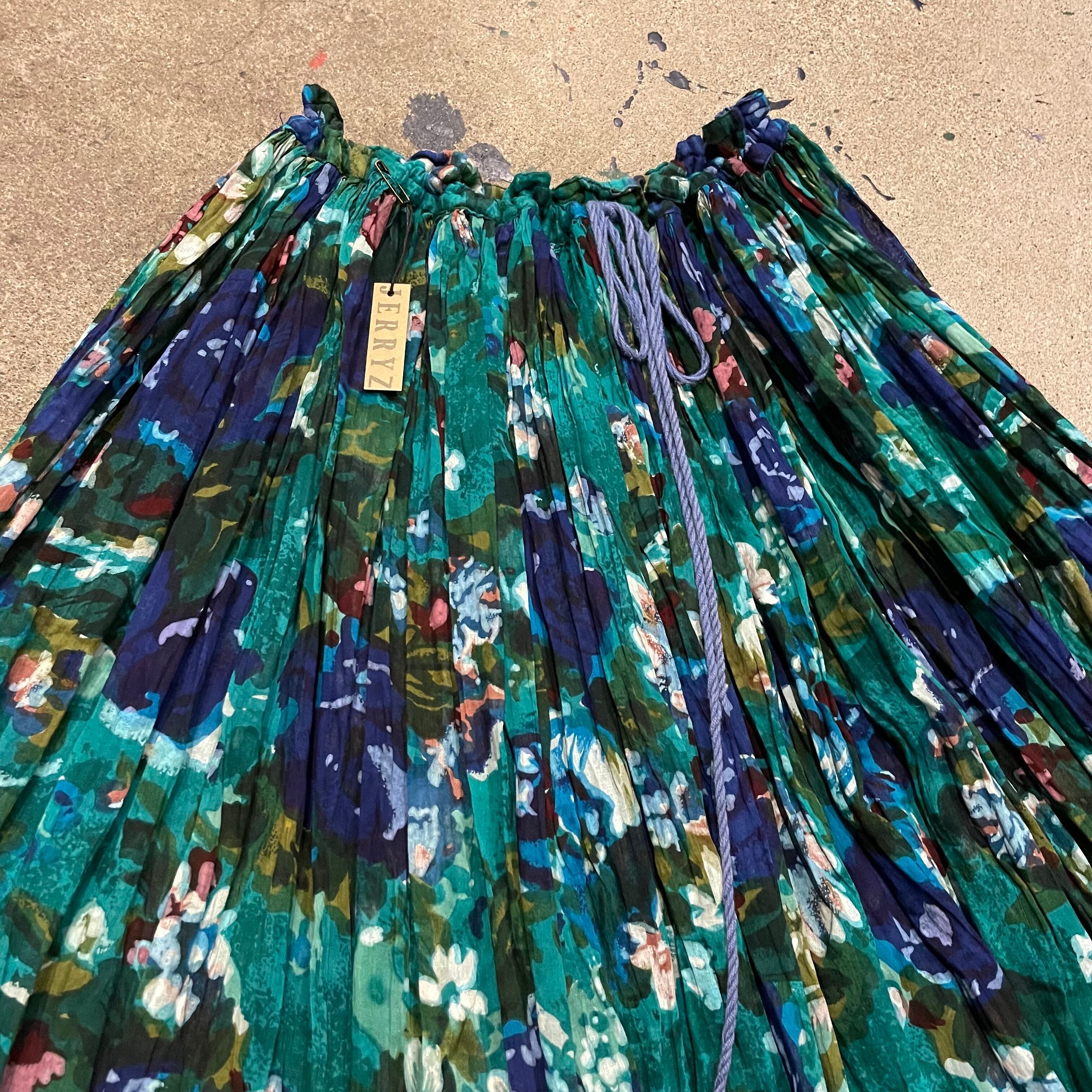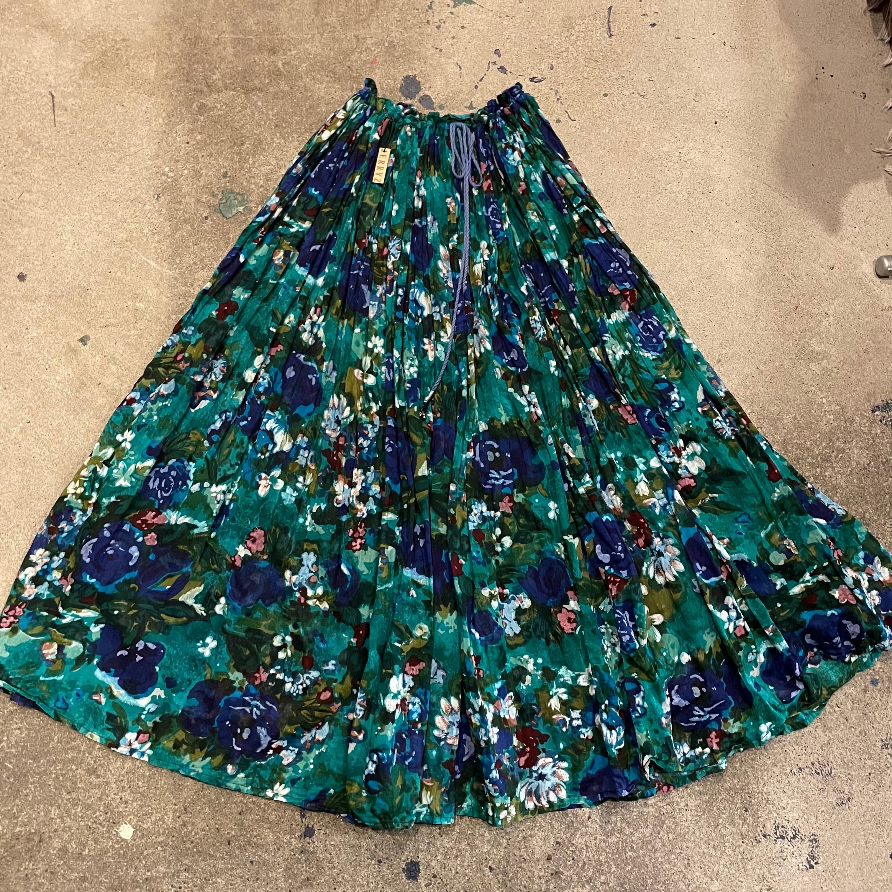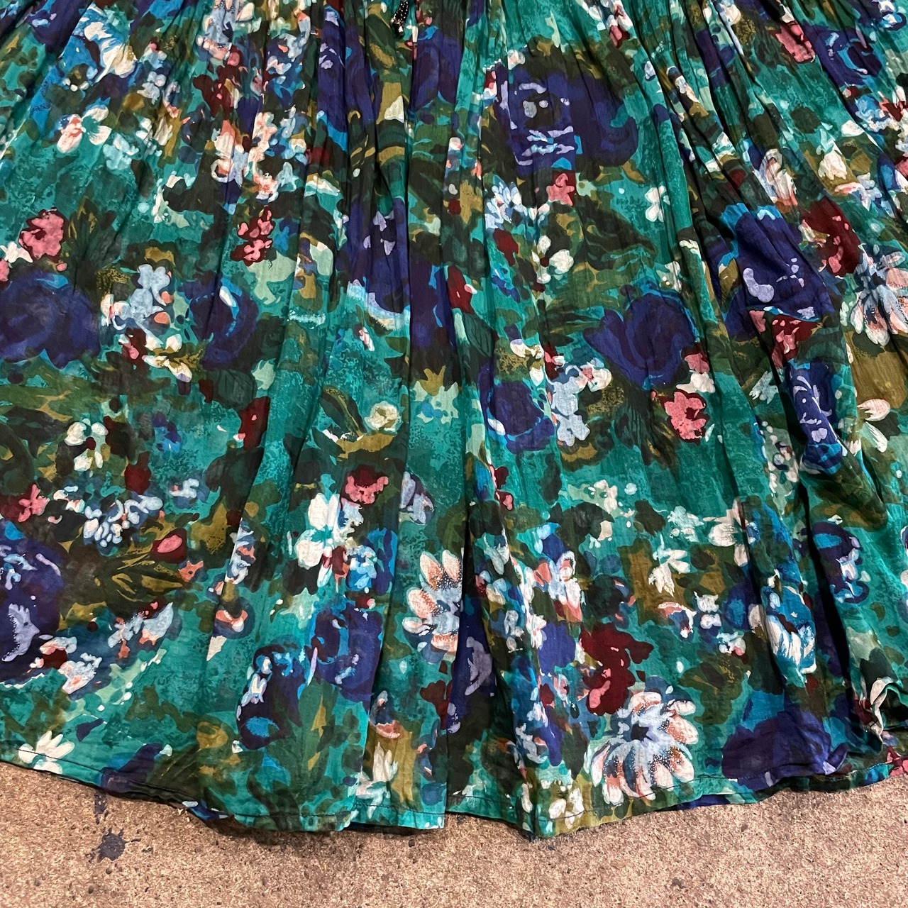 青×緑の色味がきれいで、絵の具で描いたような花柄がとても素敵なスカートです。
