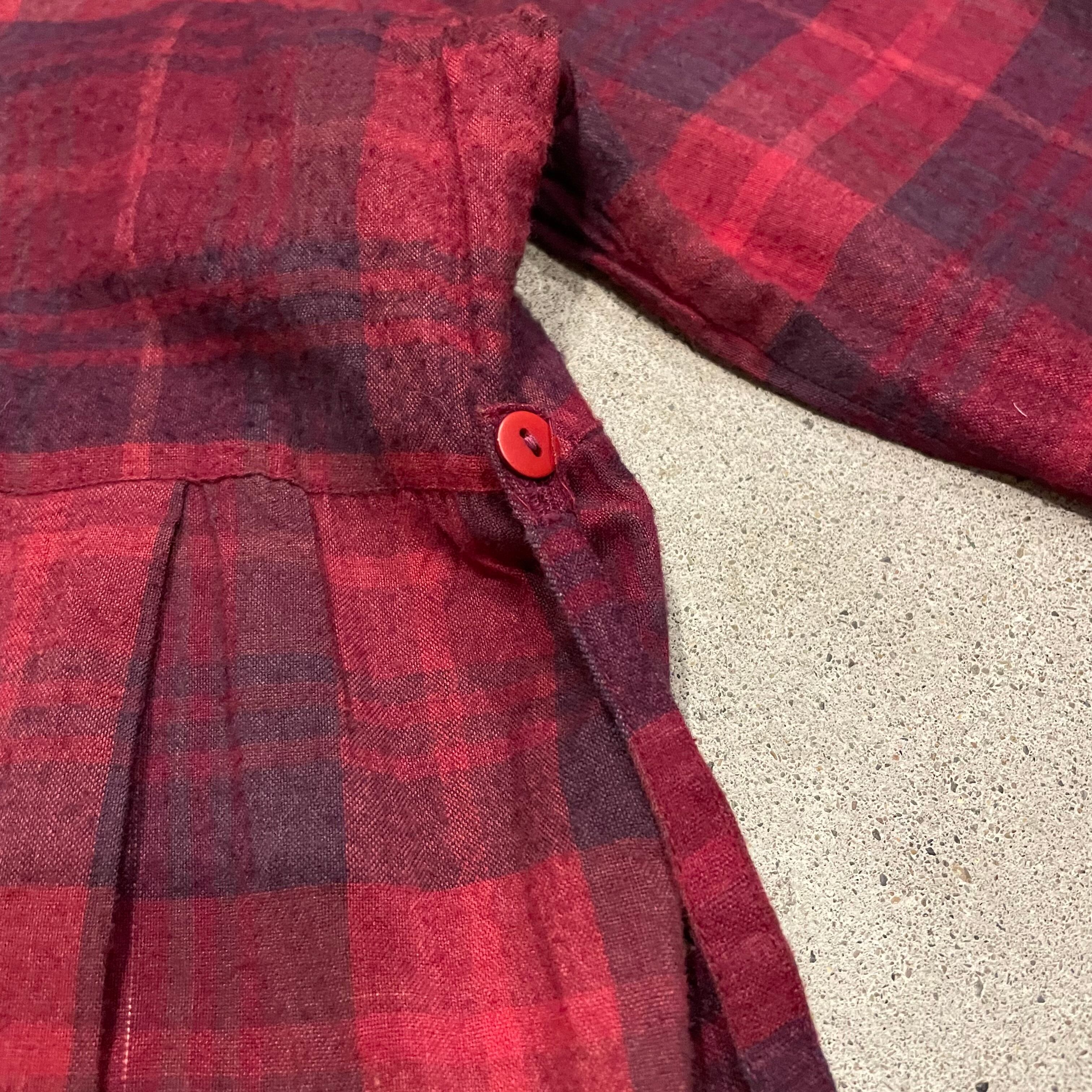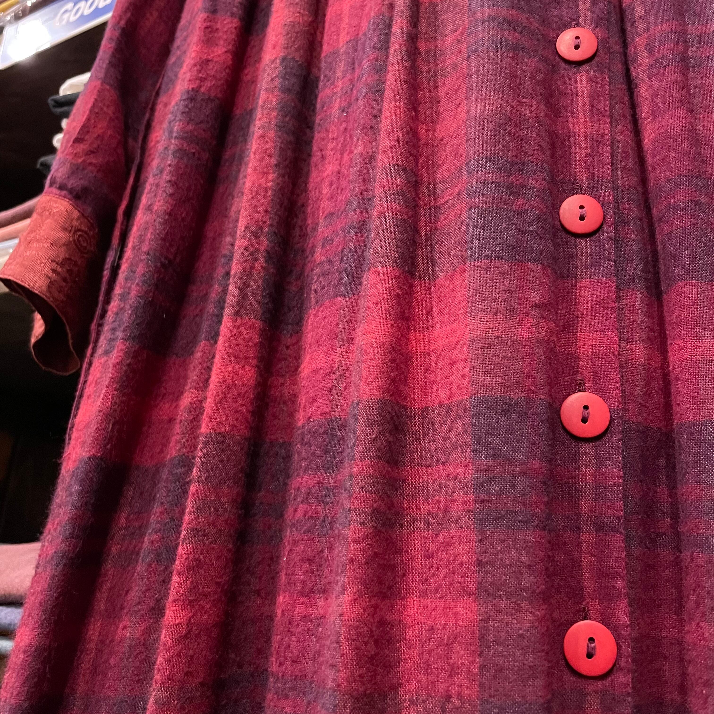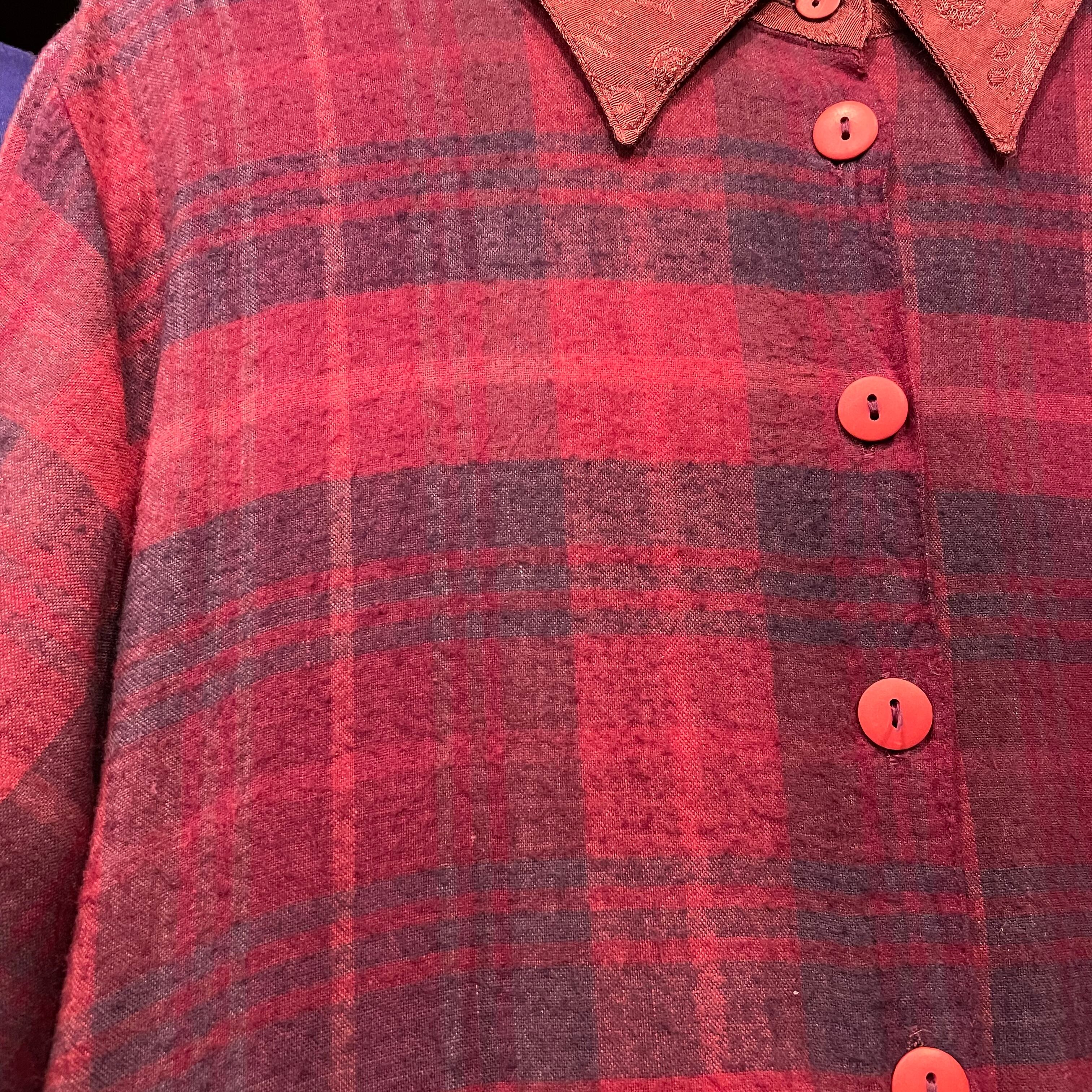 襟とカフス部分がつるっとした織りがきれいな生地の切り替えになっていて、その絶妙なバランス感がかわいいです。前開きですので羽織としてもお使い頂けてとても便利ですし、夏以外の季節で幅広くお使い頂けるのも嬉しいポイントですね!