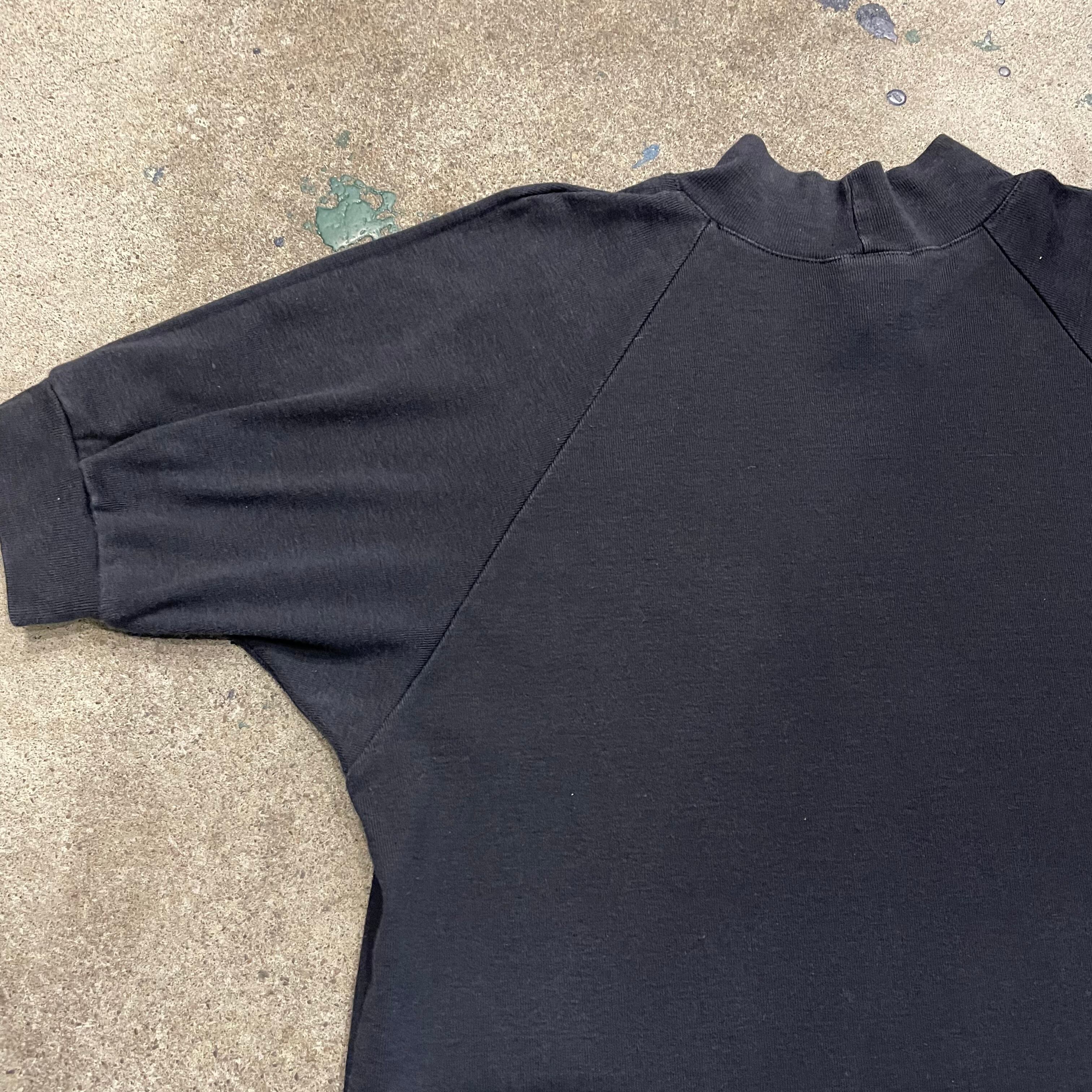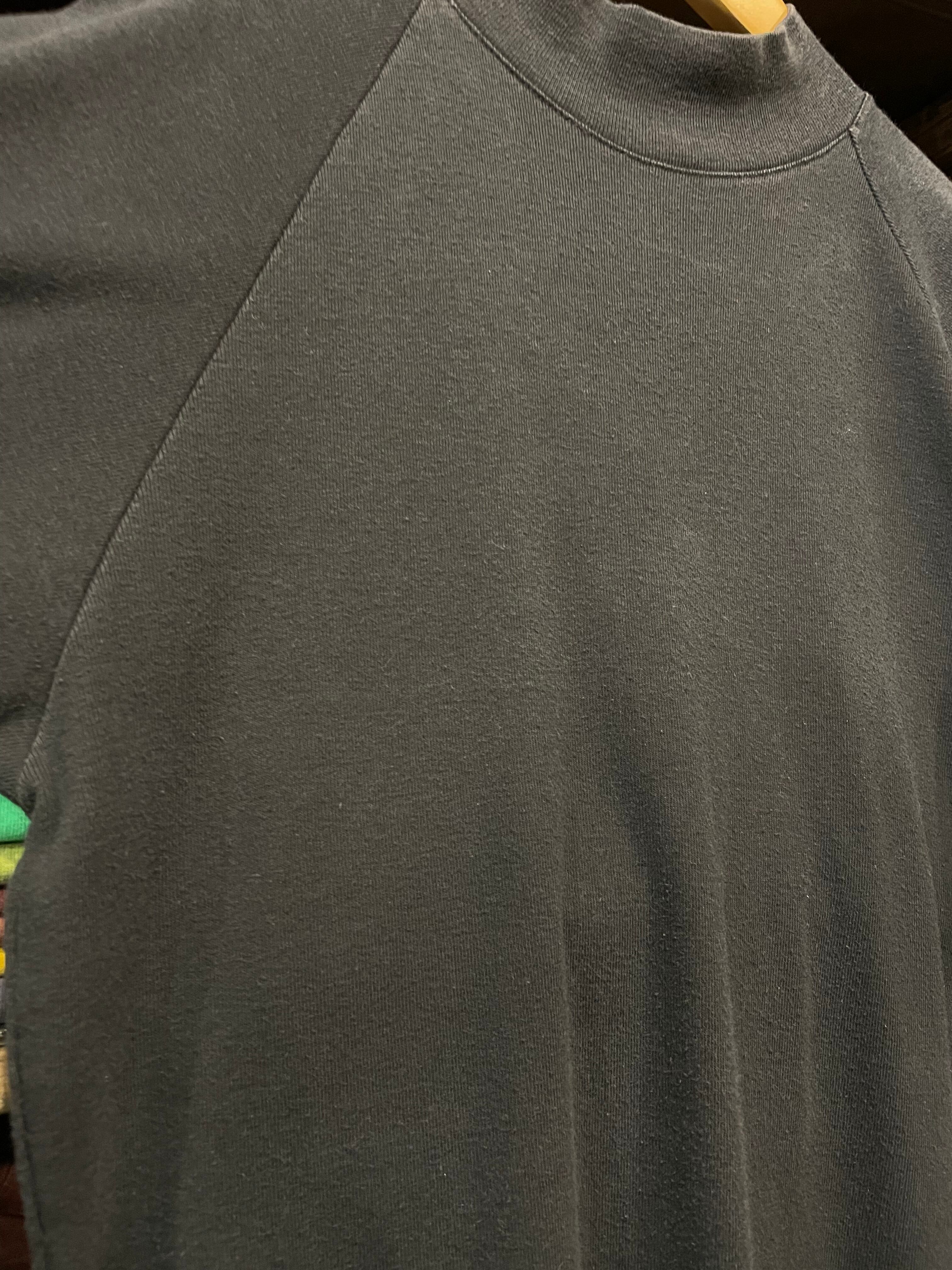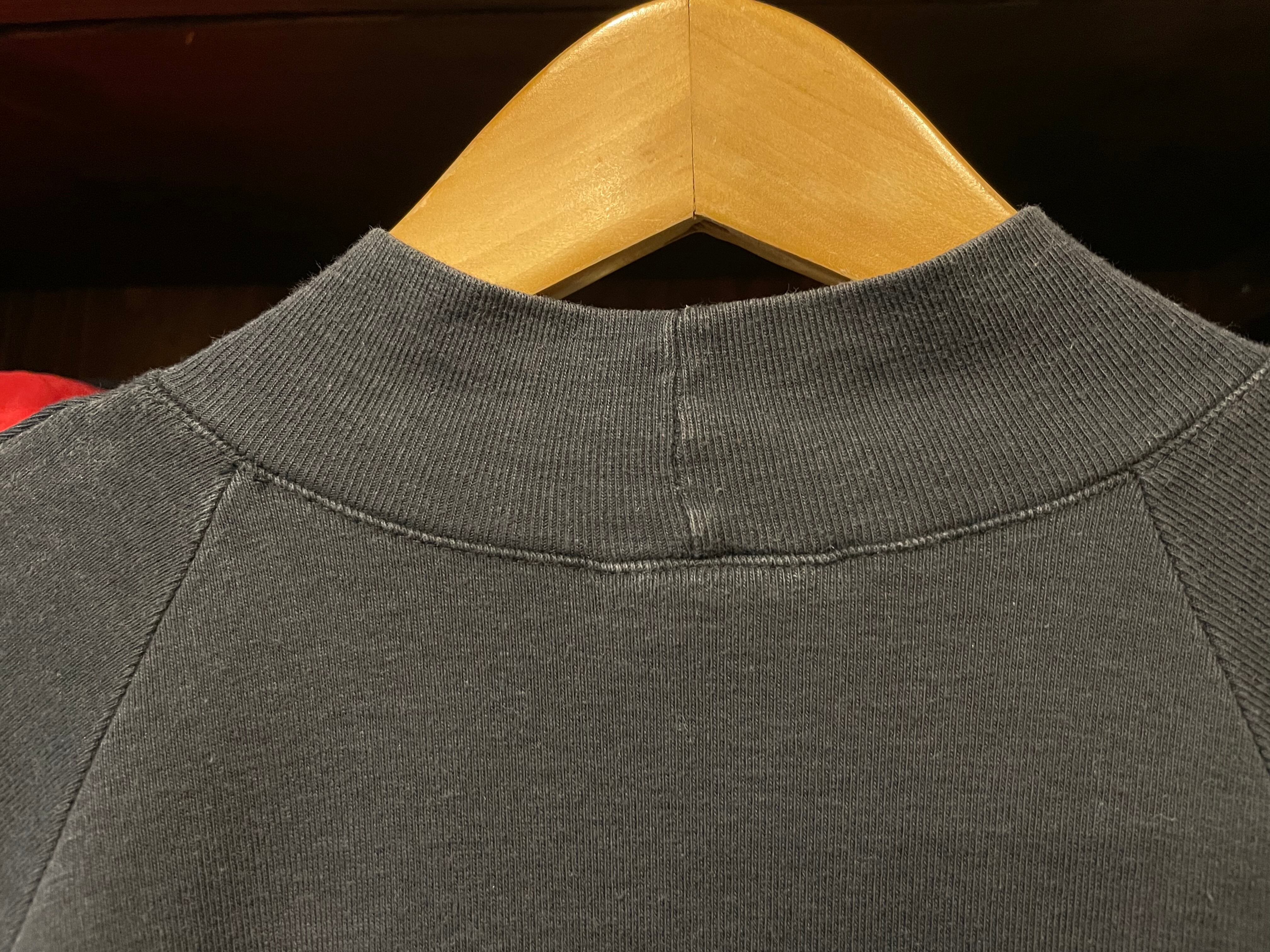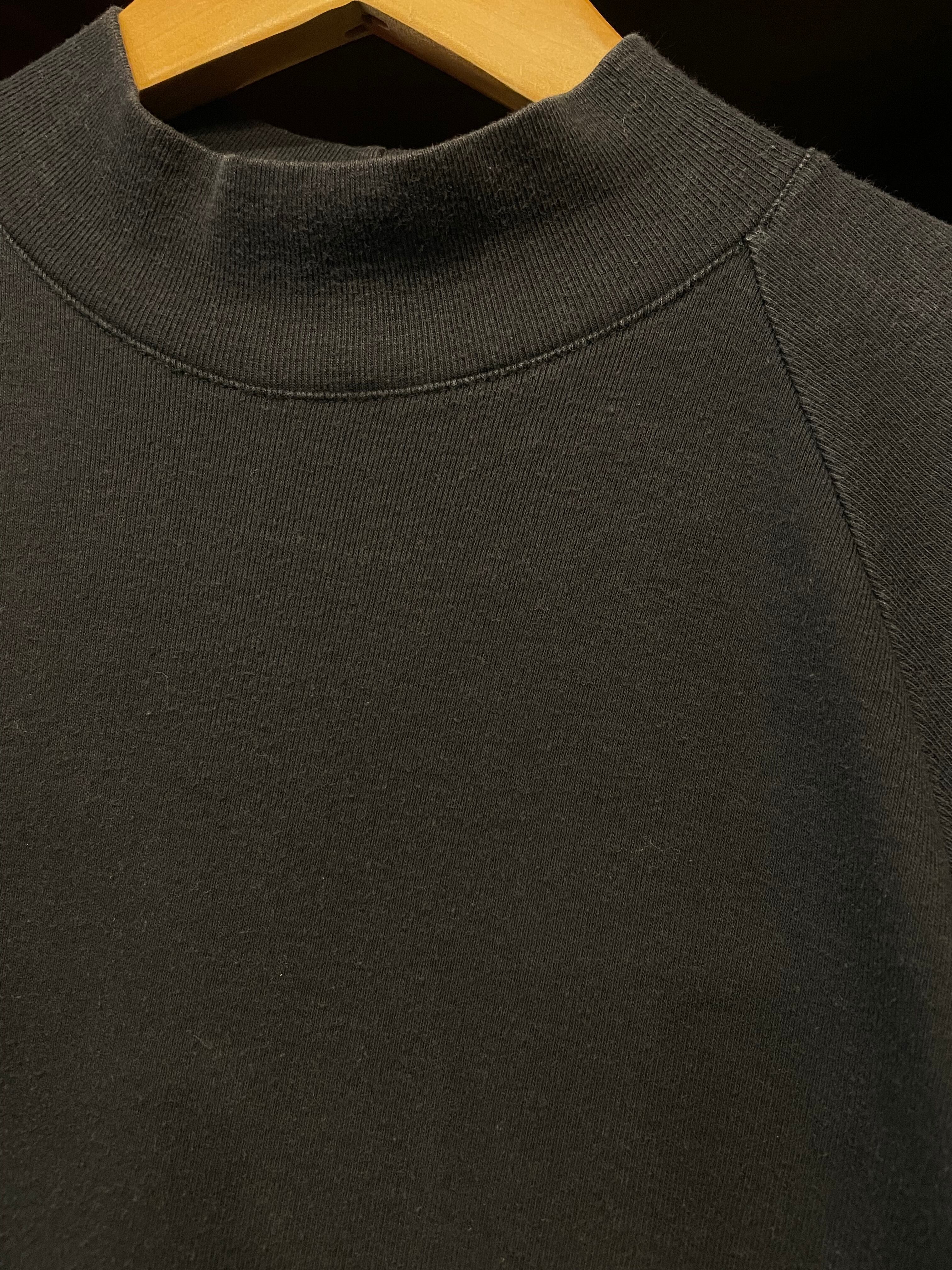 モックネックでラグランスリーブで袖口にリブが付いていて後ろの裾には切り替えでボタンが付いているというおもしろいデザインです。やや色褪せた黒が良い雰囲気で、厚手のTシャツのような、薄手のスウェットのような素材で動きやすくてとても楽ちんです。