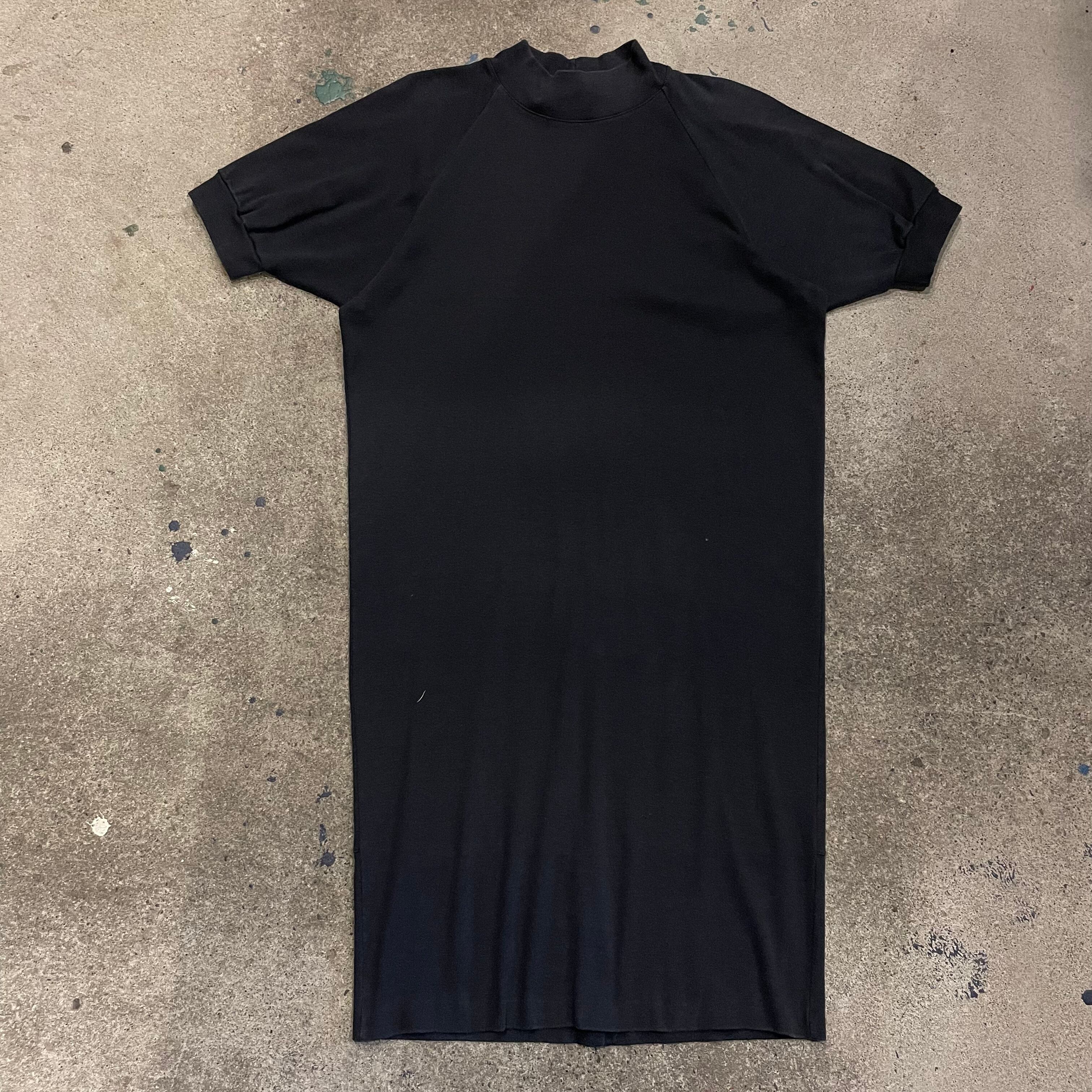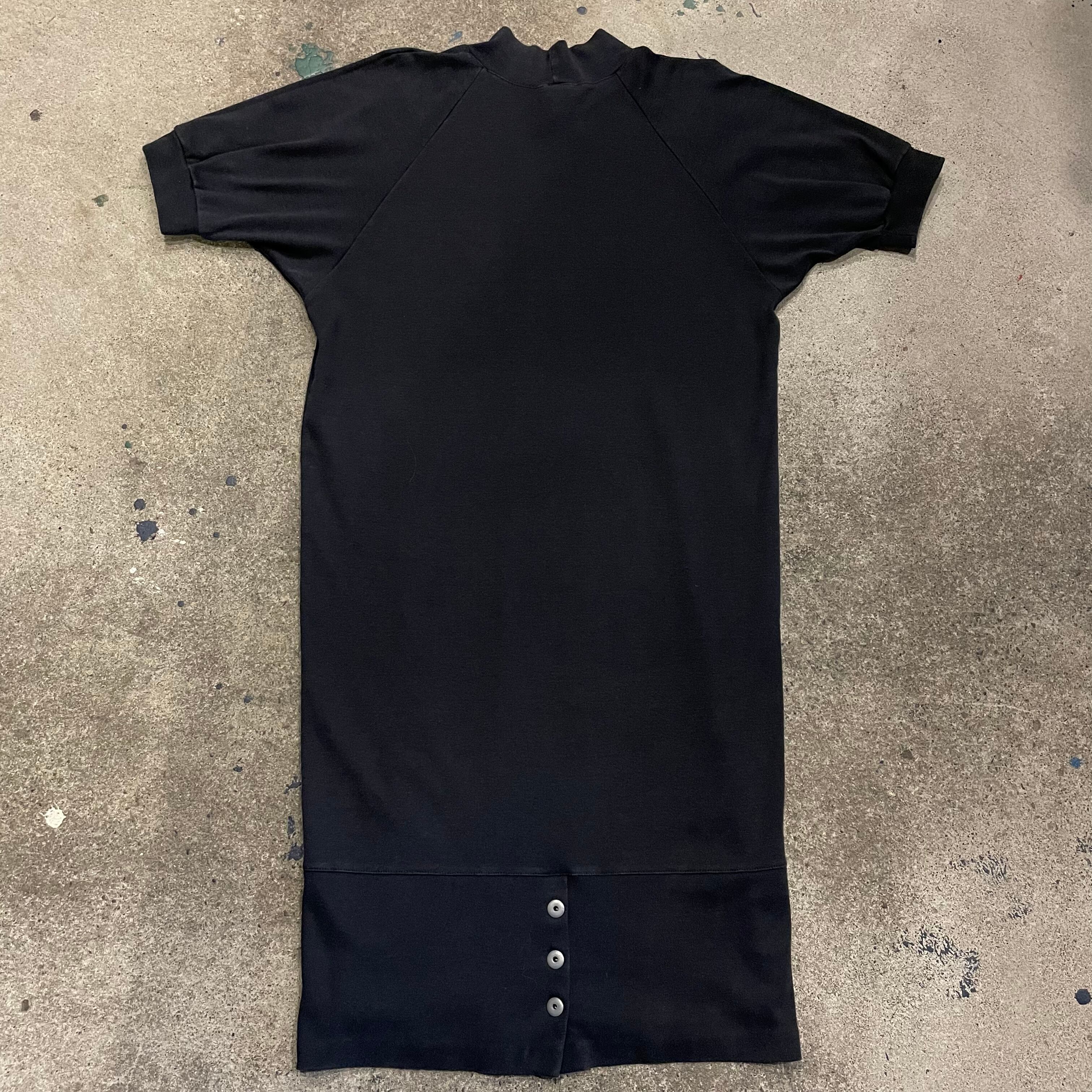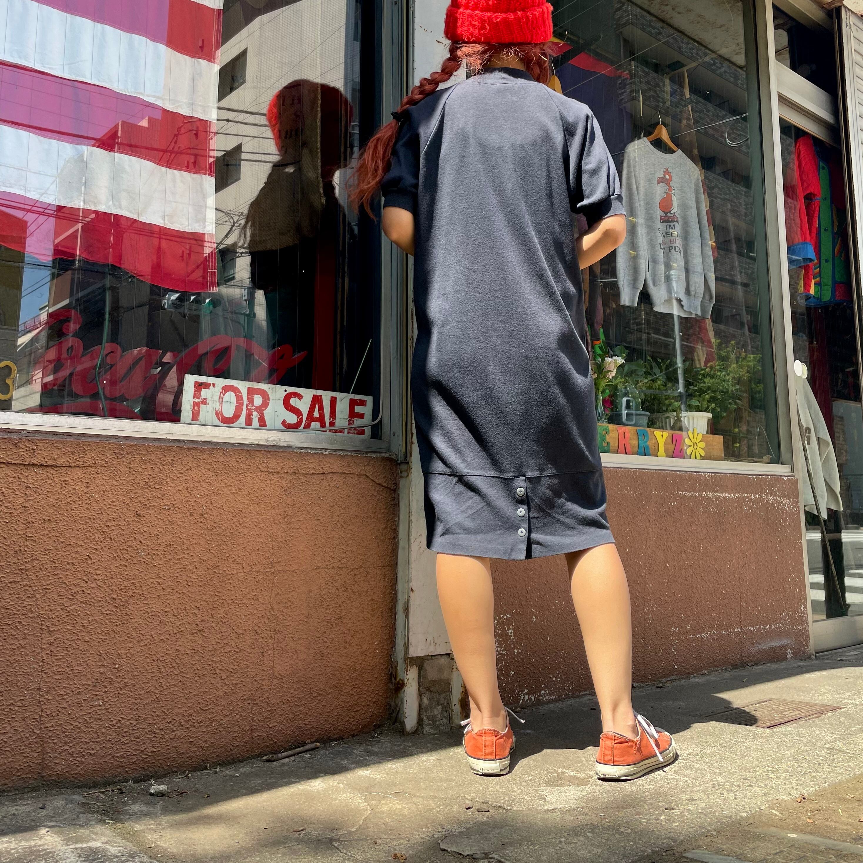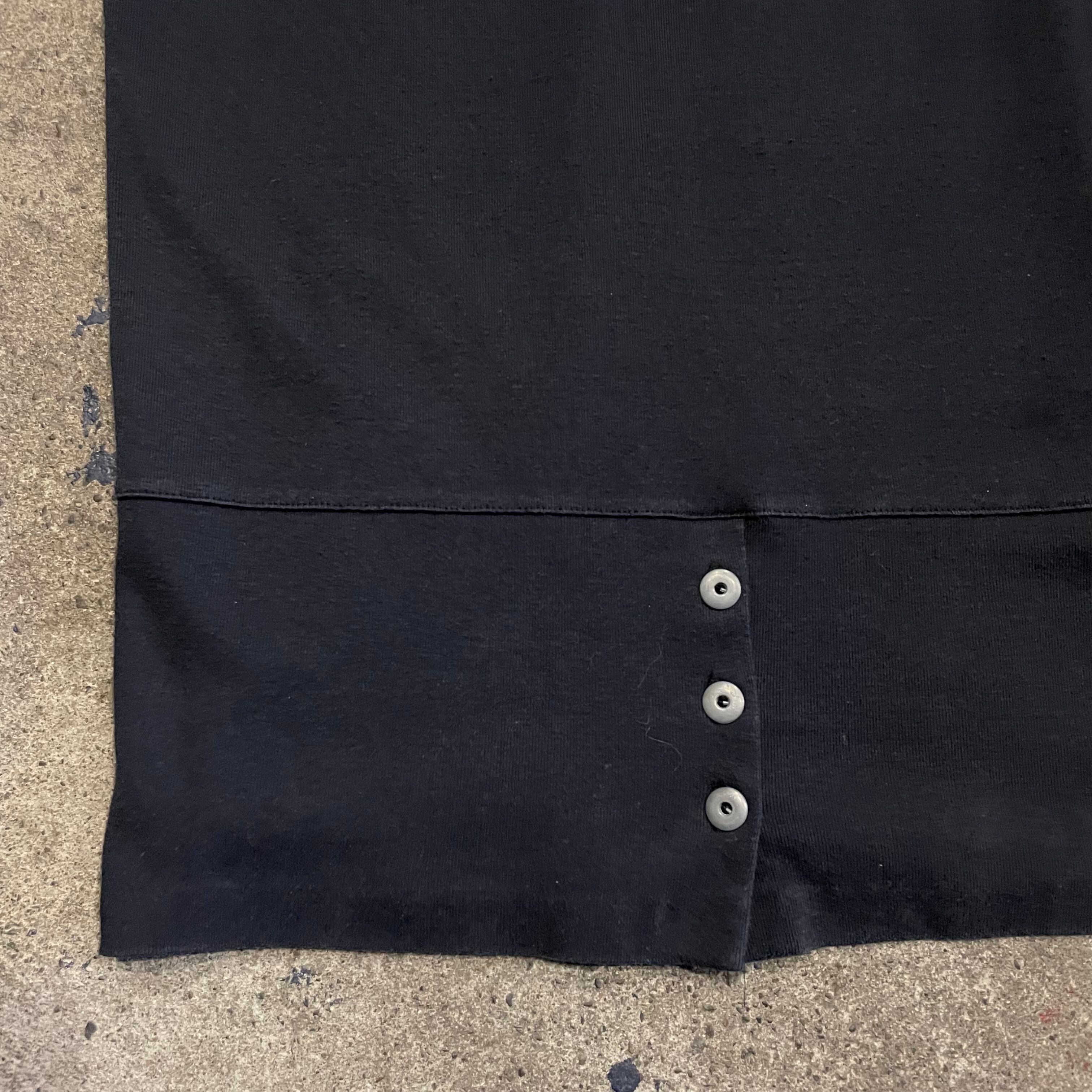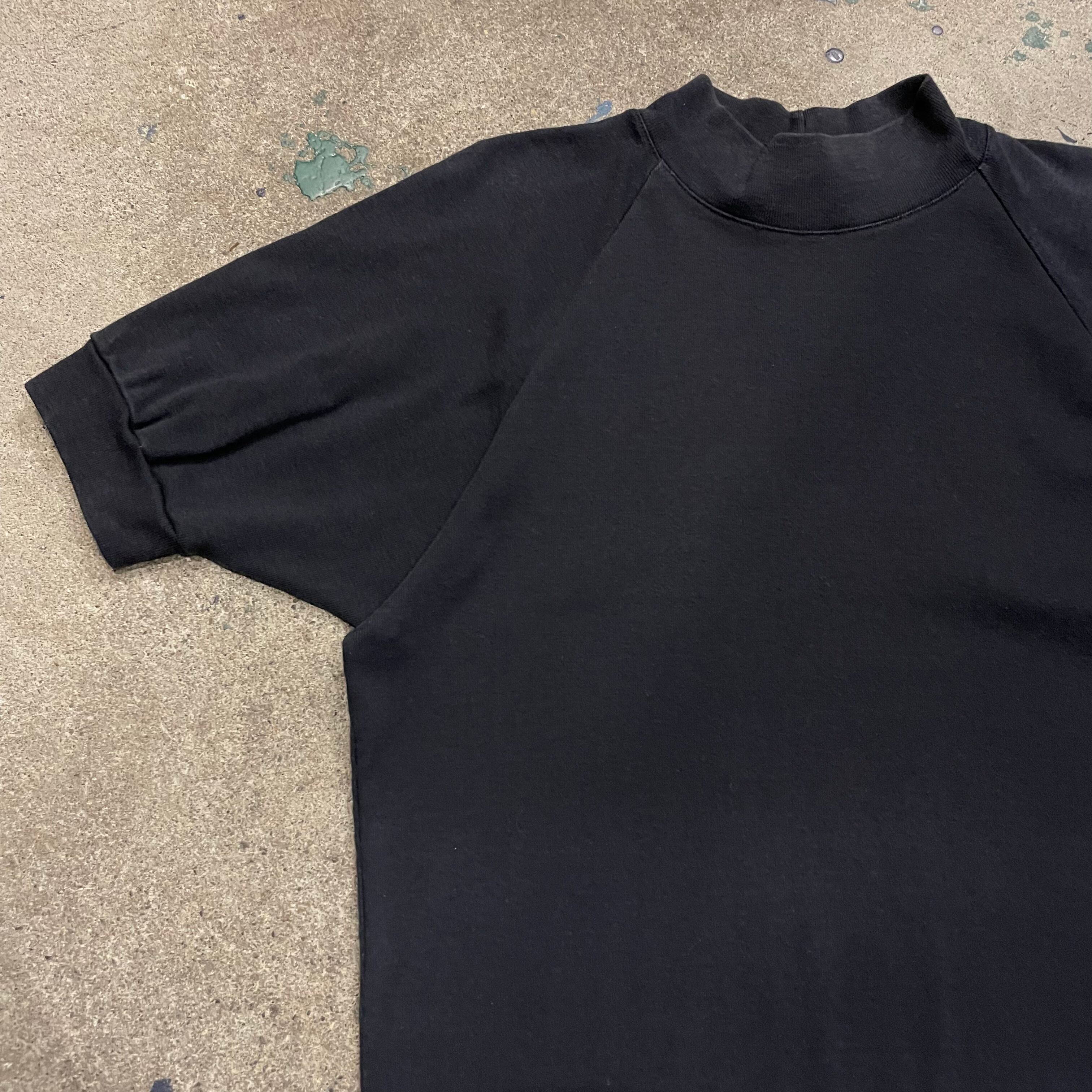 モックネックでラグランスリーブで袖口にリブが付いていて後ろの裾には切り替えでボタンが付いているというおもしろいデザインです。やや色褪せた黒が良い雰囲気で、厚手のTシャツのような、薄手のスウェットのような素材で動きやすくてとても楽ちんです。